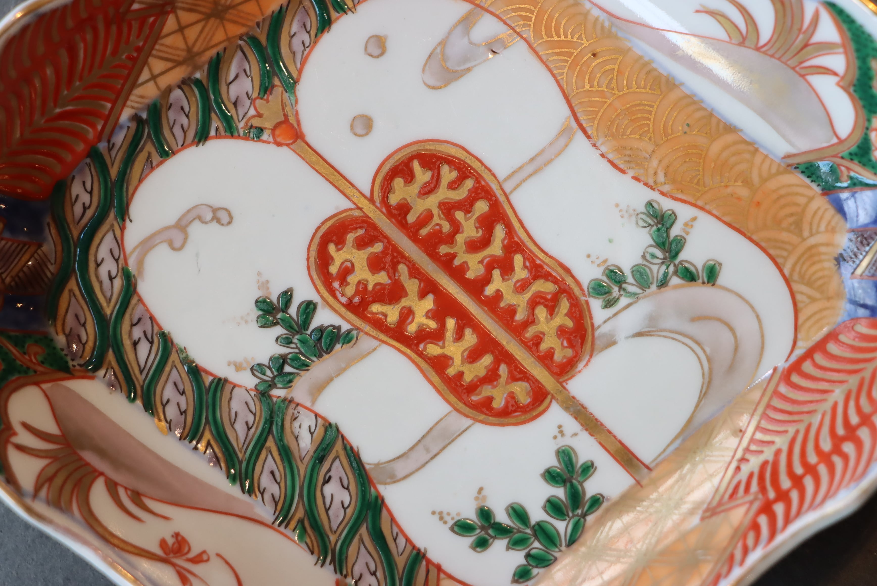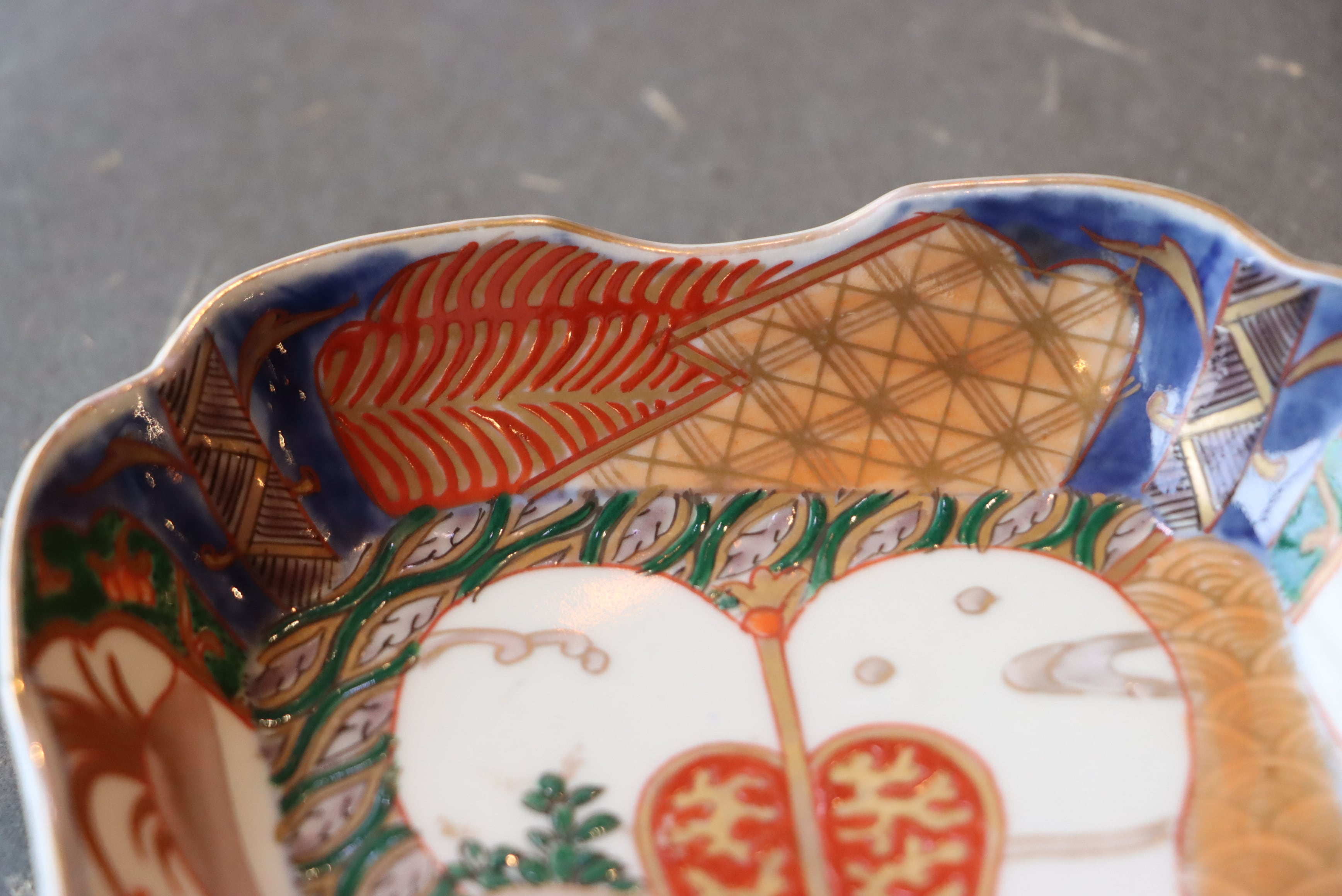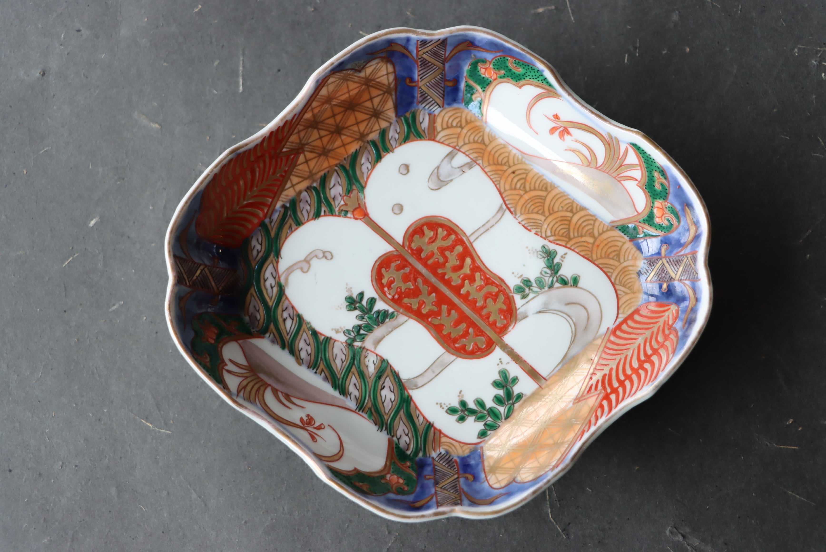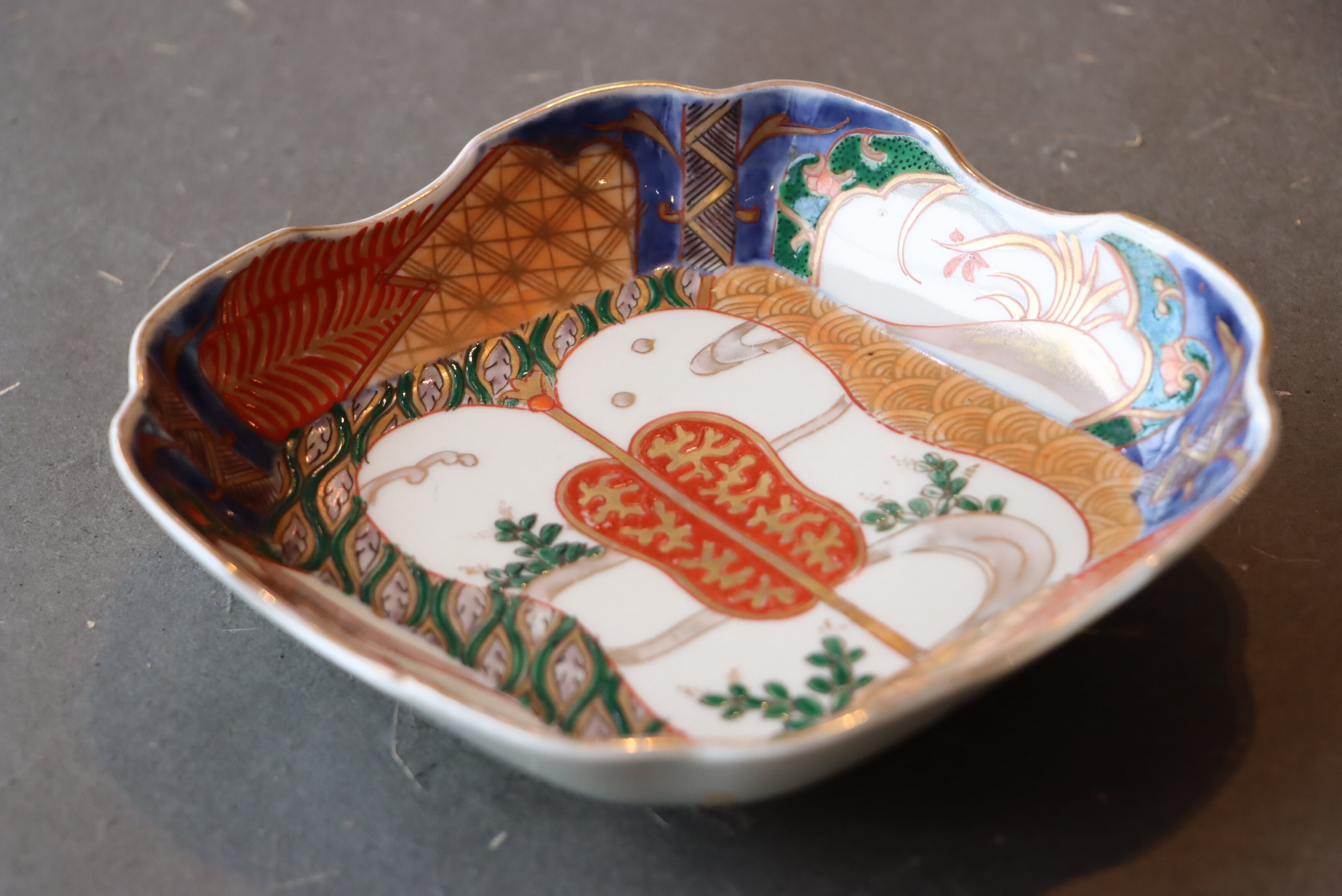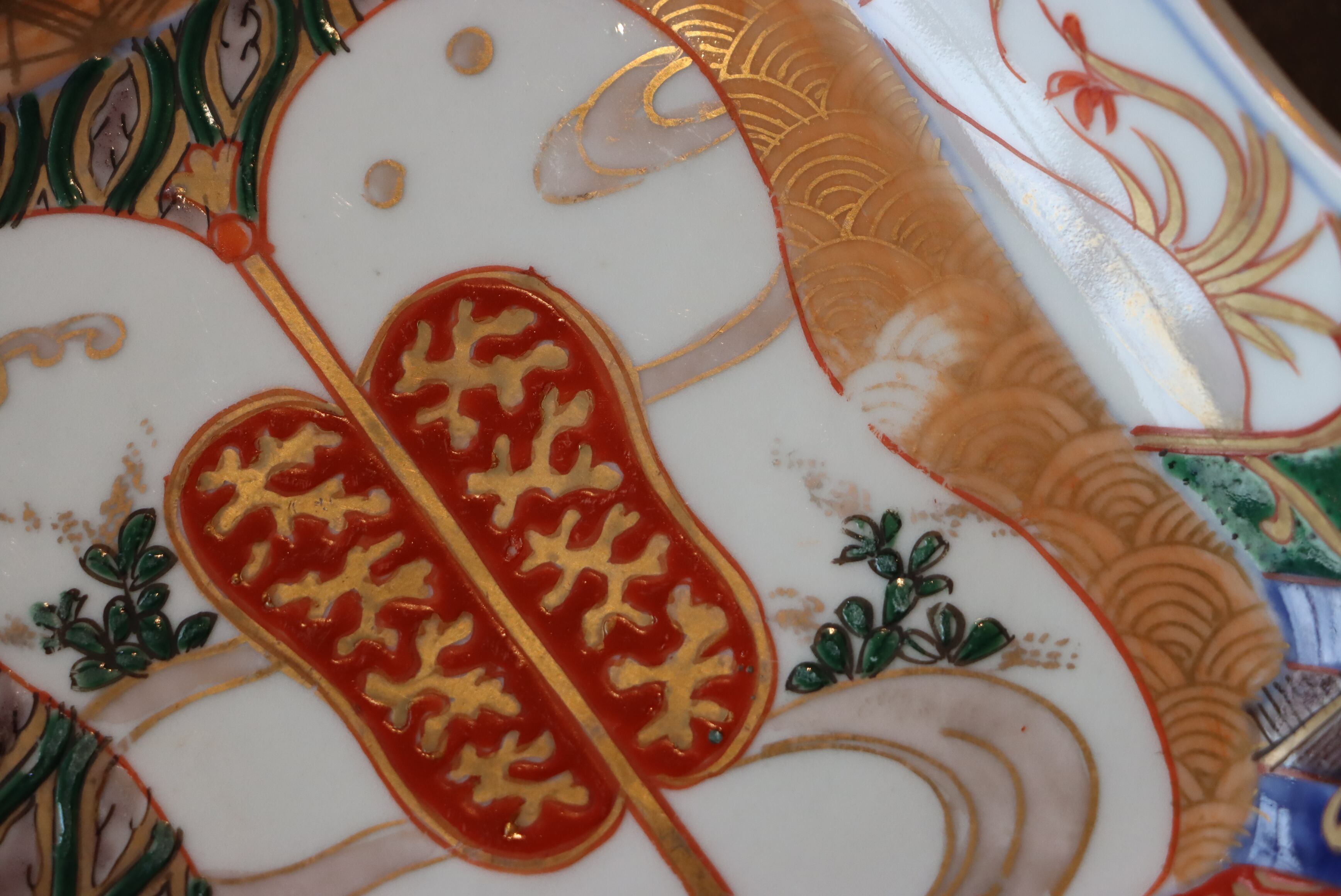 【Imari diamond shaped plate with military leader's fan design in overglaze enamels.】