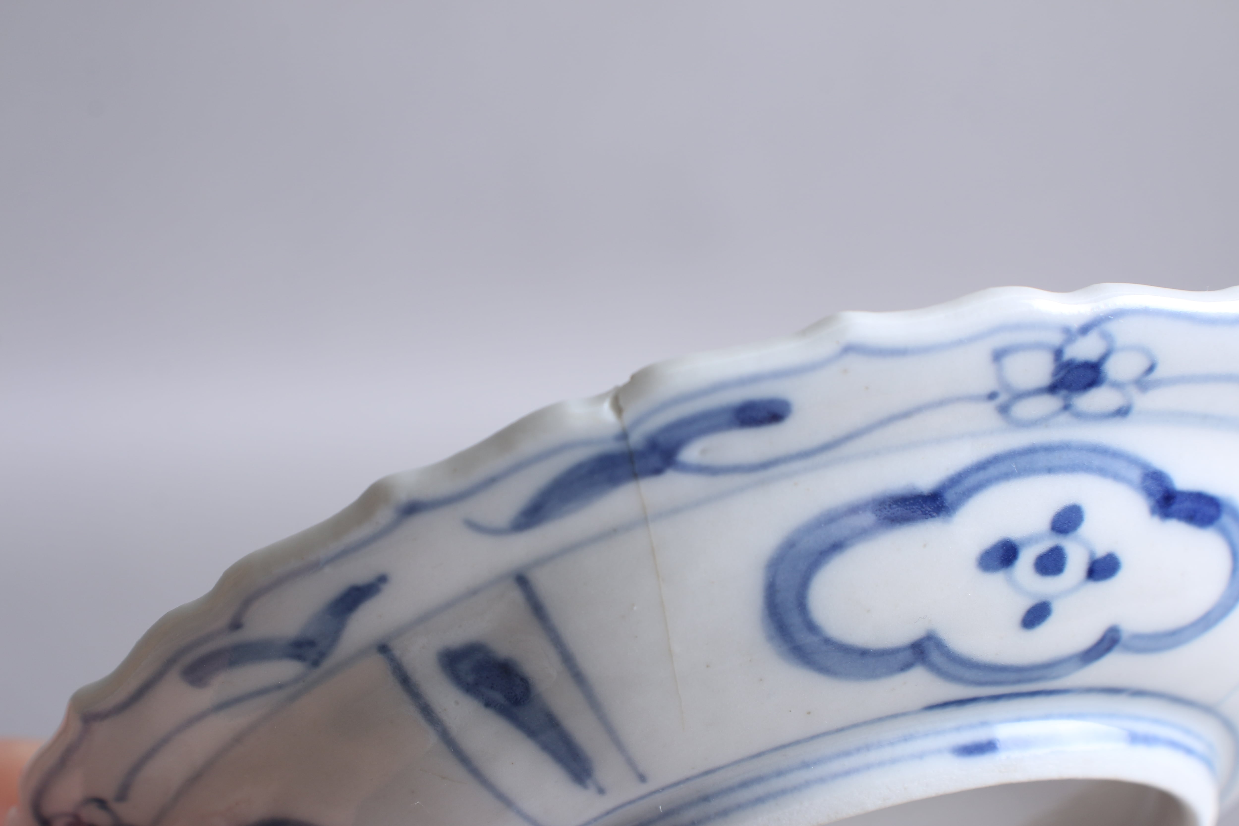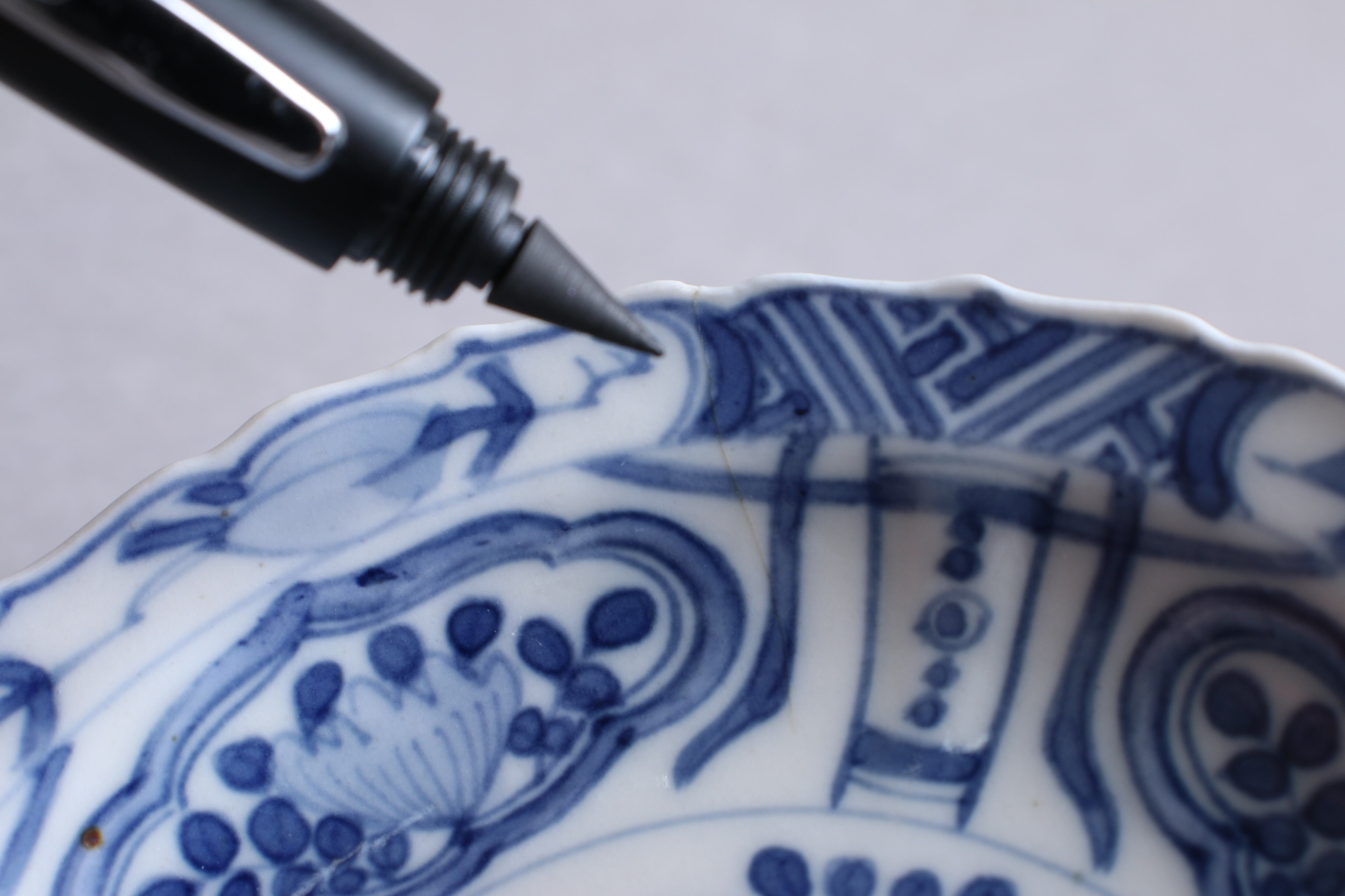 状態:カケ×2(約0.5センチ、約0.2センチ)、小さい方のカケと同じ箇所からニュウ (約2.5センチ)。