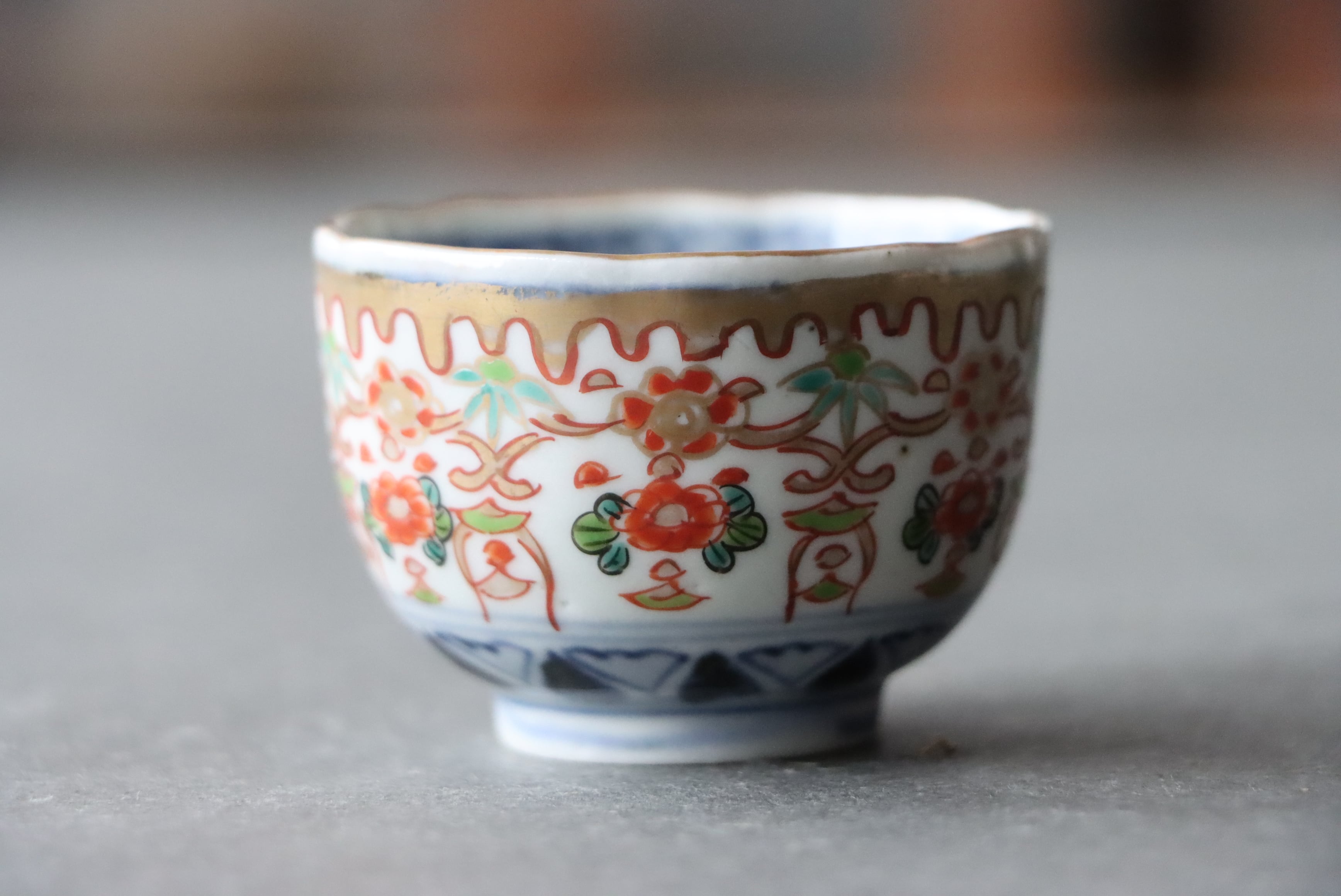 伊万里焼 色絵 壺垂花瓔珞文 猪口 通りもの/Imari small cup