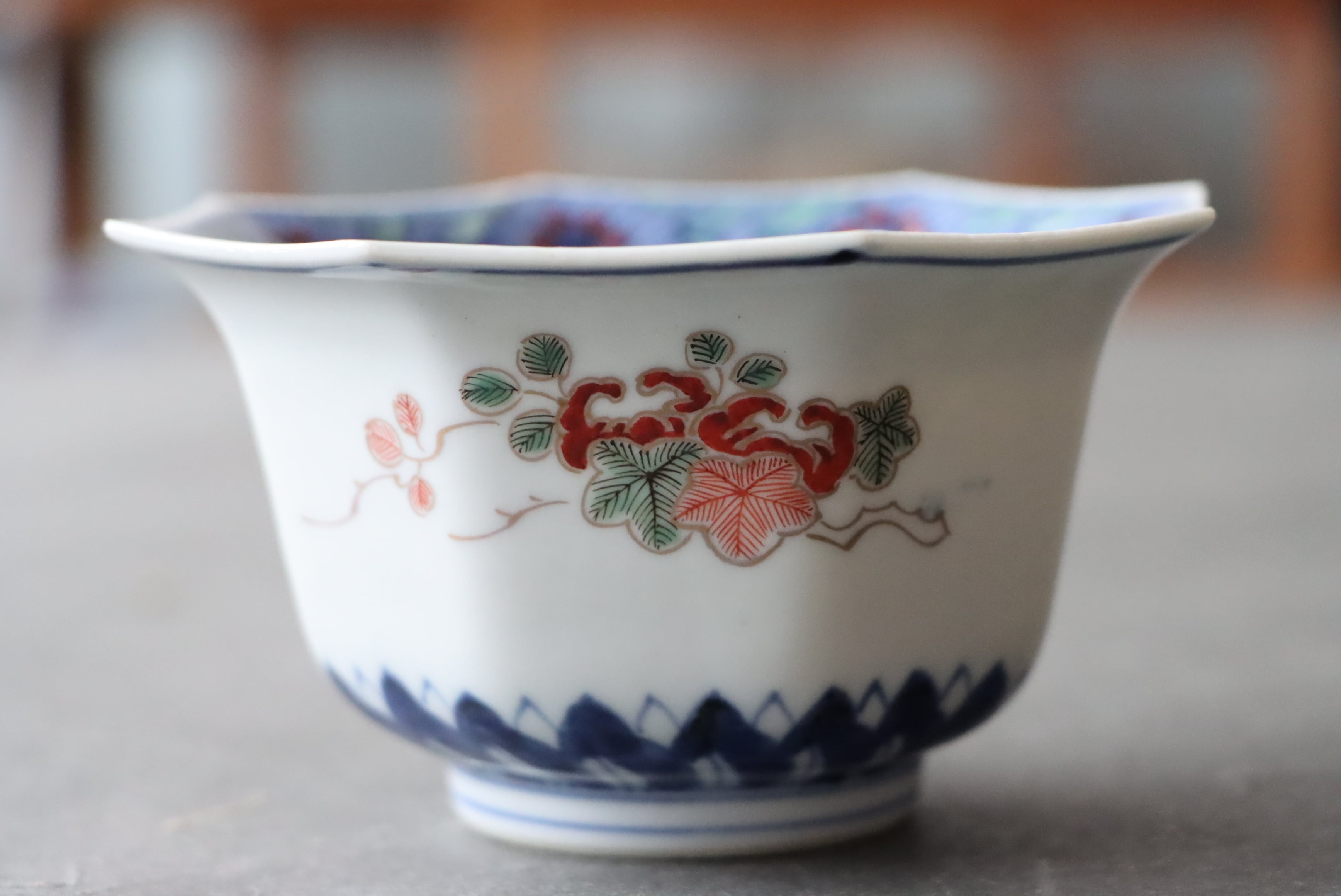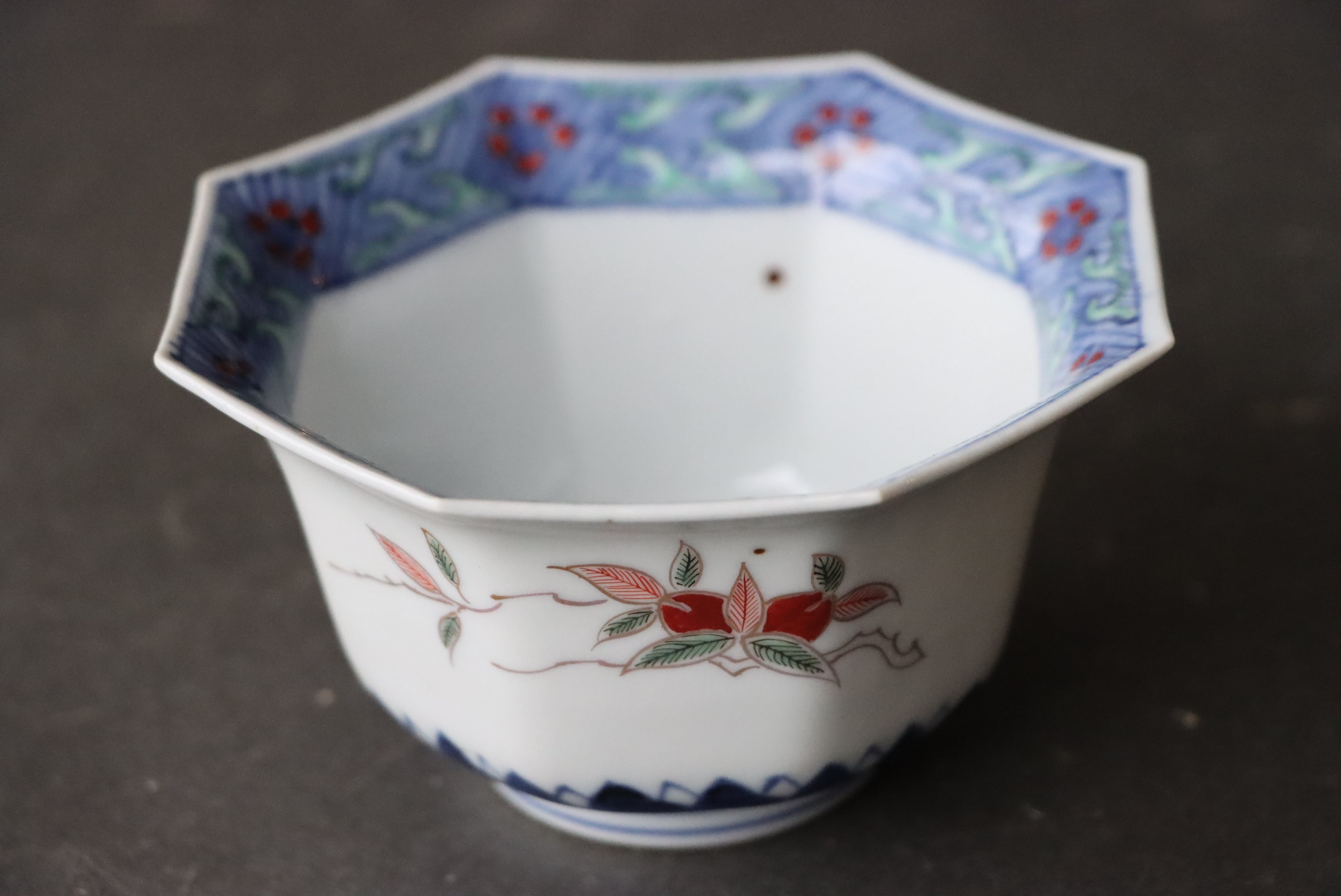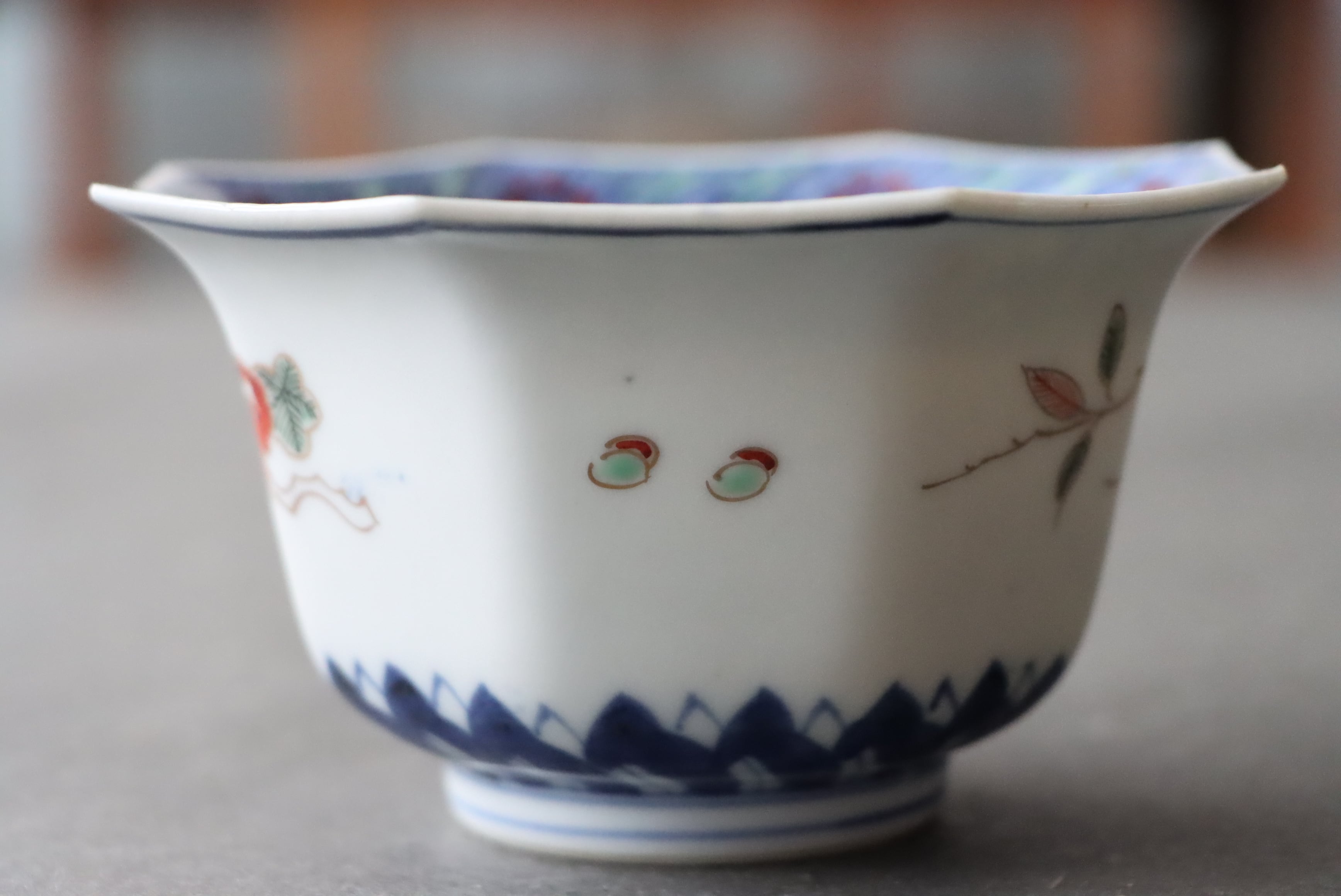 【Kutani "Mukouzuke" cup with Buddha hand citrus and peach design in overglaze enamels.】