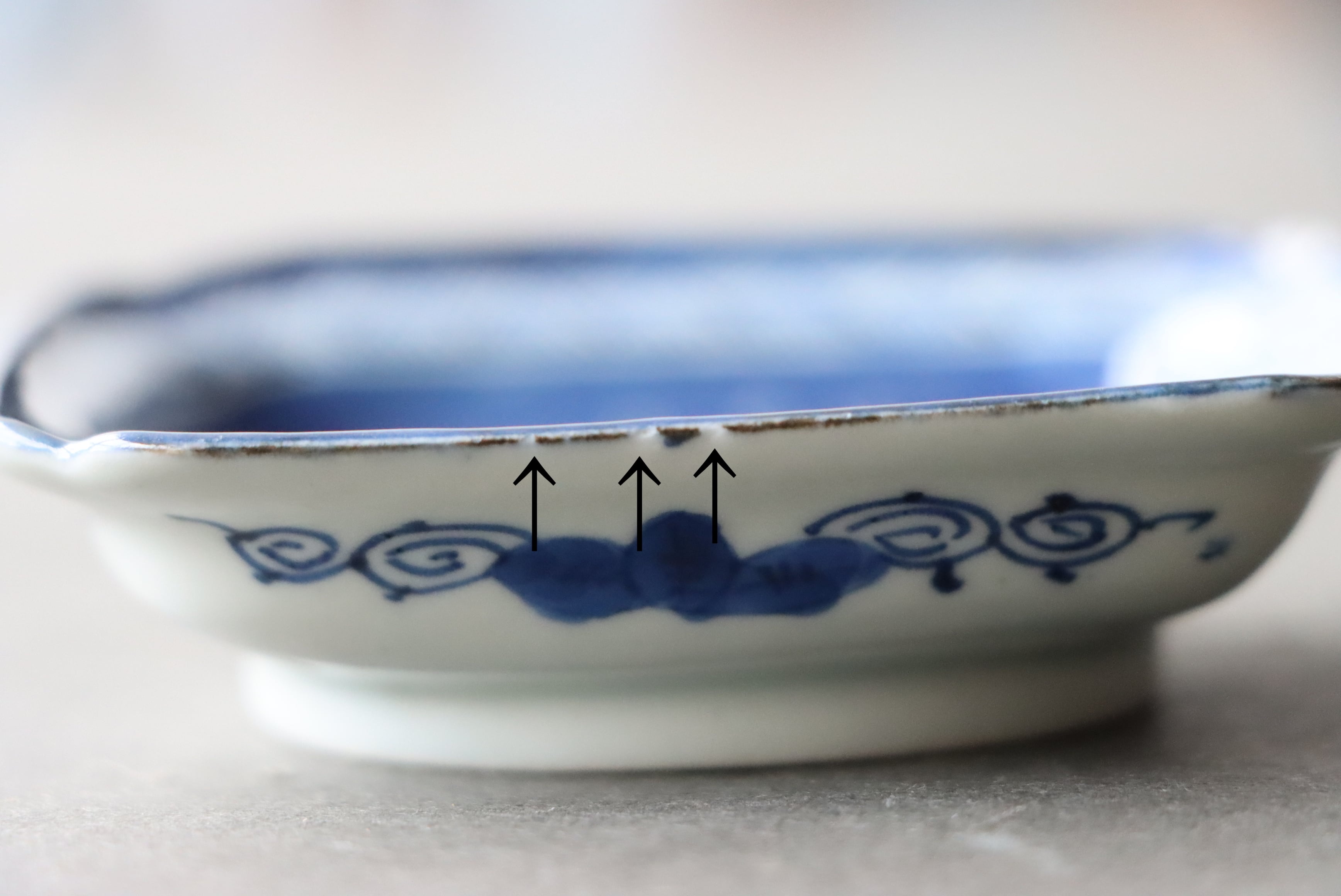 焼成時に窯の中でできる鉄分、くっつき、かまきず、ピンホール、経年による釉薬の薄れがございます。また、一枚一枚手描き、手作りですので器のサイズ(ミリ)、色味、描かれている文様の大きさなど個体差があり、ひとつとして同じものはございません。そういった時代感、個性をご理解いただき、楽しんでくだされば幸いです。電子レンジや食器洗い乾燥機のご使用はお控えください。