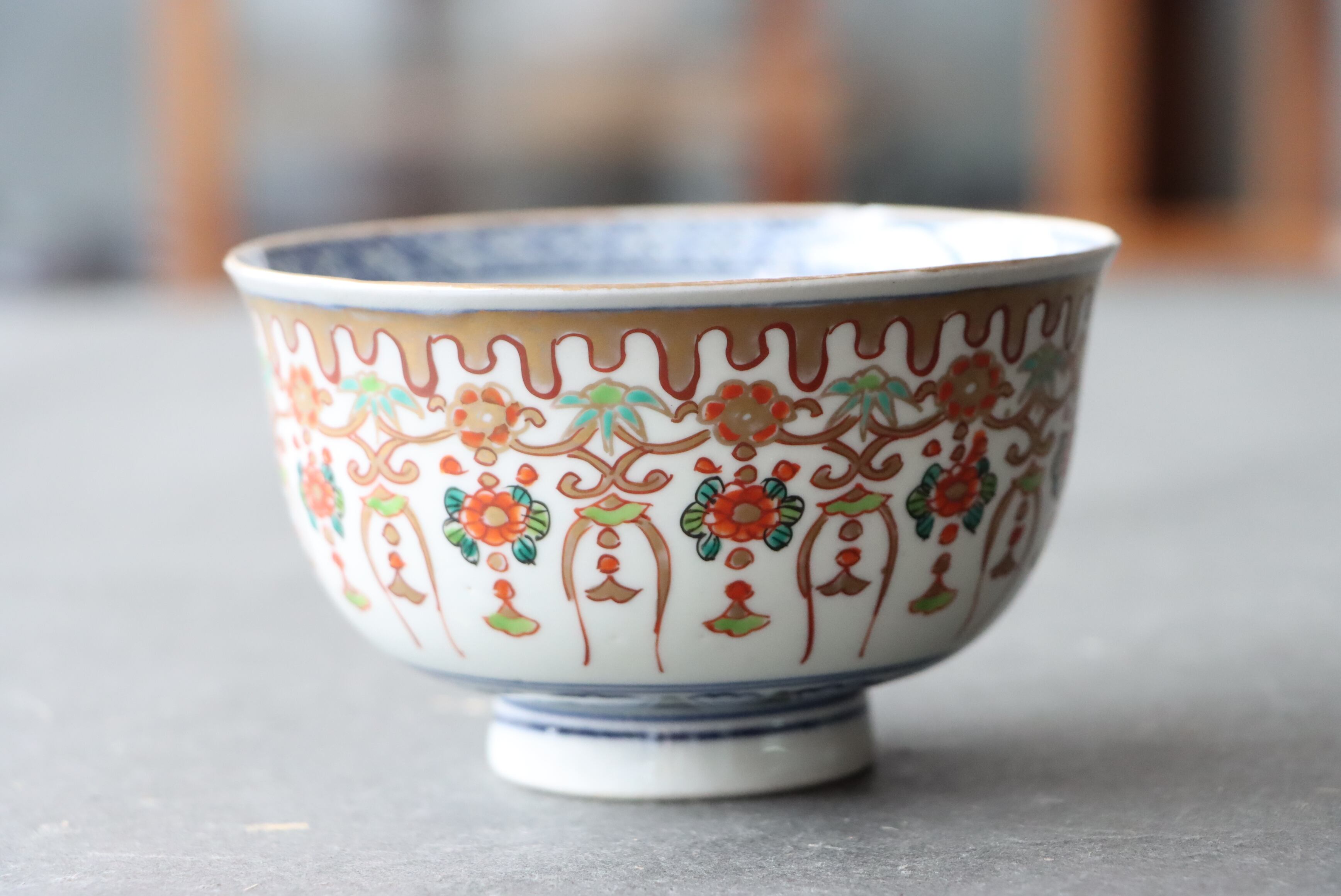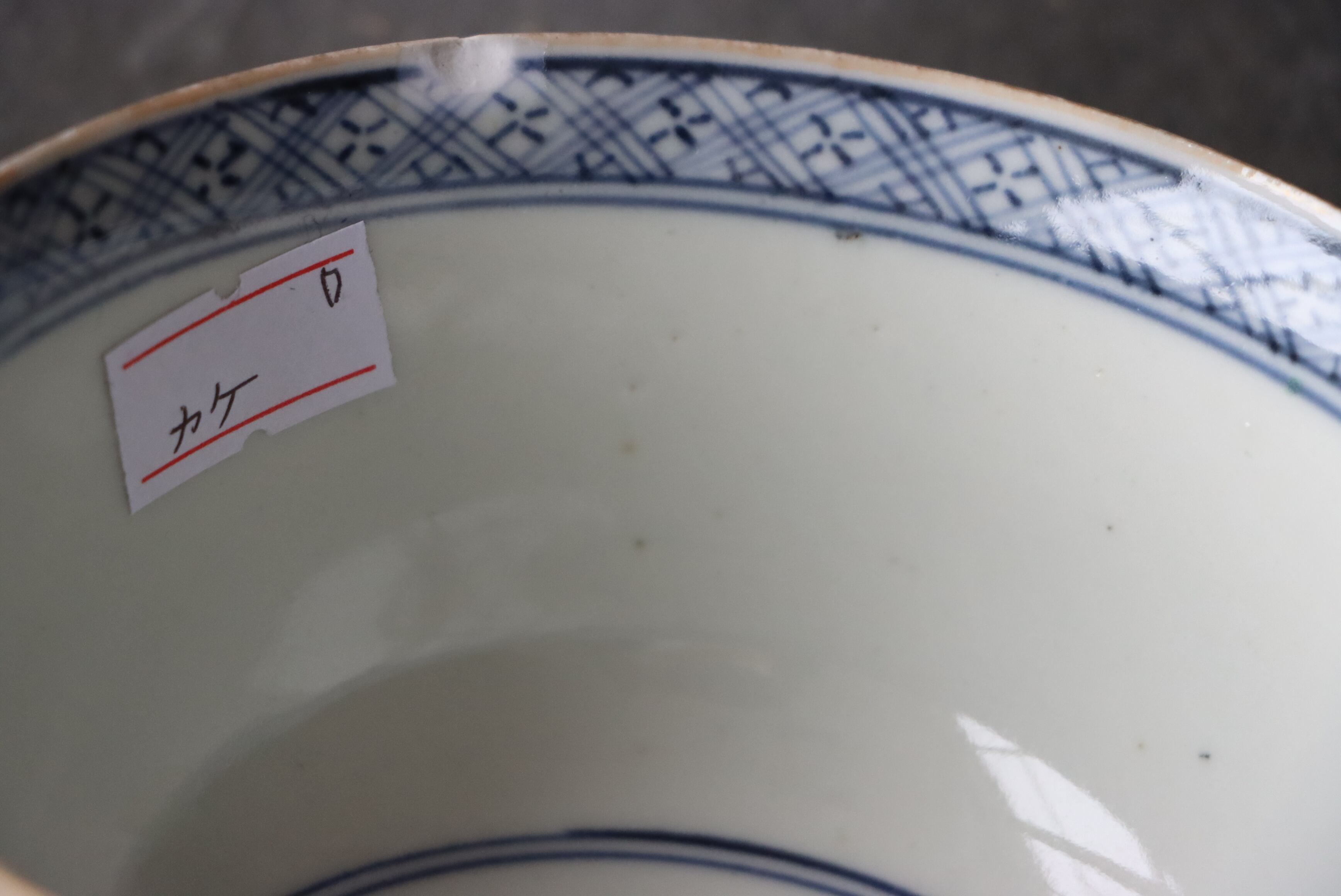 状態:カケ(約1センチ)あり。口縁に施されている金彩が剥離している箇所があります。金継ぎ用に。