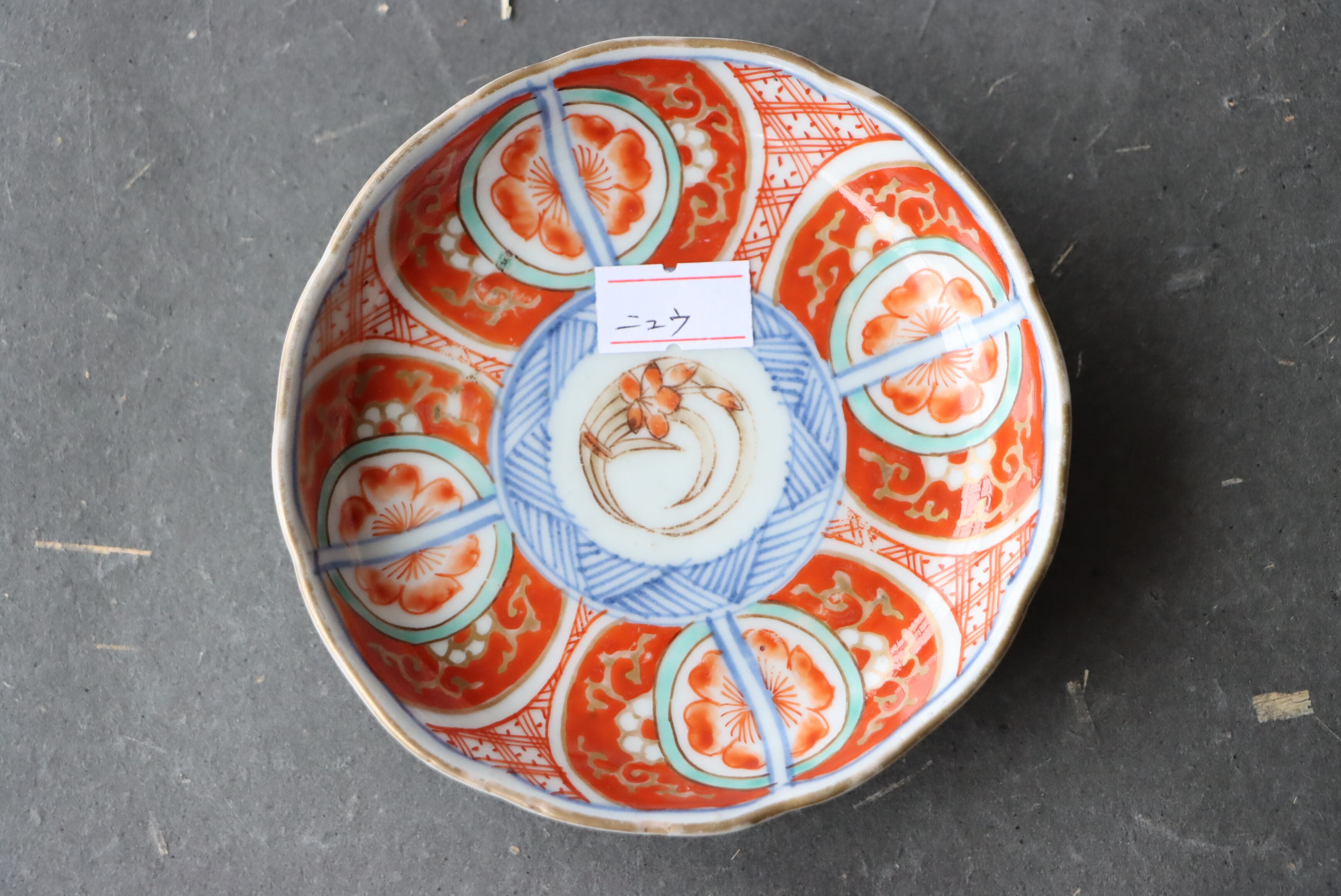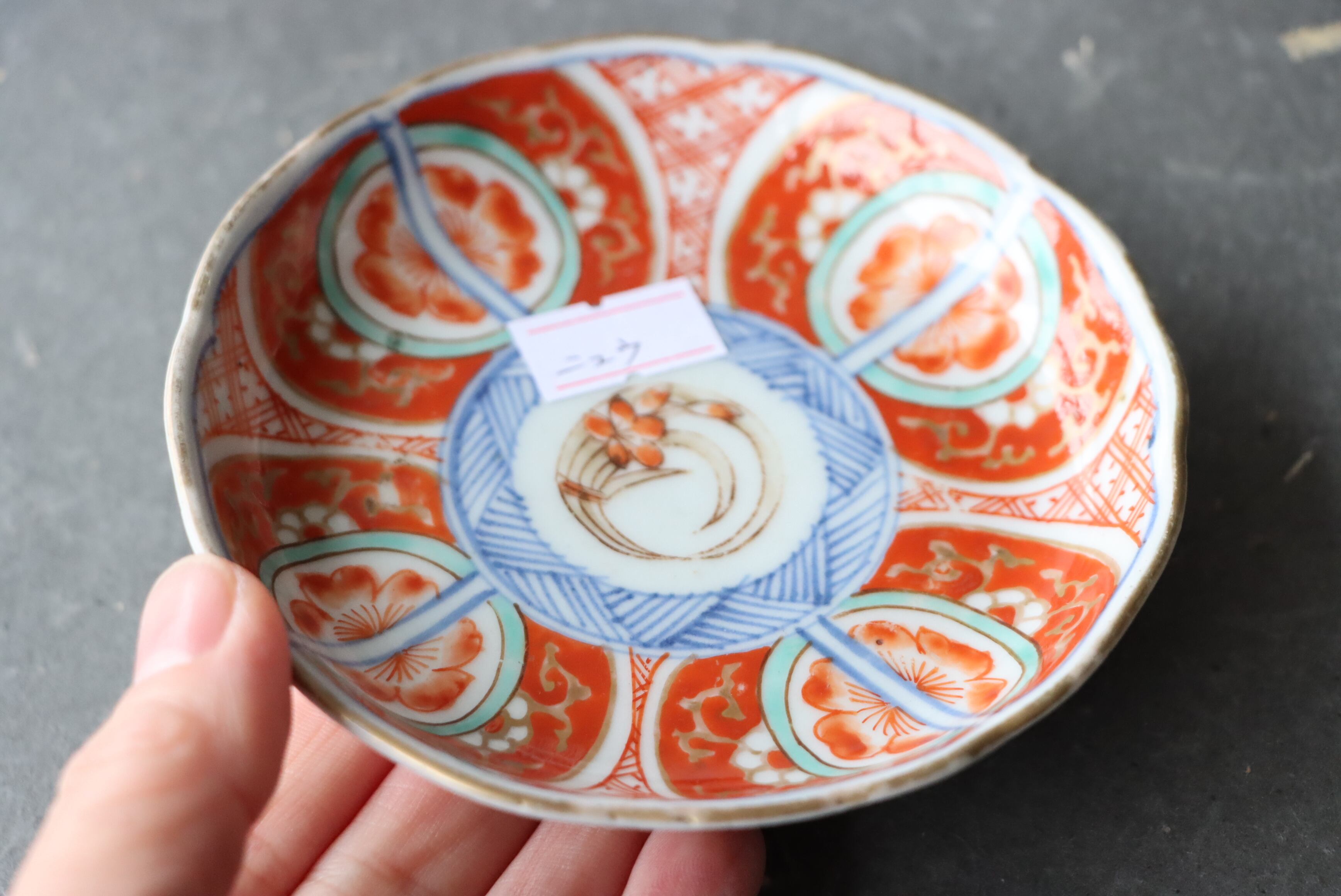 焼成時に窯の中でできる鉄分、くっつき、かまきず、ピンホール、経年による釉薬の薄れがございます。また、一枚一枚手描き、手作りですので器のサイズ(ミリ)、色味、描かれている文様の大きさなど個体差があり、ひとつとして同じものはございません。そういった時代感、個性をご理解いただき、楽しんでくだされば幸いです。電子レンジや食器洗い乾燥機のご使用はお控えください。