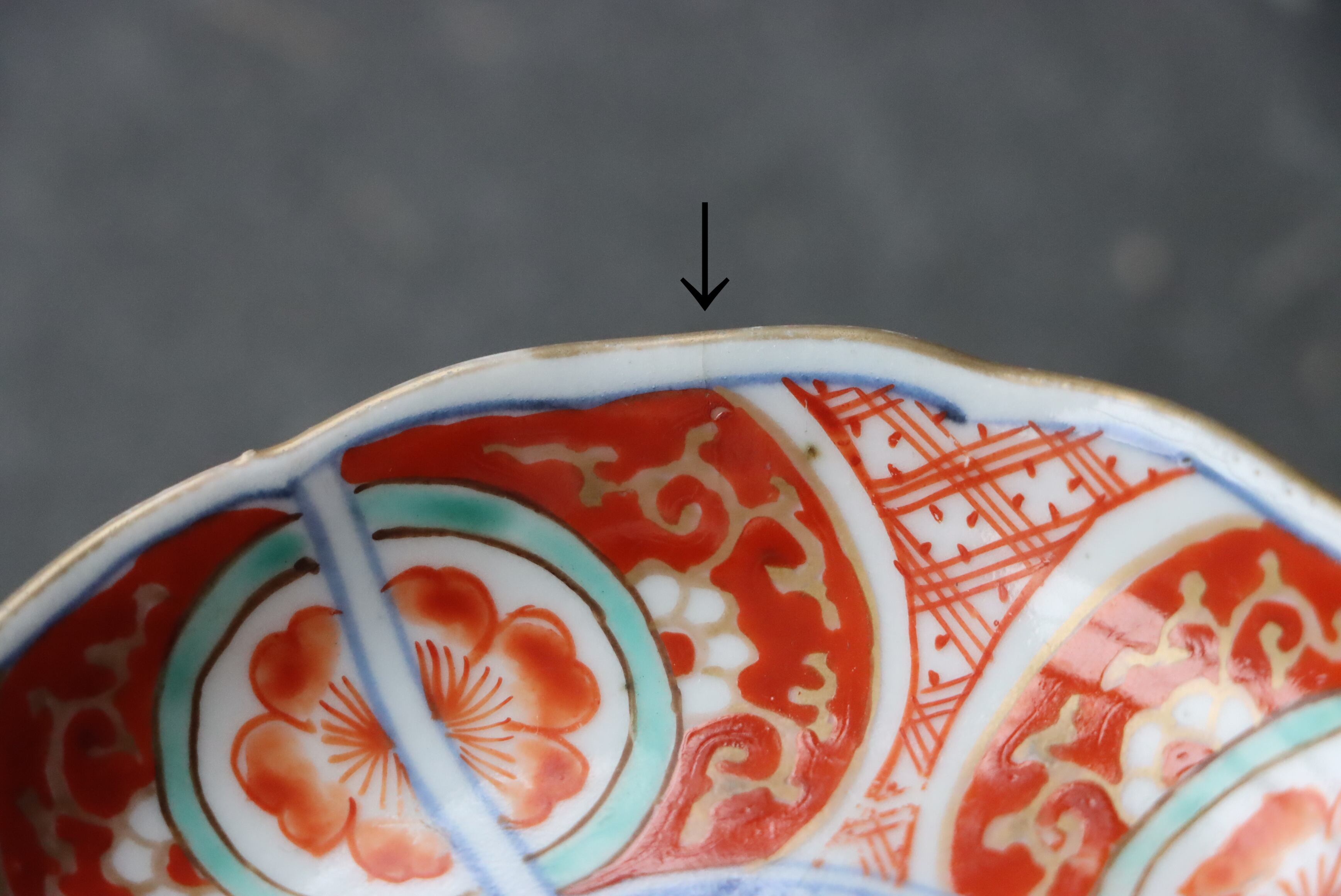 状態:ニュウ(約1.5センチ)あり。気をつけて使用すれば普段使い可能です。また、口縁に施されている金彩が剥離している箇所があります。もしくは金継ぎ用に。