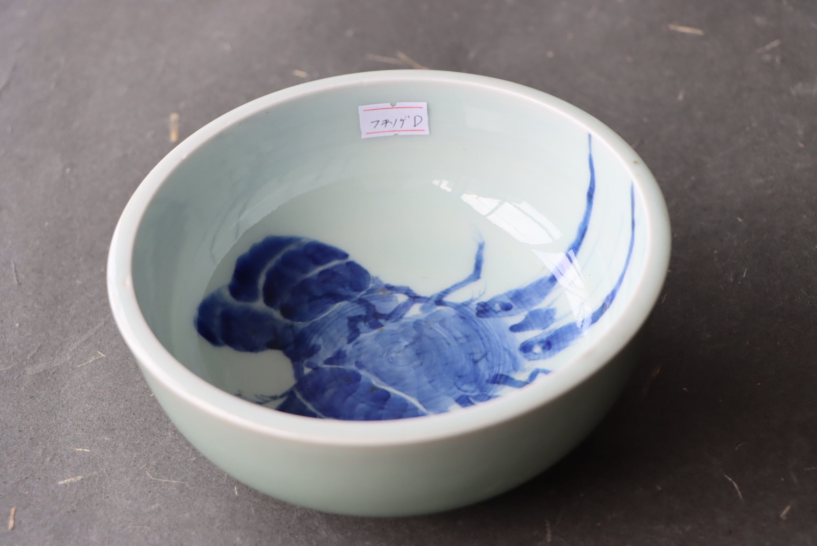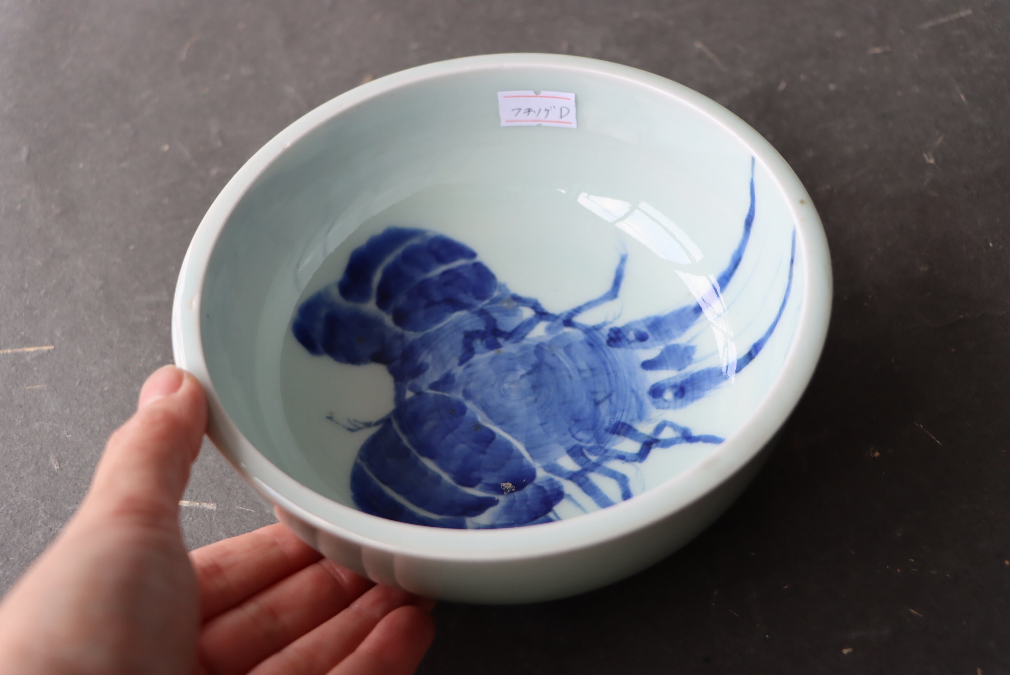 焼成時に窯の中でできる鉄分、くっつき、かまきず、経年による釉薬の薄れがございます。また、一枚一枚手描き、手作りですので器のサイズ(ミリ)、色味、描かれている文様の大きさなど個体差があり、ひとつとして同じものはございません。そういった時代感、個性をご理解いただき、楽しんでくだされば幸いです。電子レンジや食器洗い乾燥機のご使用はお控えください。
