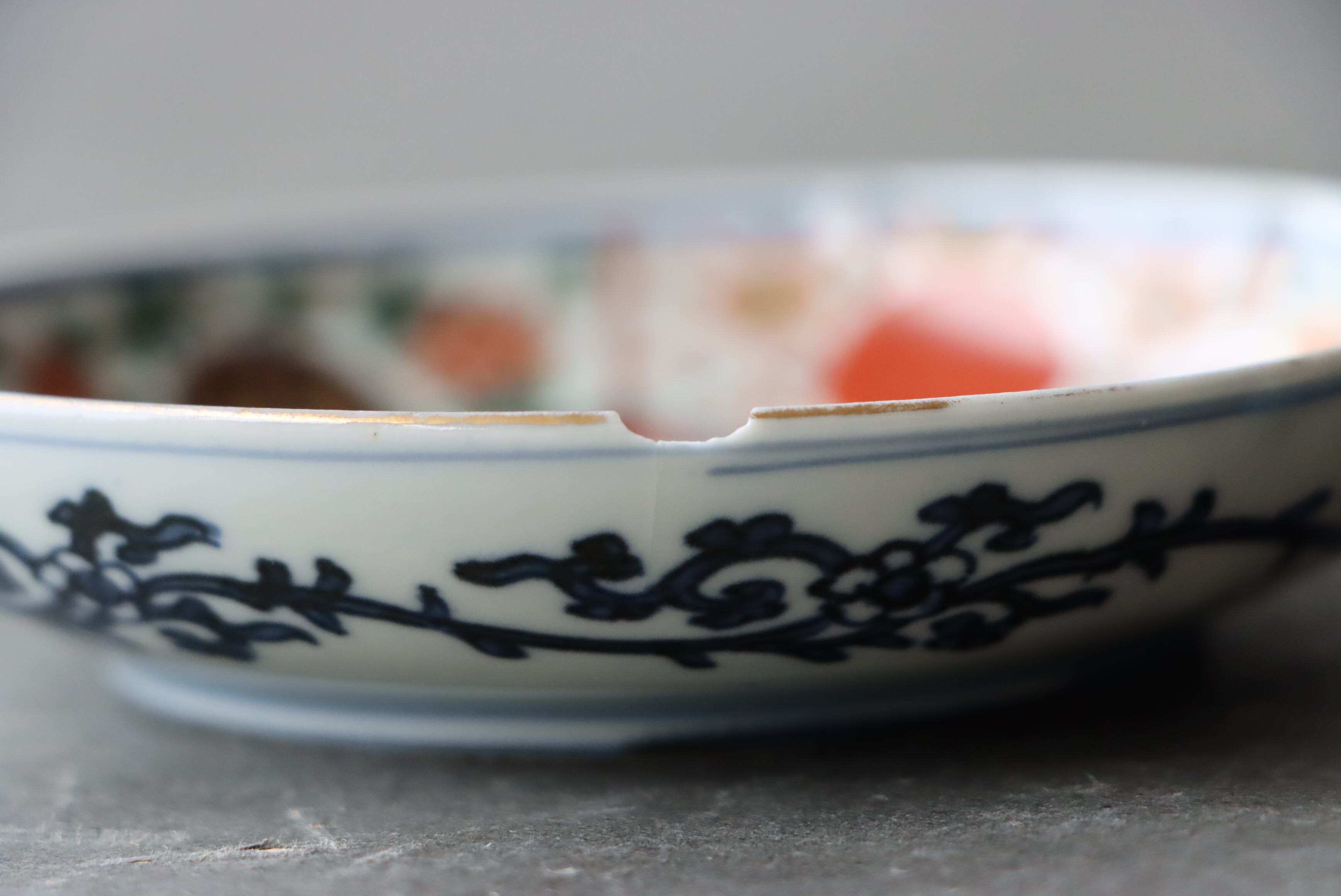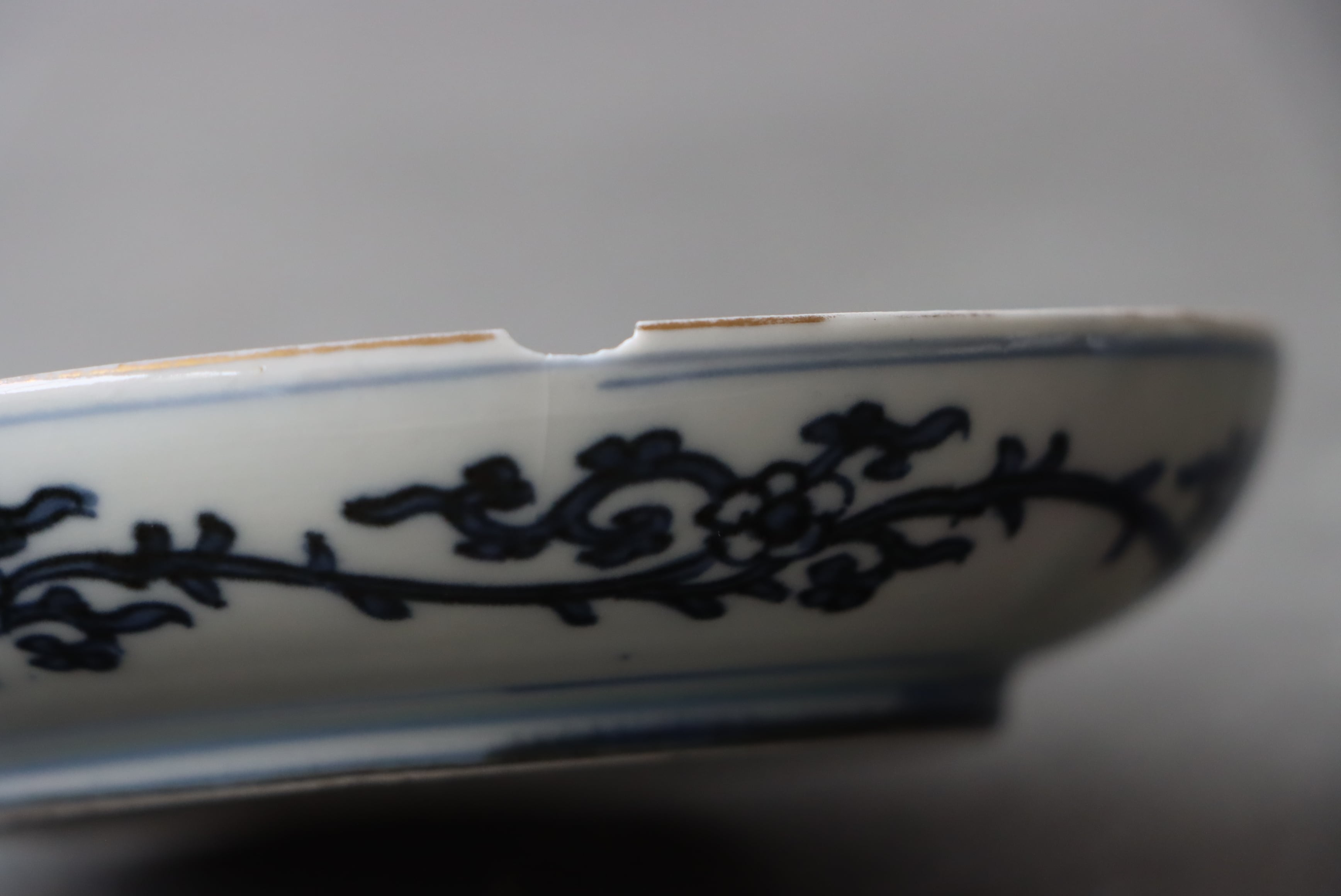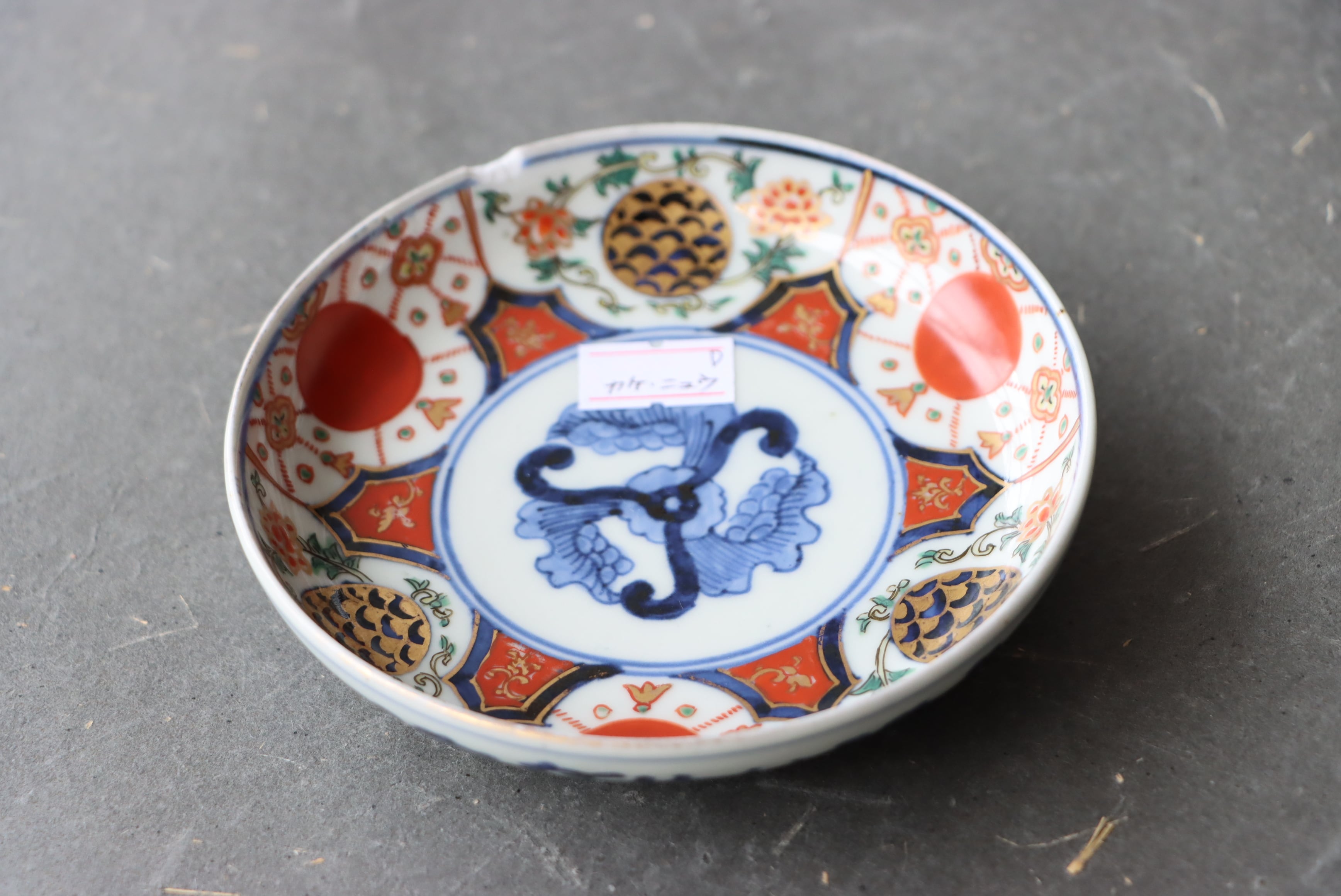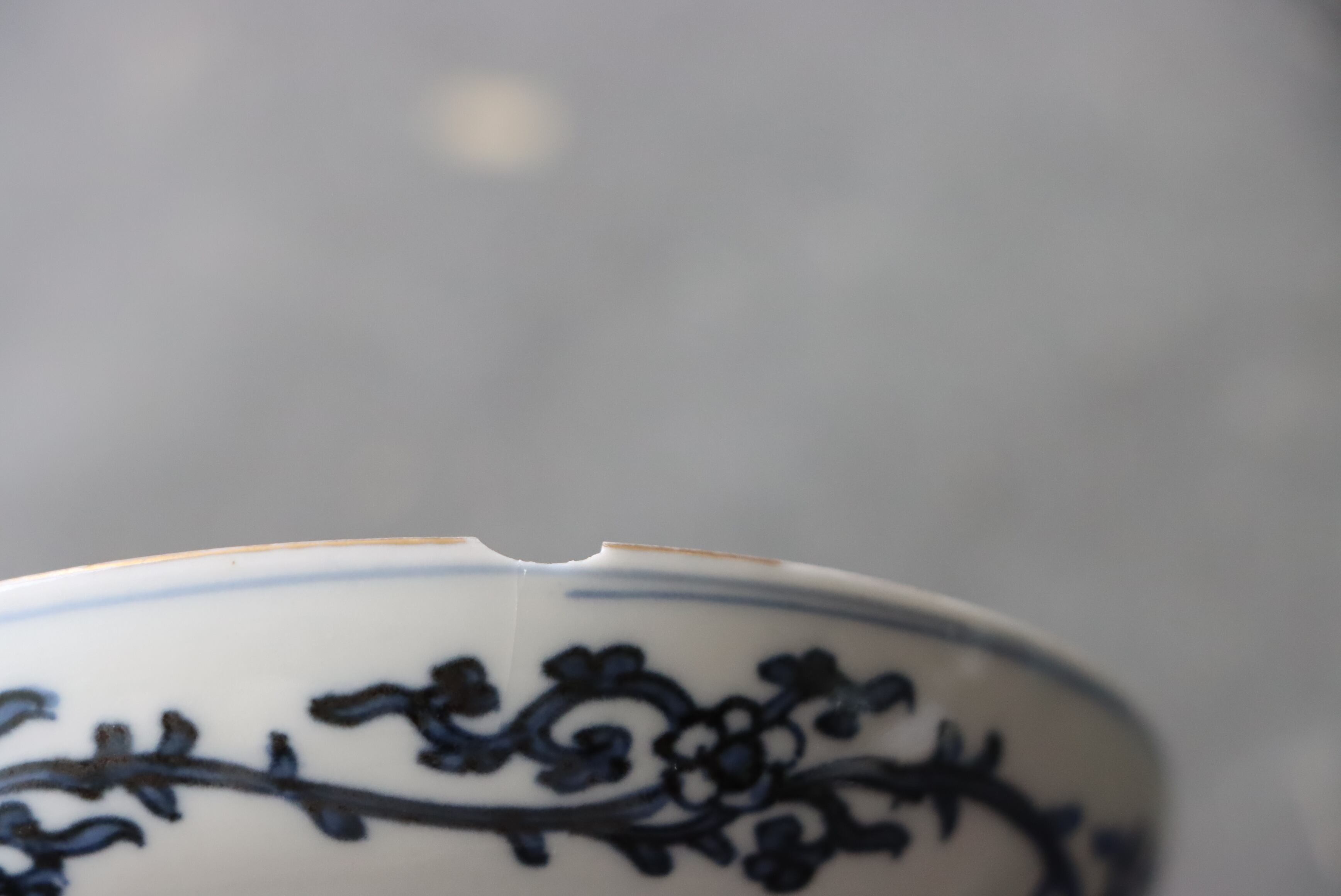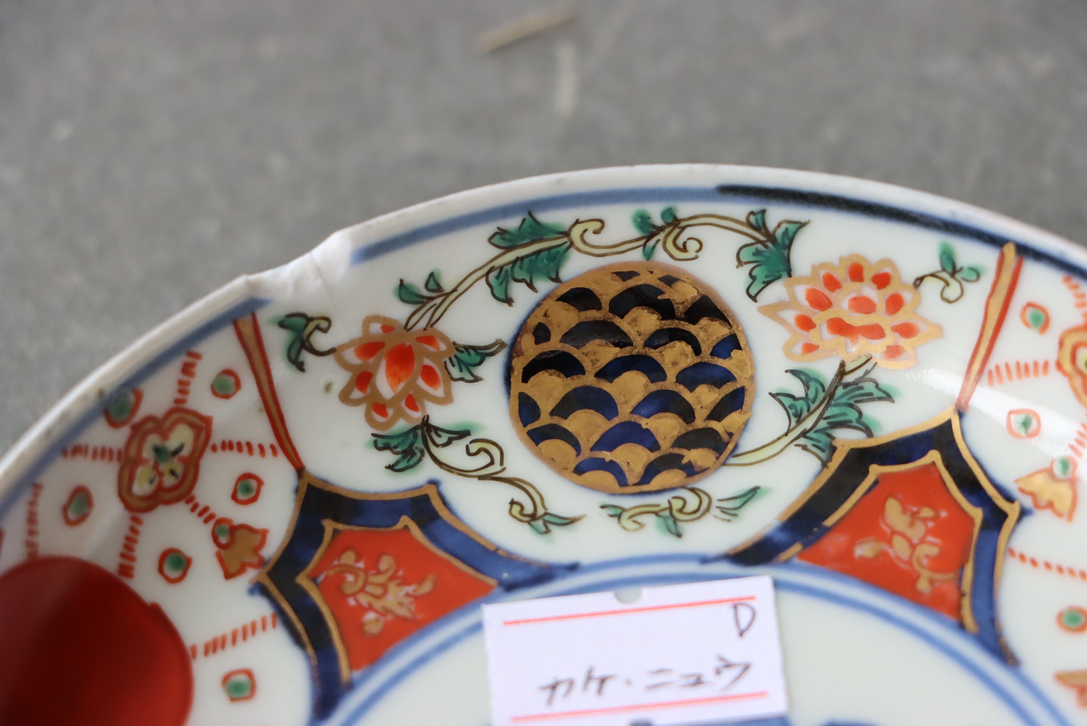 状態:カケ(約1センチ)、カケと同じ箇所からニュウ(約1センチ)あり。口縁に施されている金彩が剥離している箇所があります。金継ぎ用に。
