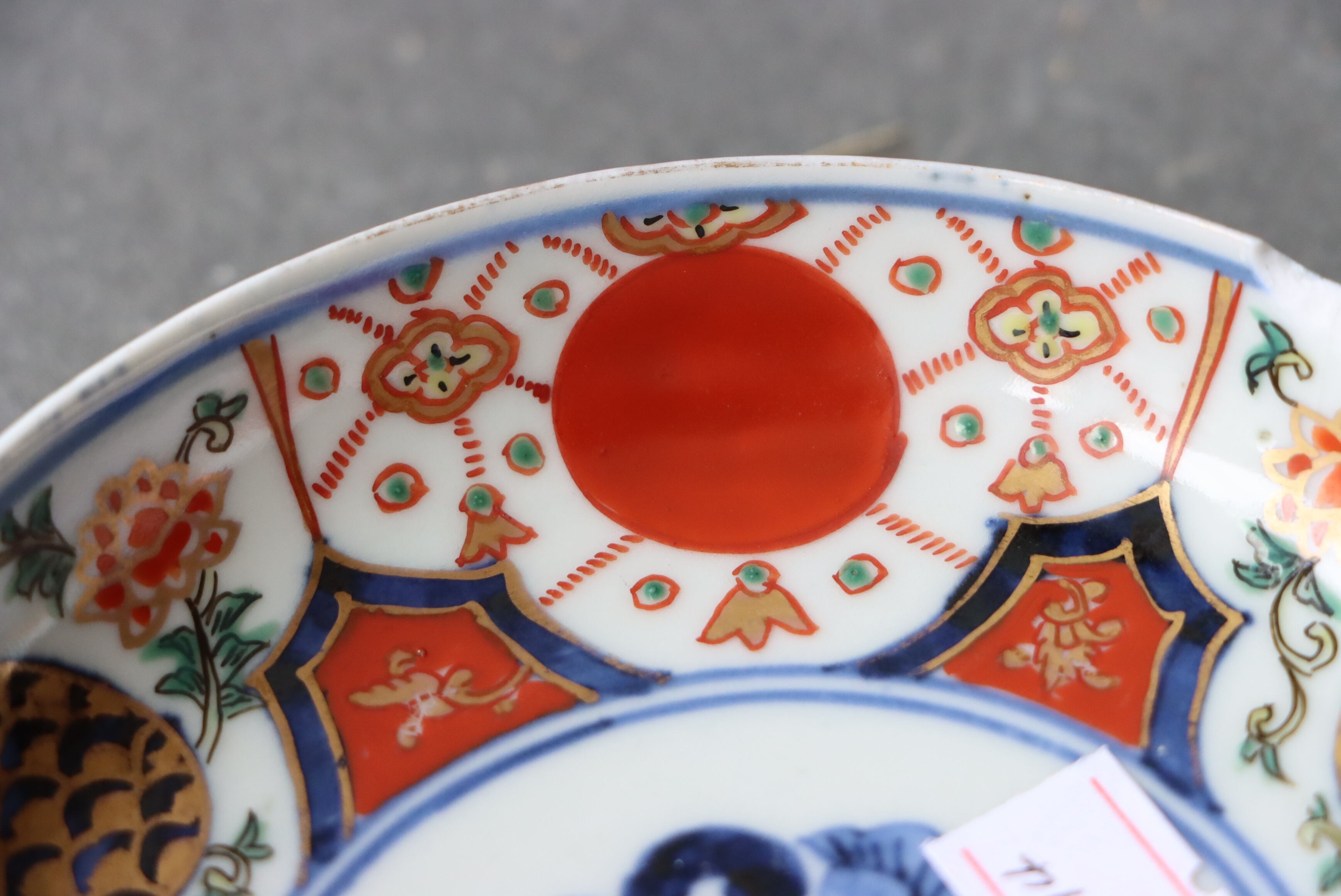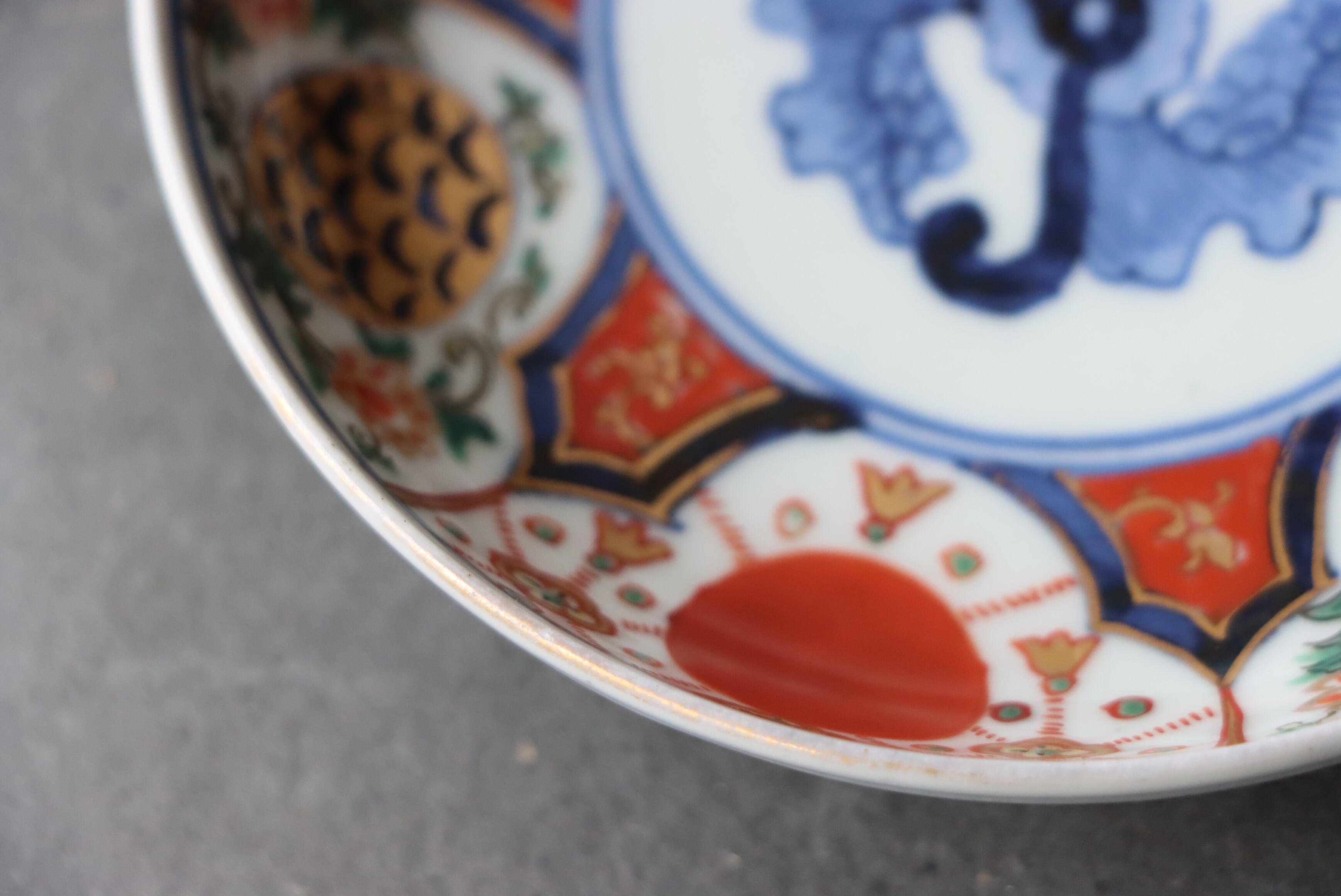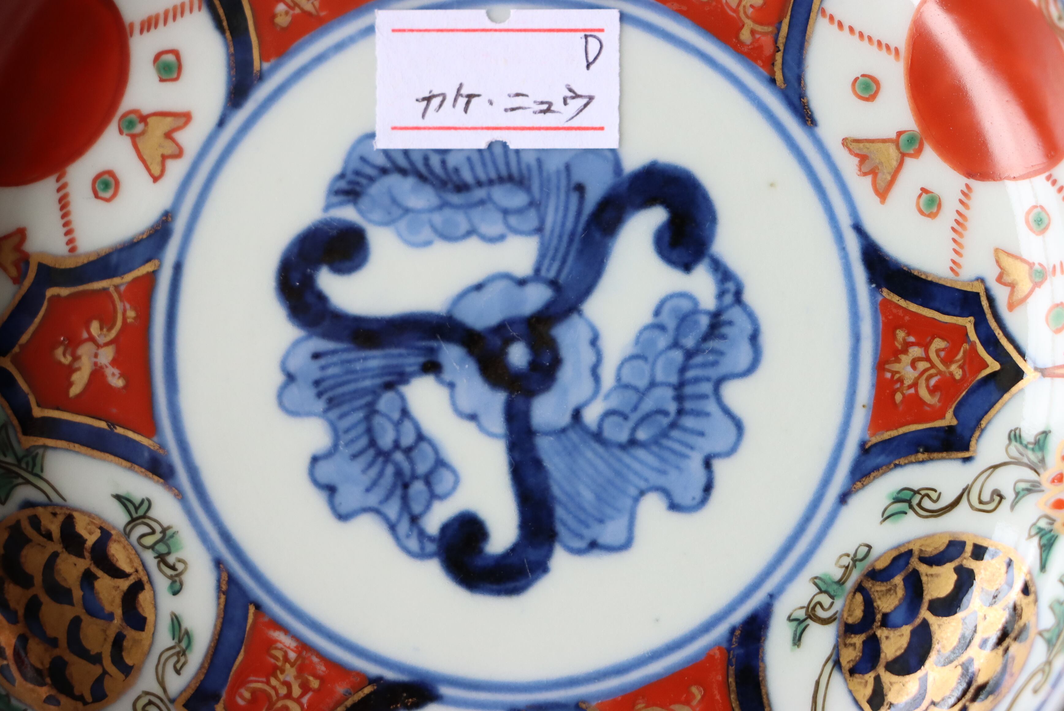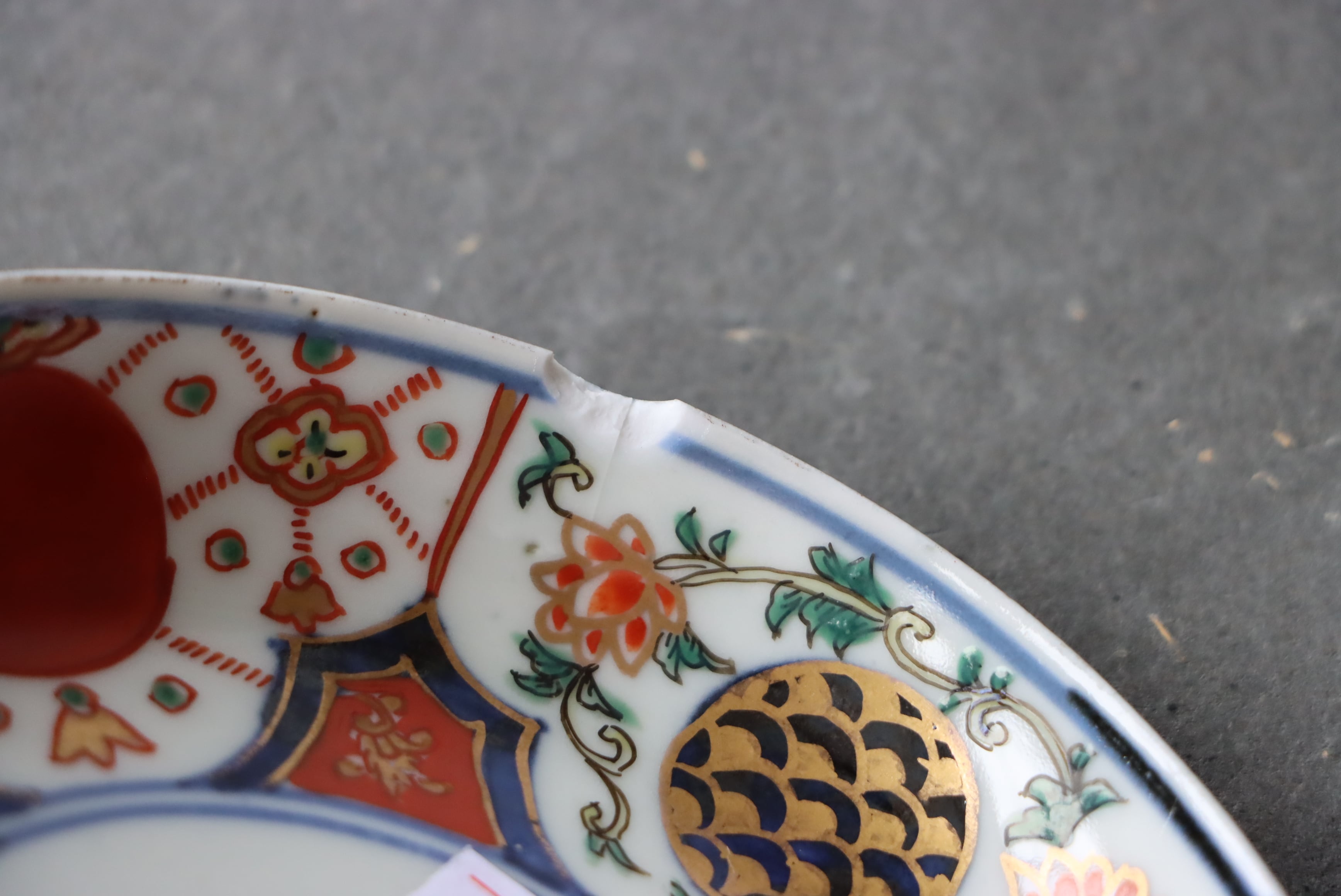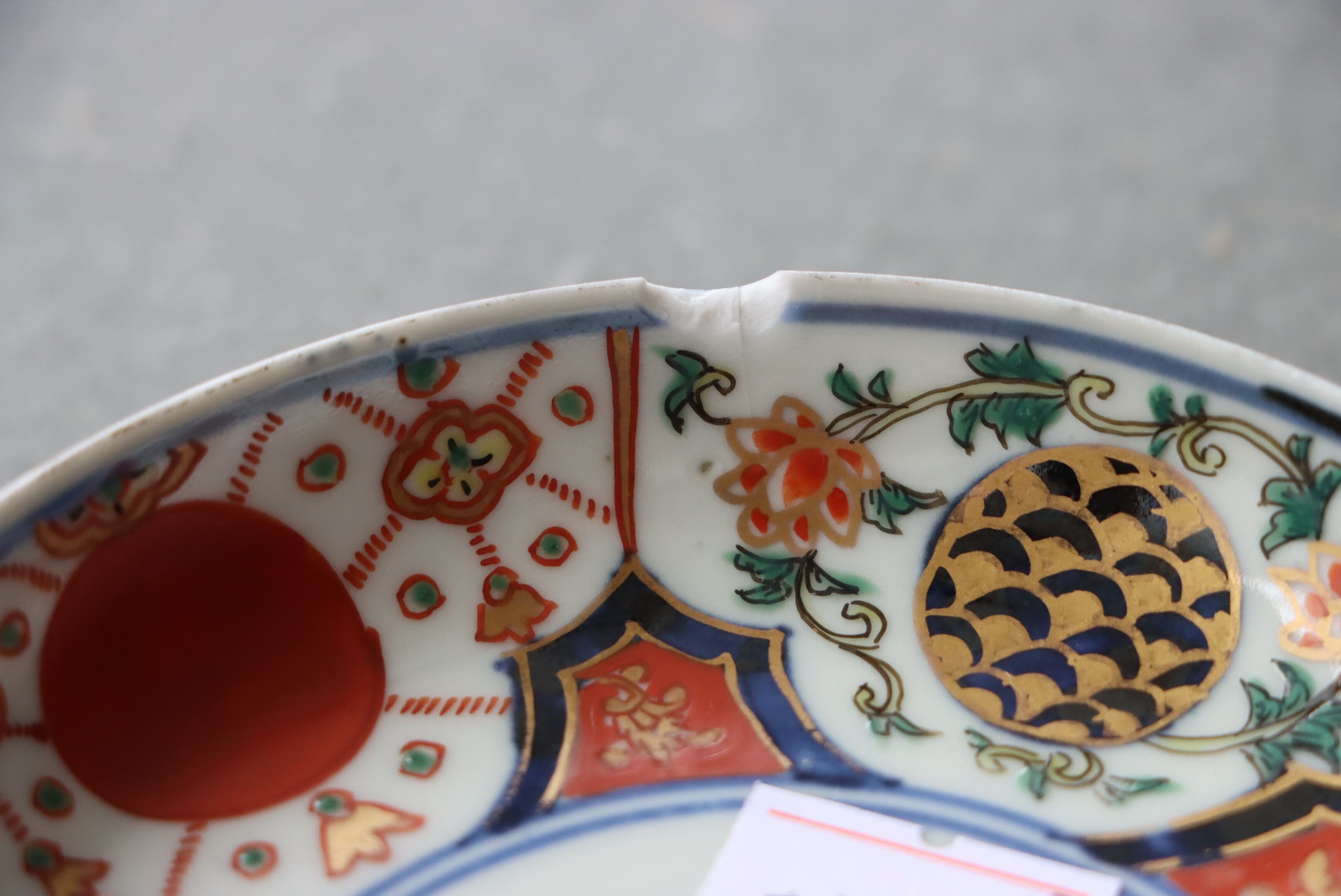 状態:カケ(約1センチ)、カケと同じ箇所からニュウ(約1センチ)あり。口縁に施されている金彩が剥離している箇所があります。金継ぎ用に。