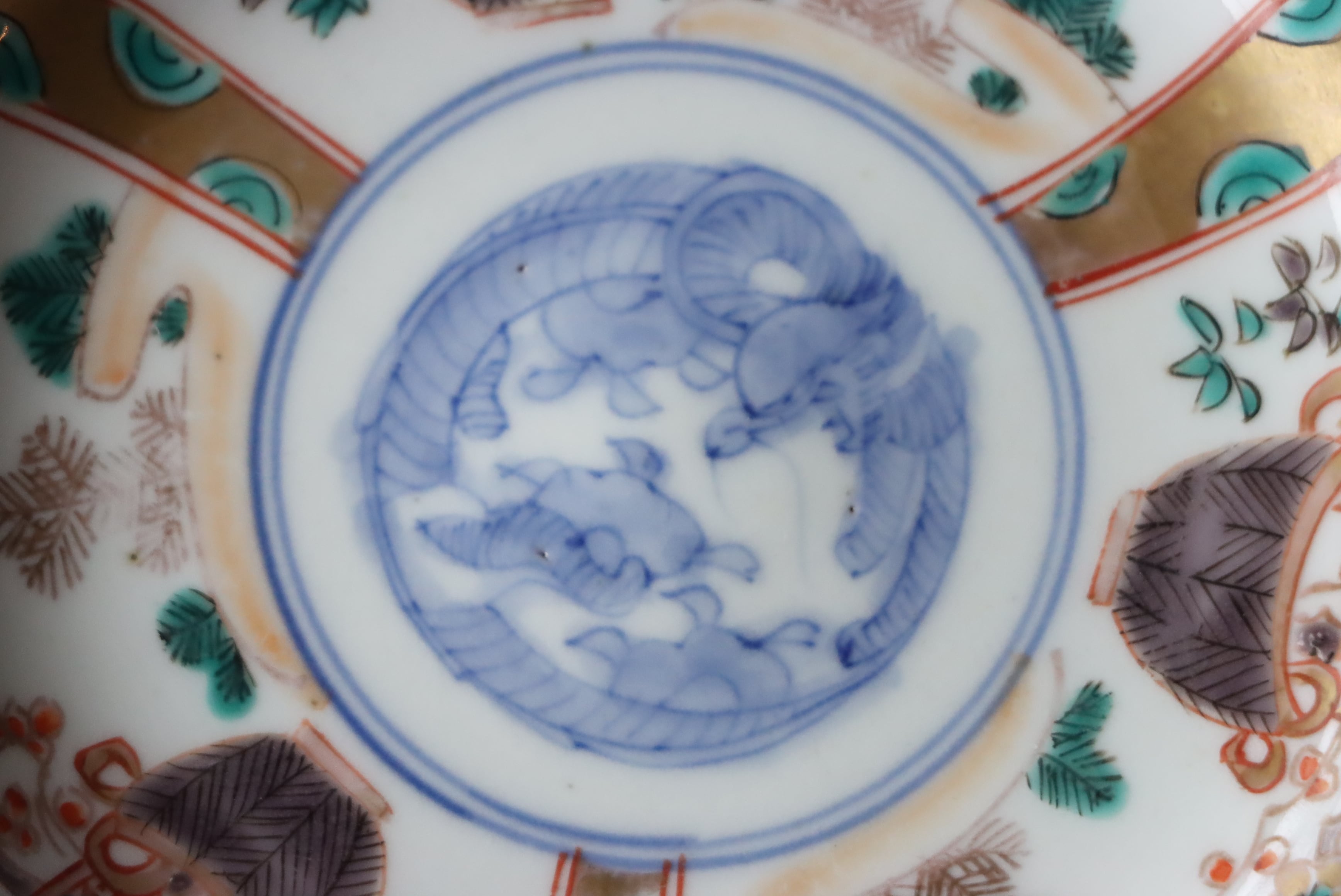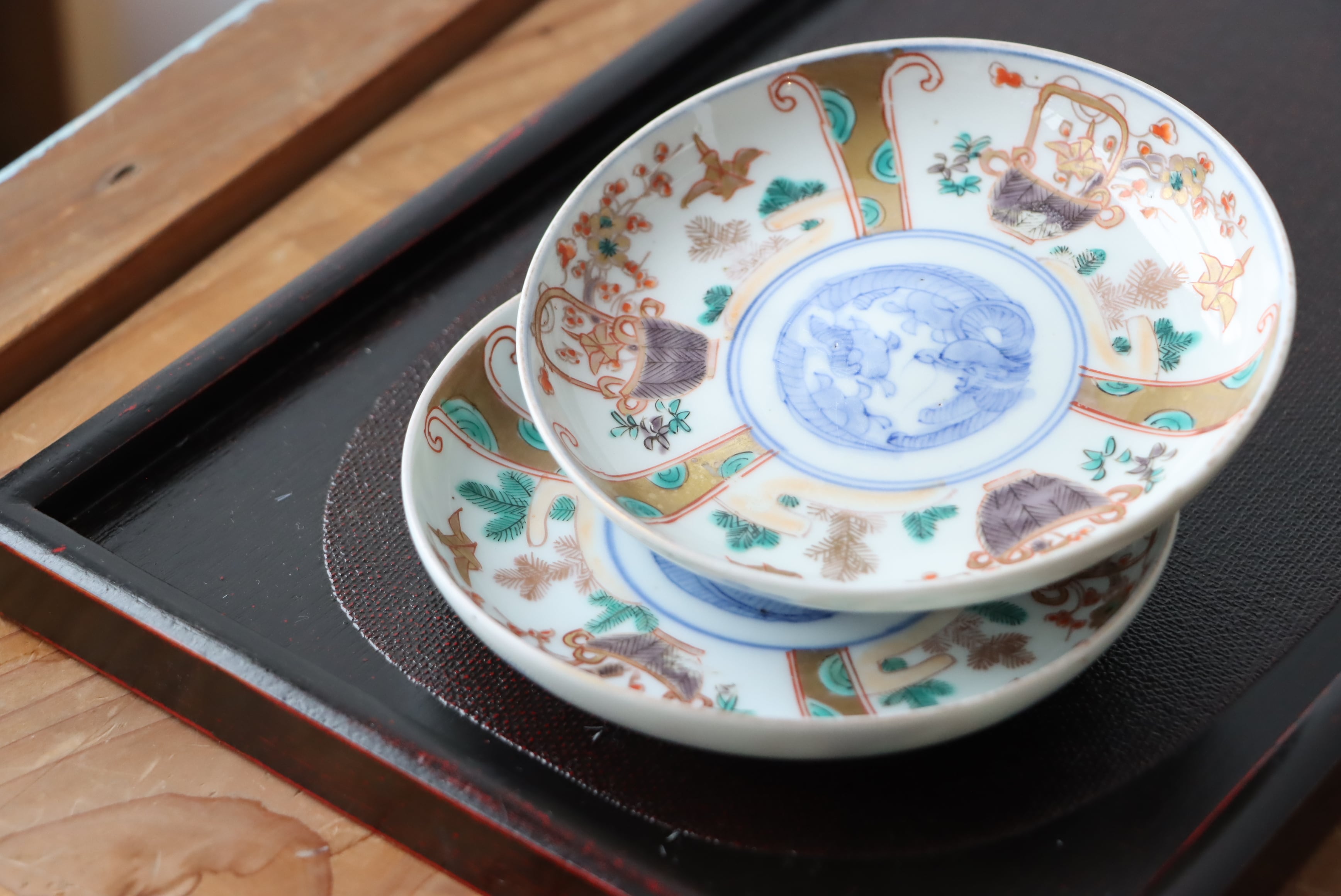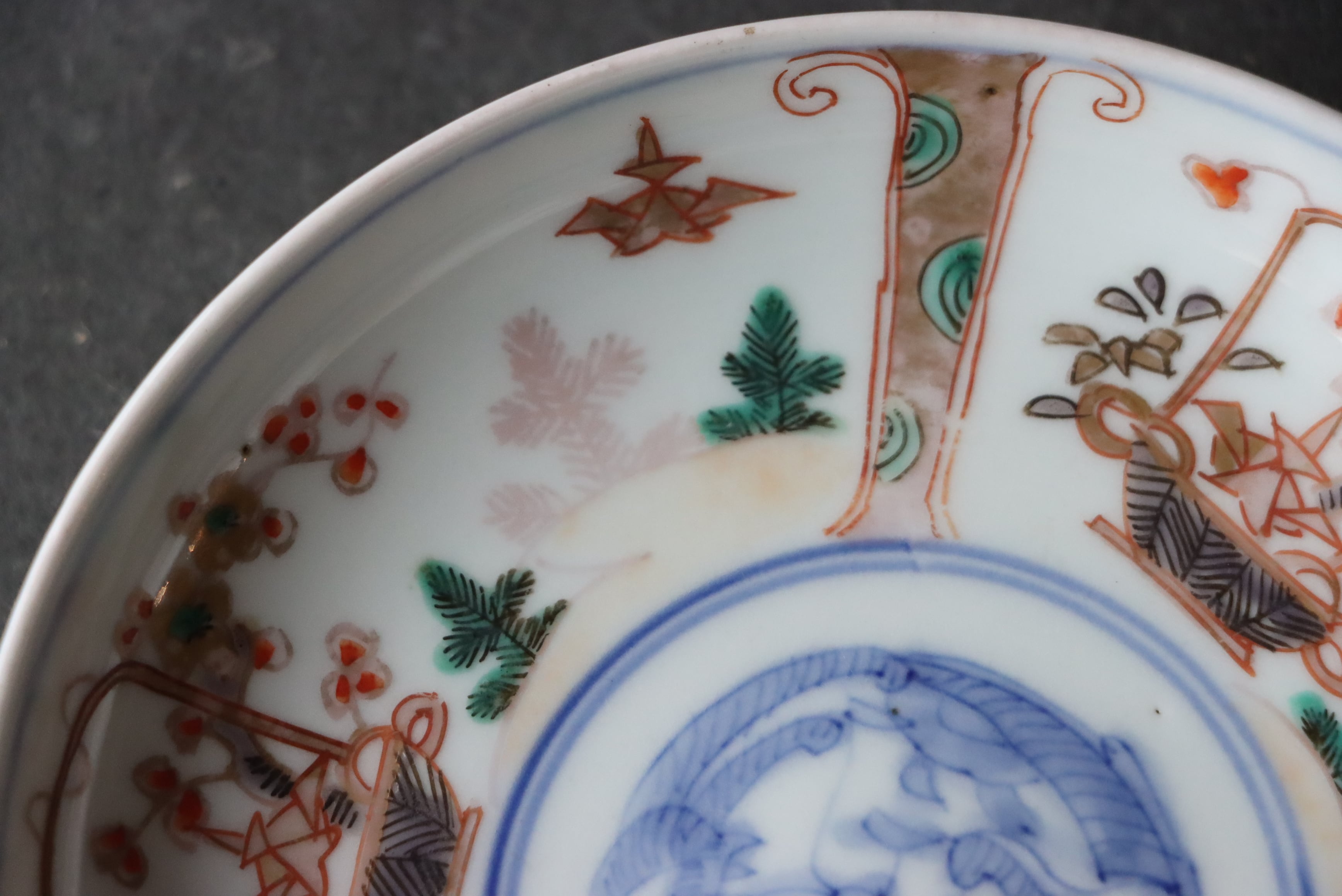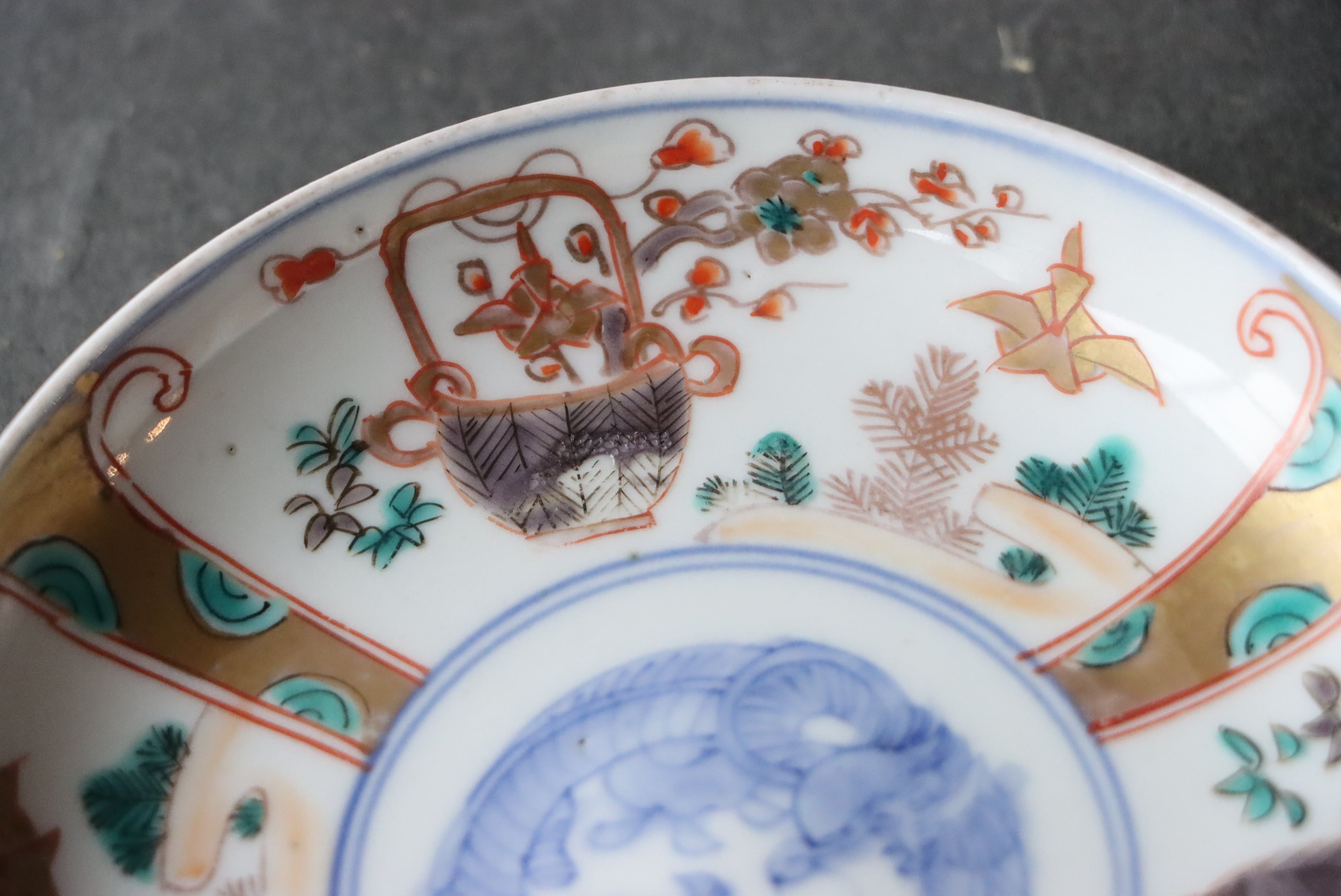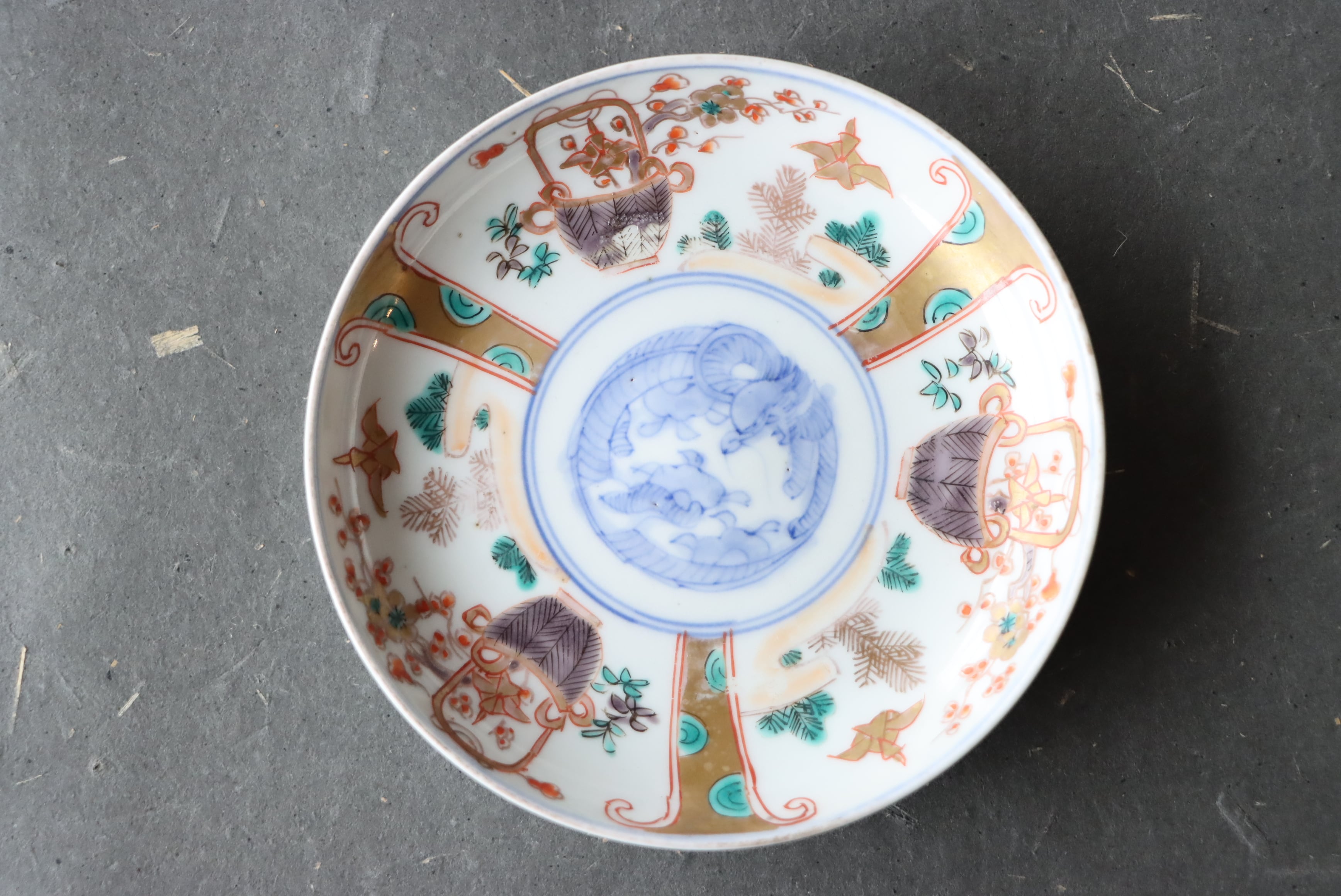 【Imari small plate with orizuru and basket design in overglaze enamels.】