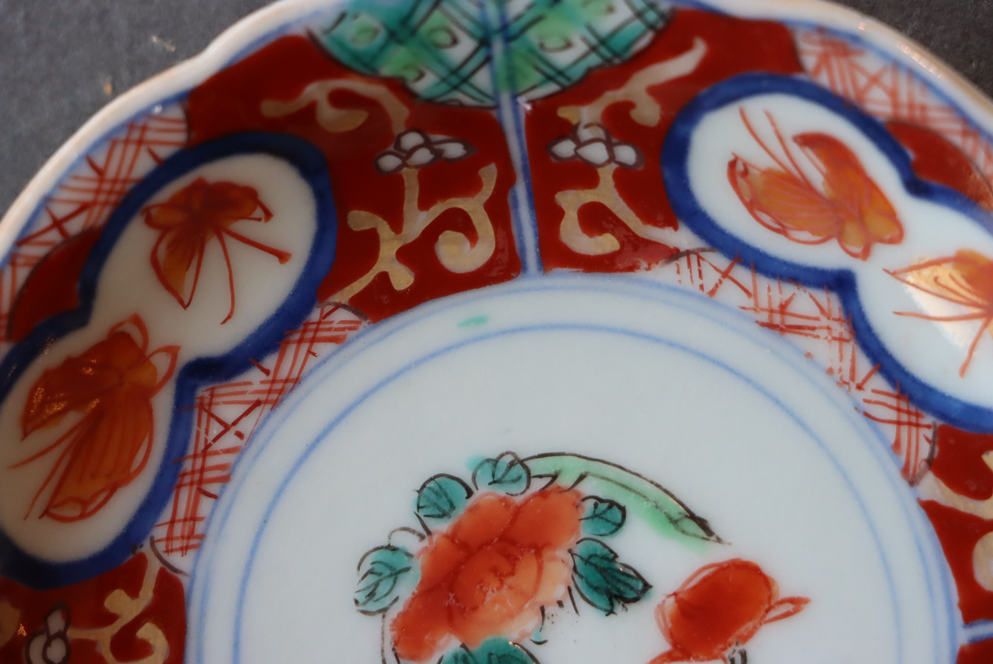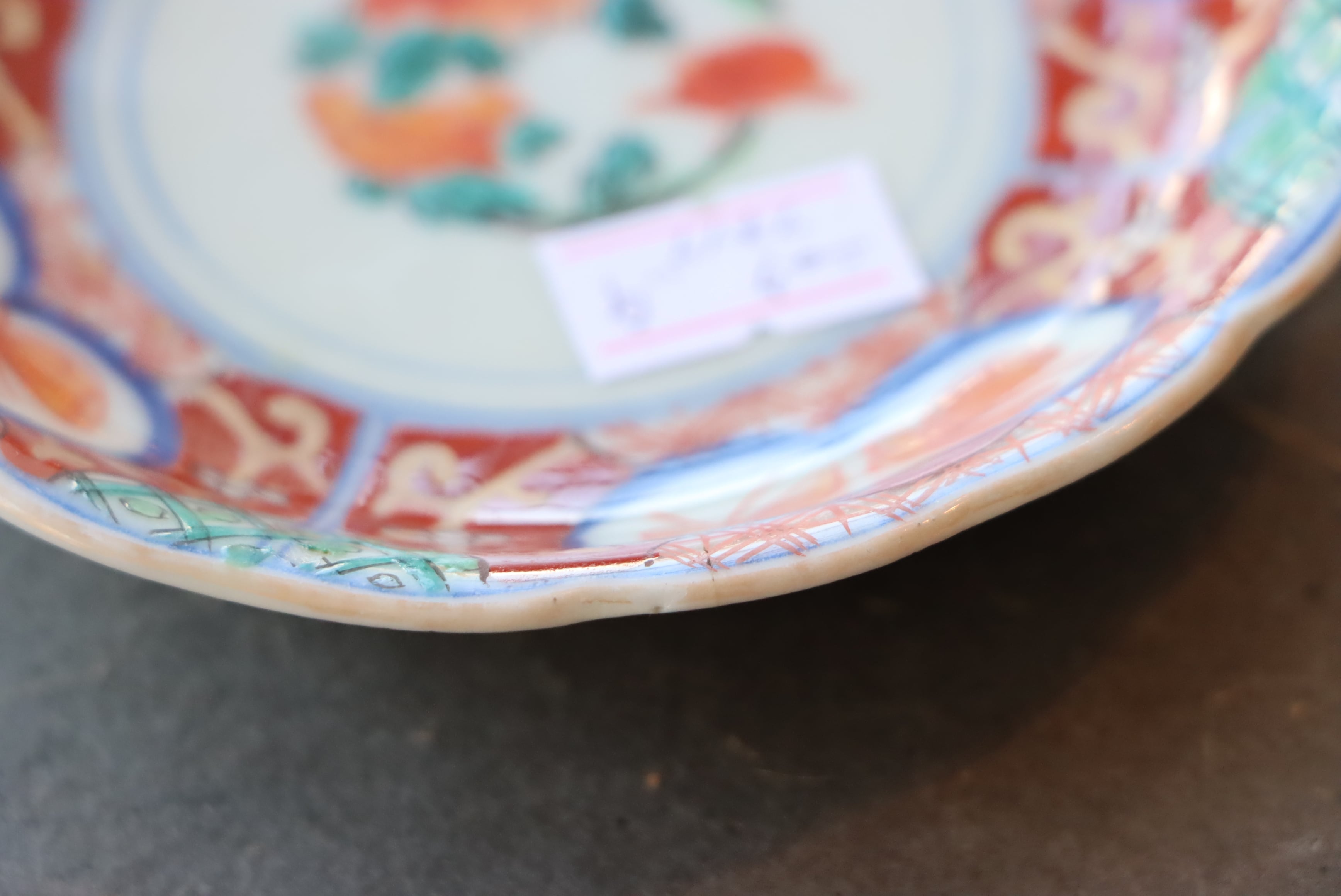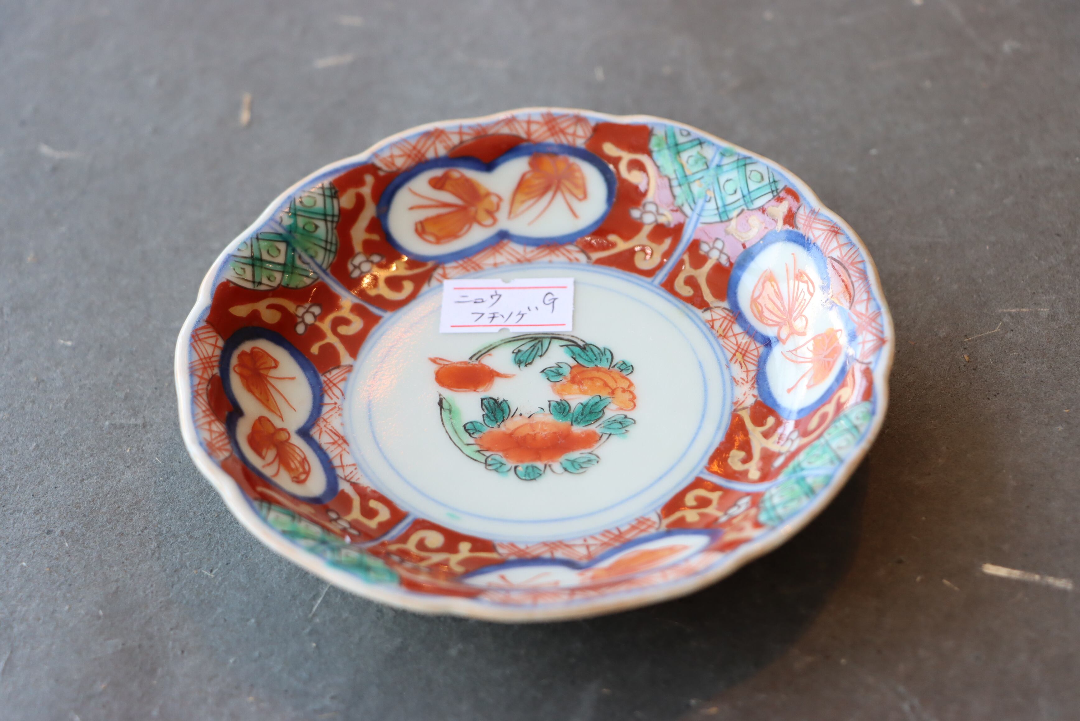 状態:小さなフチソゲ×2、ニュウ(約2センチ)あり。ニュウに時代色が入っております。その他、釉薬の剥がれ、口縁に施されている金彩が剥離している箇所があります。お写真にて状態をご確認ください。
