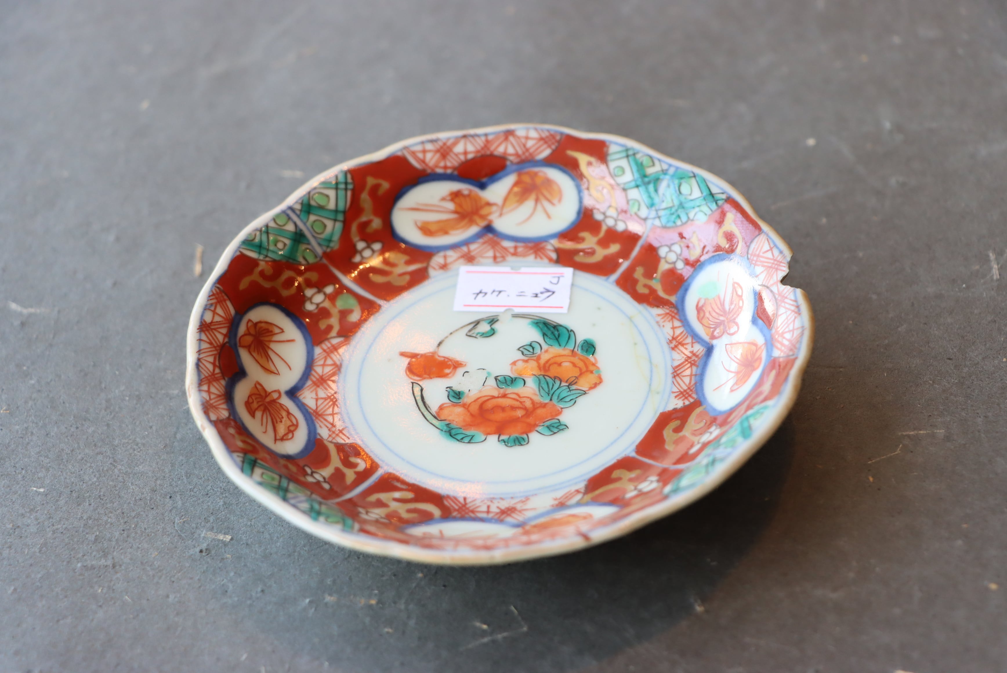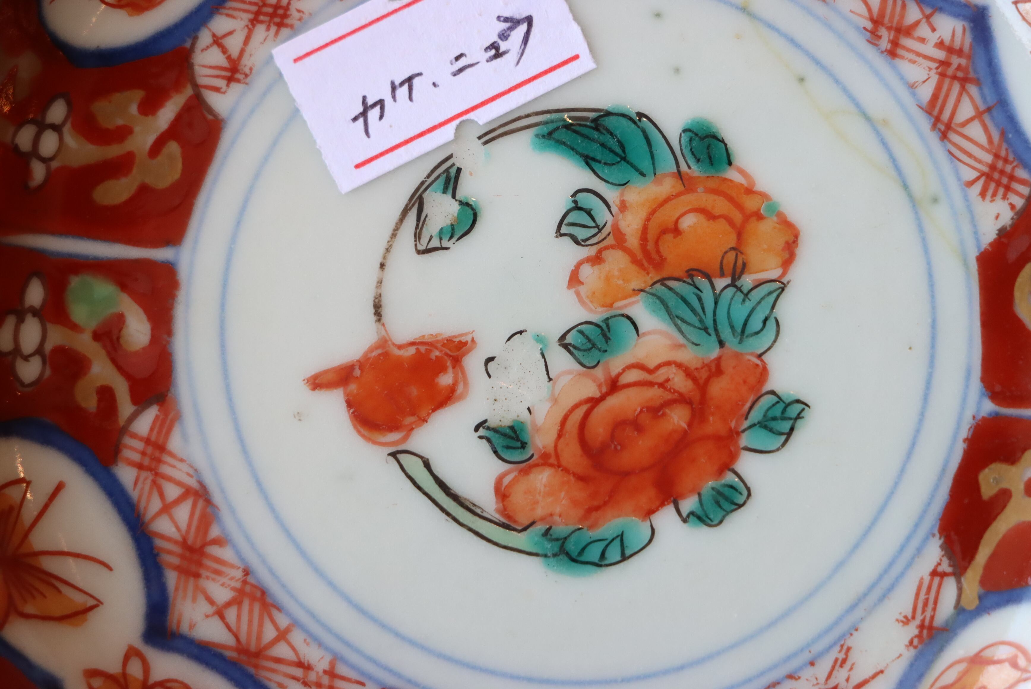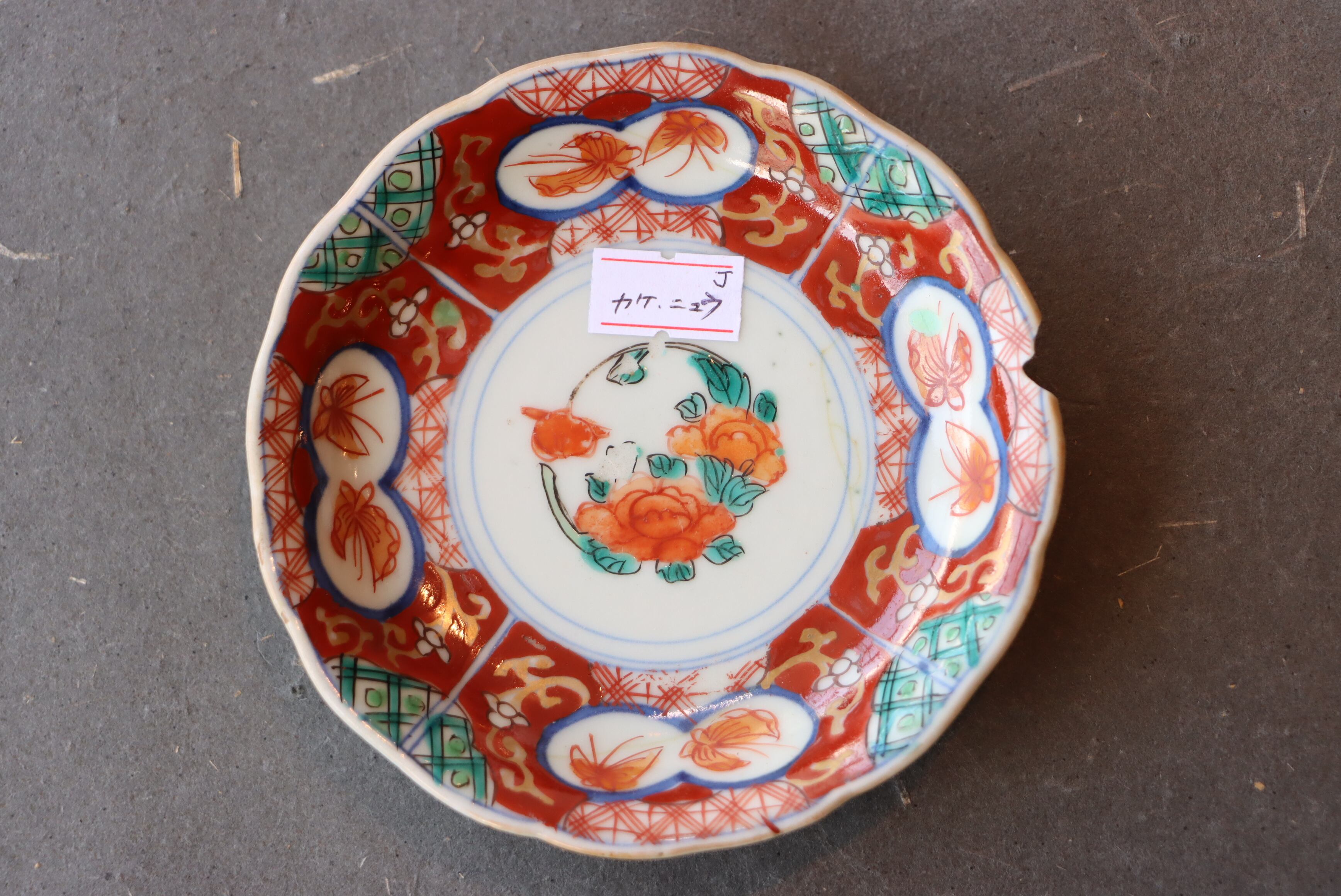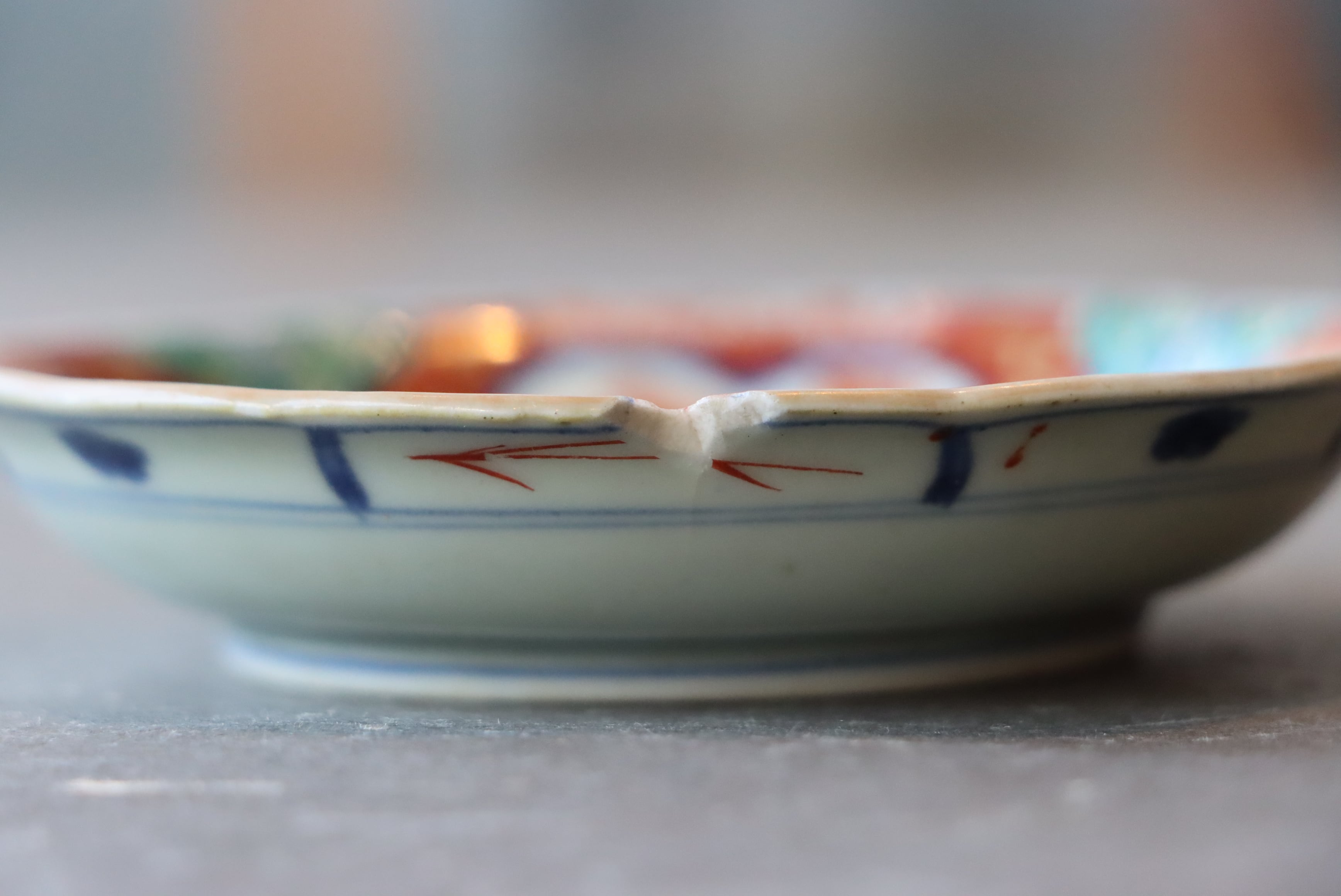 状態:カケ(約1.5センチ)、カケと同じ箇所にニュウ(約1センチ)あり。その他、釉薬の剥がれ、口縁に施されている金彩が剥離している箇所があります。お写真にて状態をご確認ください。金継ぎ用に。