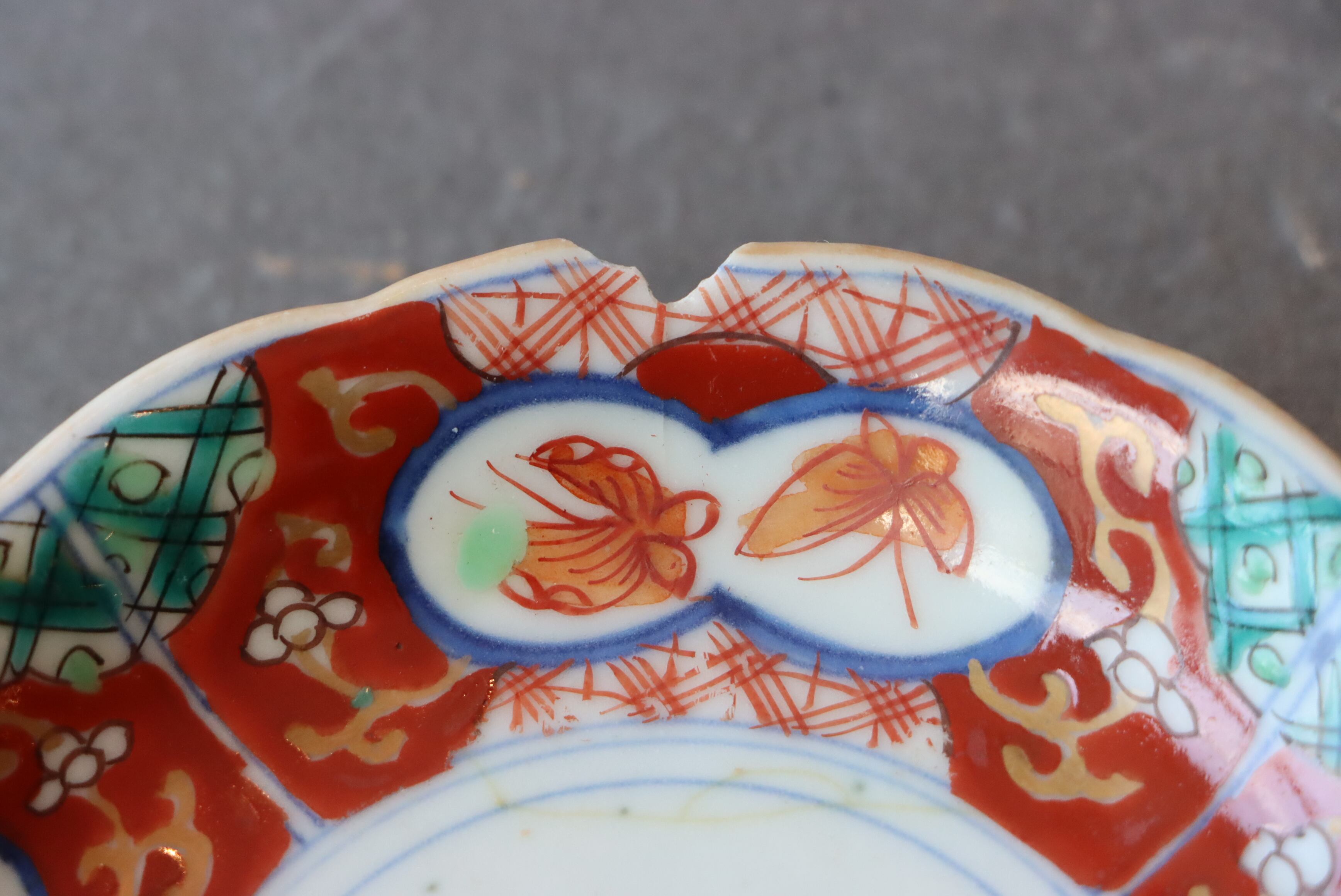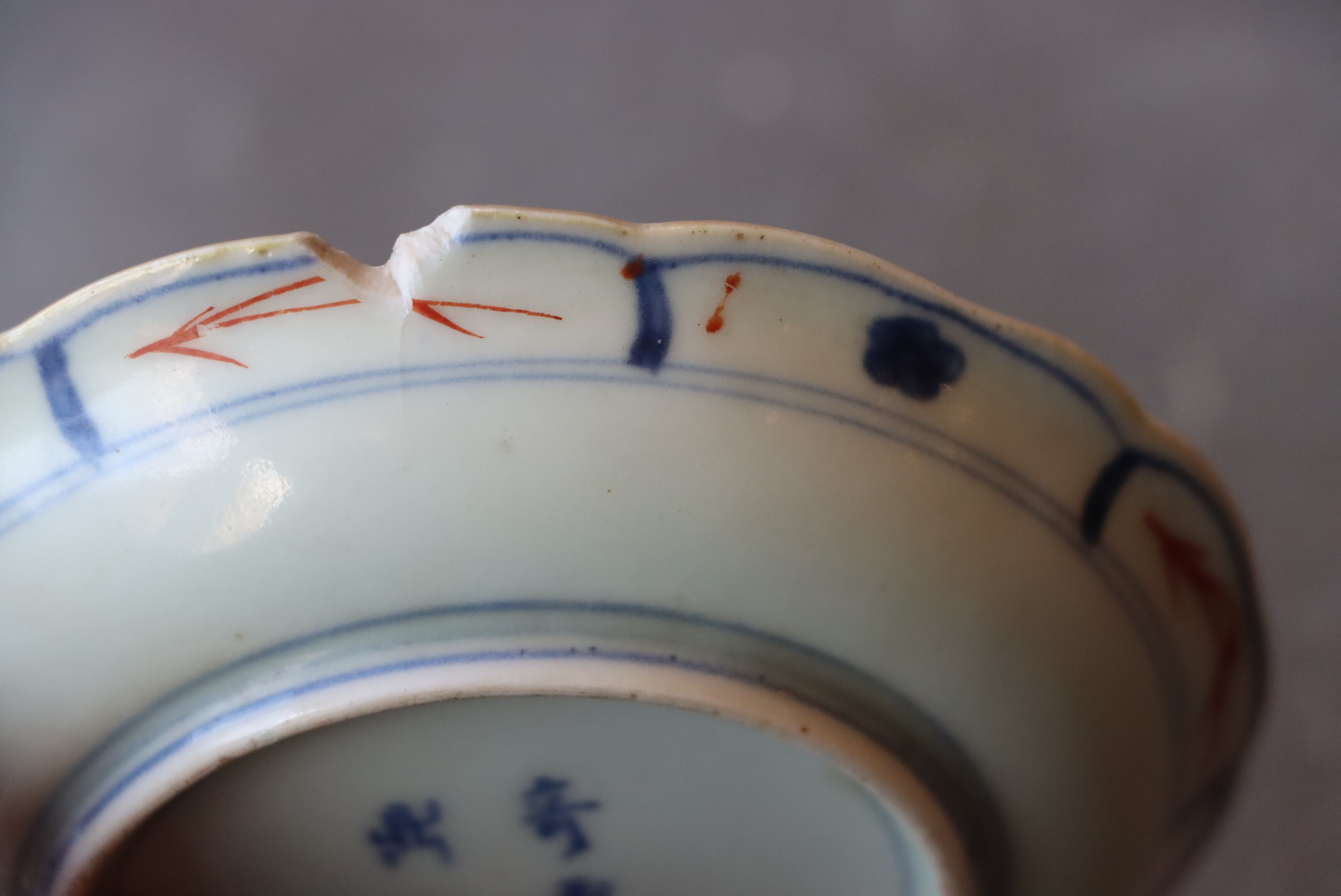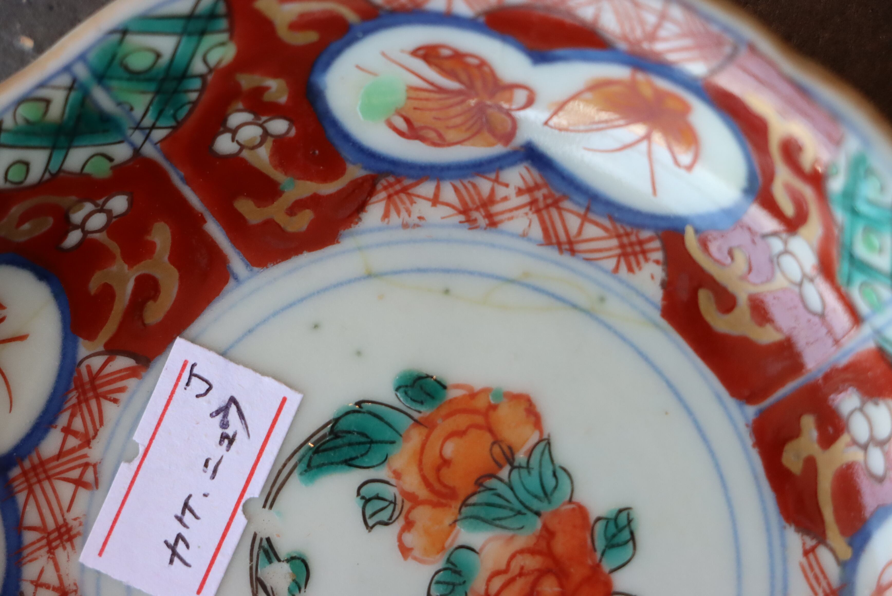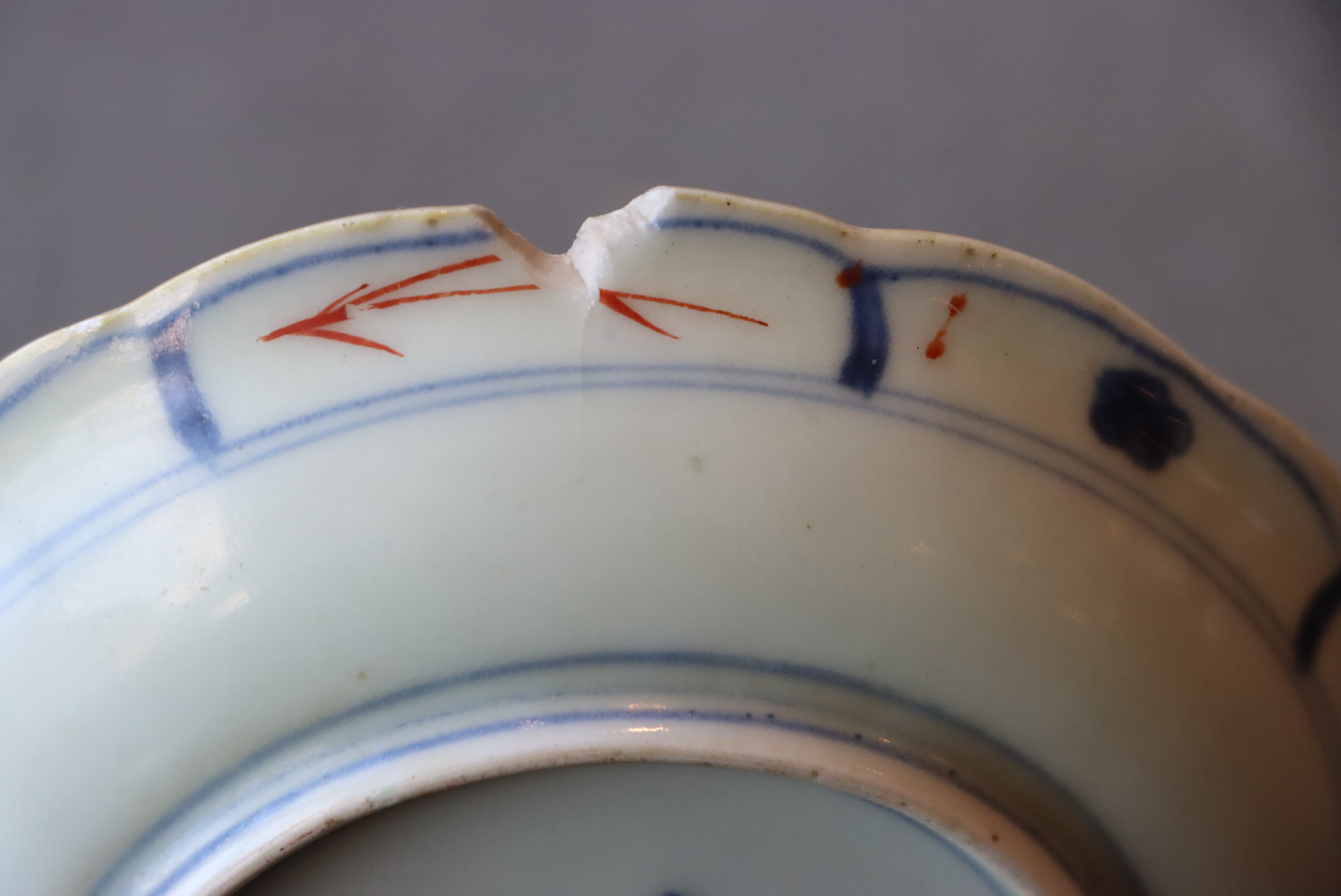 状態:カケ(約1.5センチ)、カケと同じ箇所にニュウ(約1センチ)あり。その他、釉薬の剥がれ、口縁に施されている金彩が剥離している箇所があります。お写真にて状態をご確認ください。金継ぎ用に。