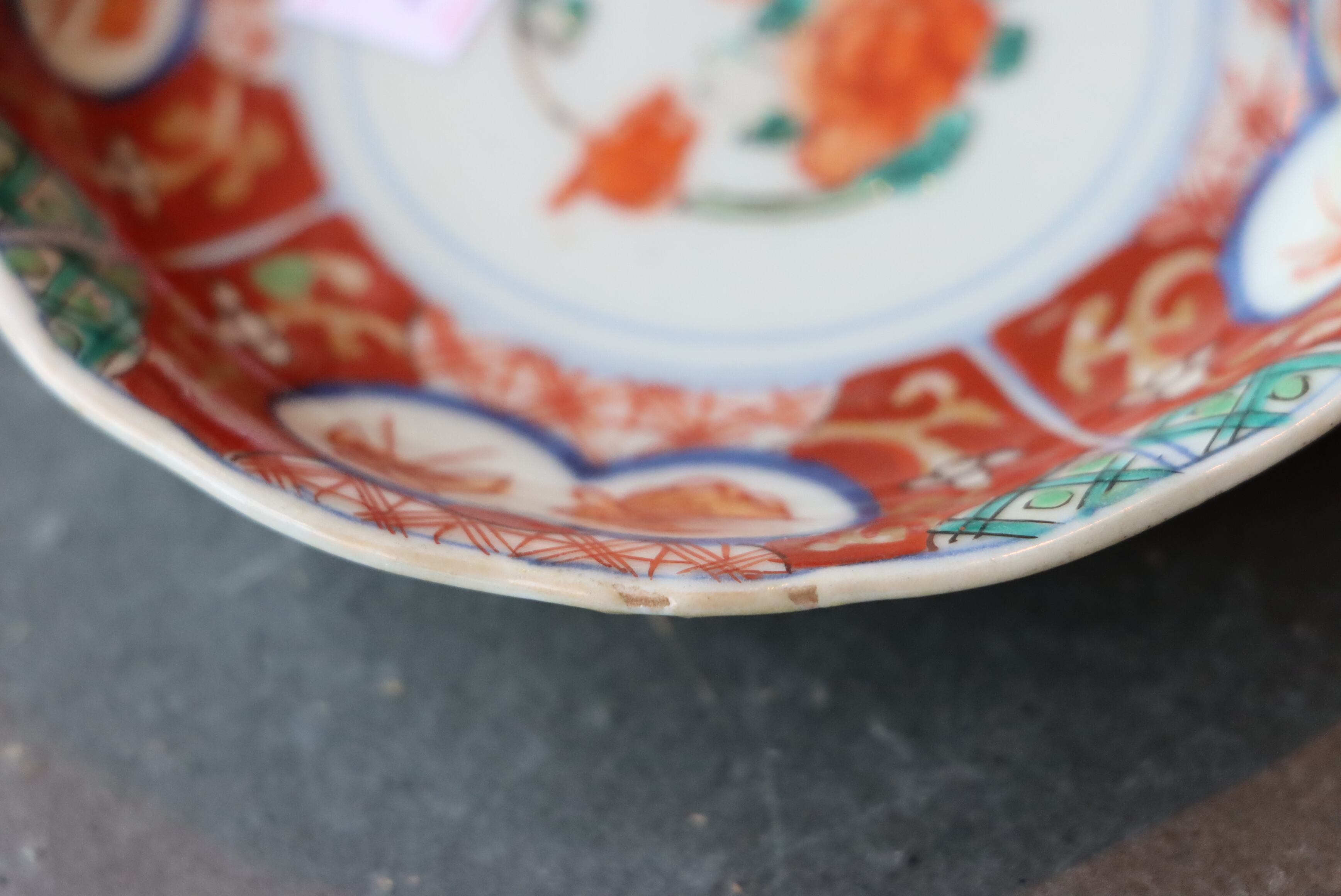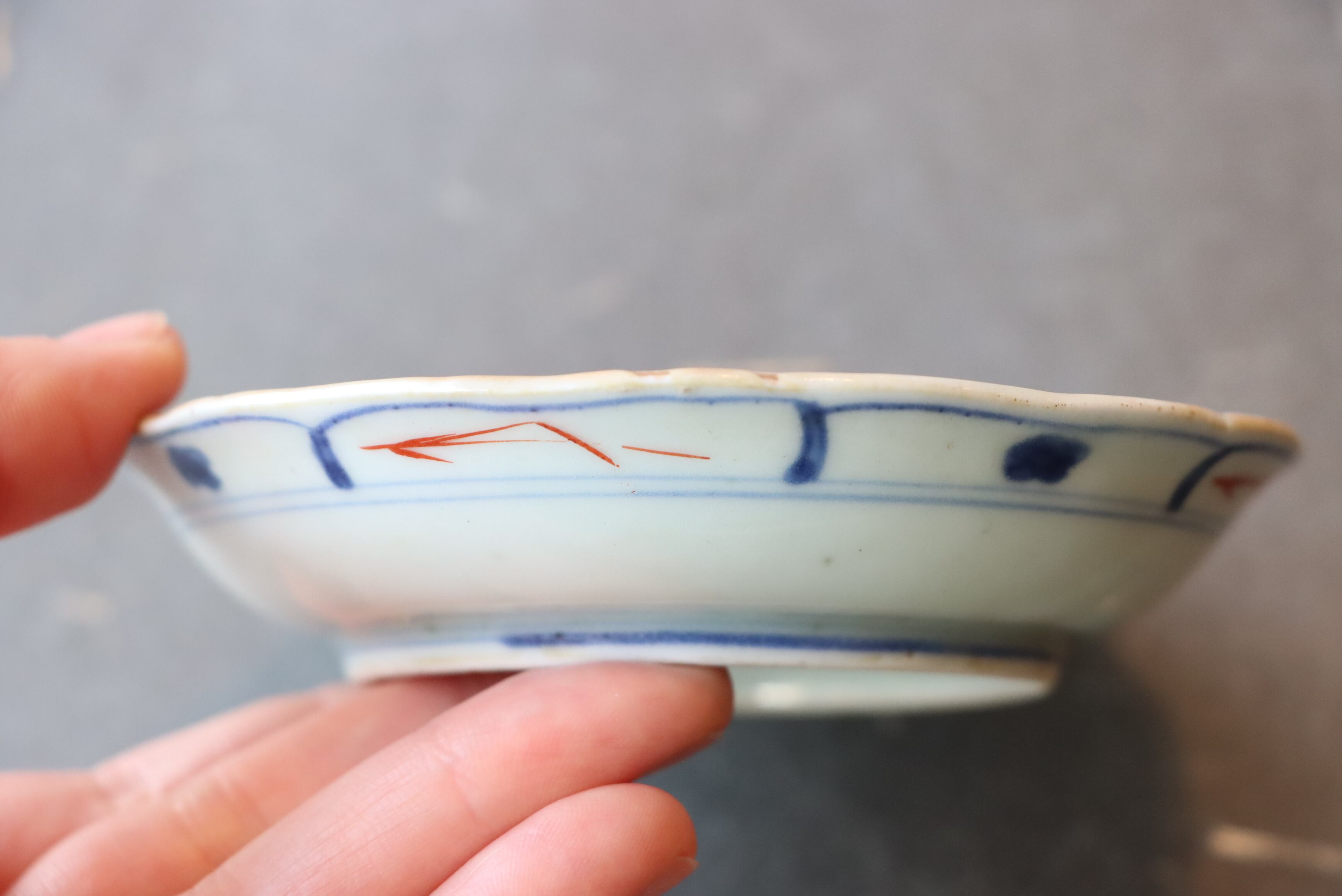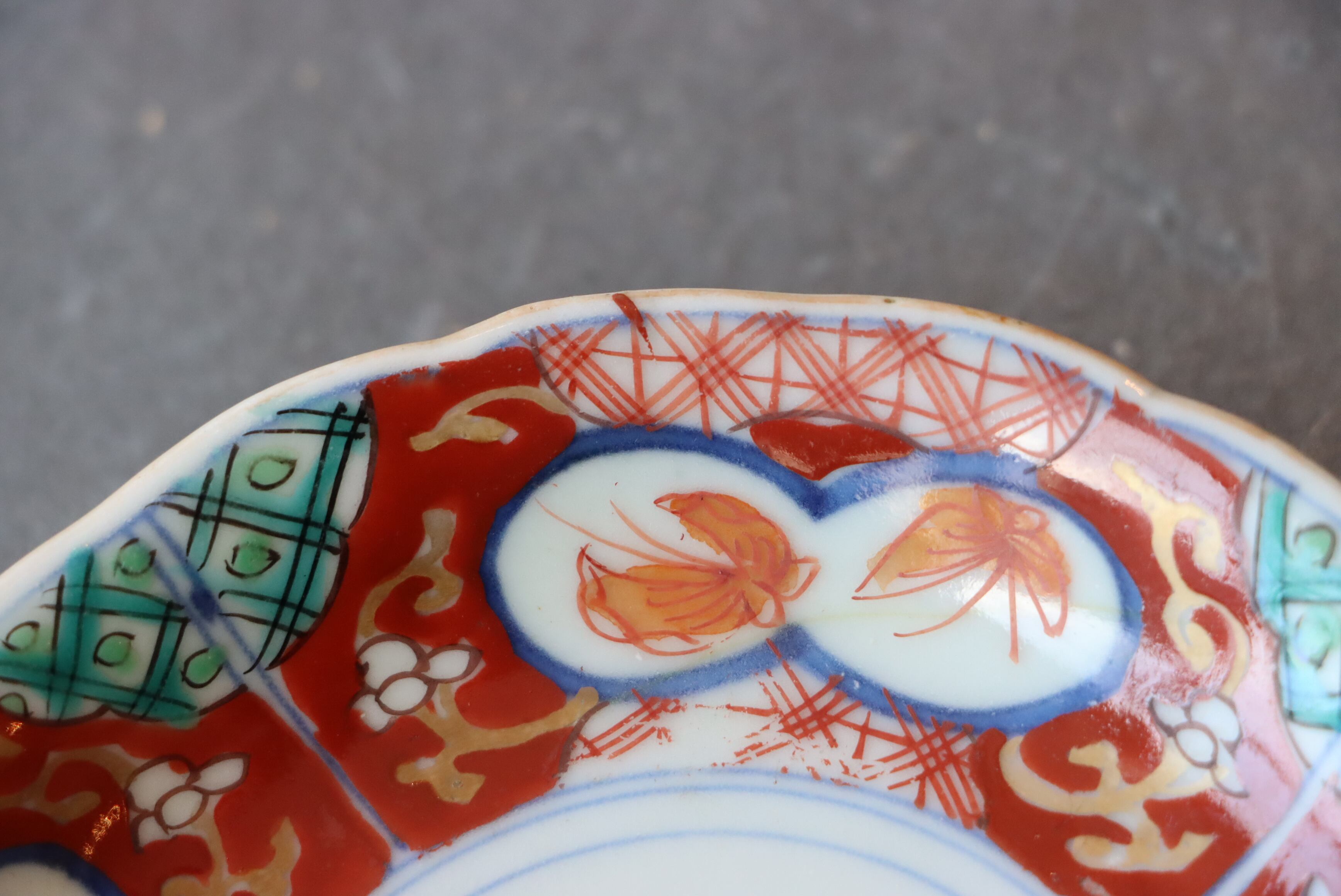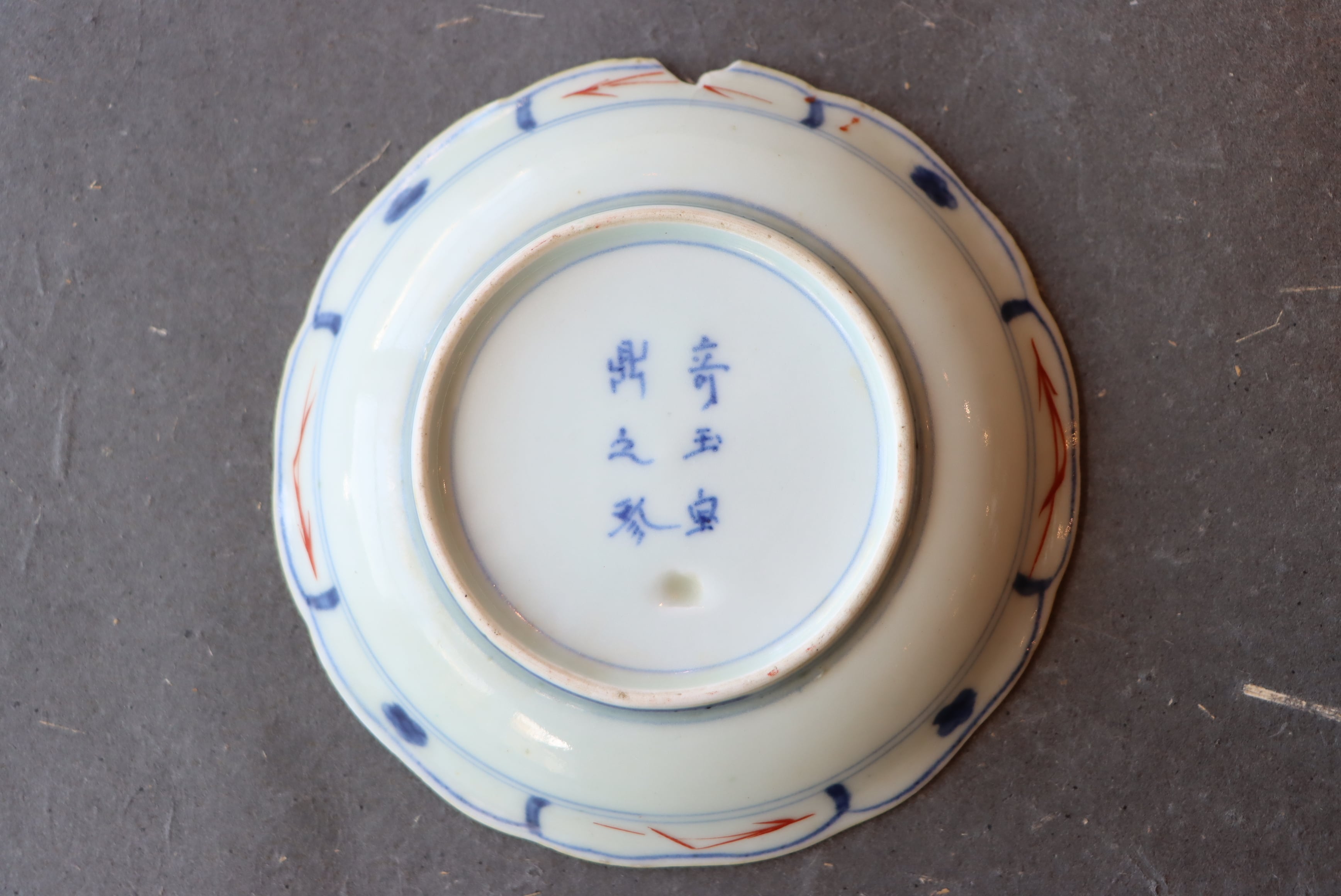 状態:カケ(約1.5センチ)、カケと同じ箇所にニュウ(約1センチ)あり。その他、釉薬の剥がれ、口縁に施されている金彩が剥離している箇所があります。お写真にて状態をご確認ください。金継ぎ用に。