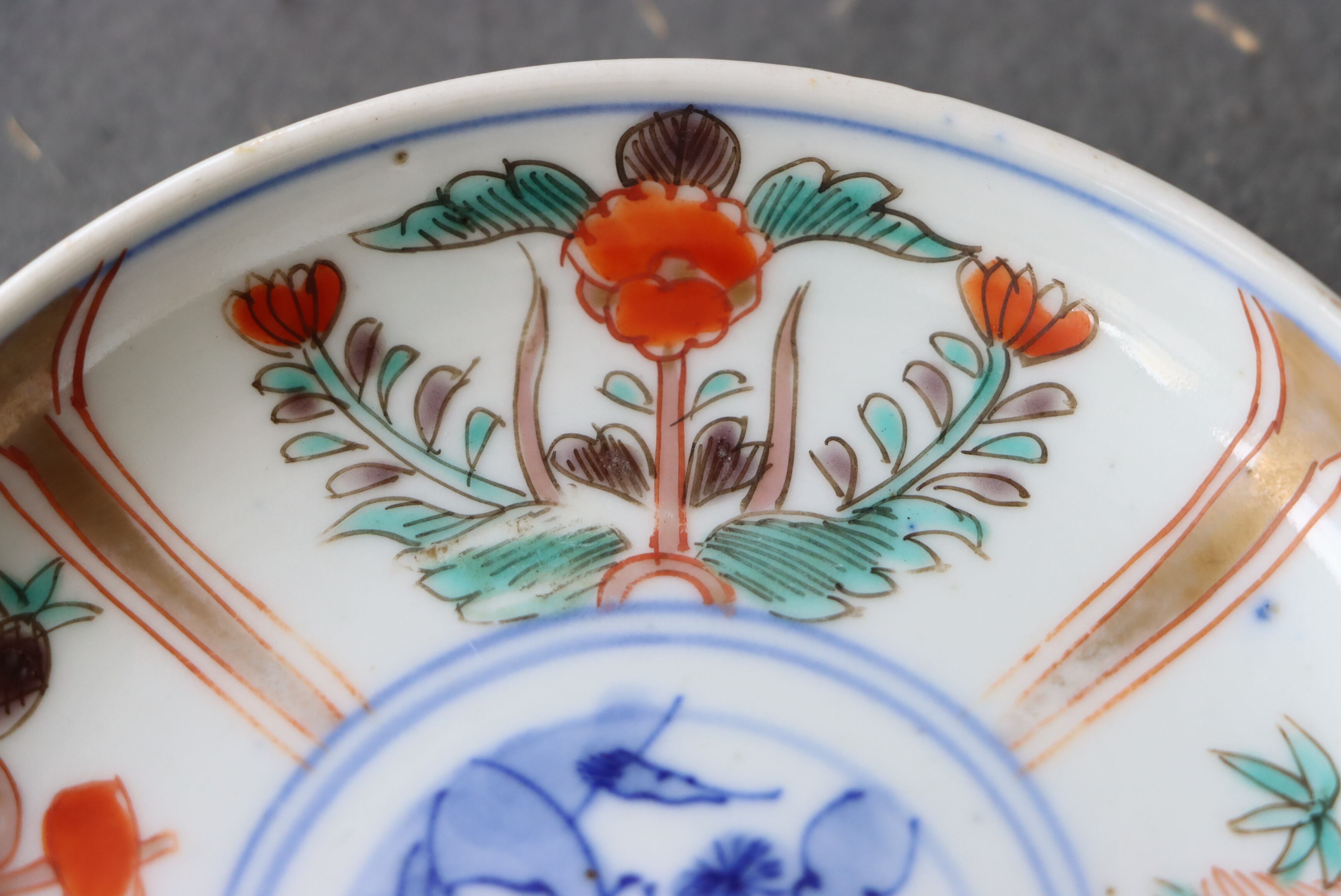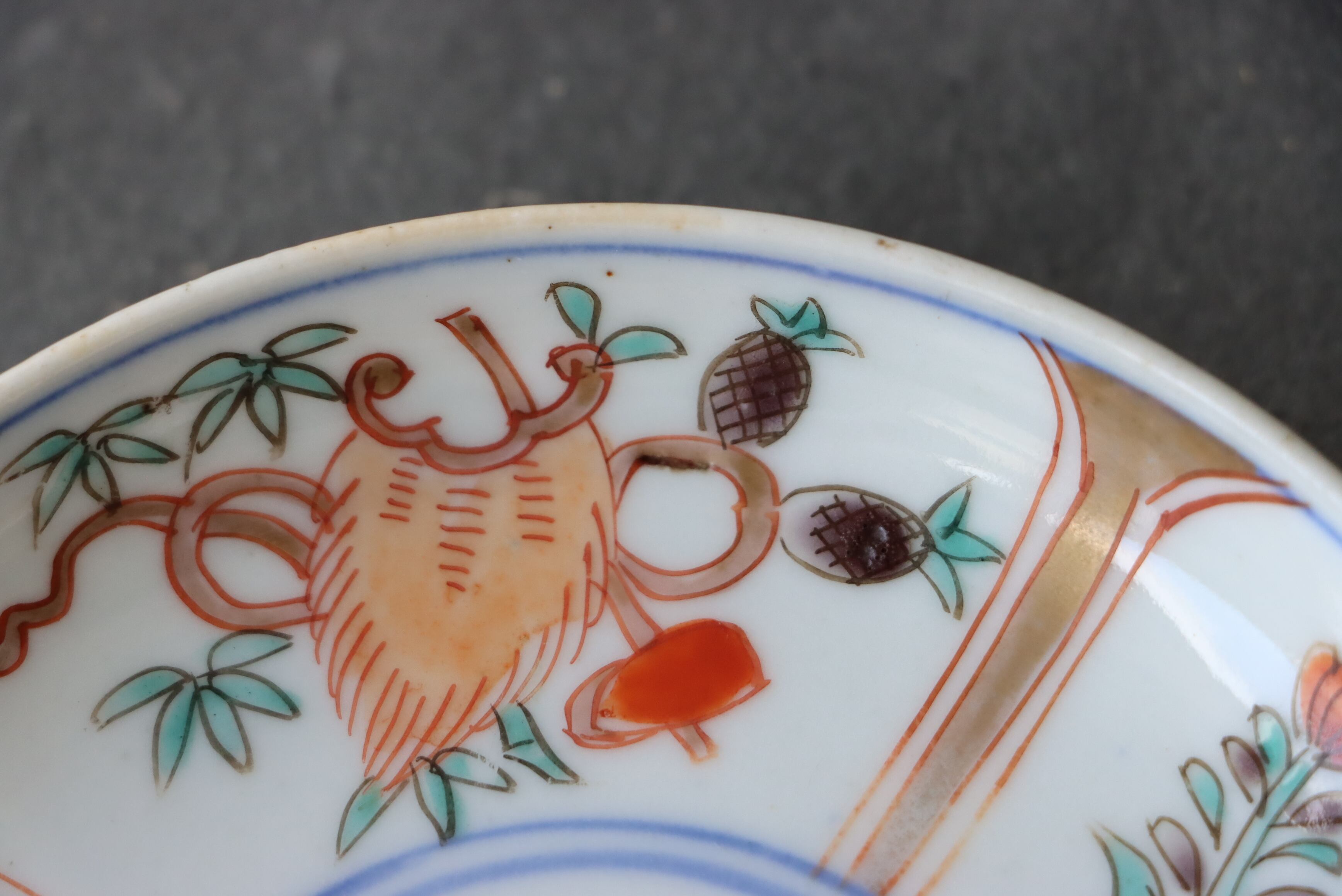 また、口縁部分に施された金彩が一部薄くなっている箇所、焼く段階でできる鉄分(黒子のような点)やピンホール、釉薬の薄れがございます。お写真にて状態をご確認ください。金継ぎ用に。