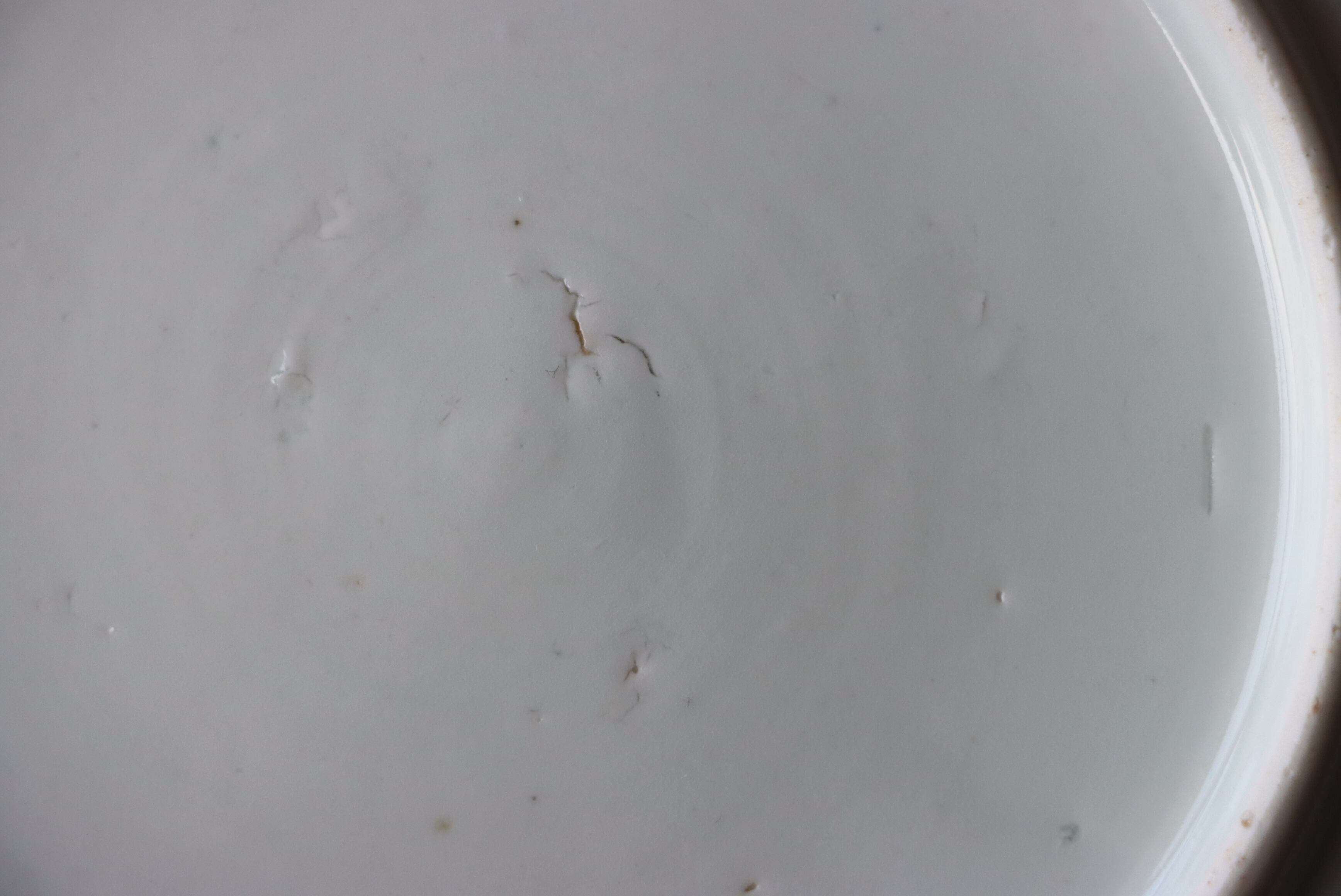 状態:カケ(約1センチ弱)、カケと同じ箇所に貫入(約0.5センチ)あり。見込みにピンホールがございます。
