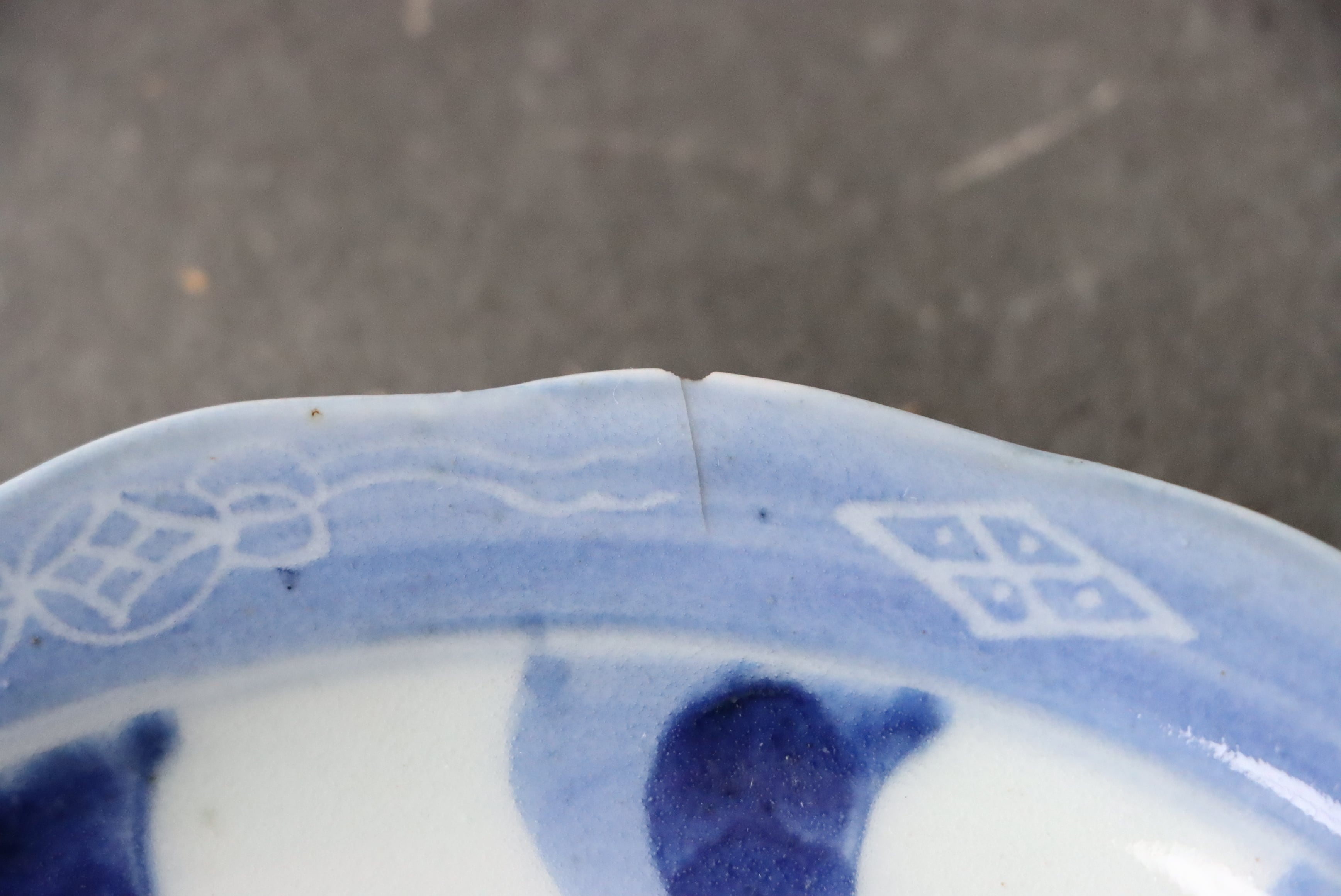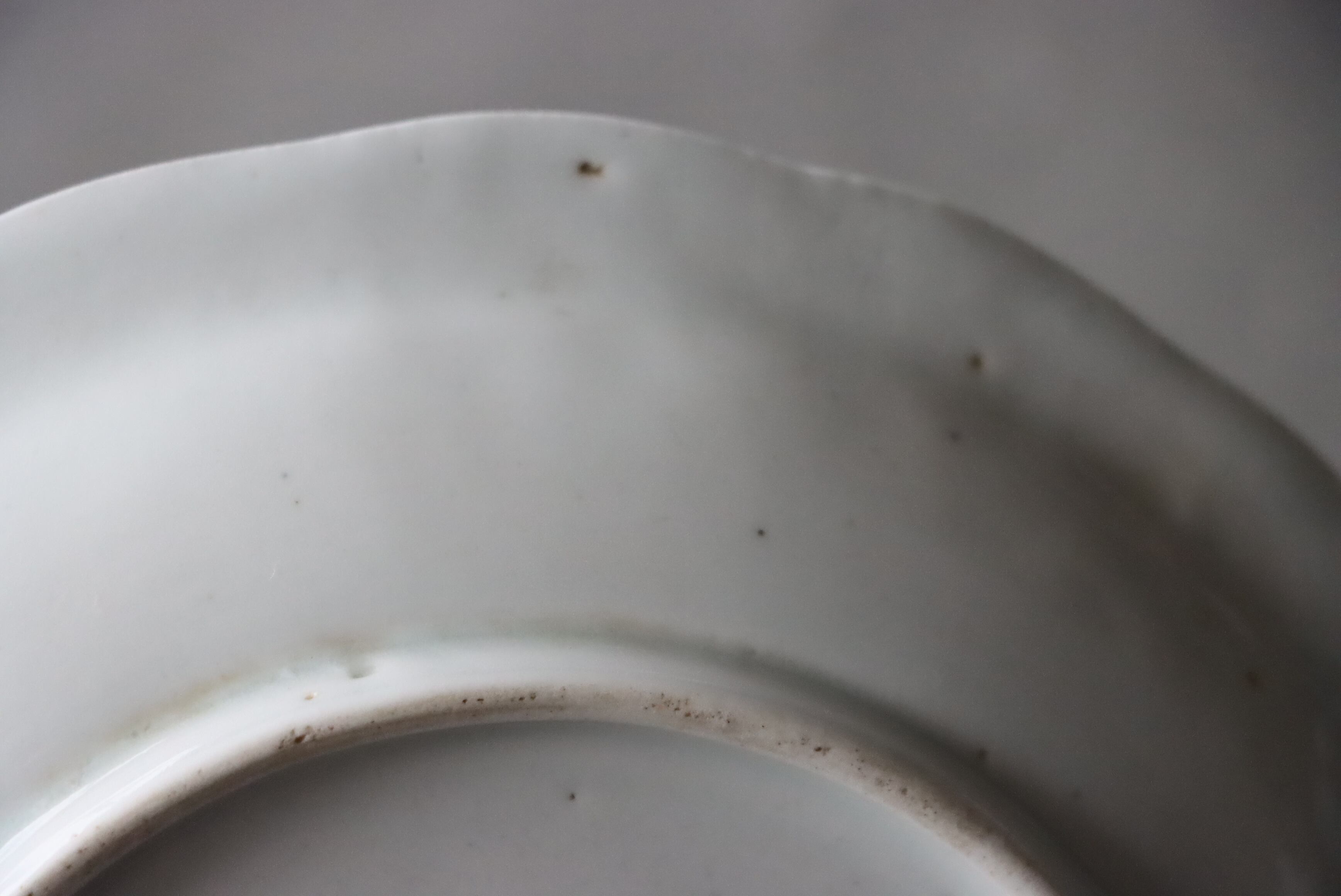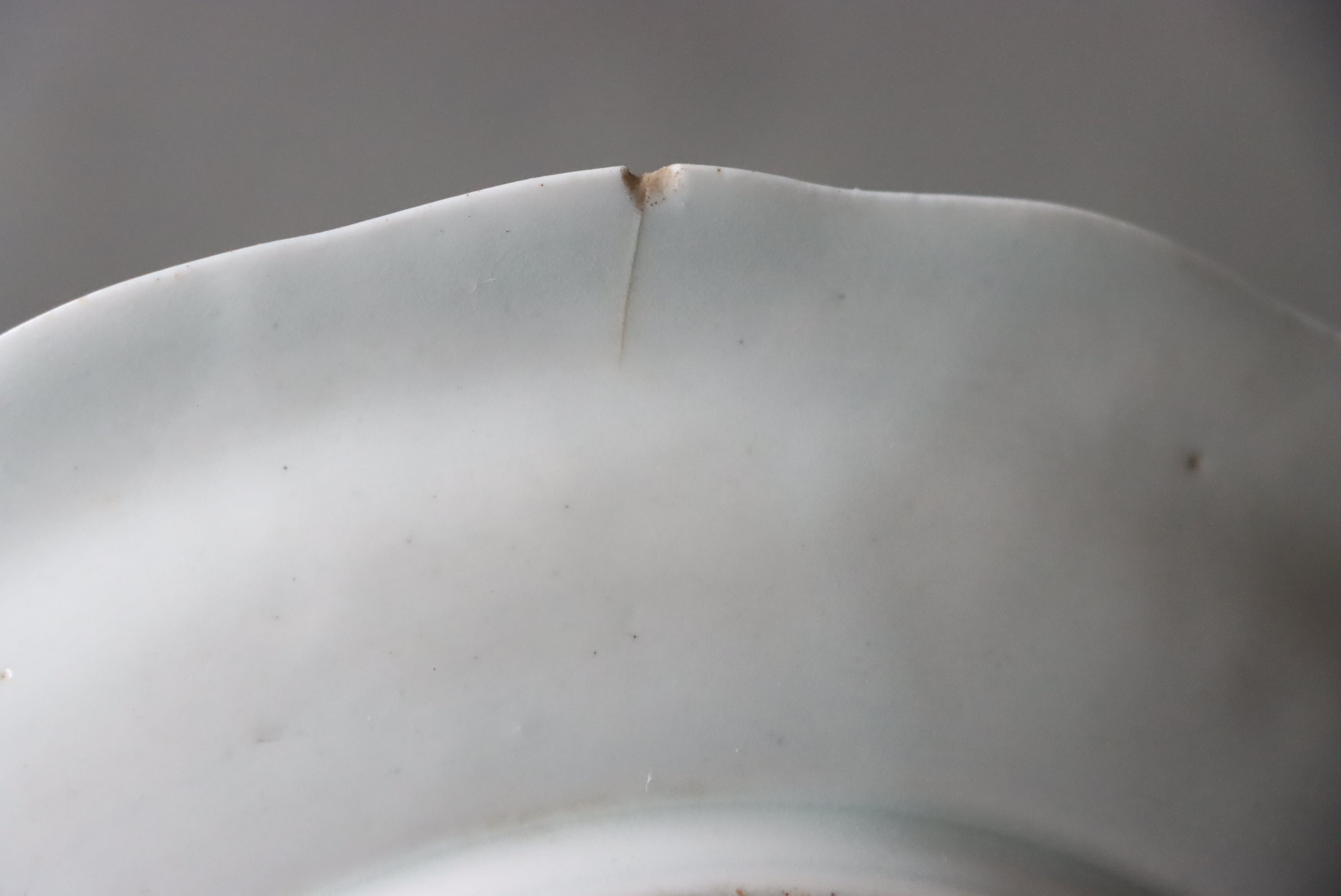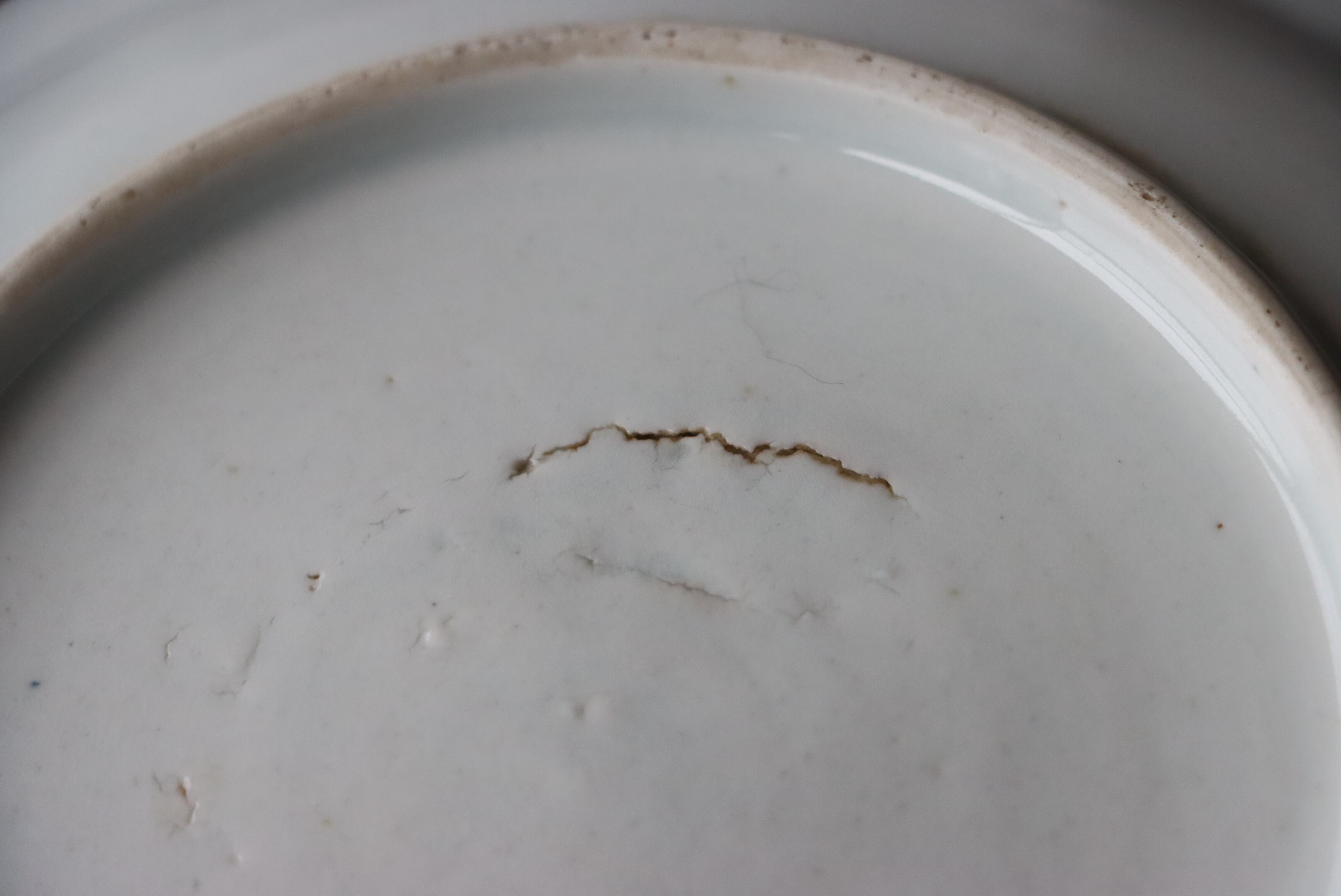 状態:カケ(約0.5センチ)、カケと同じ箇所からニュウ(約1.5センチ)あり。カケ、ニュウに時代色が入っています。その他、フチソゲあり(写真4枚目)。