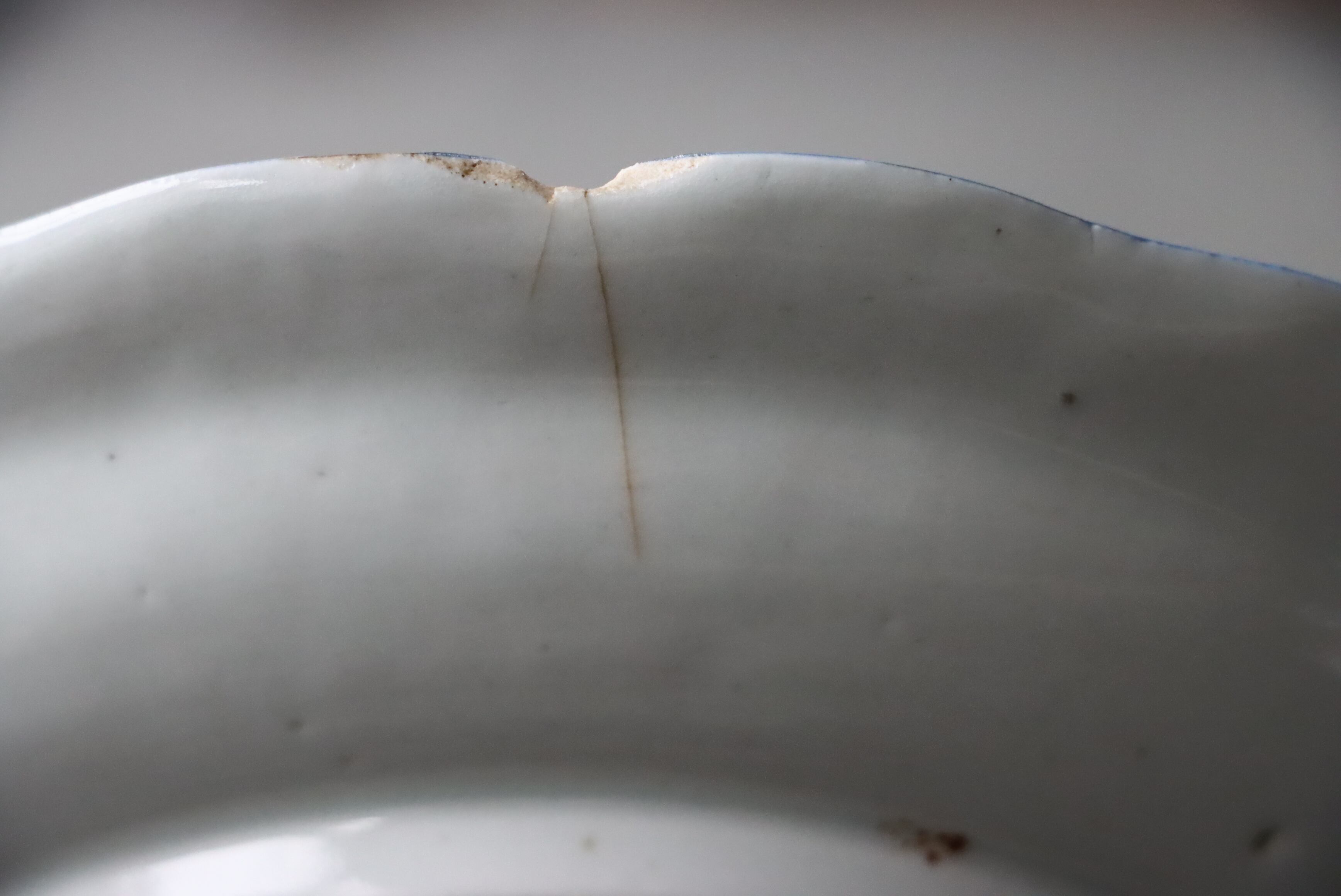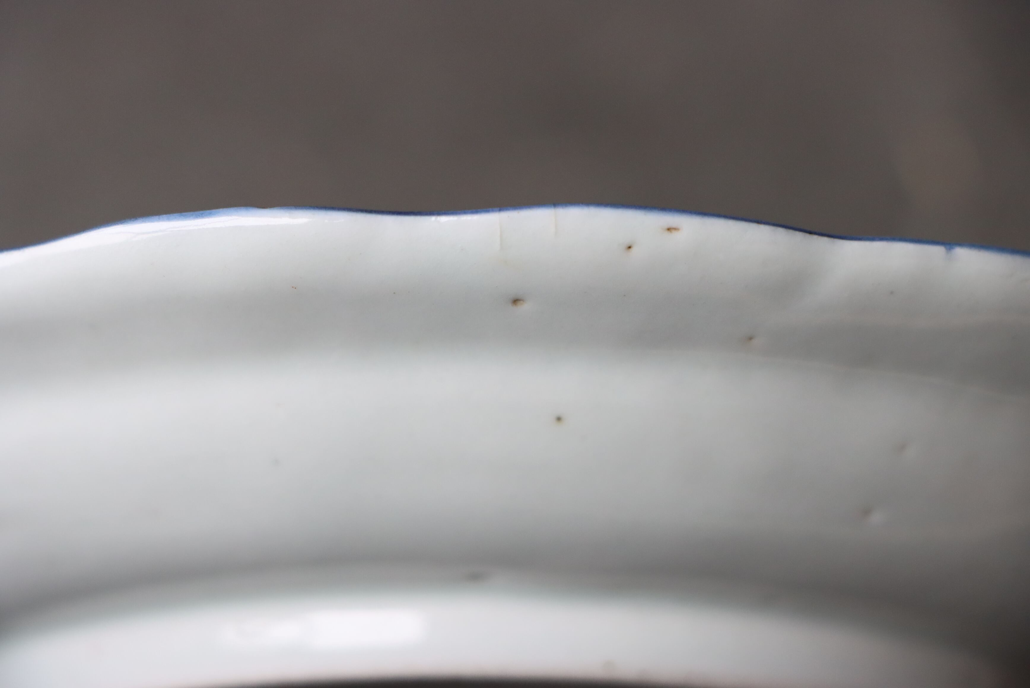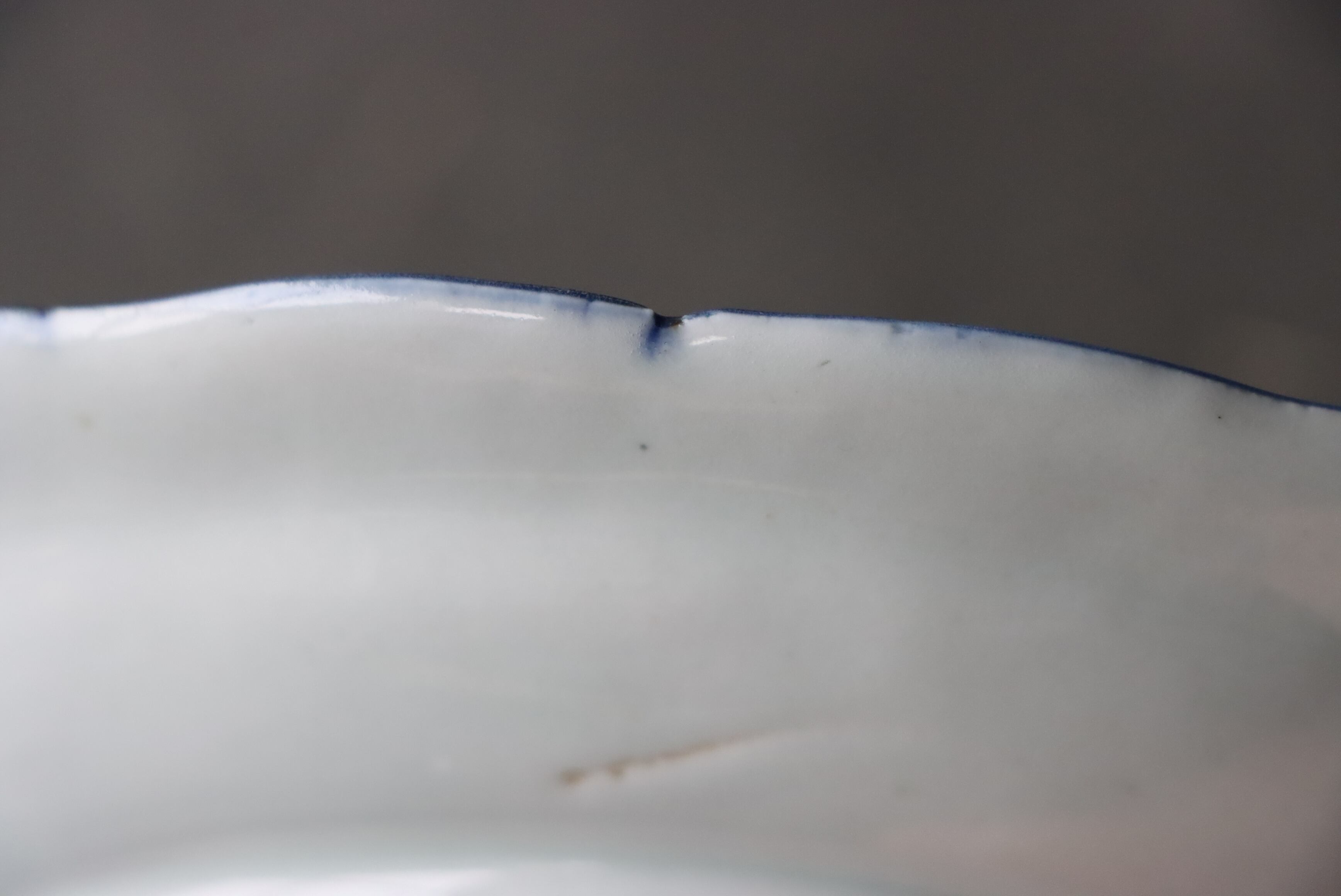 状態:カケ(約2センチ)、カケと同じ箇所からニュウ×2(約2.5センチ、約1センチ)あり。その他、小さなニュウ×2(約0.5センチ、約0.2センチ)あり。カケ、ニュウに時代色が入っています。また、焼く段階でできる鉄分(黒子のような点)がございます。