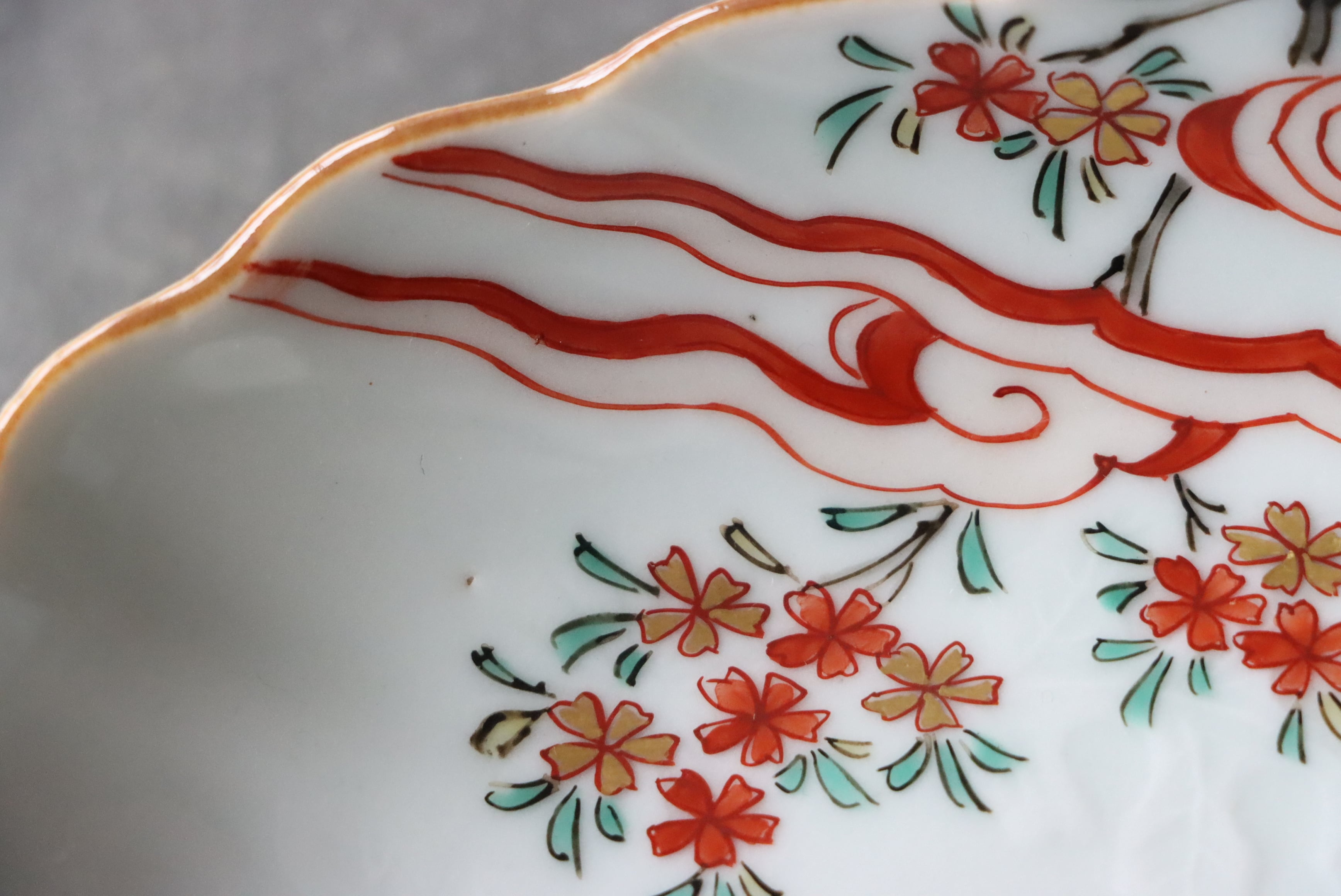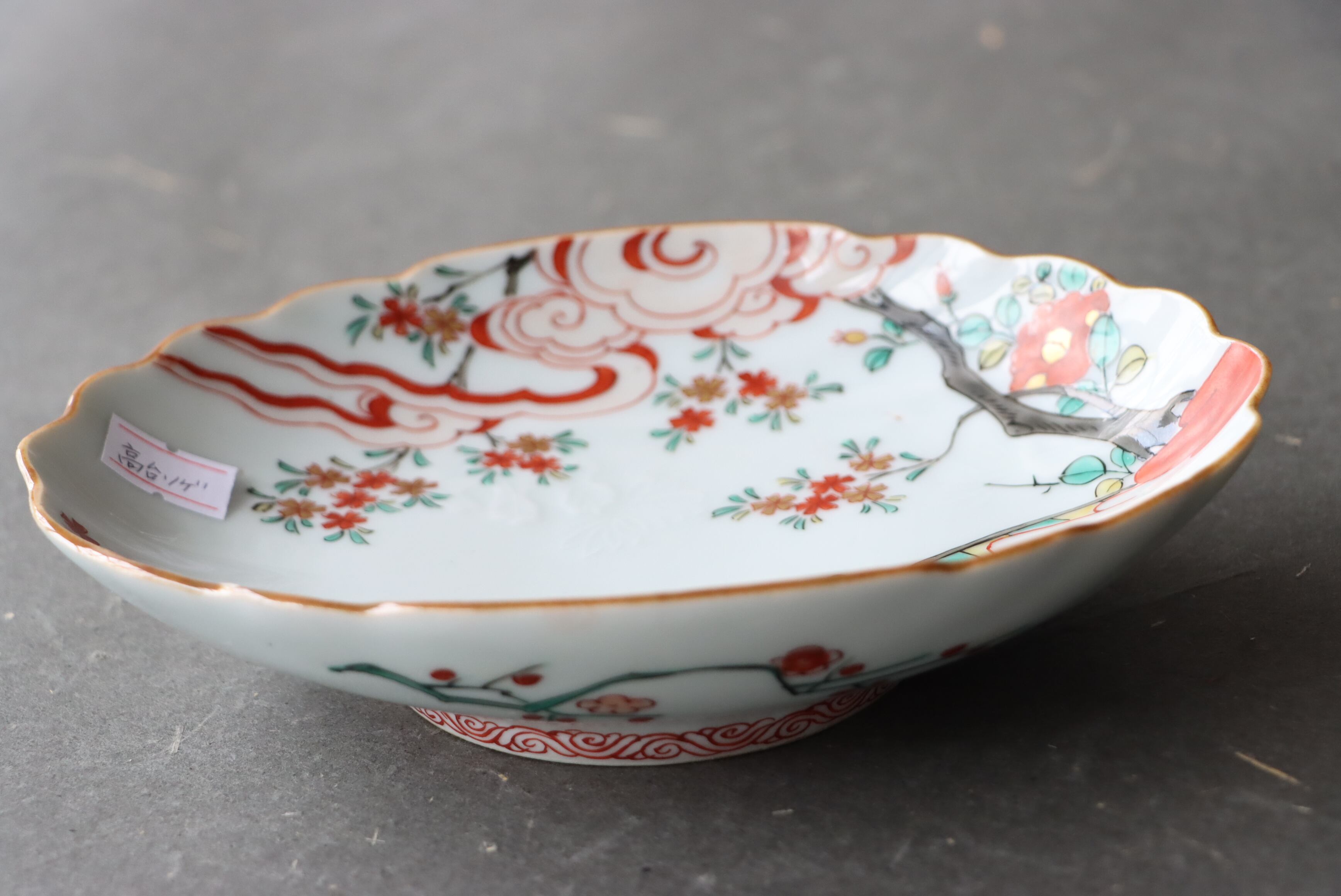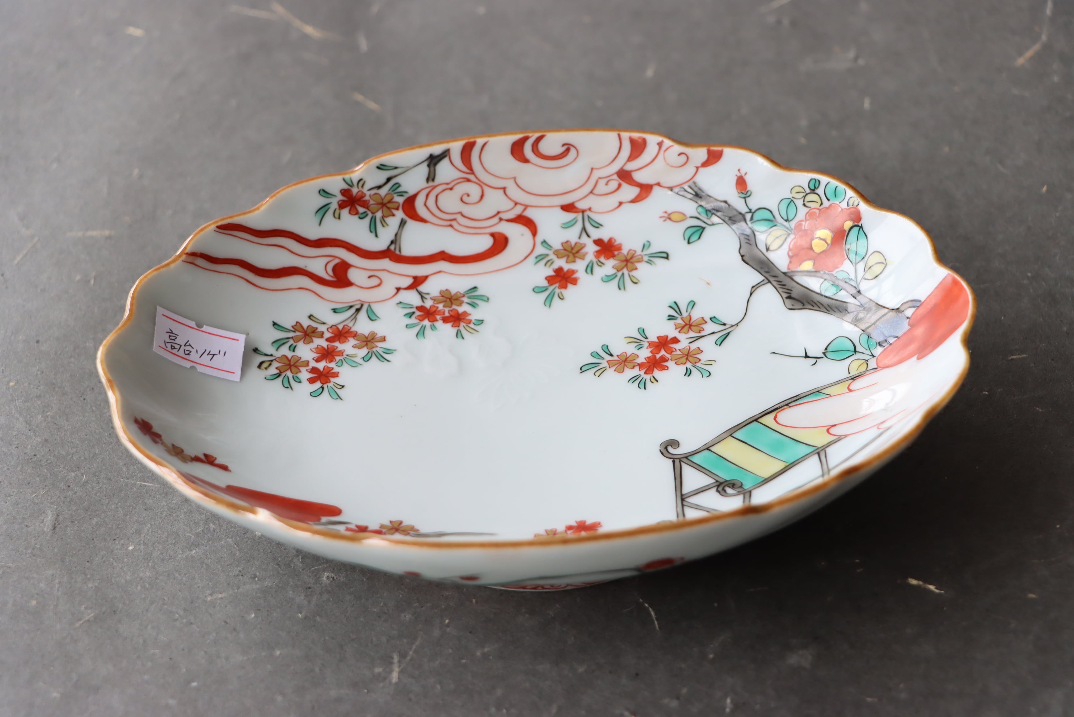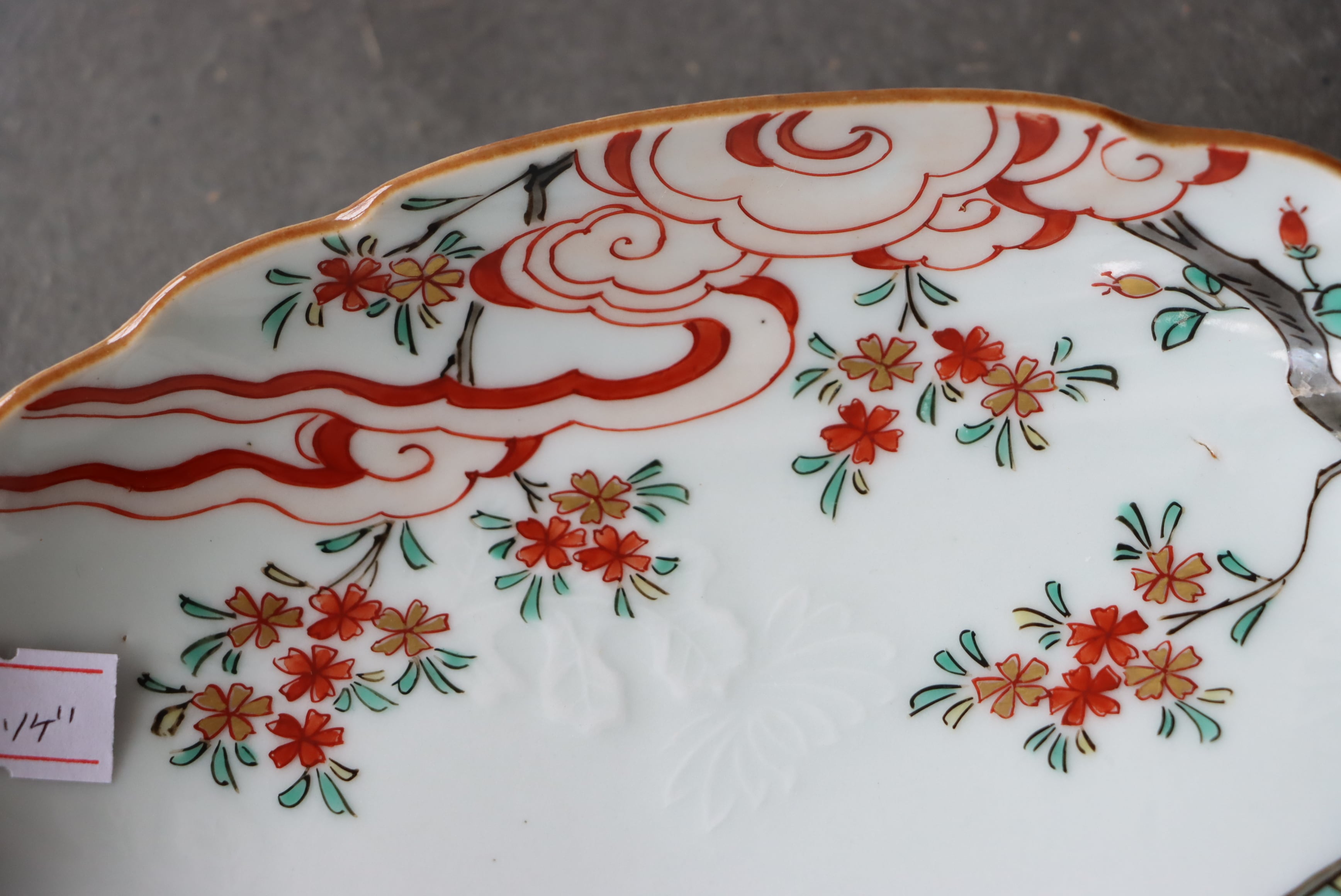 高台ソゲ 柿右衛門手 色絵 陽刻 雲花文 変形皿 A アウトレット