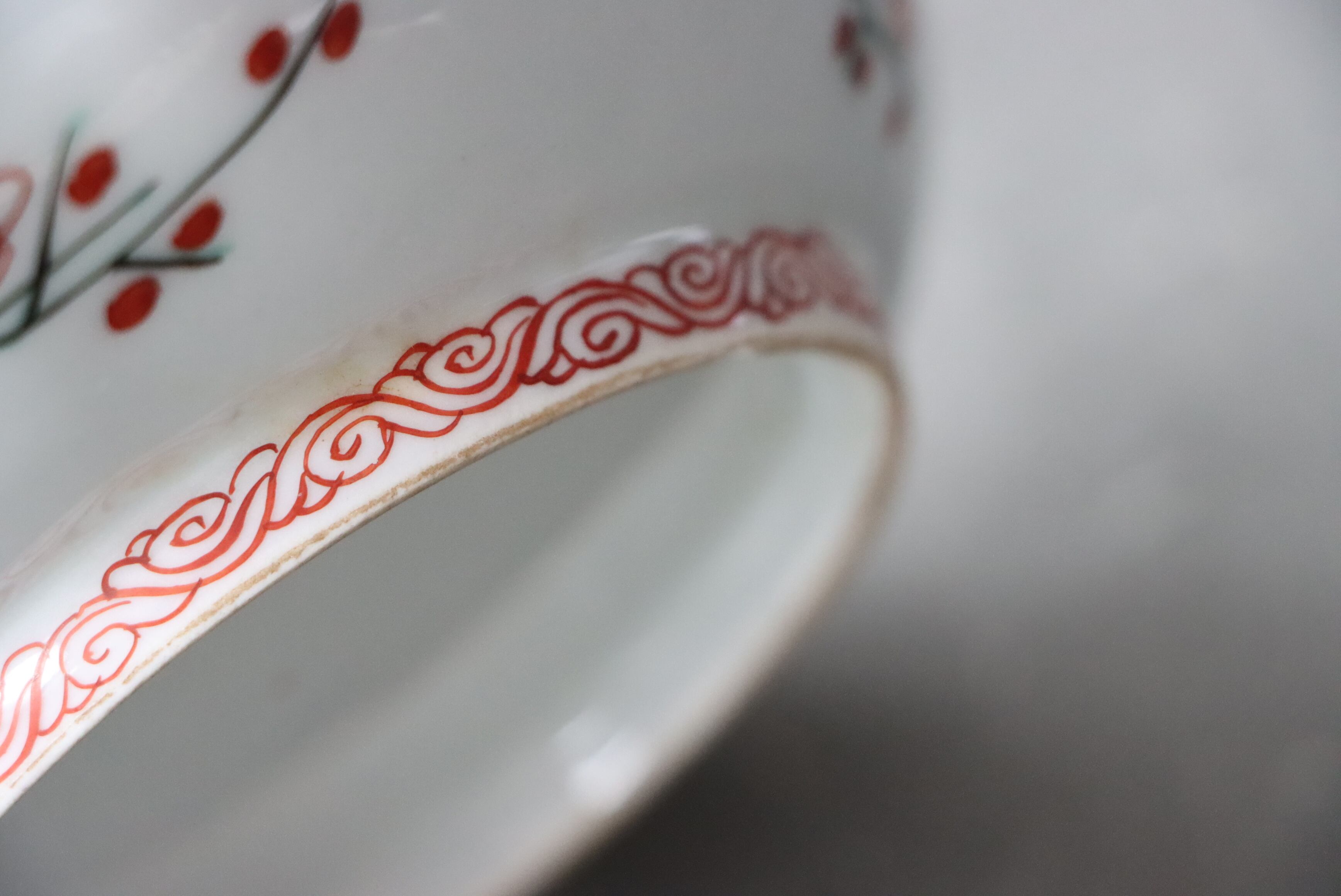 焼成時に窯の中でできる鉄分、くっつき、かまきず、ピンホール、経年による釉薬の薄れがございます。また、一枚一枚手描き、手作りですので器のサイズ(ミリ)、色味、描かれている文様の大きさなど個体差があり、ひとつとして同じものはございません。そういった時代感、個性をご理解いただき、楽しんでくだされば幸いです。電子レンジや食器洗い乾燥機のご使用はお控えください。