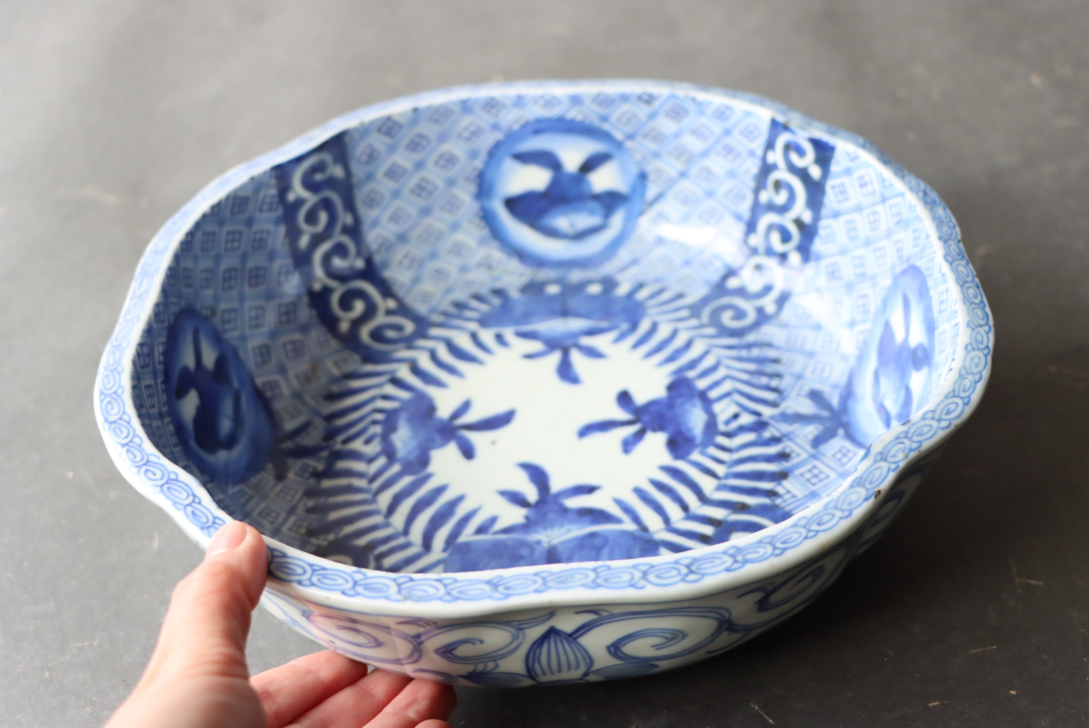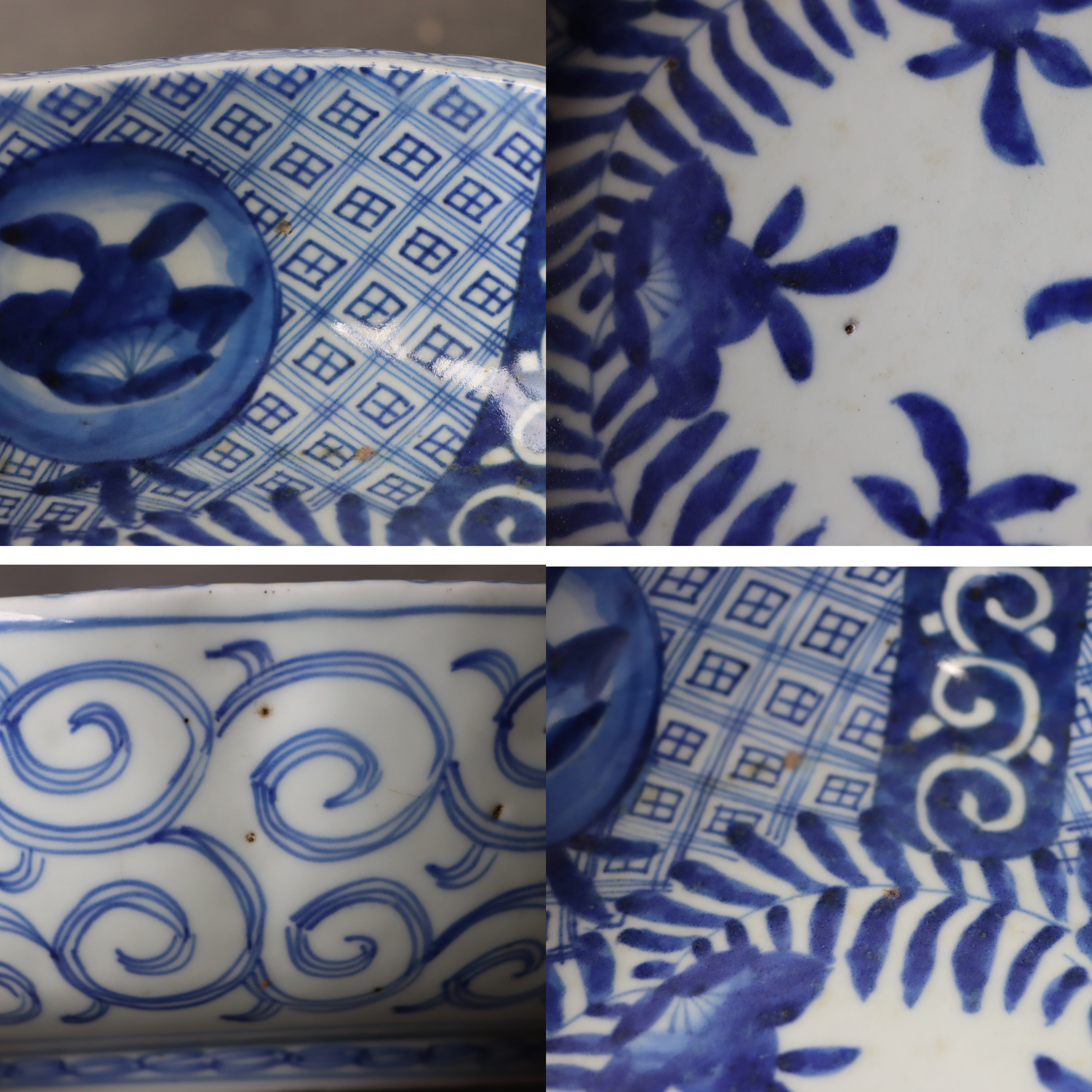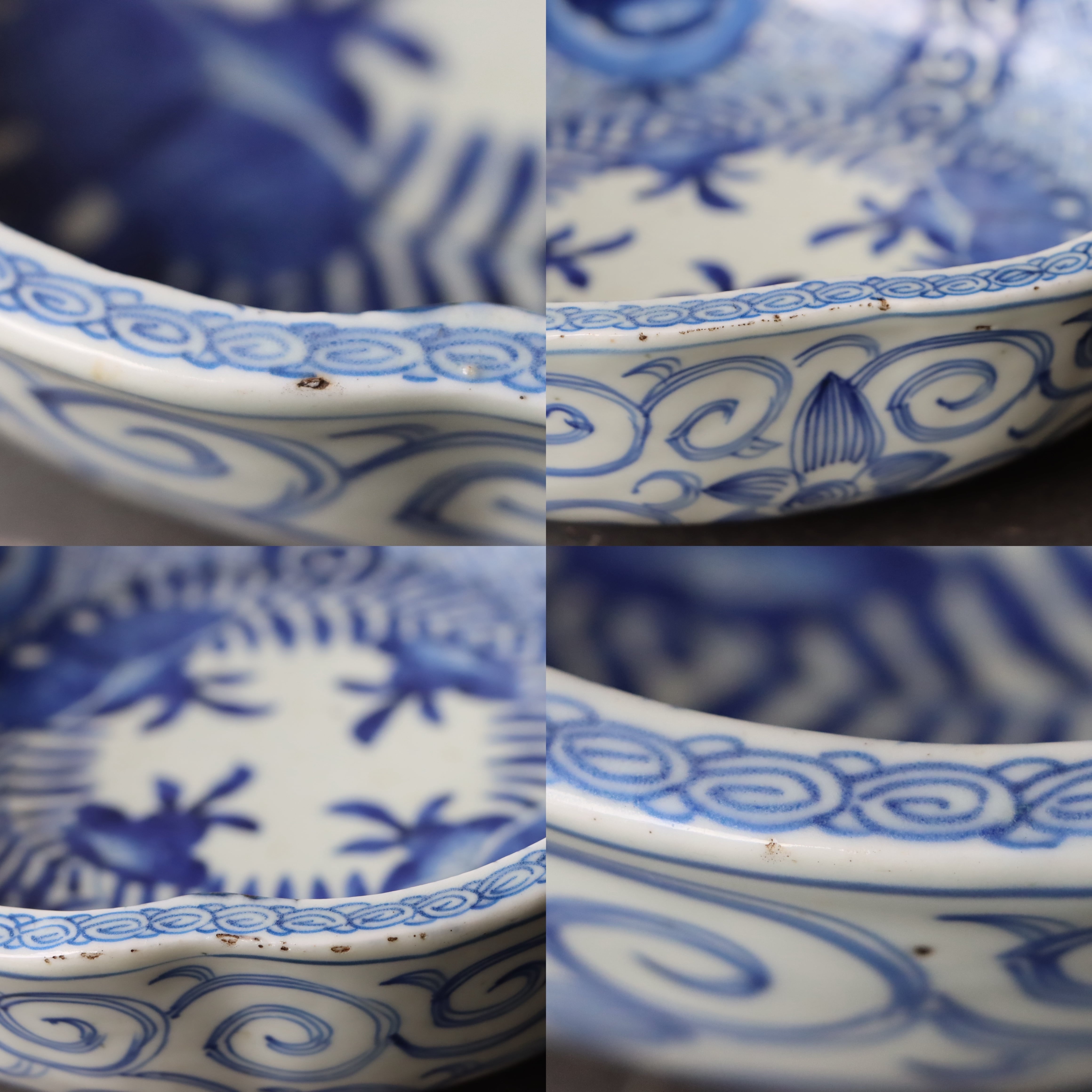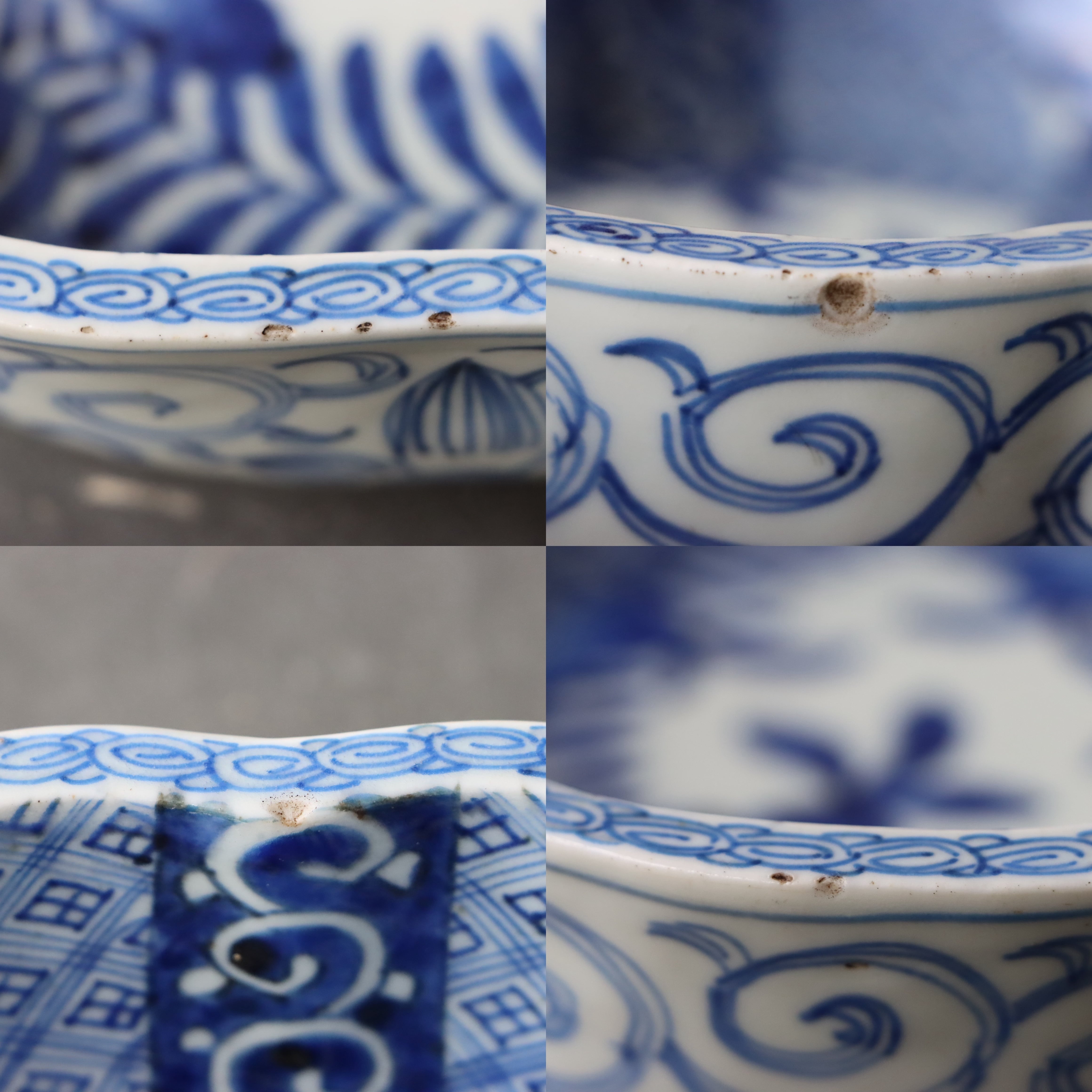 焼成時に窯の中でできる鉄分、くっつき、かまきず、ピンホール、経年による釉薬の薄れがございます。また、一枚一枚手描き、手作りですので器のサイズ(ミリ)、色味、描かれている文様の大きさなど個体差があり、ひとつとして同じものはございません。そういった時代感、個性をご理解いただき、楽しんでくだされば幸いです。電子レンジや食器洗い乾燥機のご使用はお控えください。
