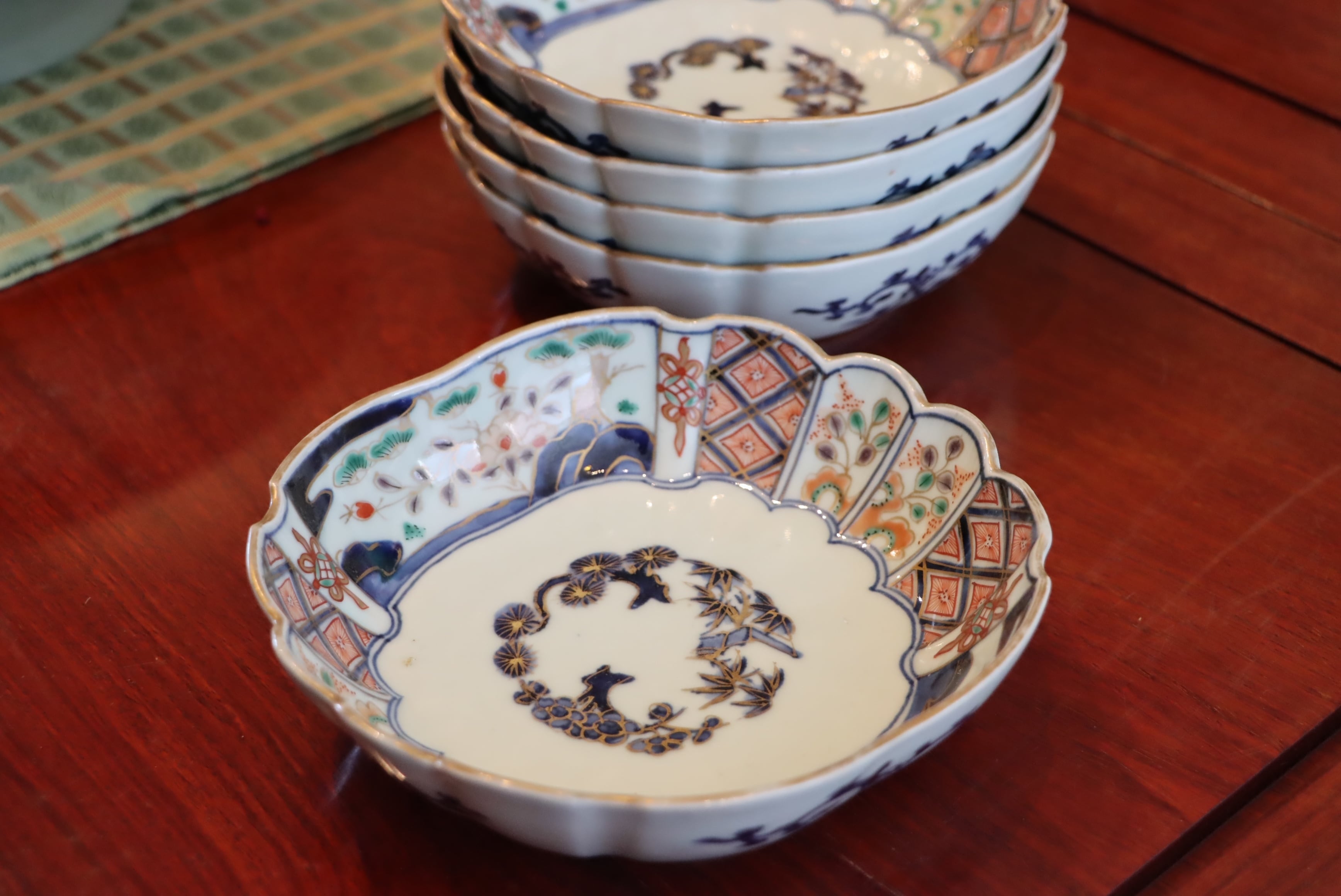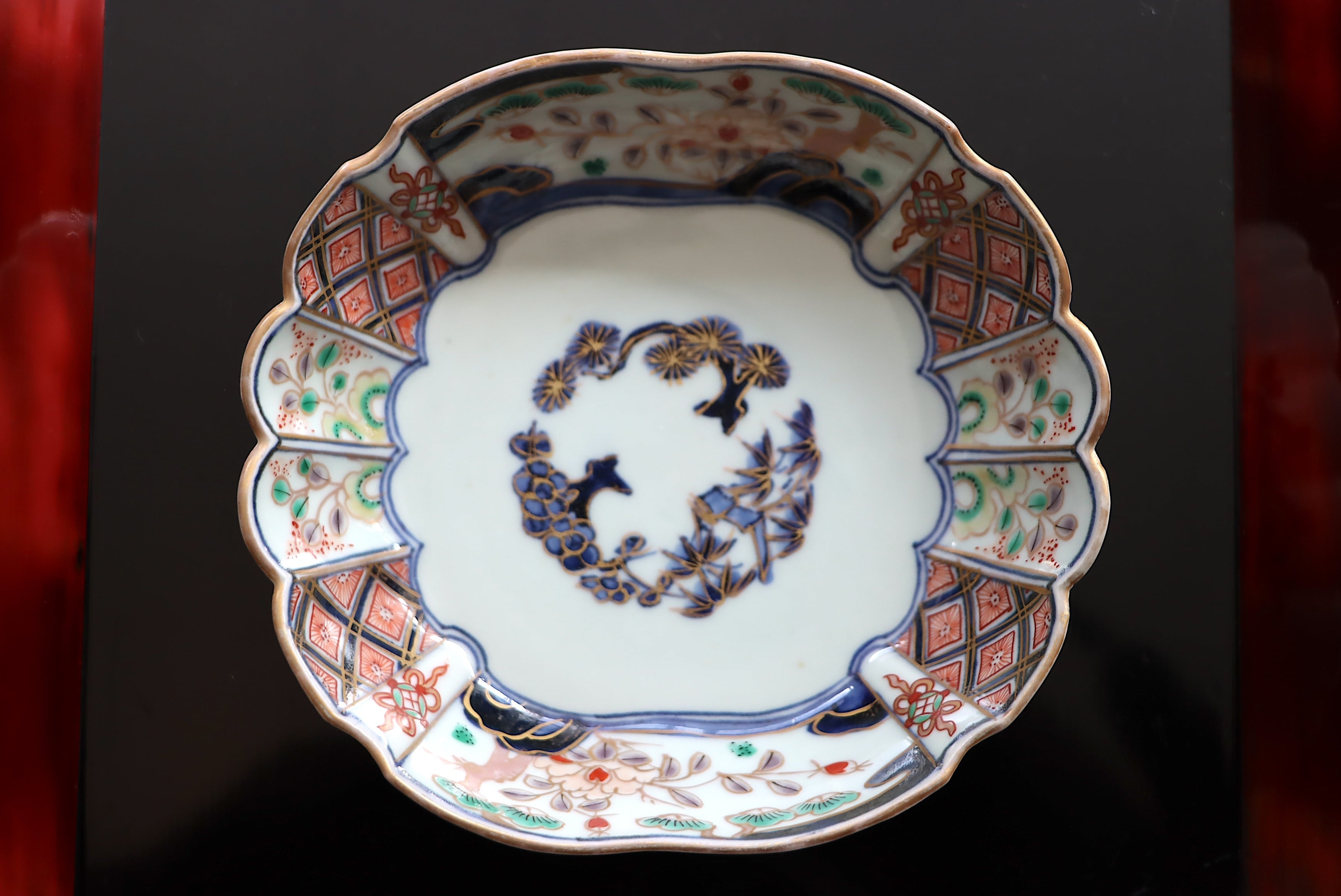 【Old Imari quince shaped plate with pine, bamboo and plum design in overglaze enamels.】