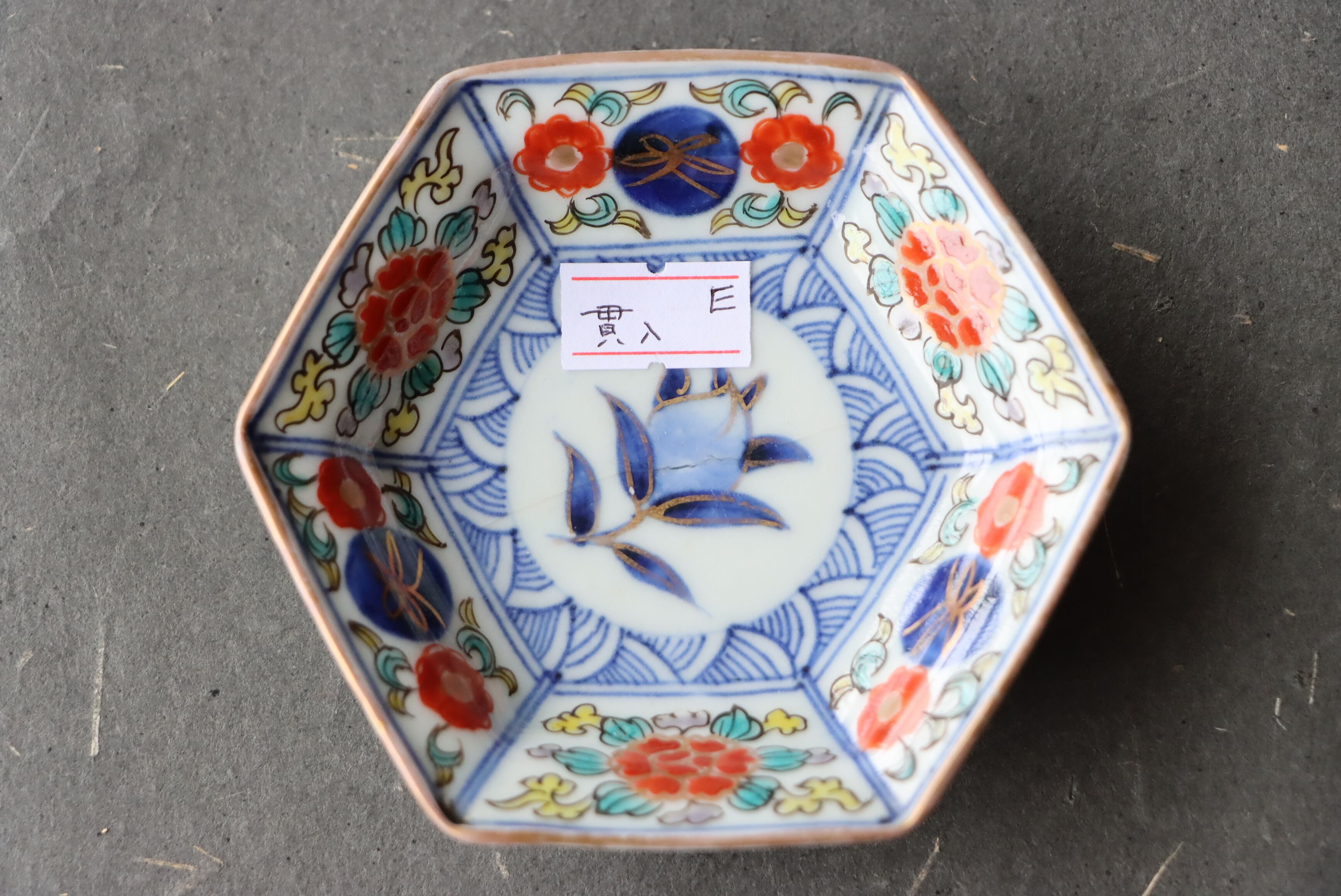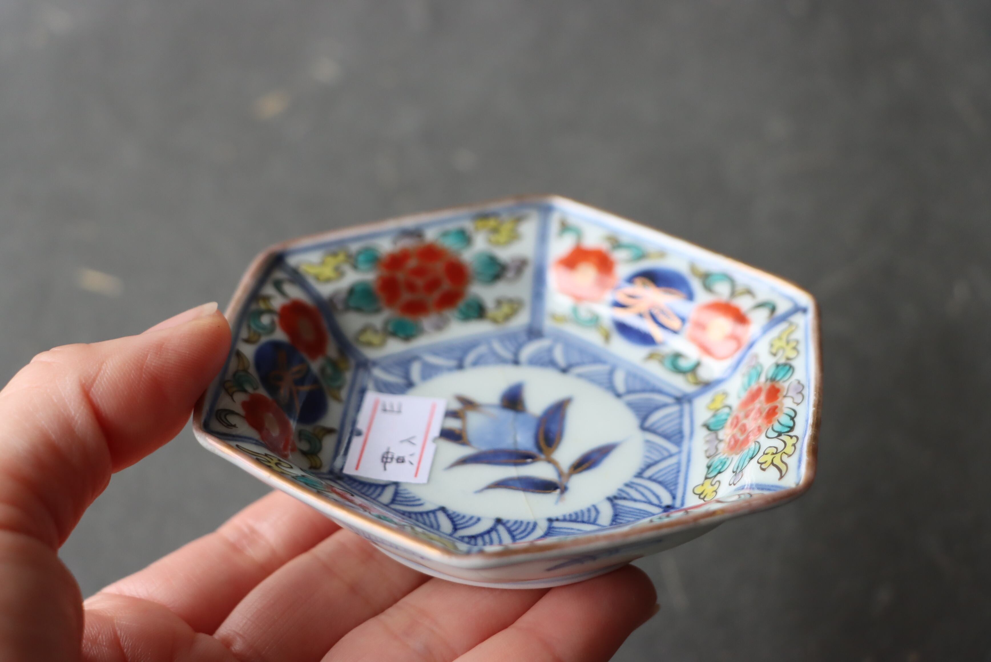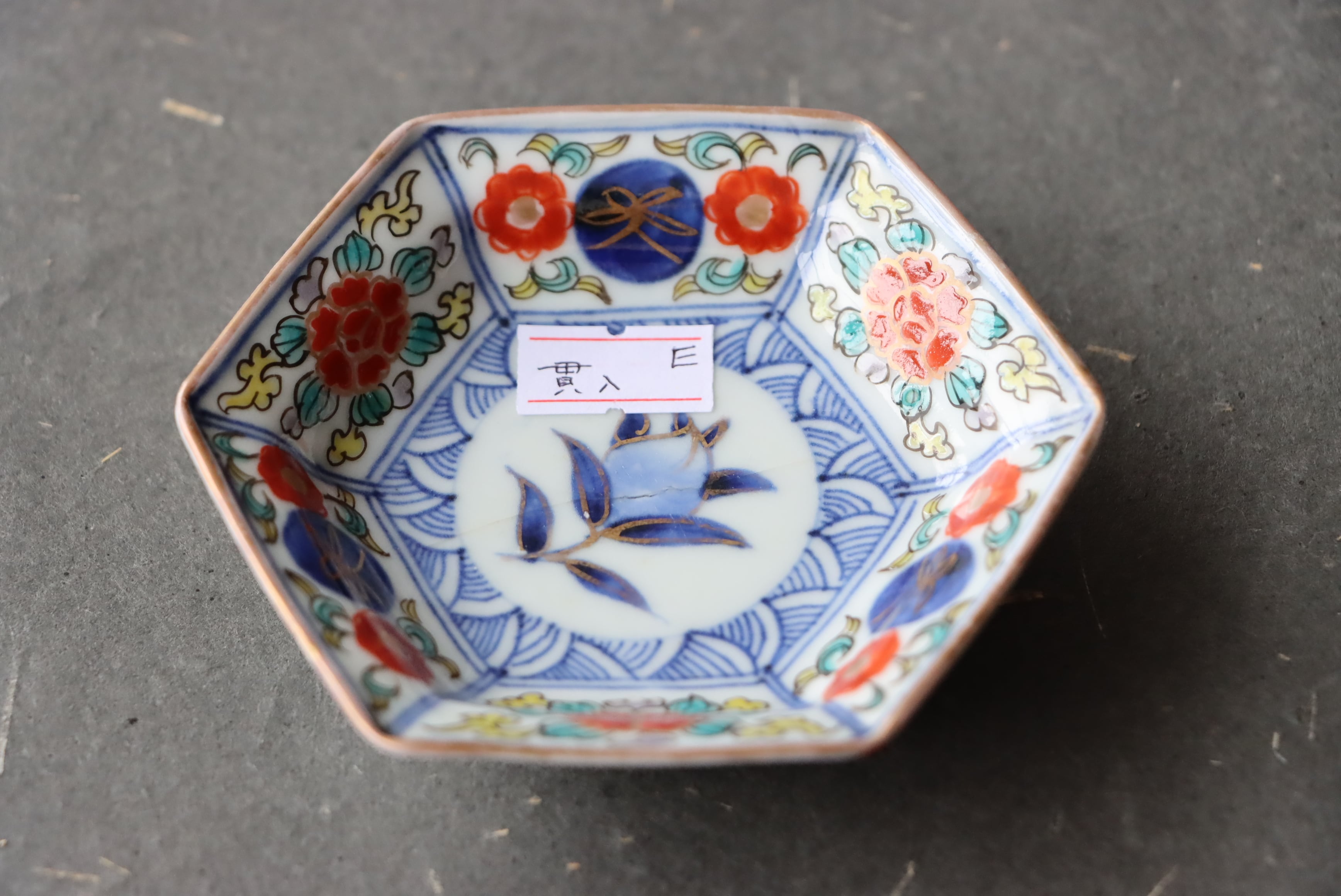 貫入 大聖寺伊万里 桃手 花文 六角形 豆皿 E アウトレット