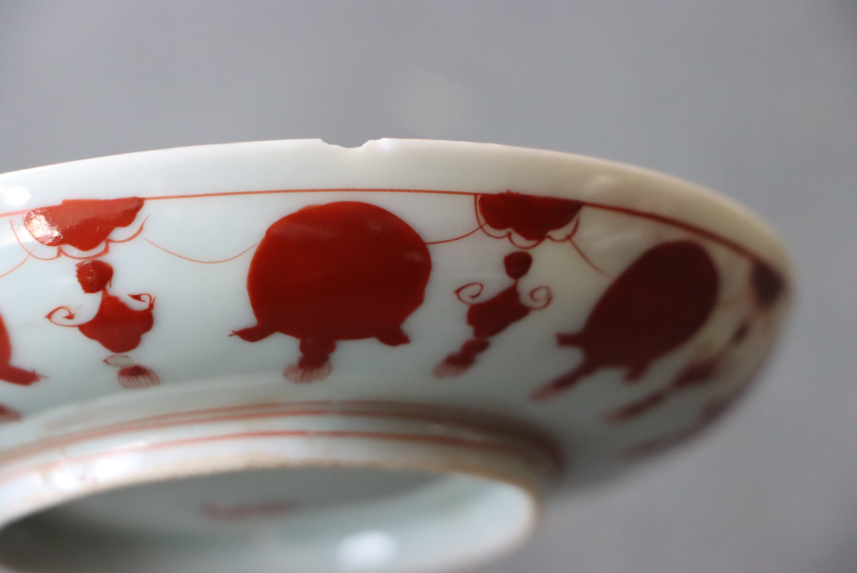 状態:カケ(約2センチ)あり。釉薬が薄れている箇所があります。金継ぎ用に。