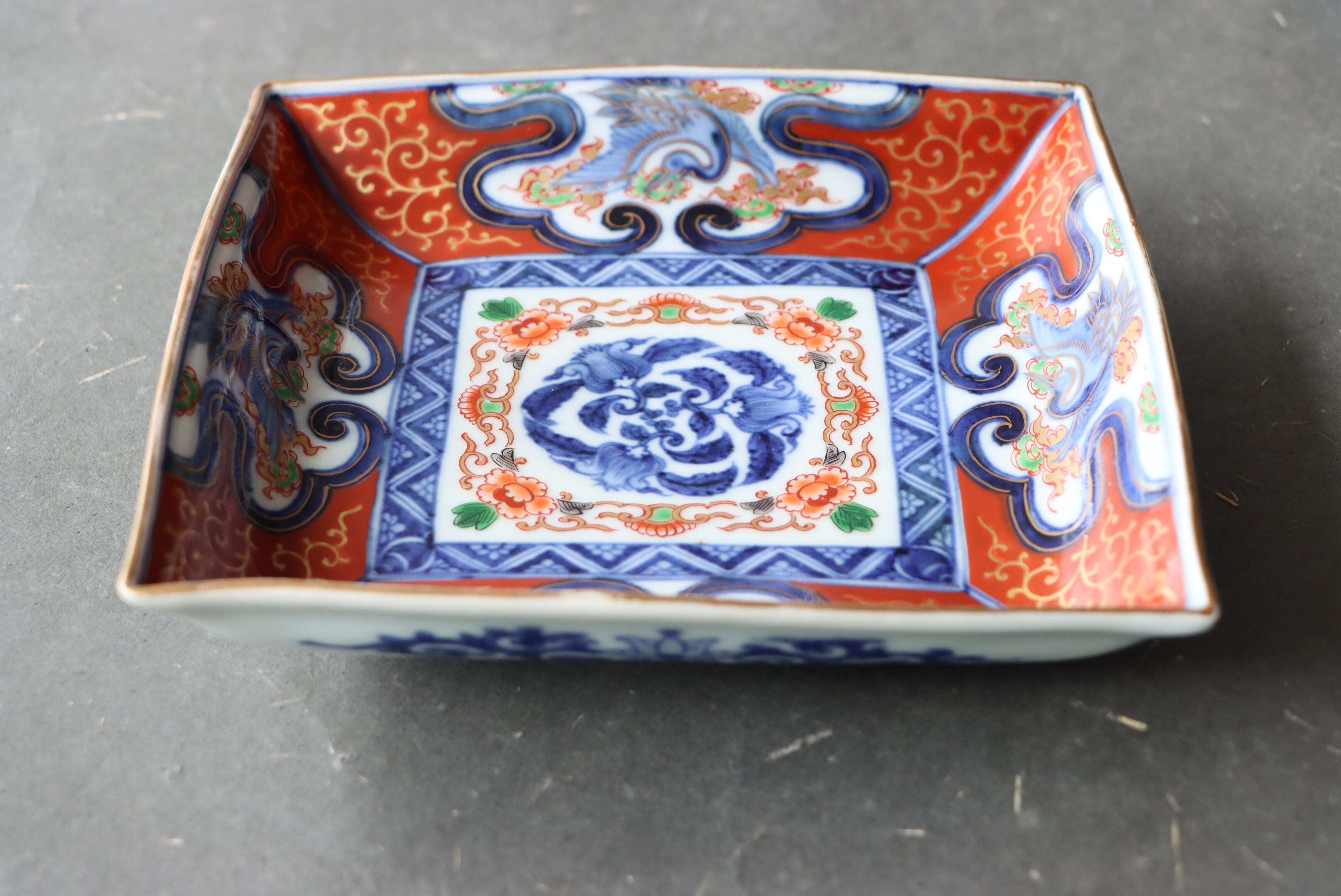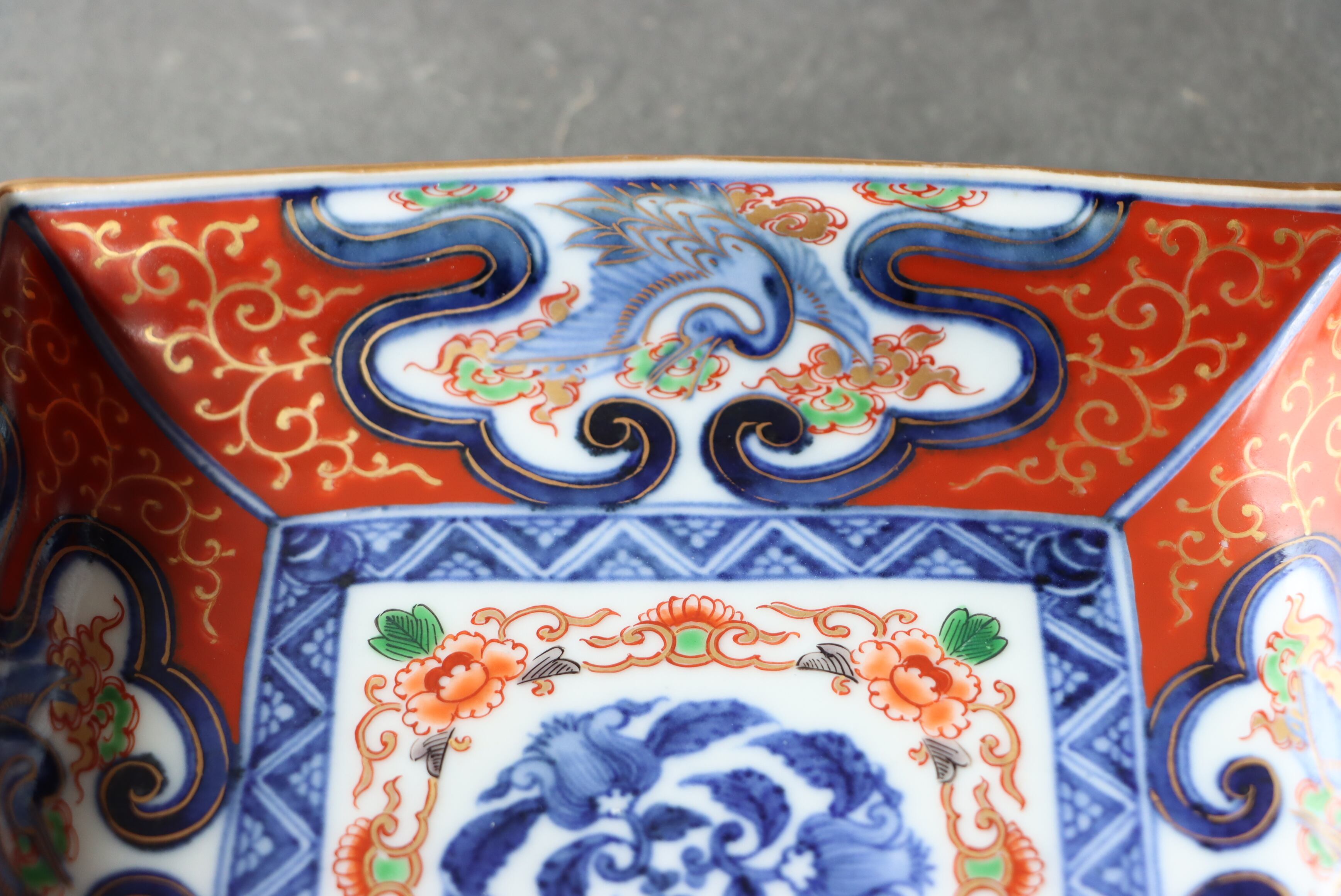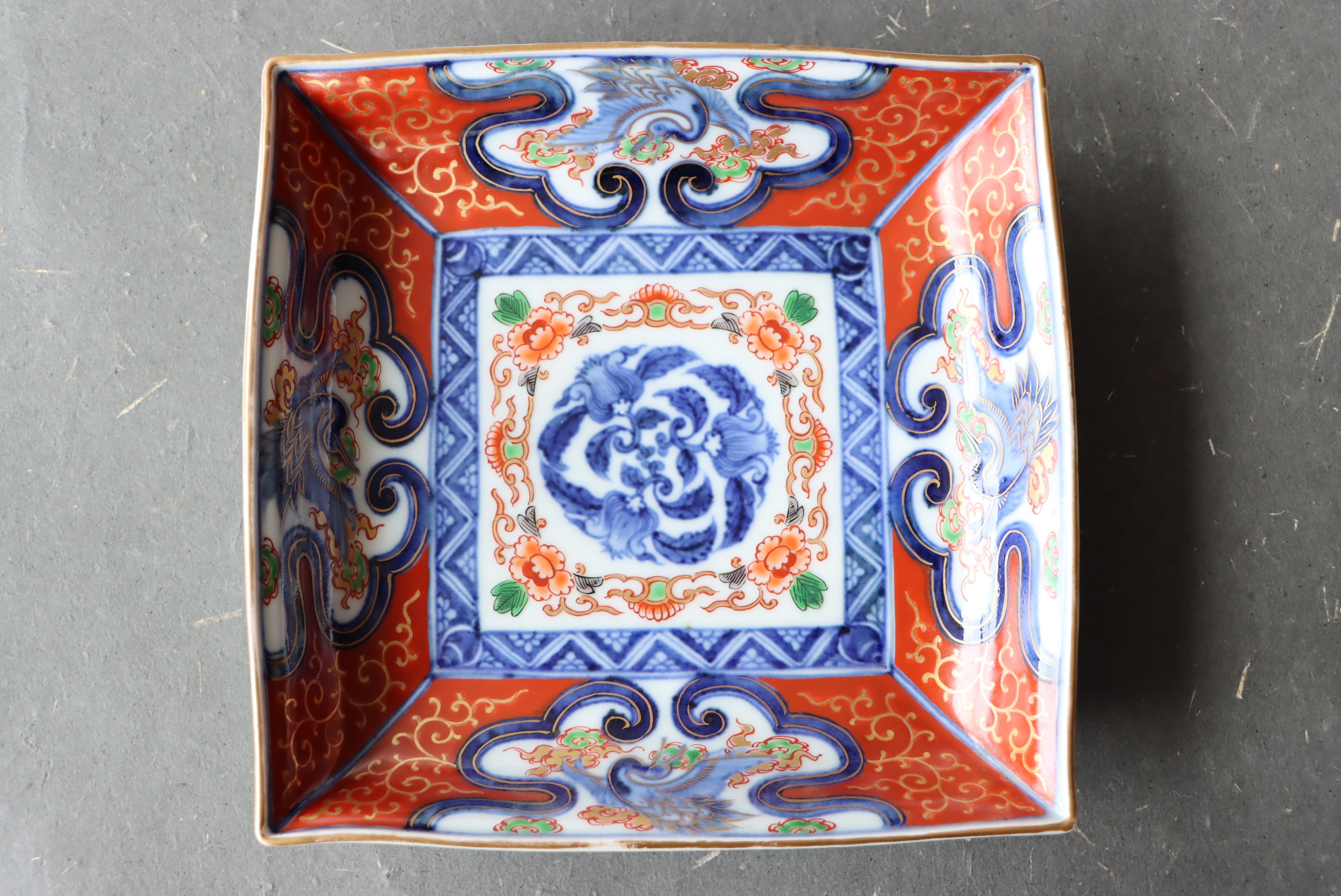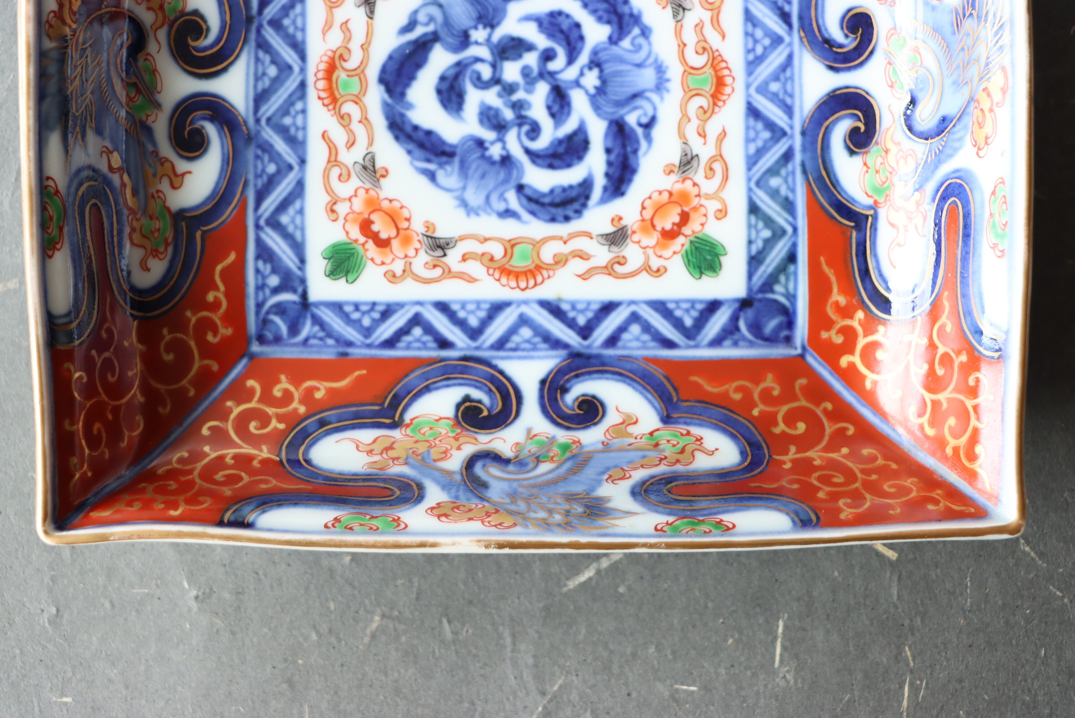 【Old Imari square shaped plate with crane and cloud design in overglaze enamels.】
