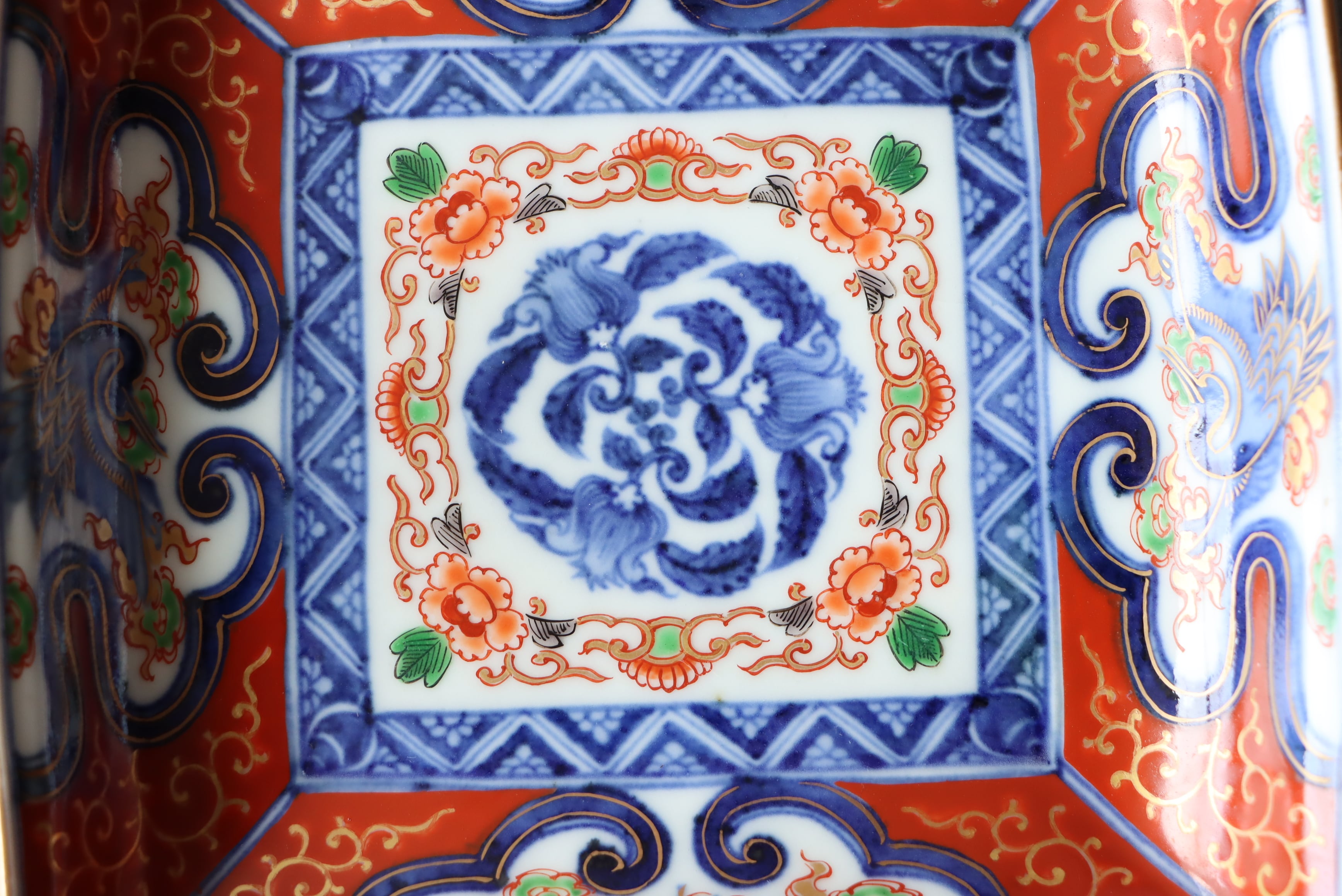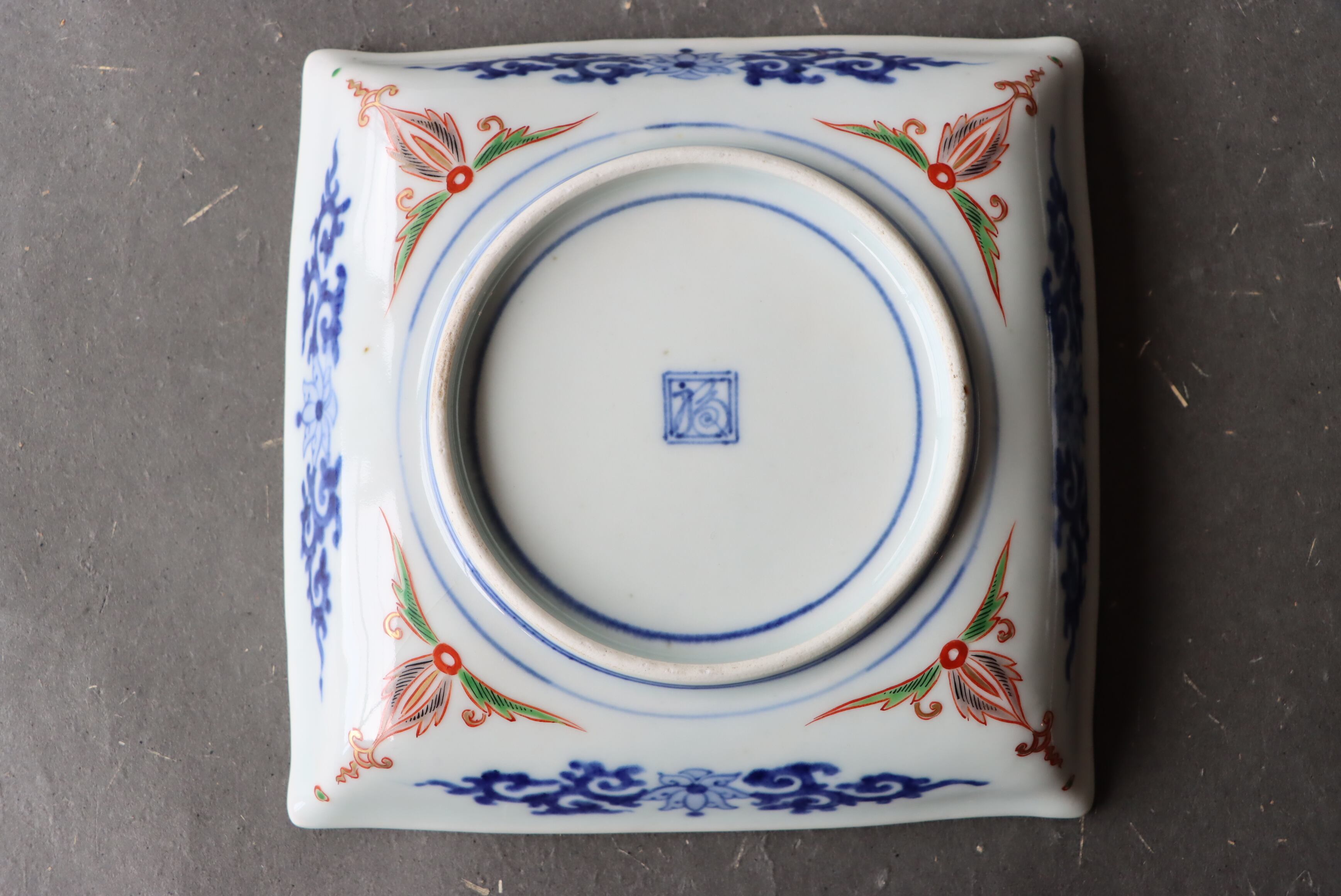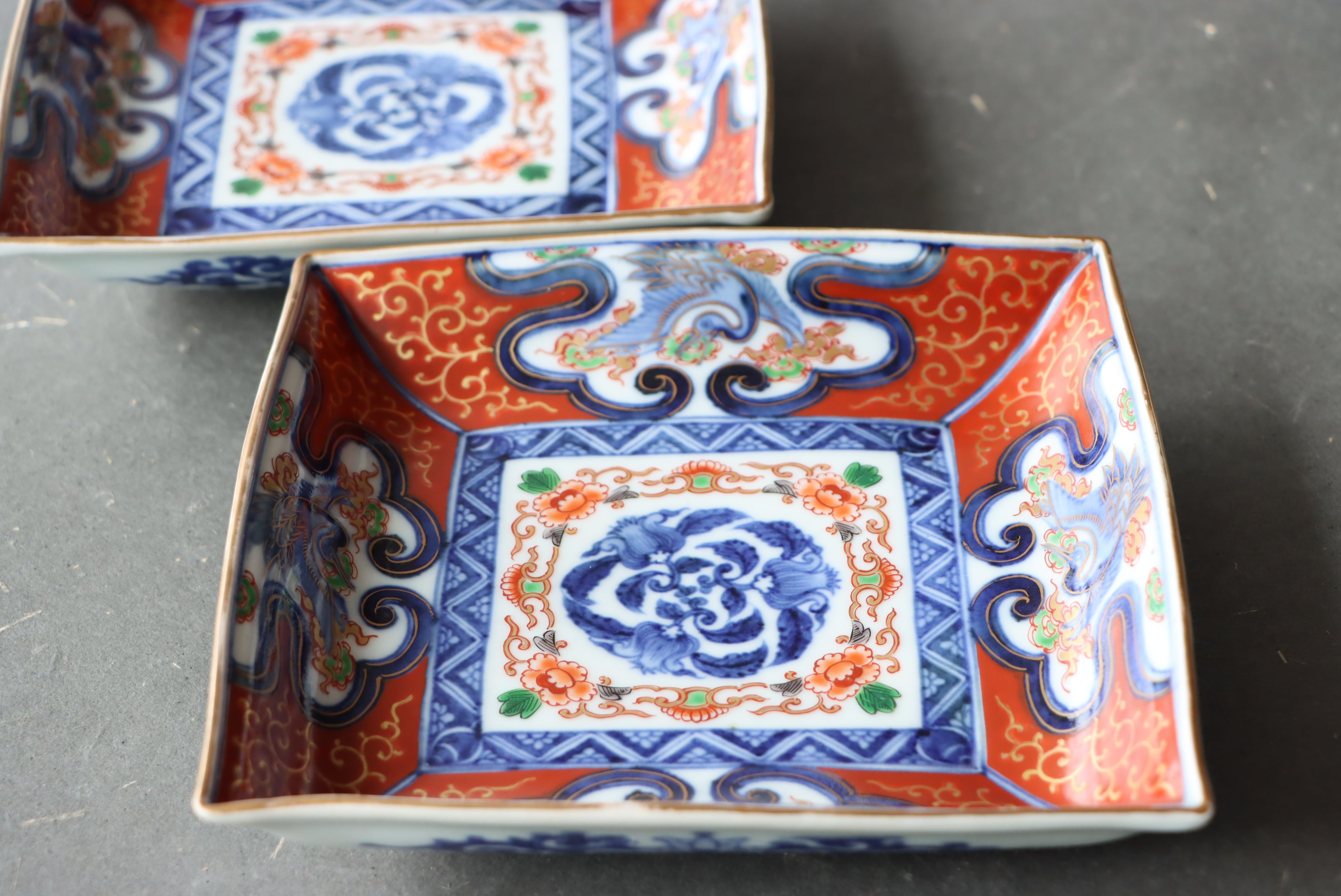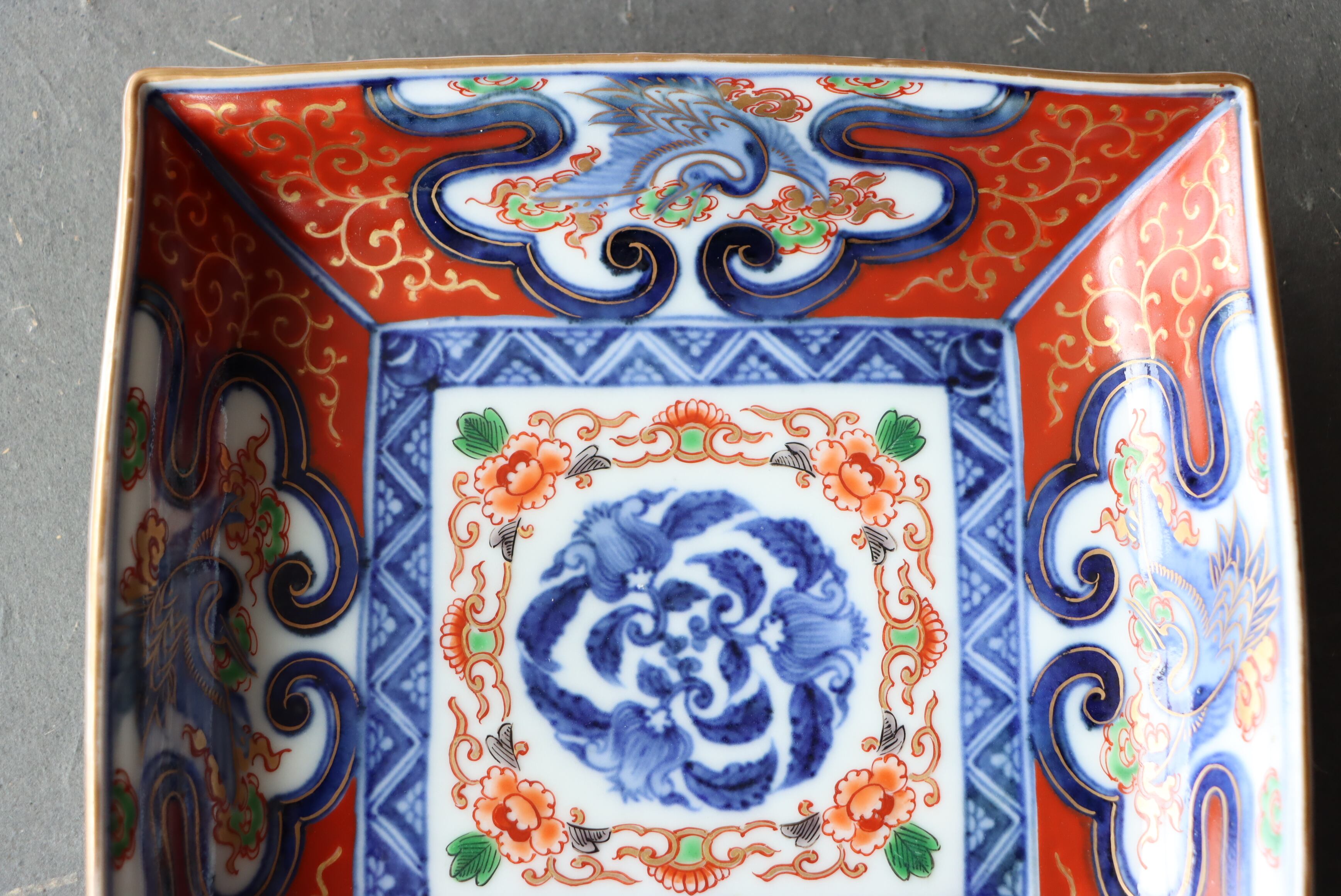 【Old Imari square shaped plate with crane and cloud design in overglaze enamels.】