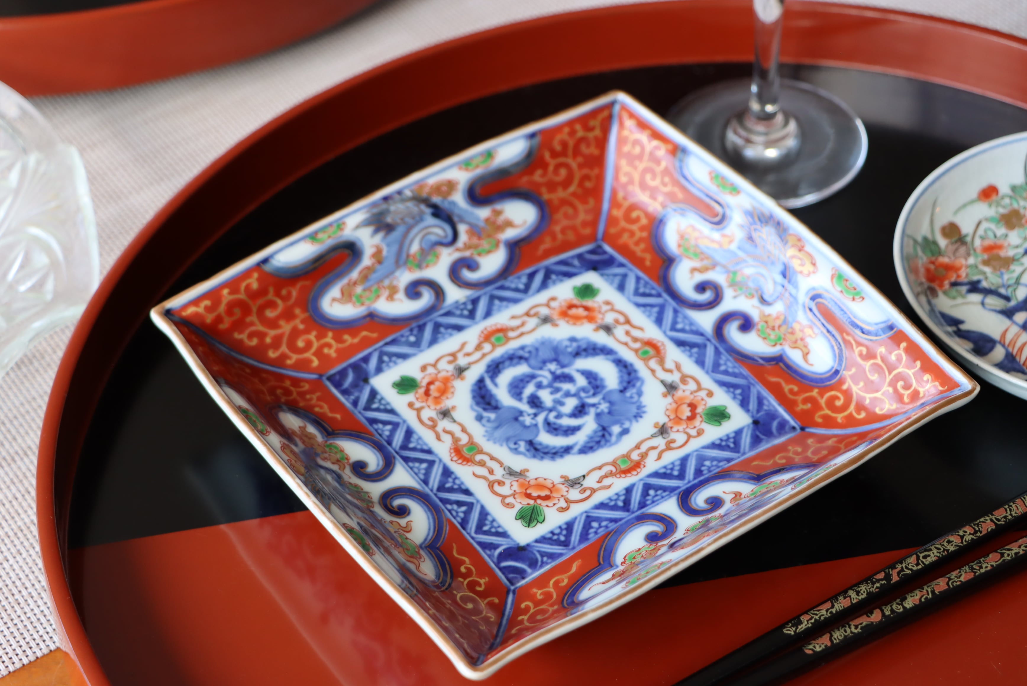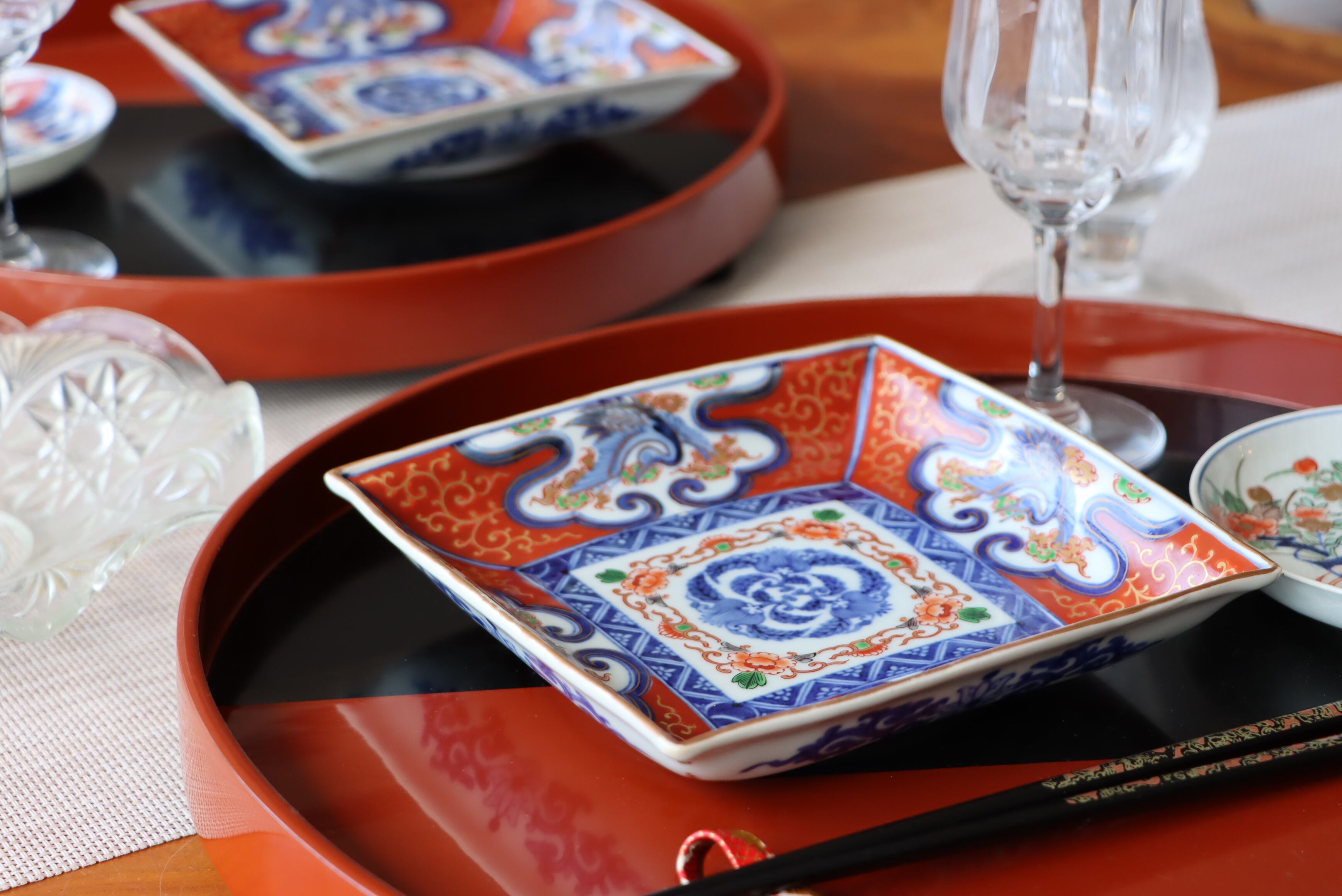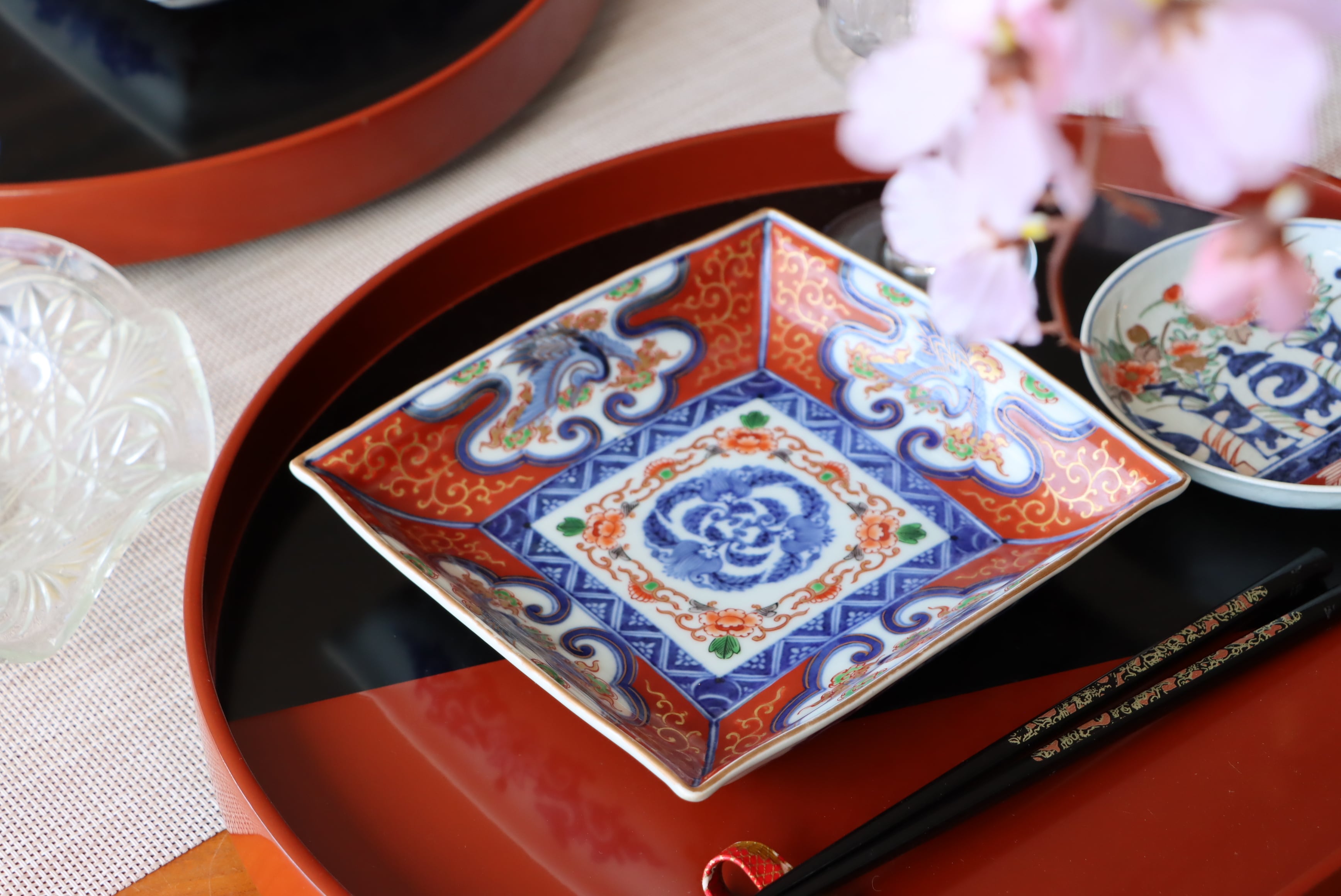 角皿ならではの構図の美しさ、おもてなしの場にも食卓を華やぎをもたらす器です。
