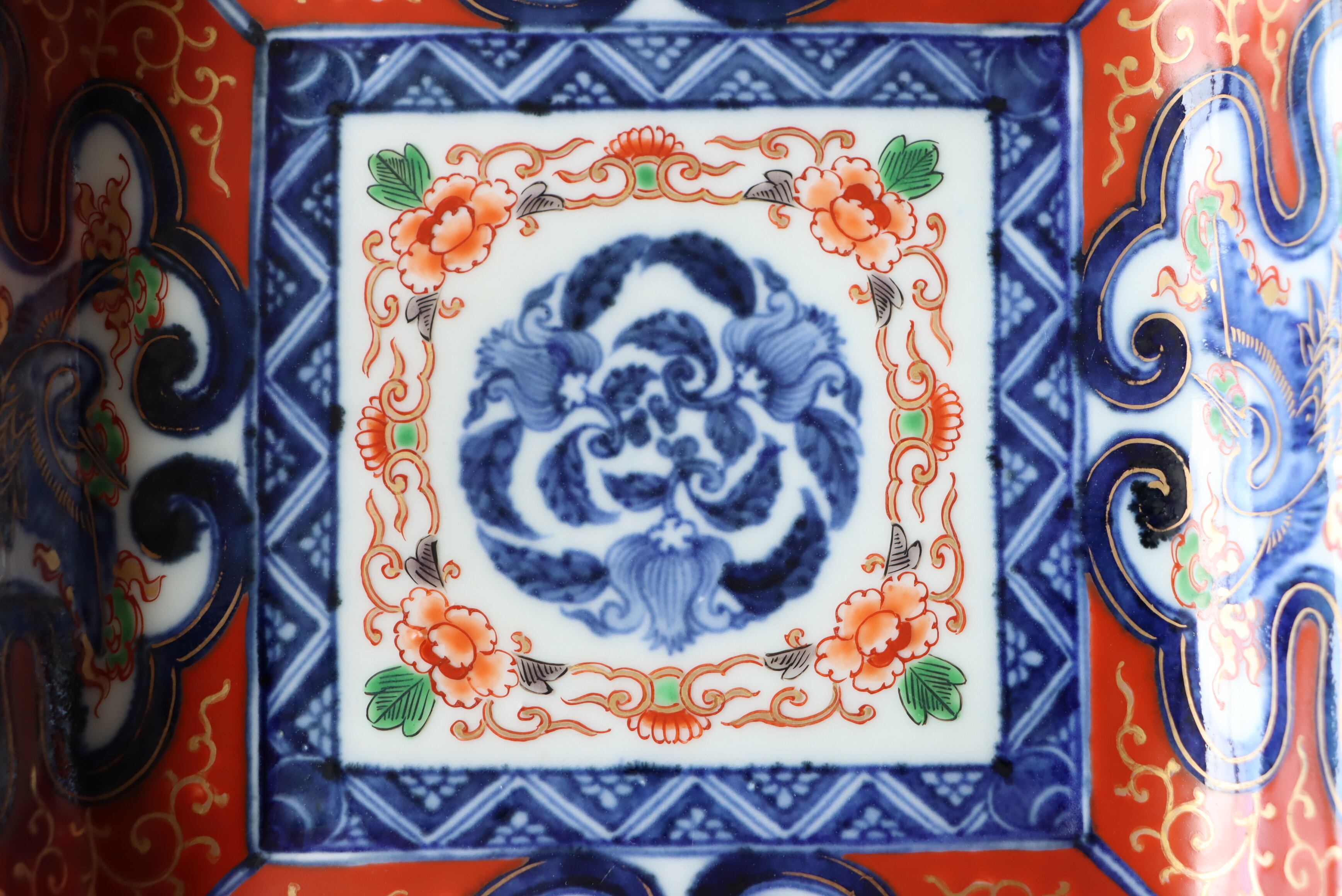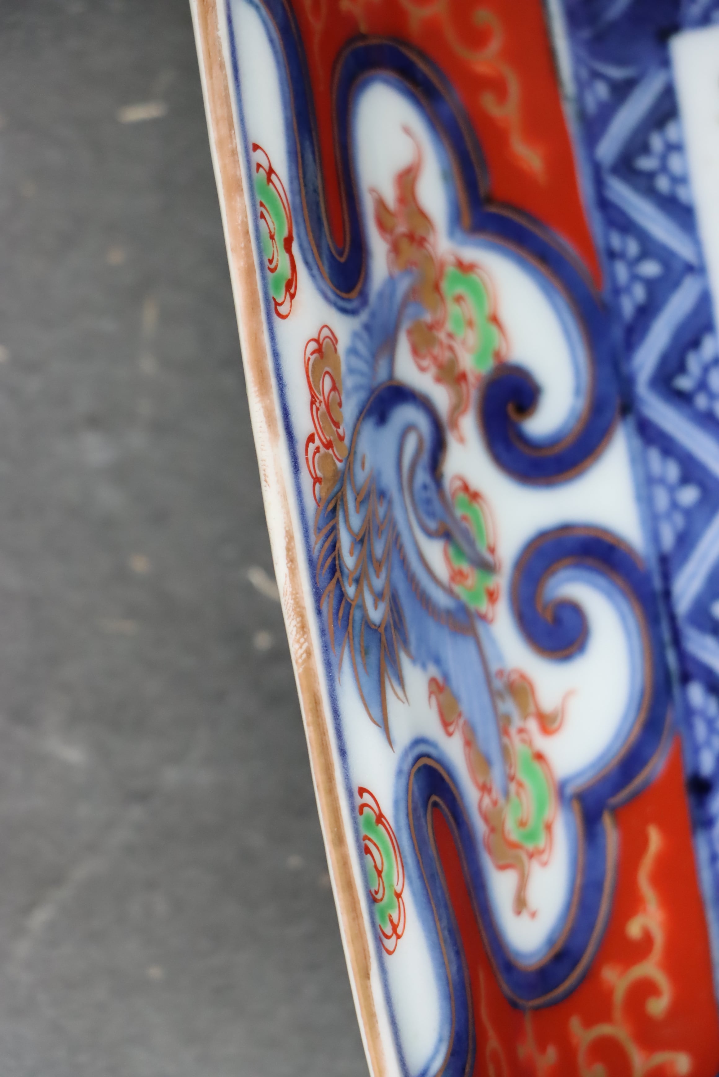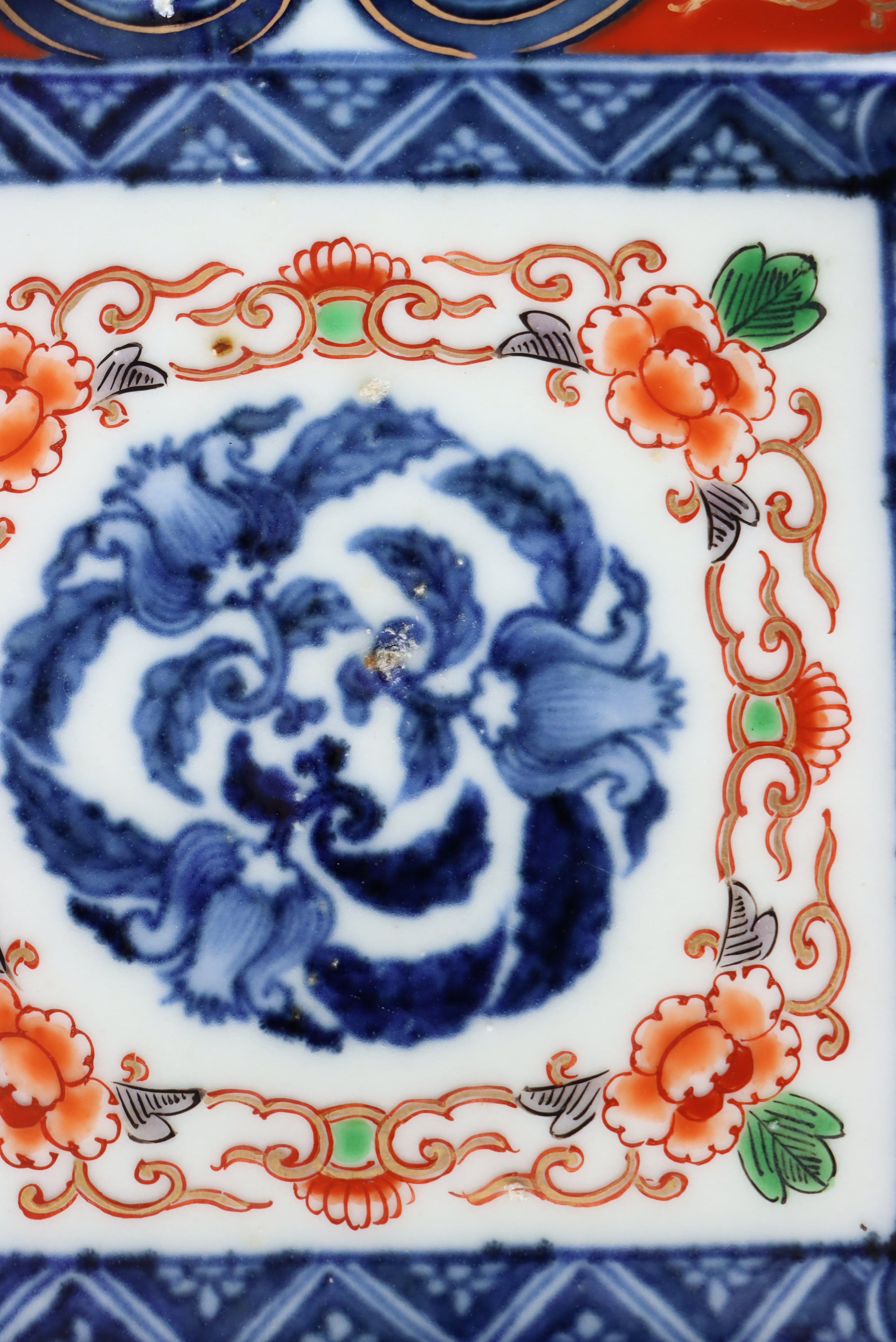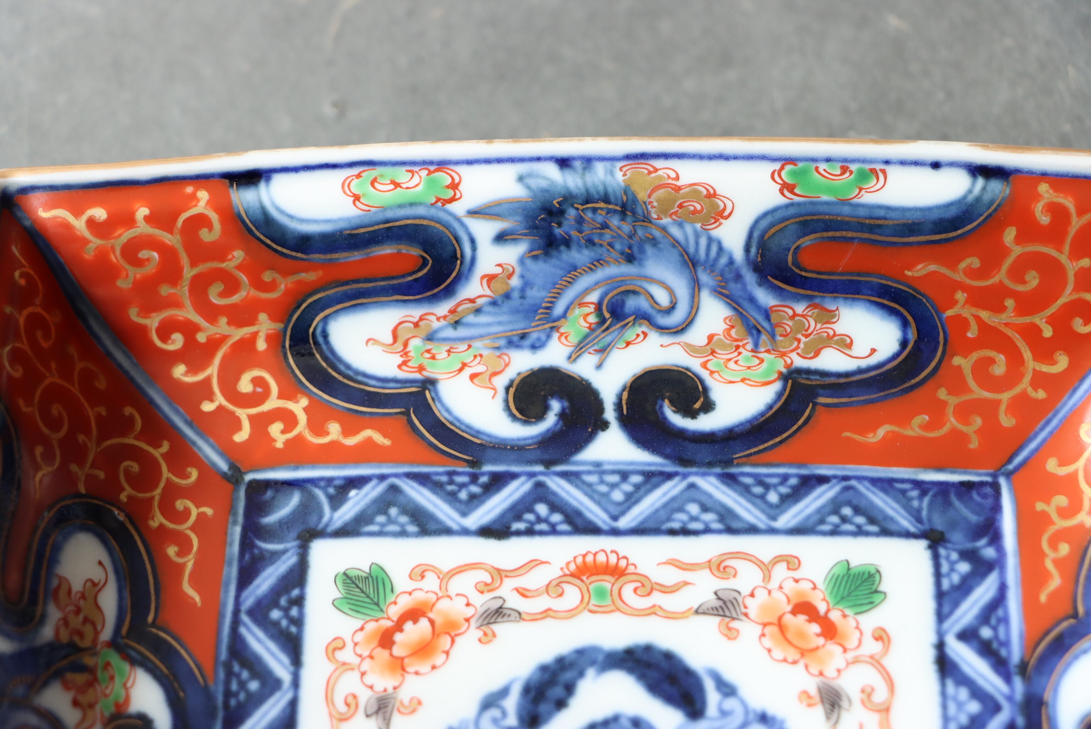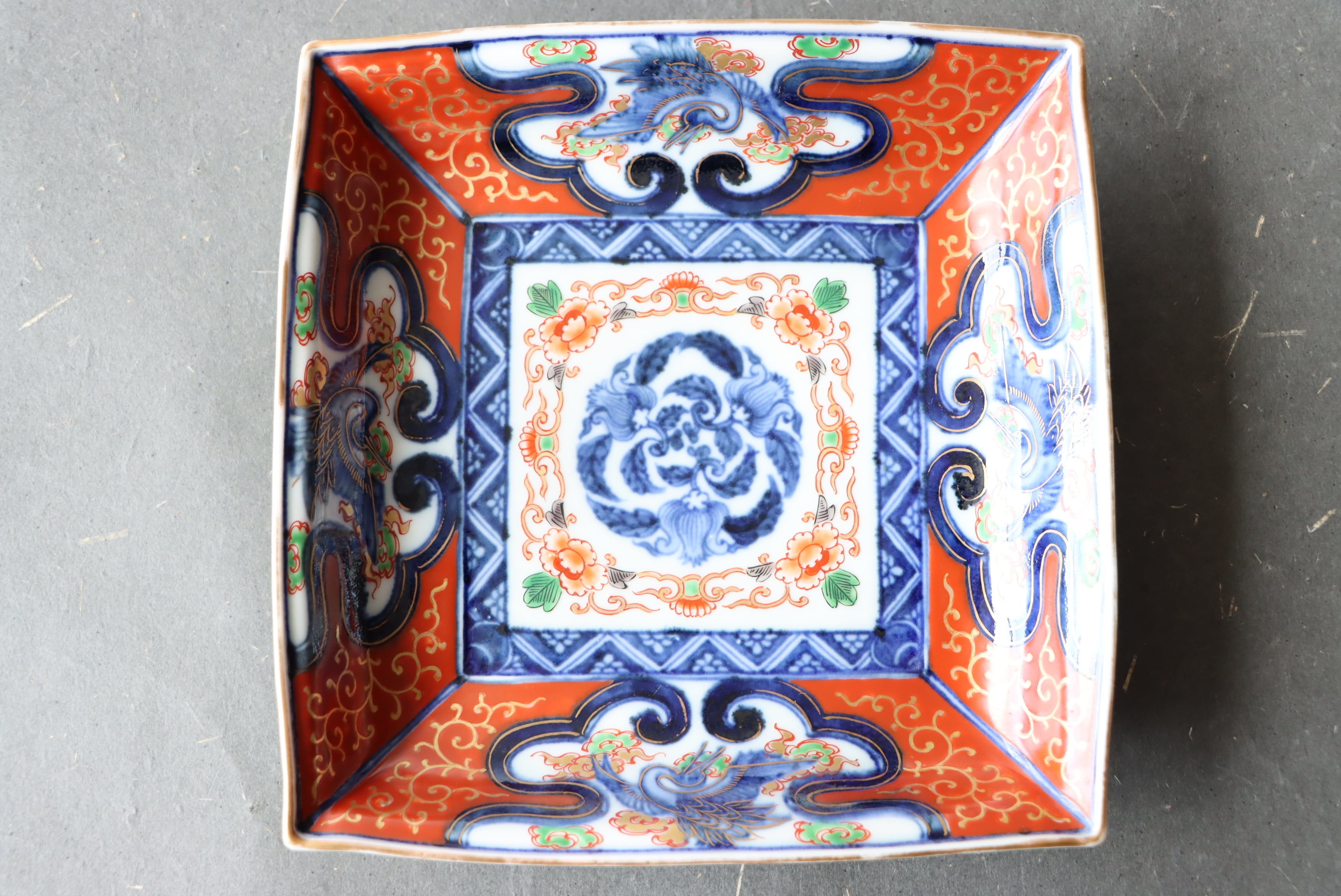 【Old Imari square shaped plate with crane and cloud design in overglaze enamels.】