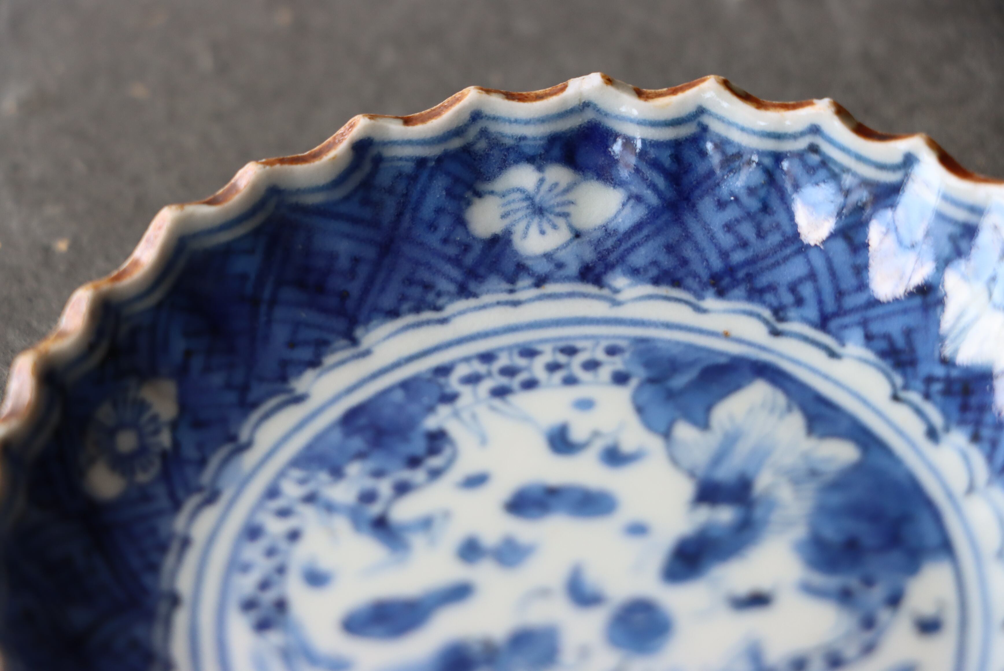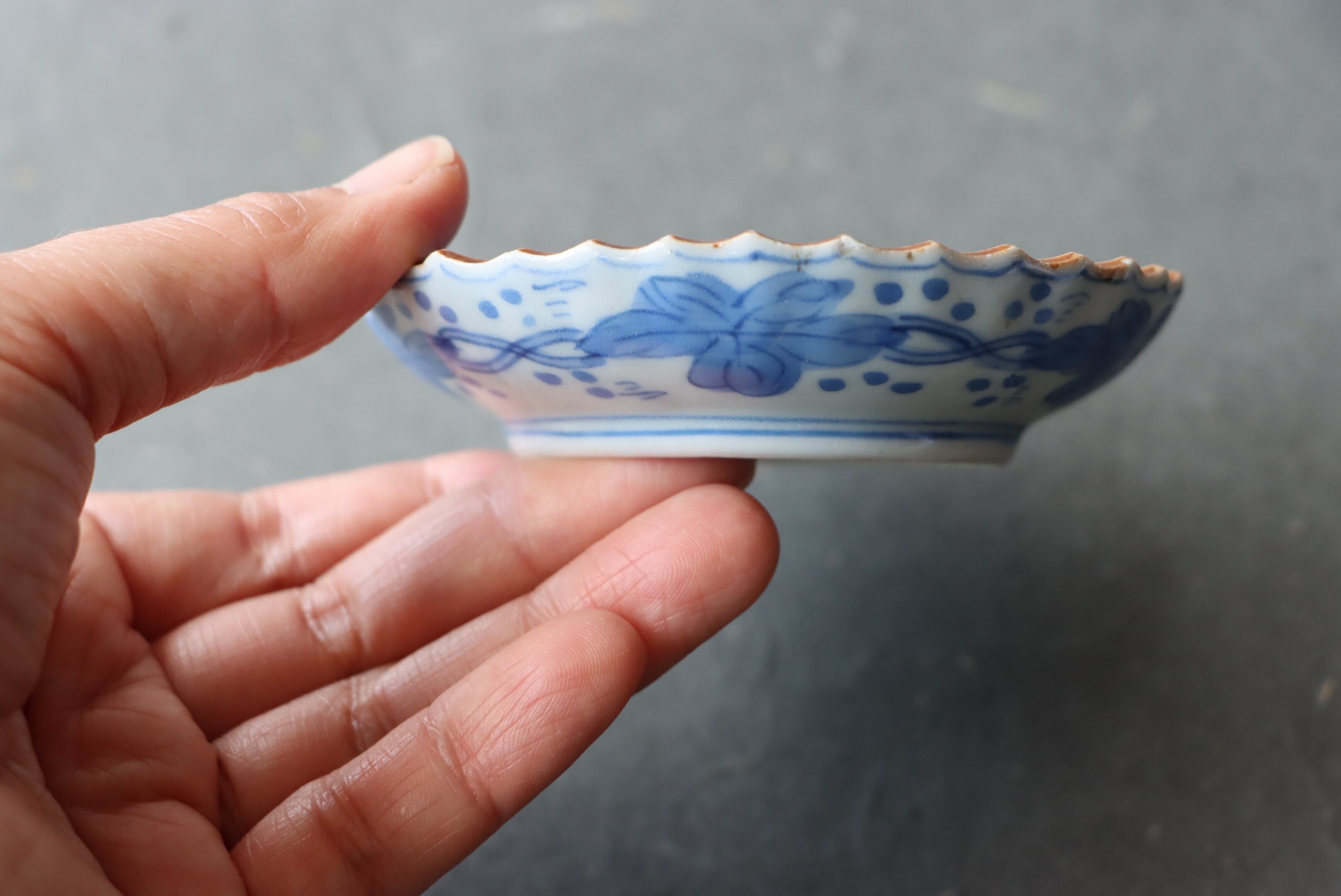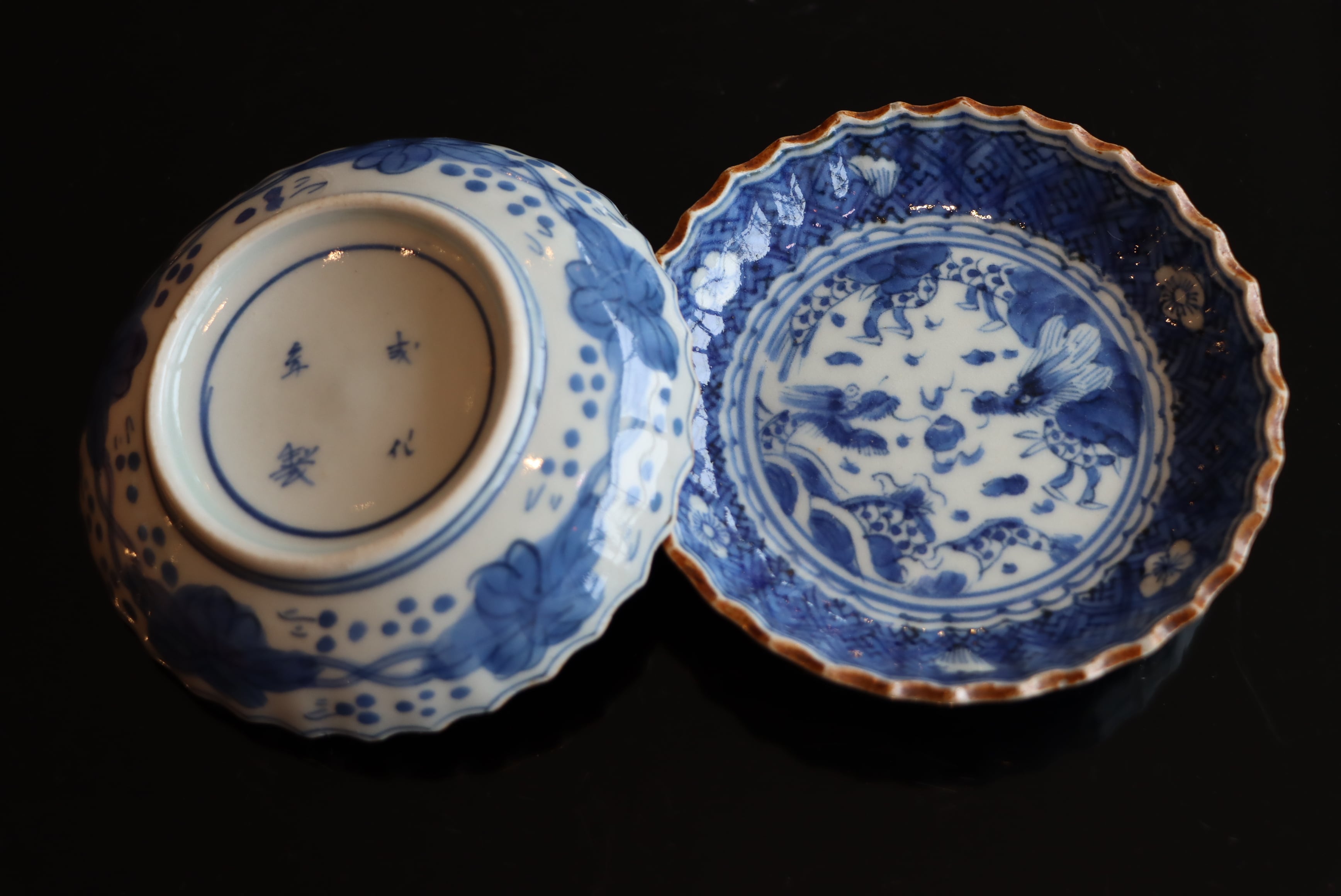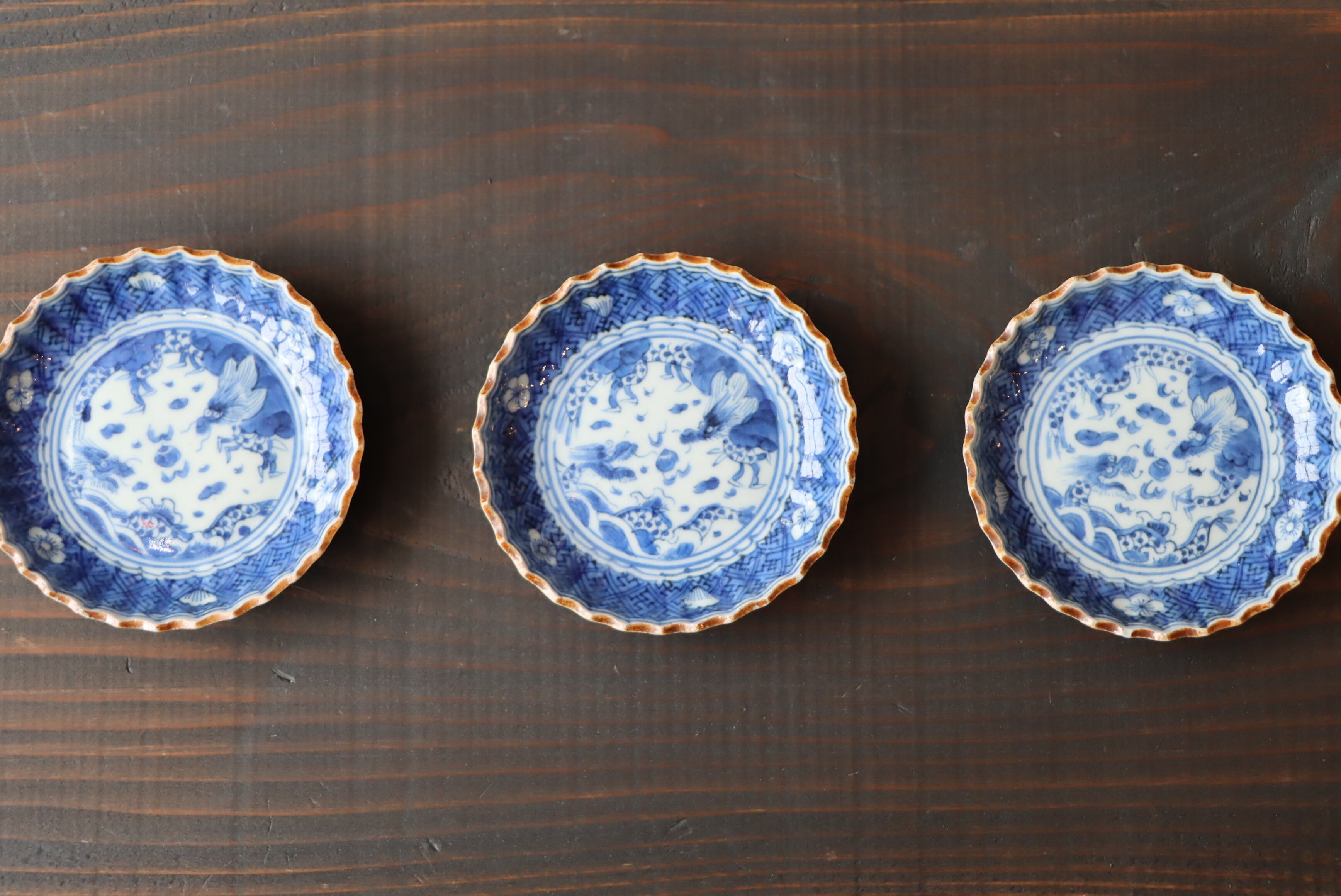 焼成時に窯の中でできる鉄分、くっつき、かまきず、ピンホール、経年による釉薬の薄れがございます。また、一枚一枚手描き、手作りですので器のサイズ(ミリ)、色味、描かれている文様の大きさなど個体差があり、ひとつとして同じものはございません。そういった時代感、個性をご理解いただき、楽しんでくだされば幸いです。電子レンジや食器洗い乾燥機のご使用はお控えください。