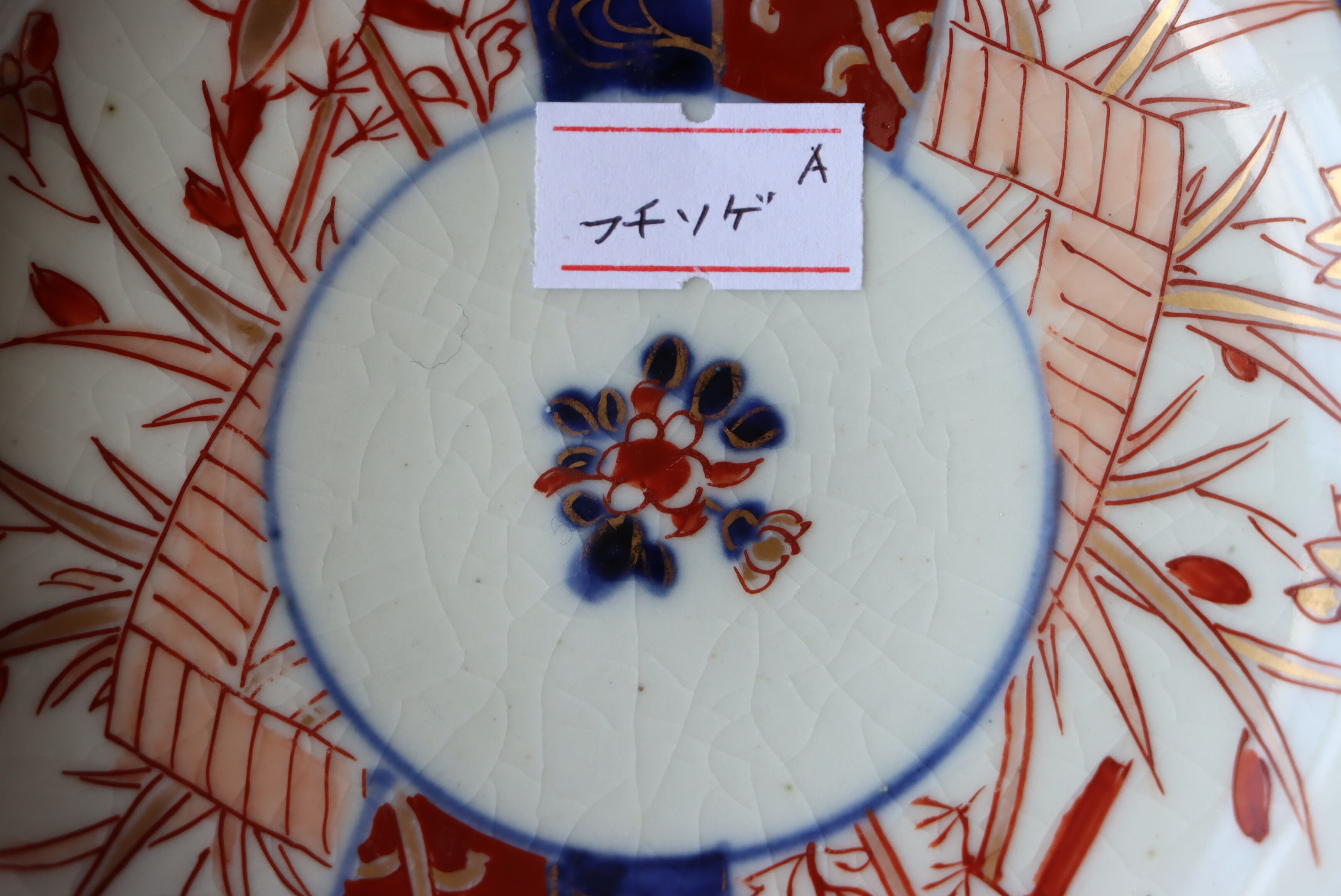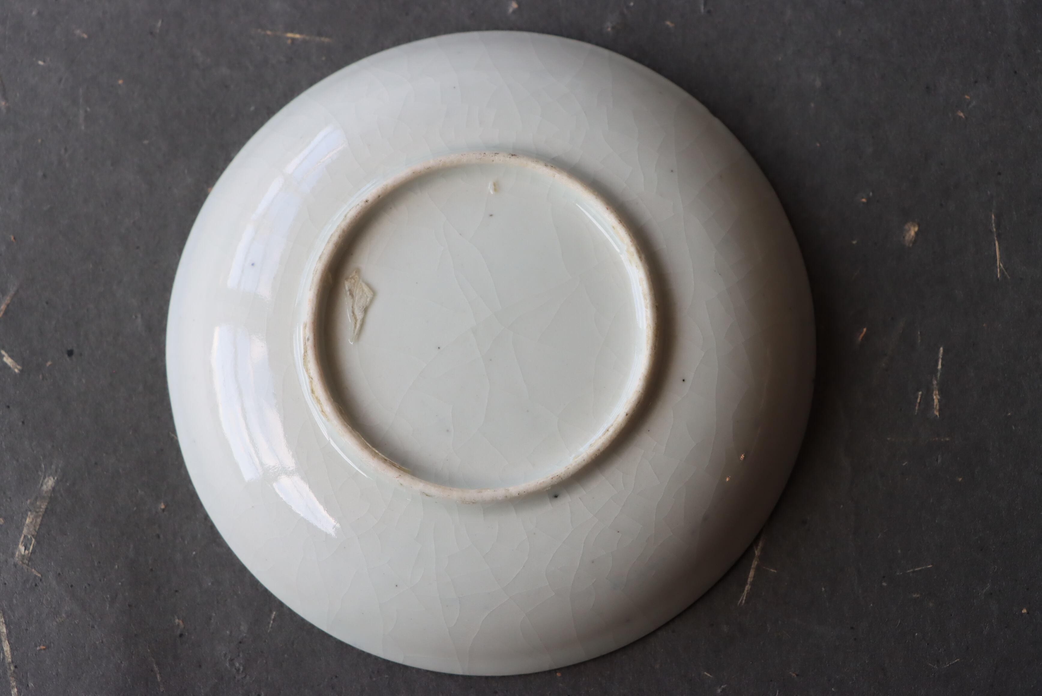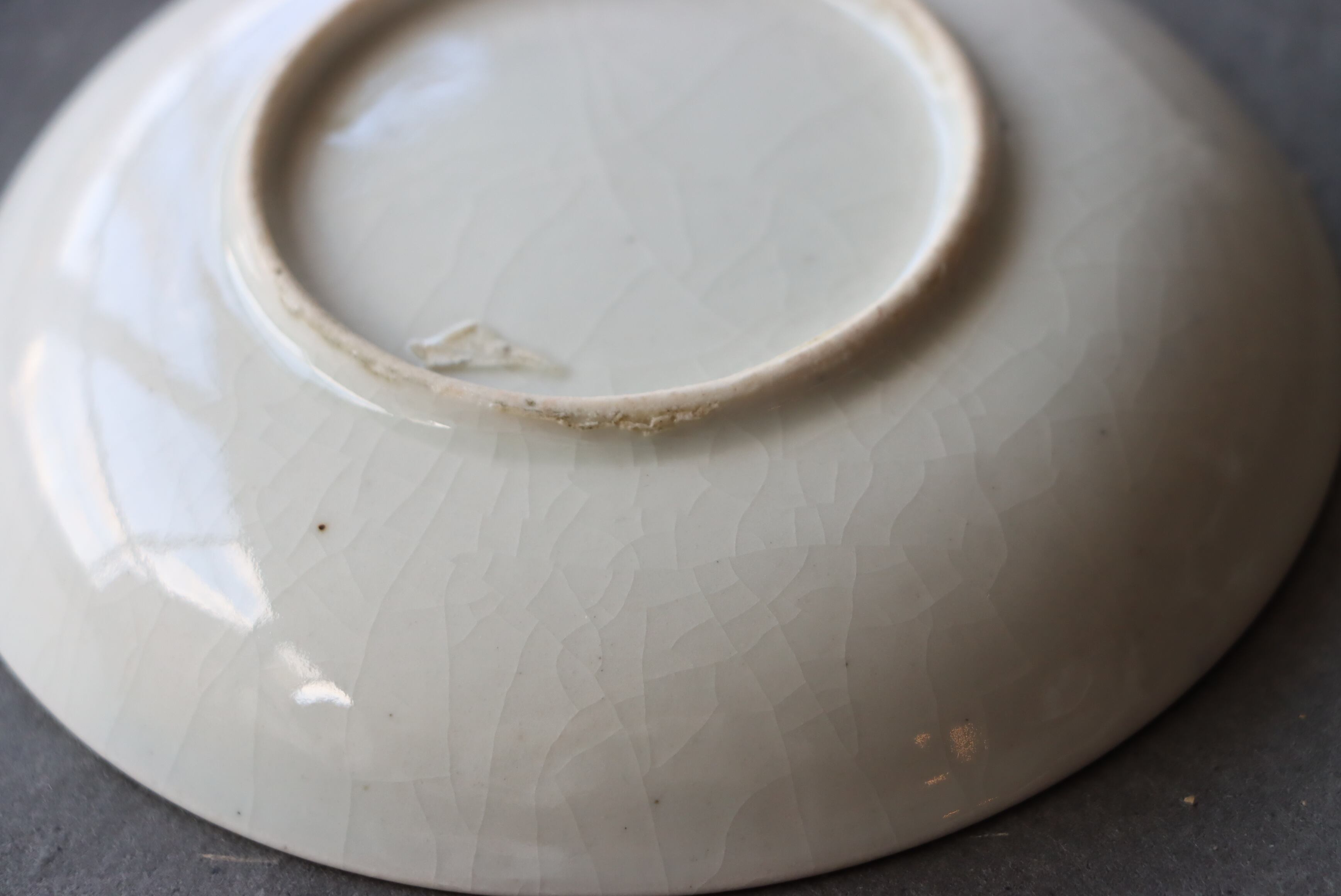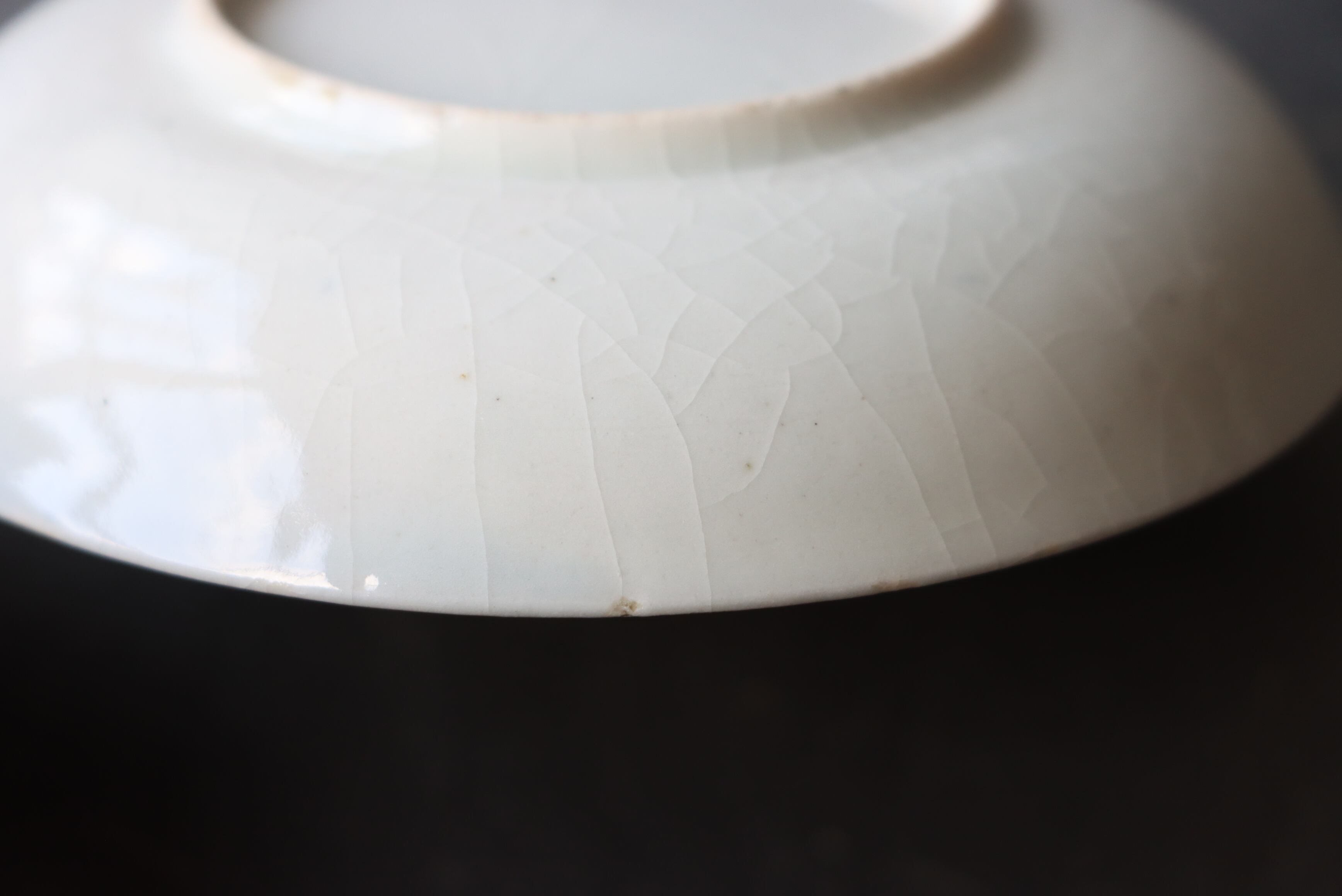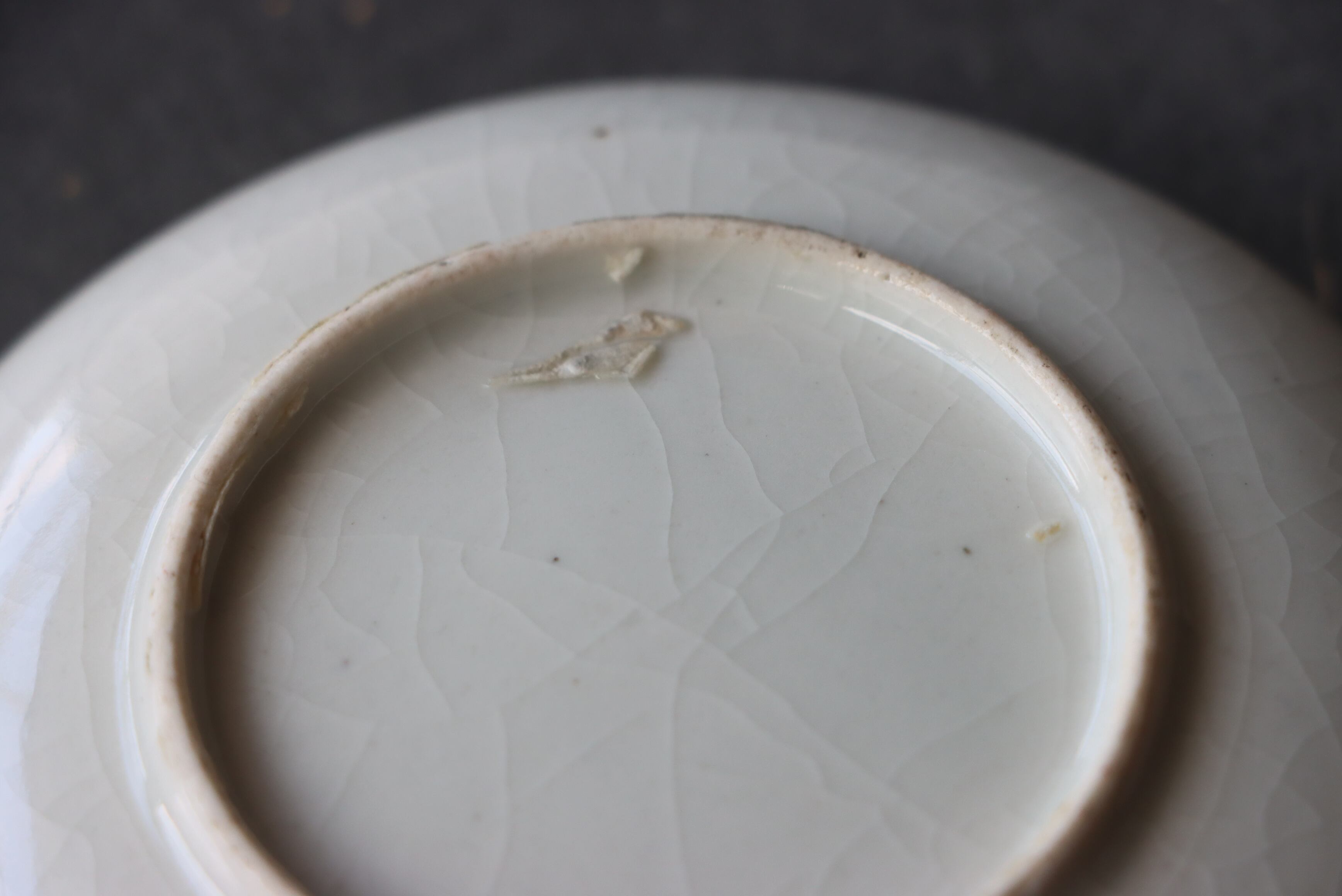 状態:フチソゲあり。甘手あり(焼成が不十分なために、器の表面全体に貫入が入ってしまったこと。窯出しの時に、急激に温度が下がると素地と釉薬との収縮率の違いから、起こること。)