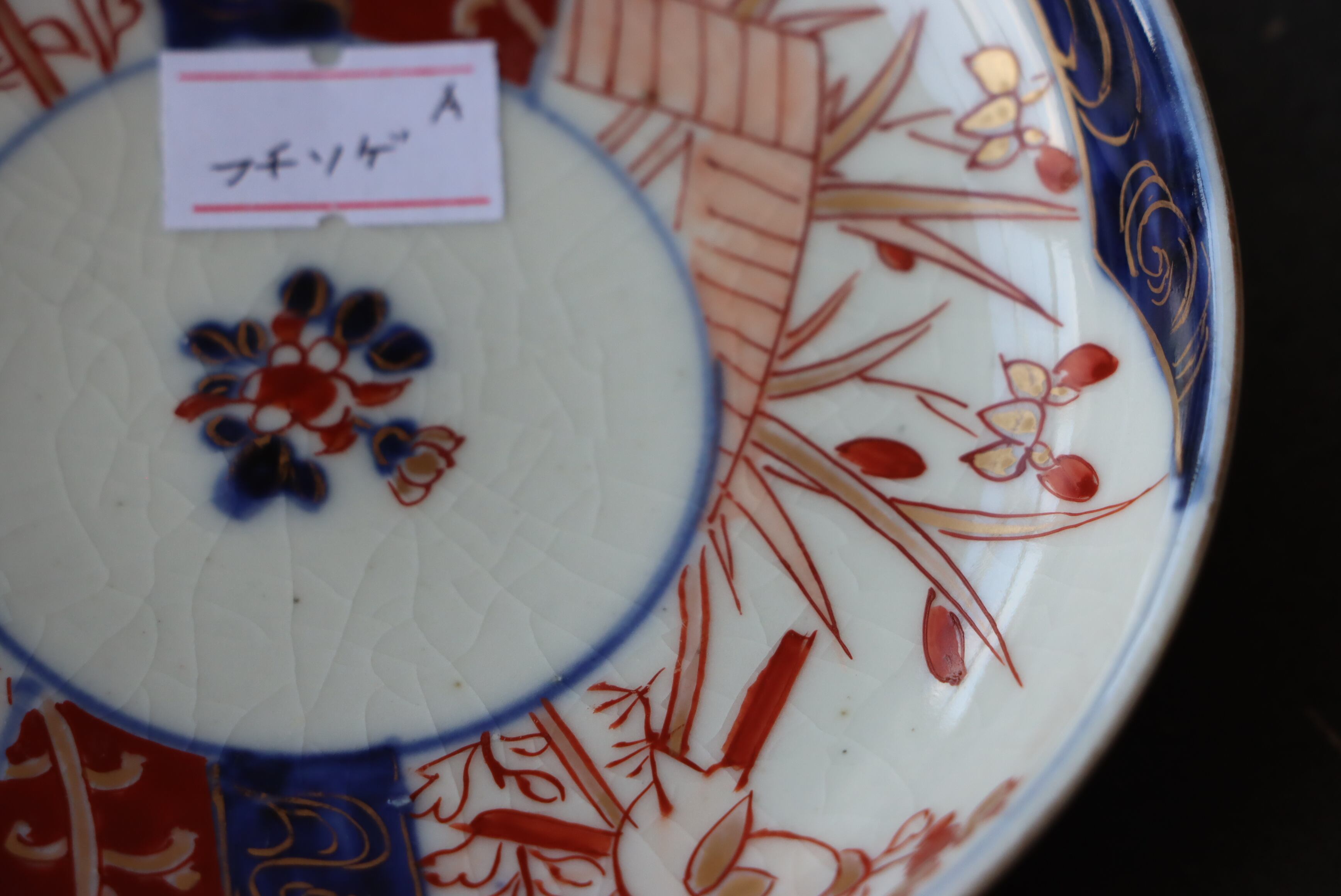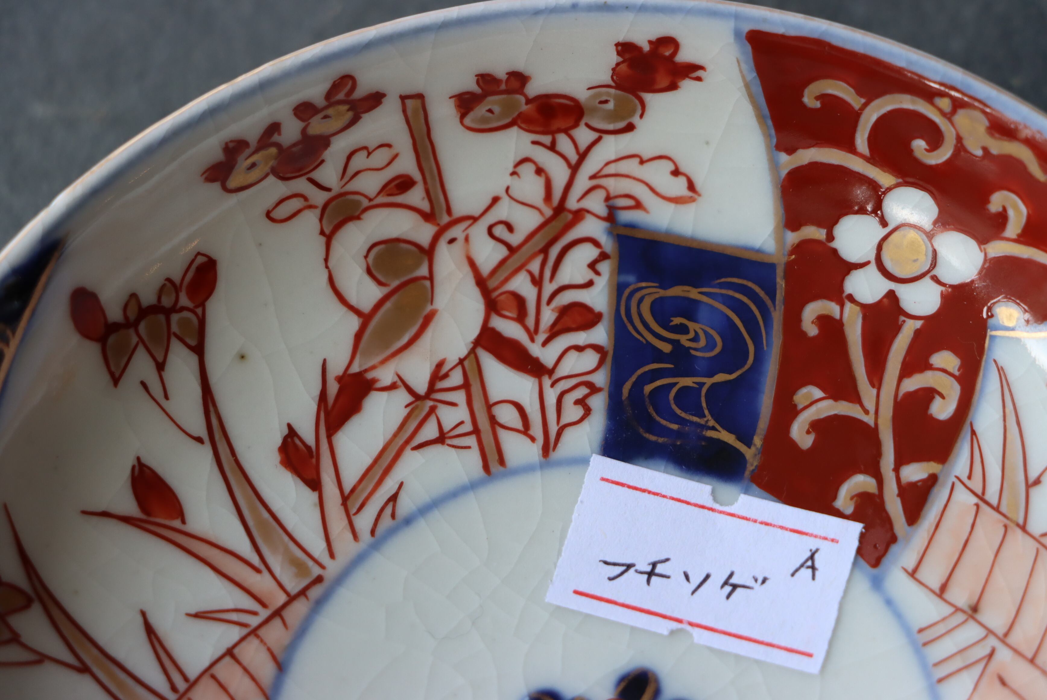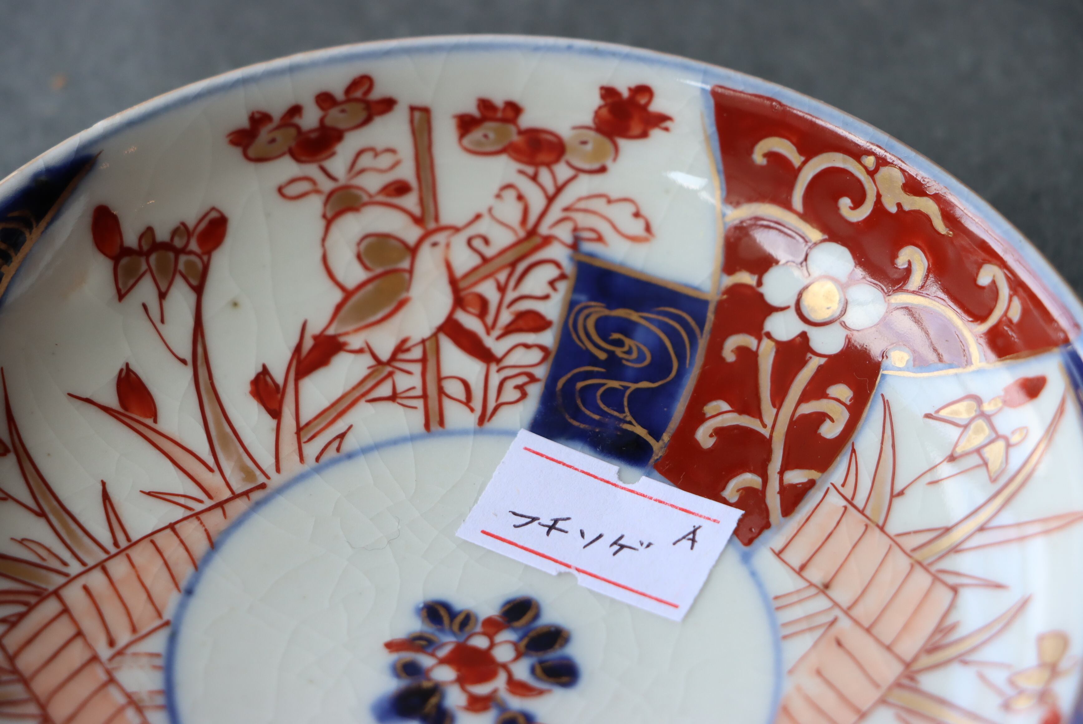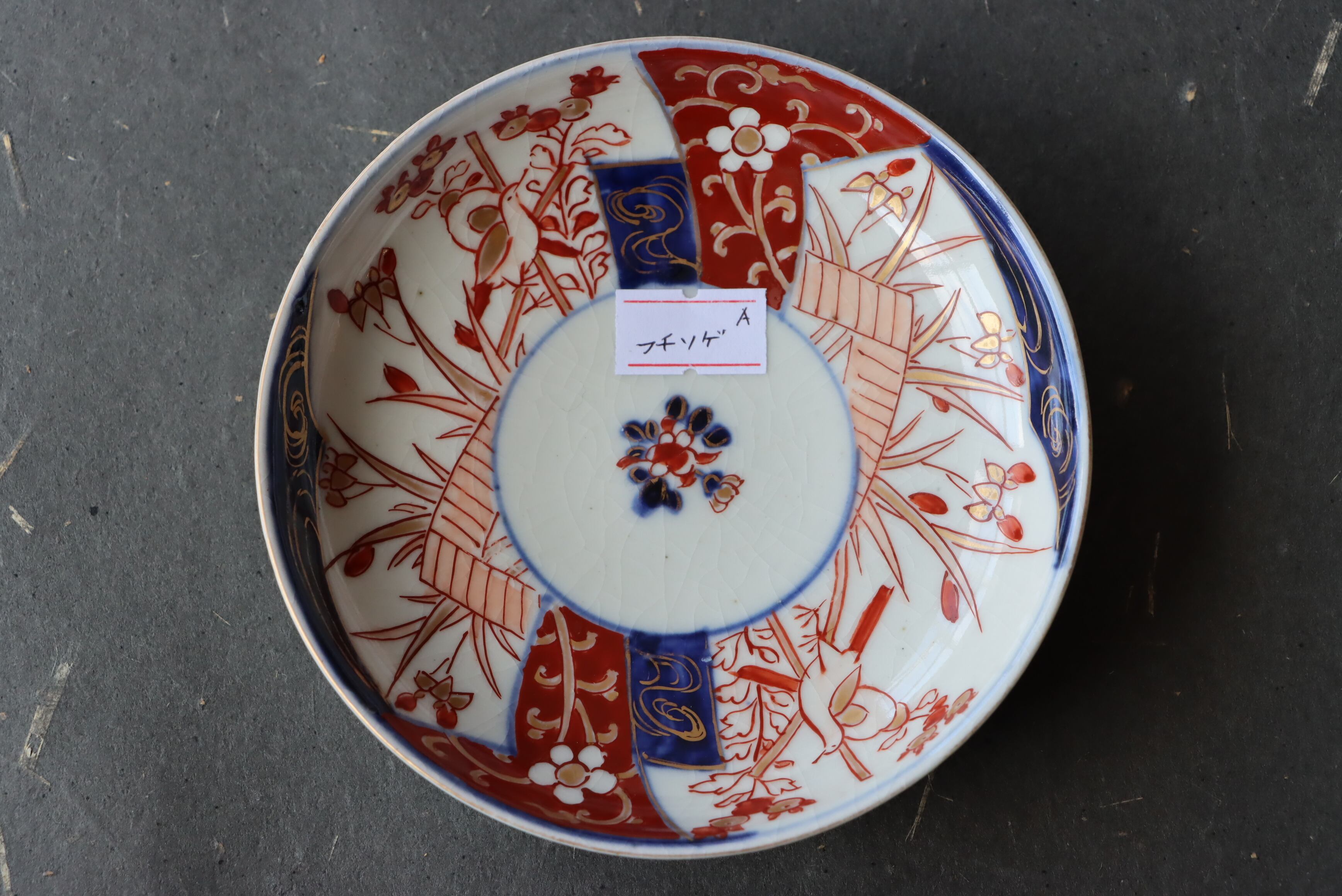 焼成時に窯の中でできる鉄分、くっつき、かまきず、ピンホール、経年による釉薬の薄れがございます。また、一枚一枚手描き、手作りですので器のサイズ(ミリ)、色味、描かれている文様の大きさなど個体差があり、ひとつとして同じものはございません。そういった時代感、個性をご理解いただき、楽しんでくだされば幸いです。電子レンジや食器洗い乾燥機のご使用はお控えください。