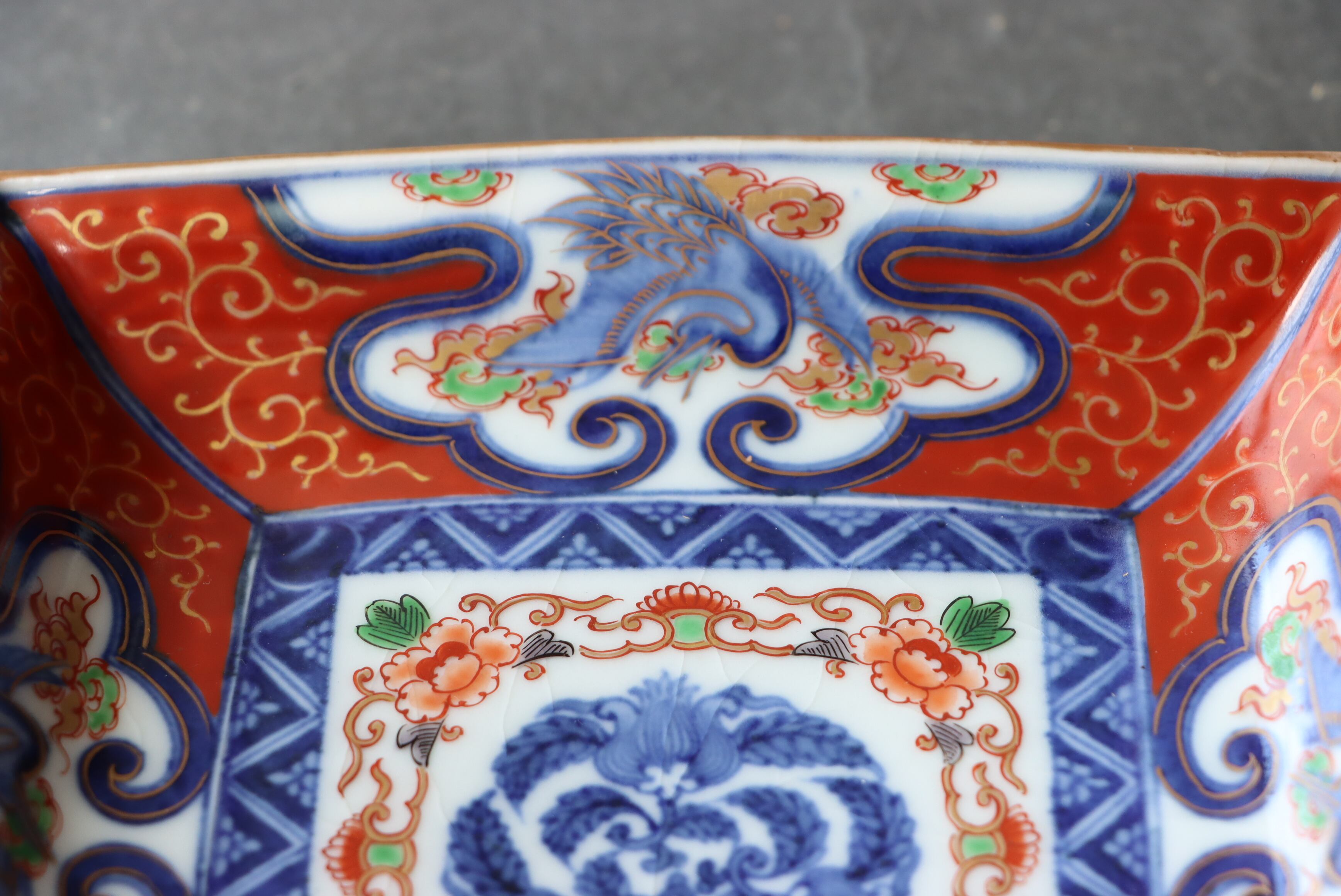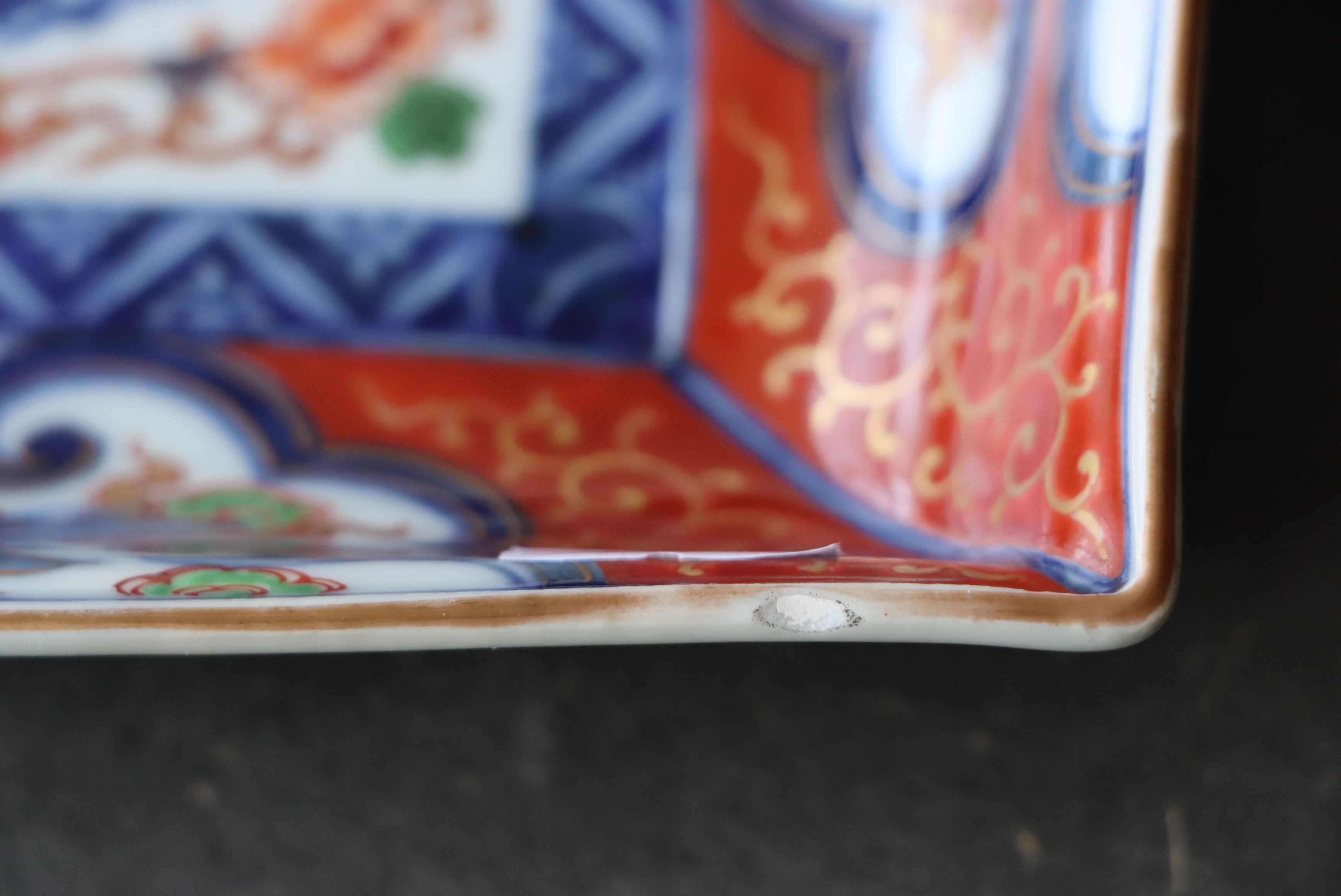 カケ(約1センチ)あり。その他、甘手(焼成が不十分なために、器の表面全体に貫入が入ってしまったこと。窯出しの時に、急激に温度が下がると素地と釉薬との収縮率の違いから、起こること)あり。