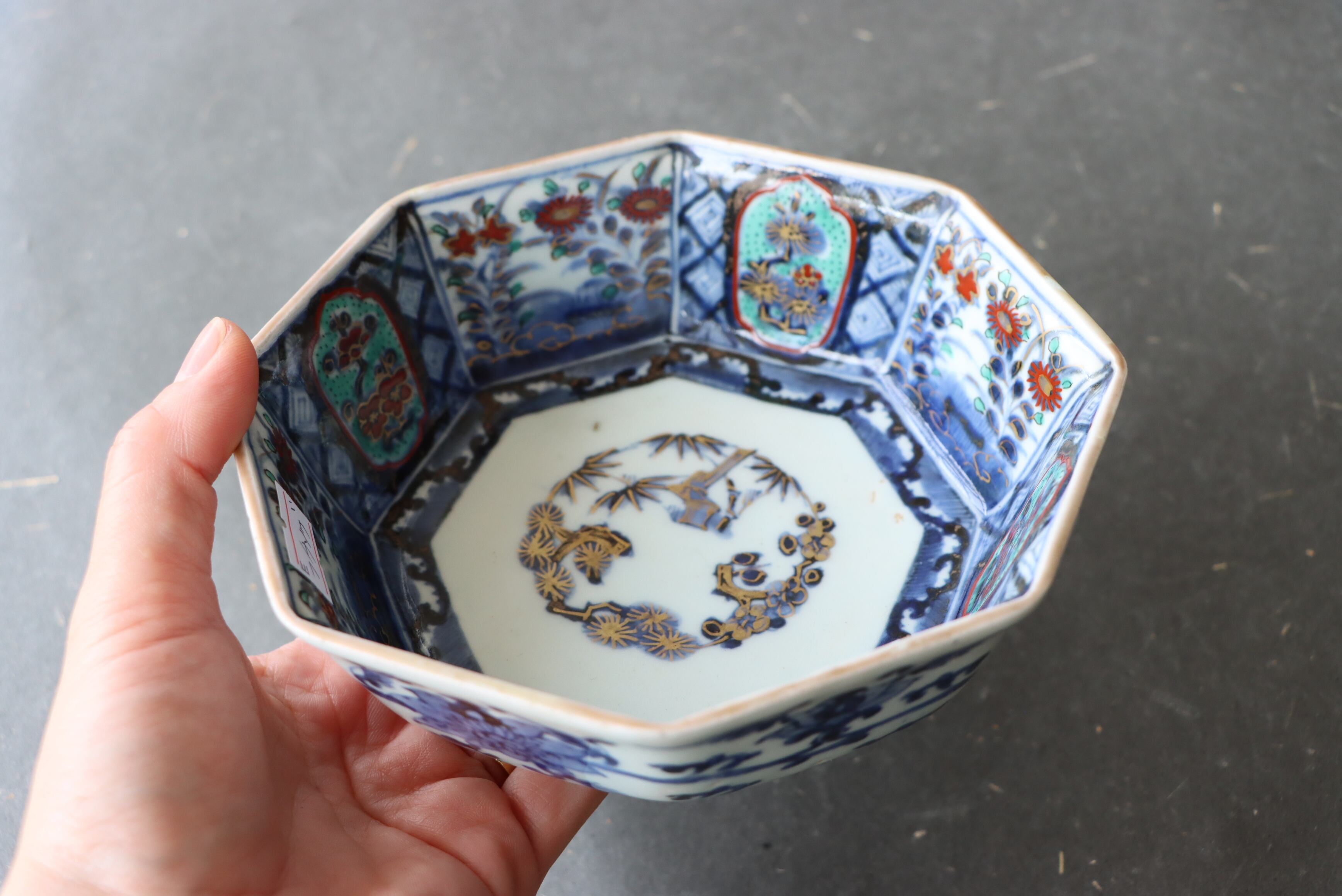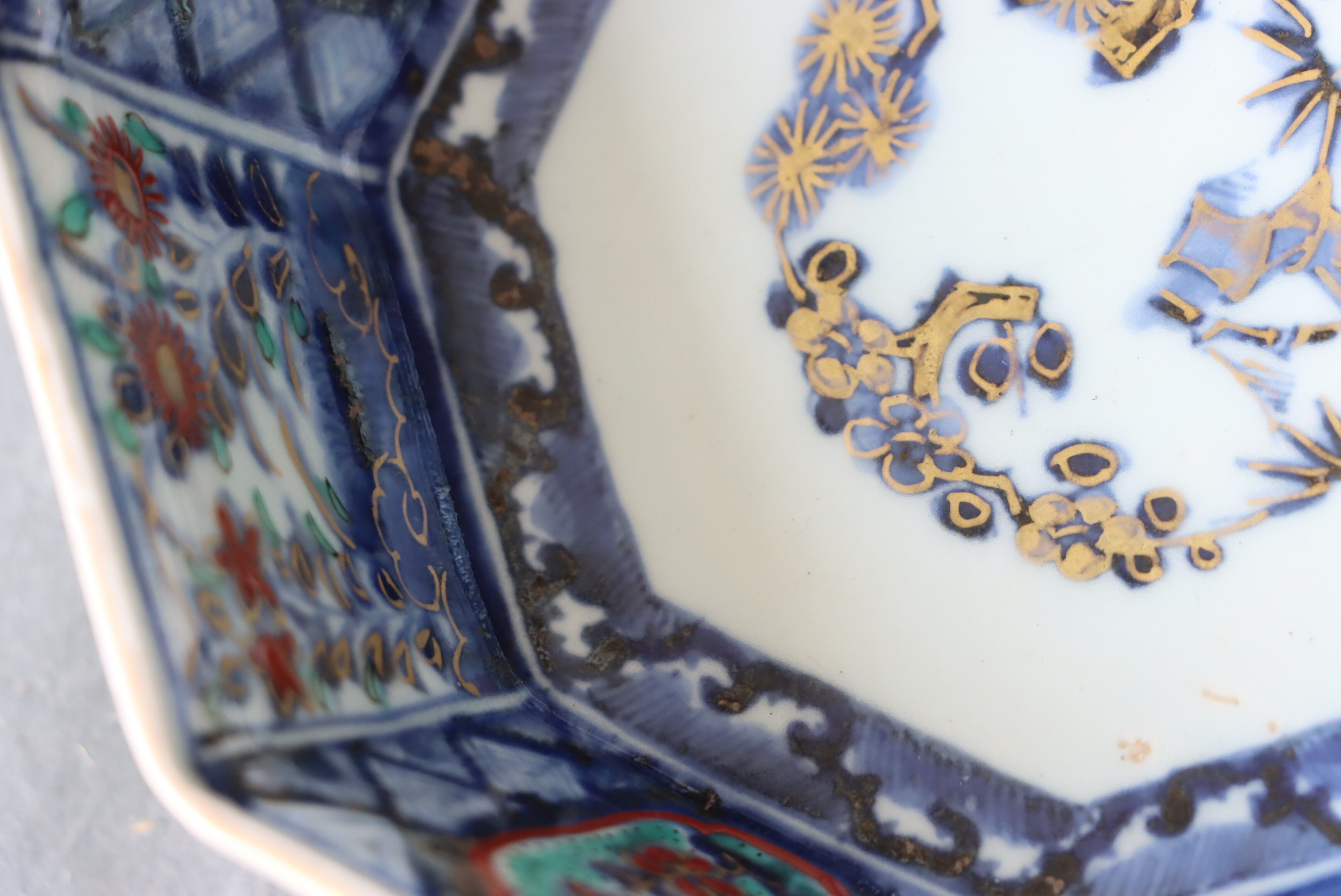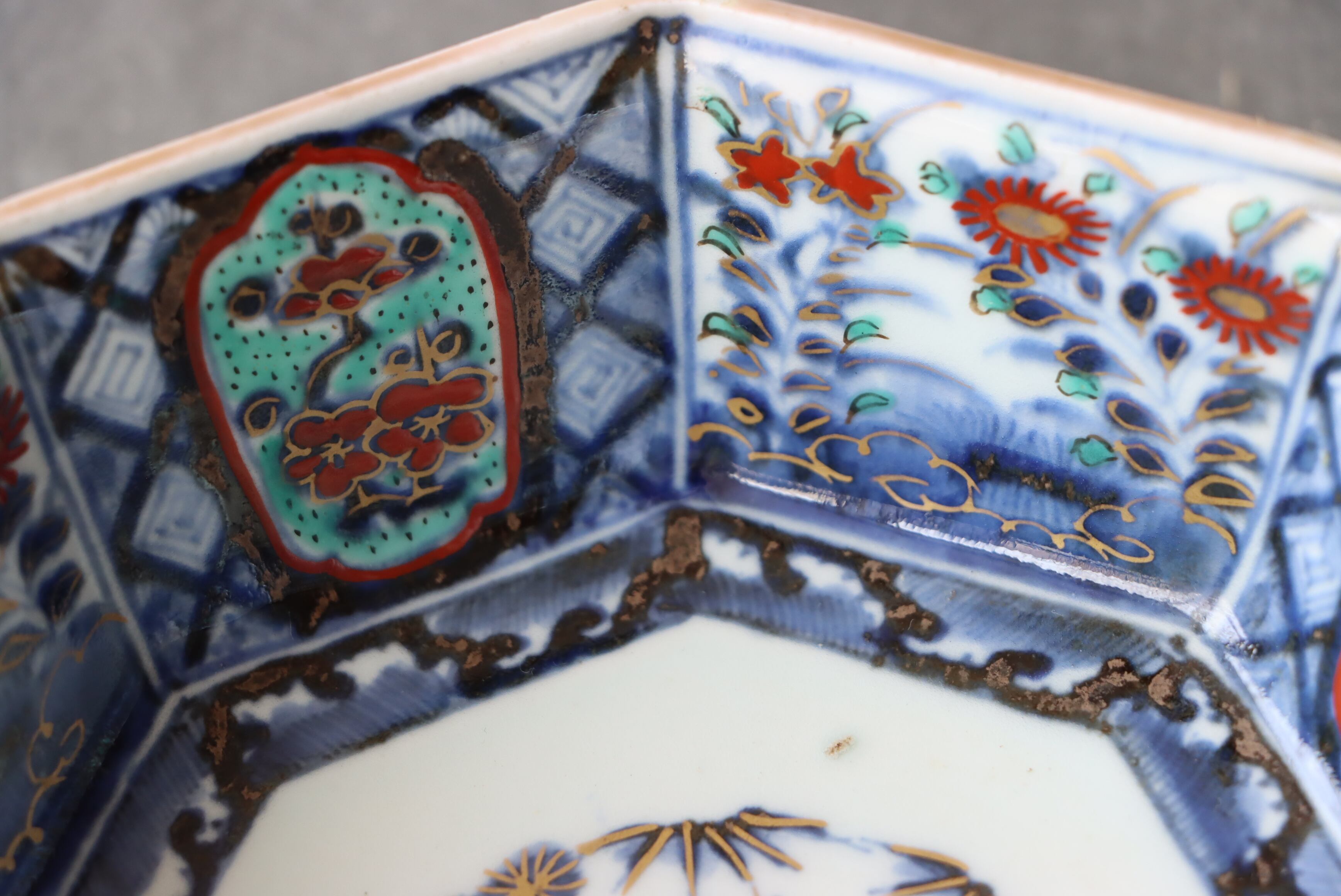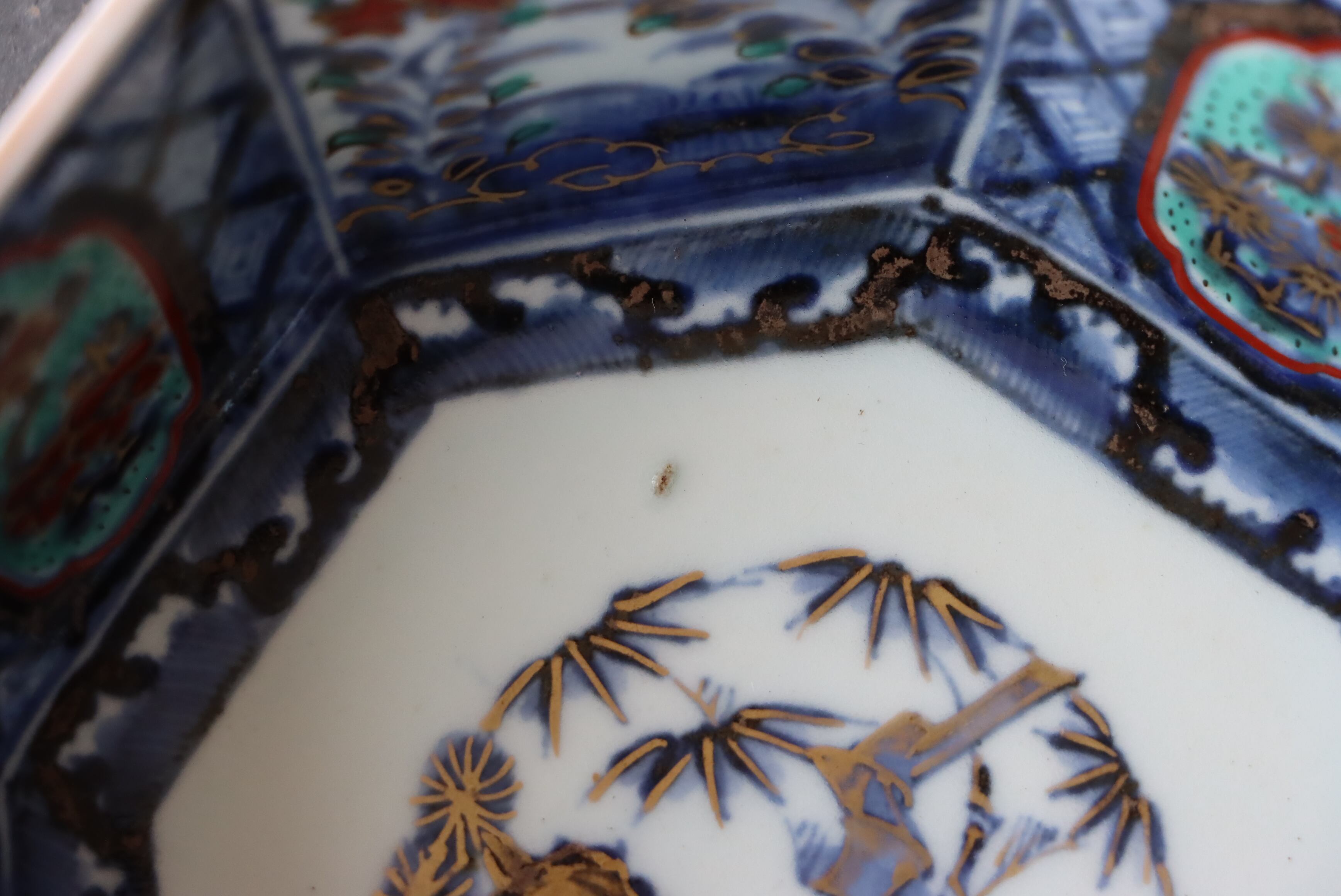 状態:フチソゲ(約0.5センチ)×2あり。また、口縁周囲に施された金彩が剥落、または薄くなっている箇所がございます。普段使い可能です。