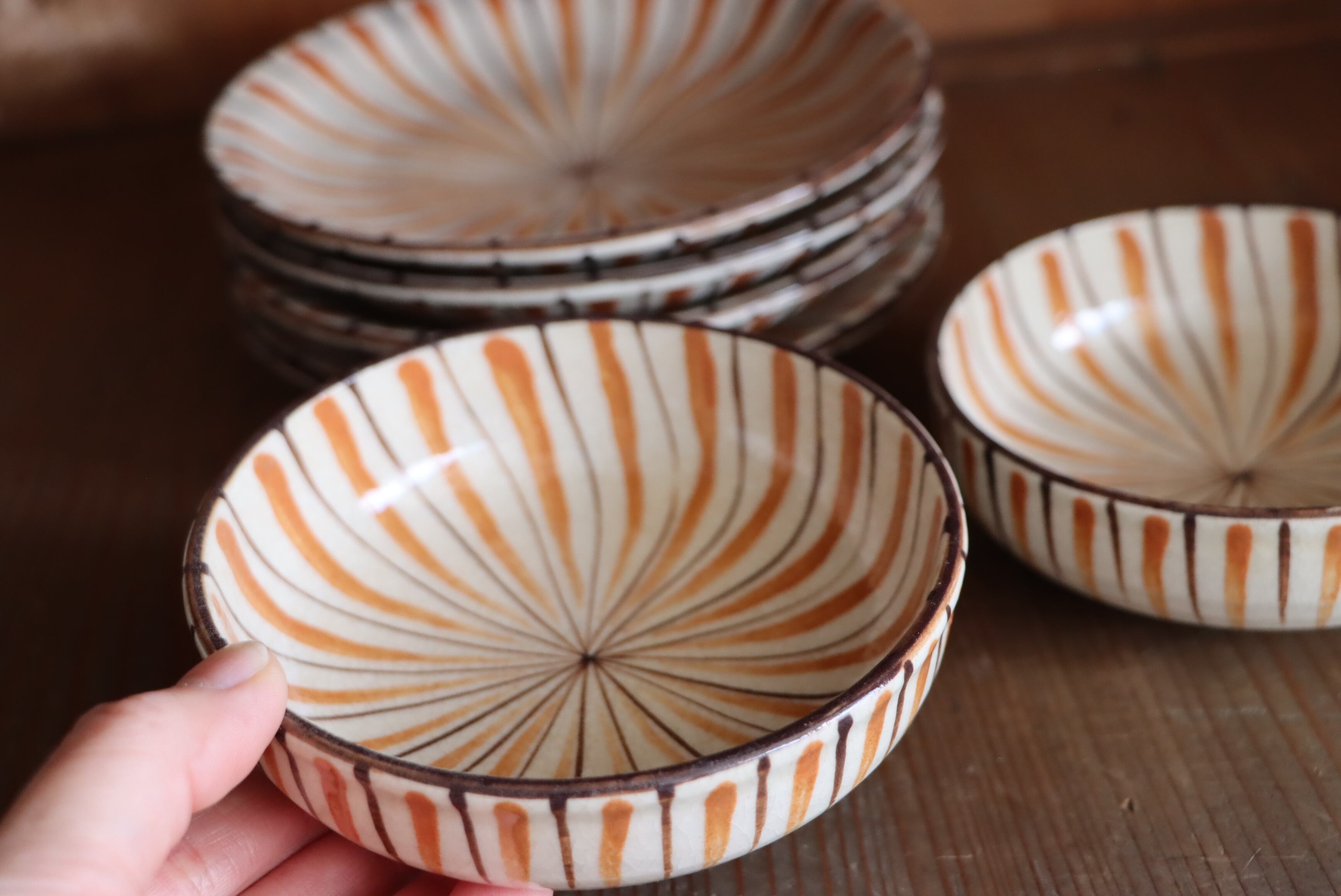 焼成時に窯の中でできる鉄分、くっつき、かまきず、ピンホール、経年による釉薬の薄れがございます。また、一枚一枚手描き、手作りですので器のサイズ(ミリ)、色味、描かれている文様の大きさなど個体差があり、ひとつとして同じものはございません。そういった時代感、個性をご理解いただき、楽しんでくだされば幸いです。電子レンジや食器洗い乾燥機のご使用はお控えください。