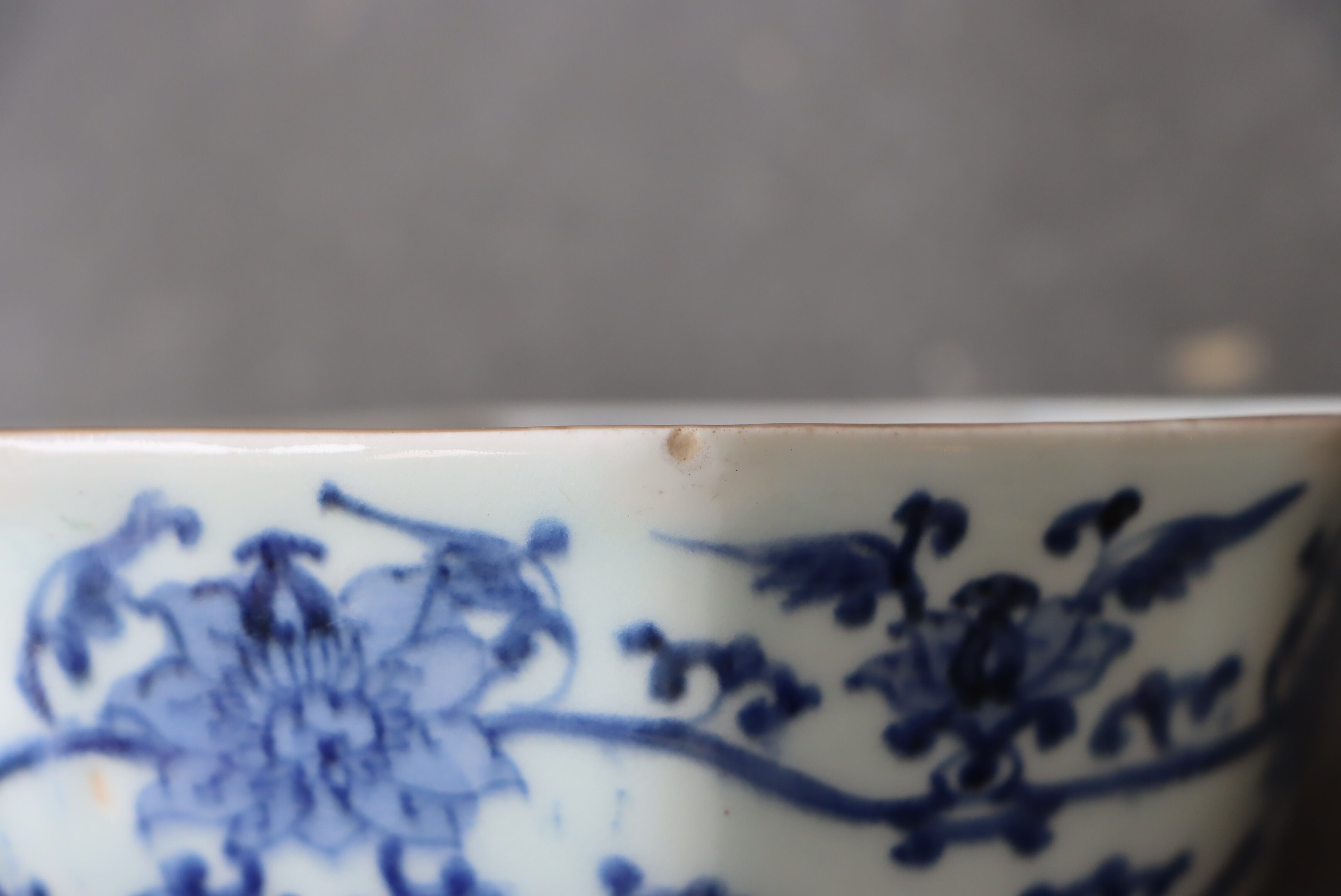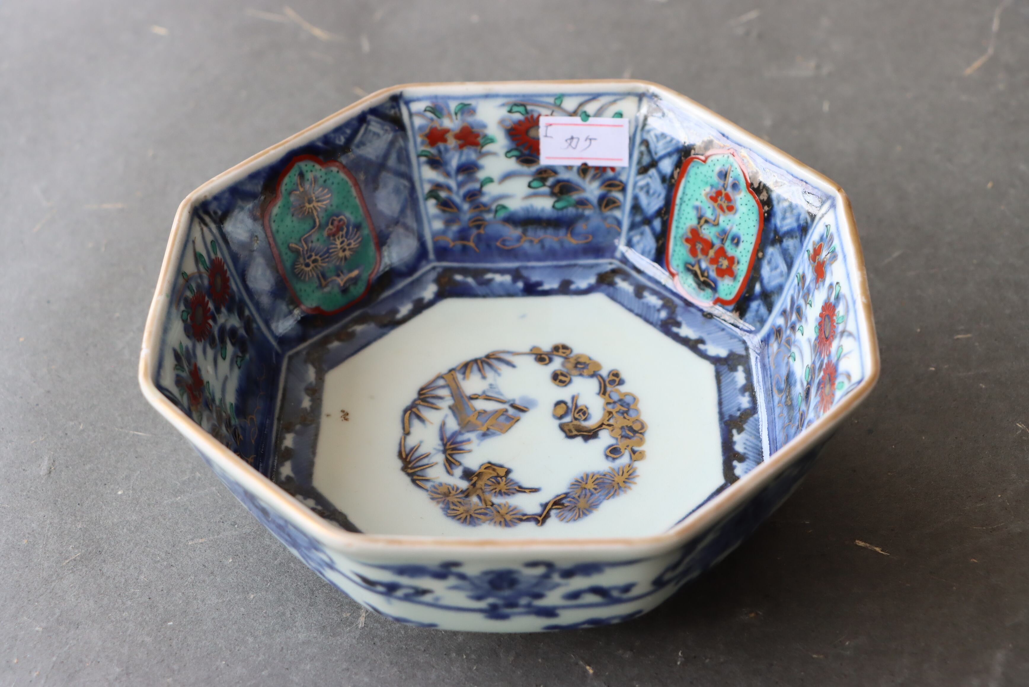 状態:カケ(約0.5センチ)、高台のまわりに大きく貫入(約18センチ)あり。また、高台に入っているニュウに見えるものは かまきず になります。その他、口縁周囲に施された金彩が剥落、または薄くなっている箇所がございます。