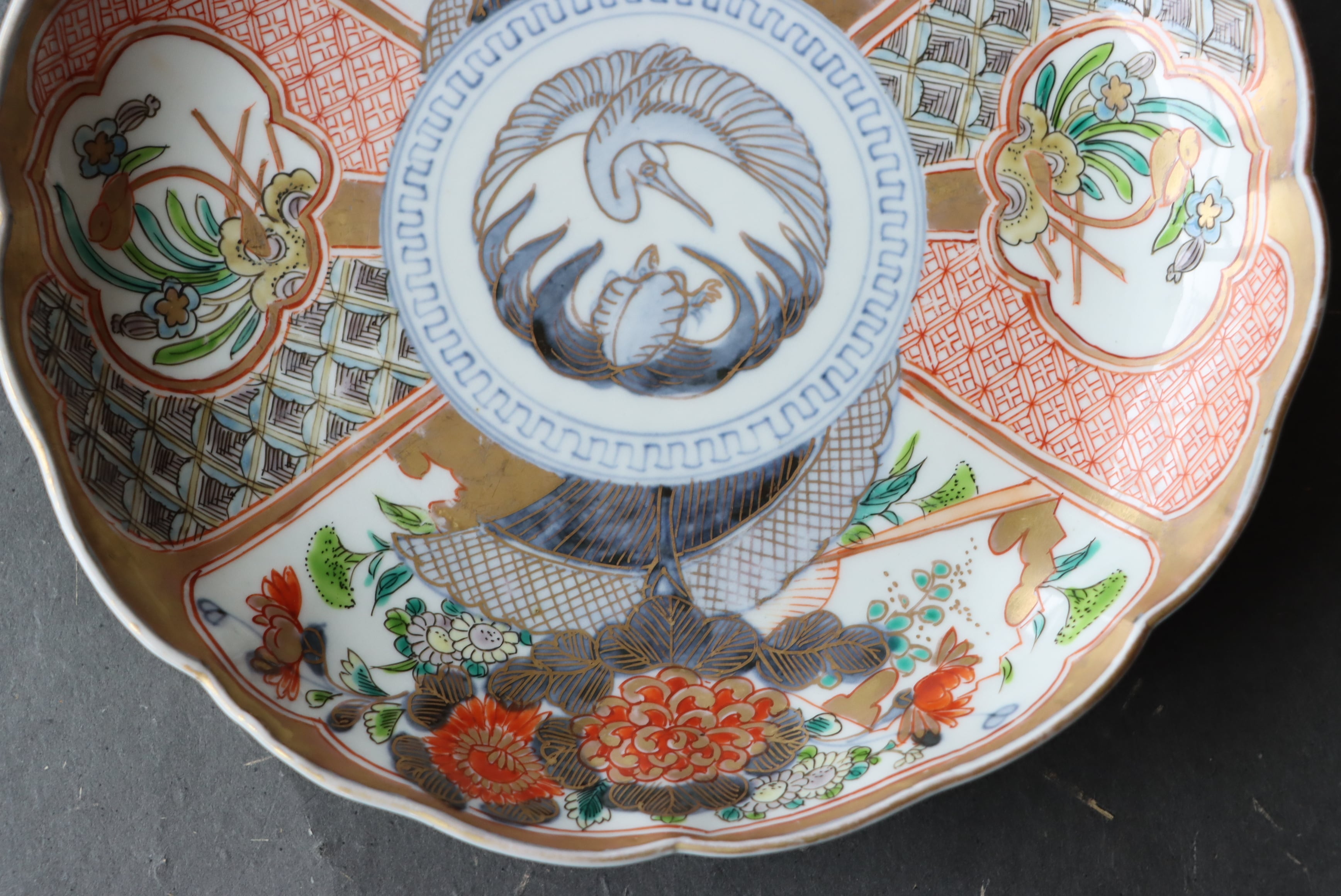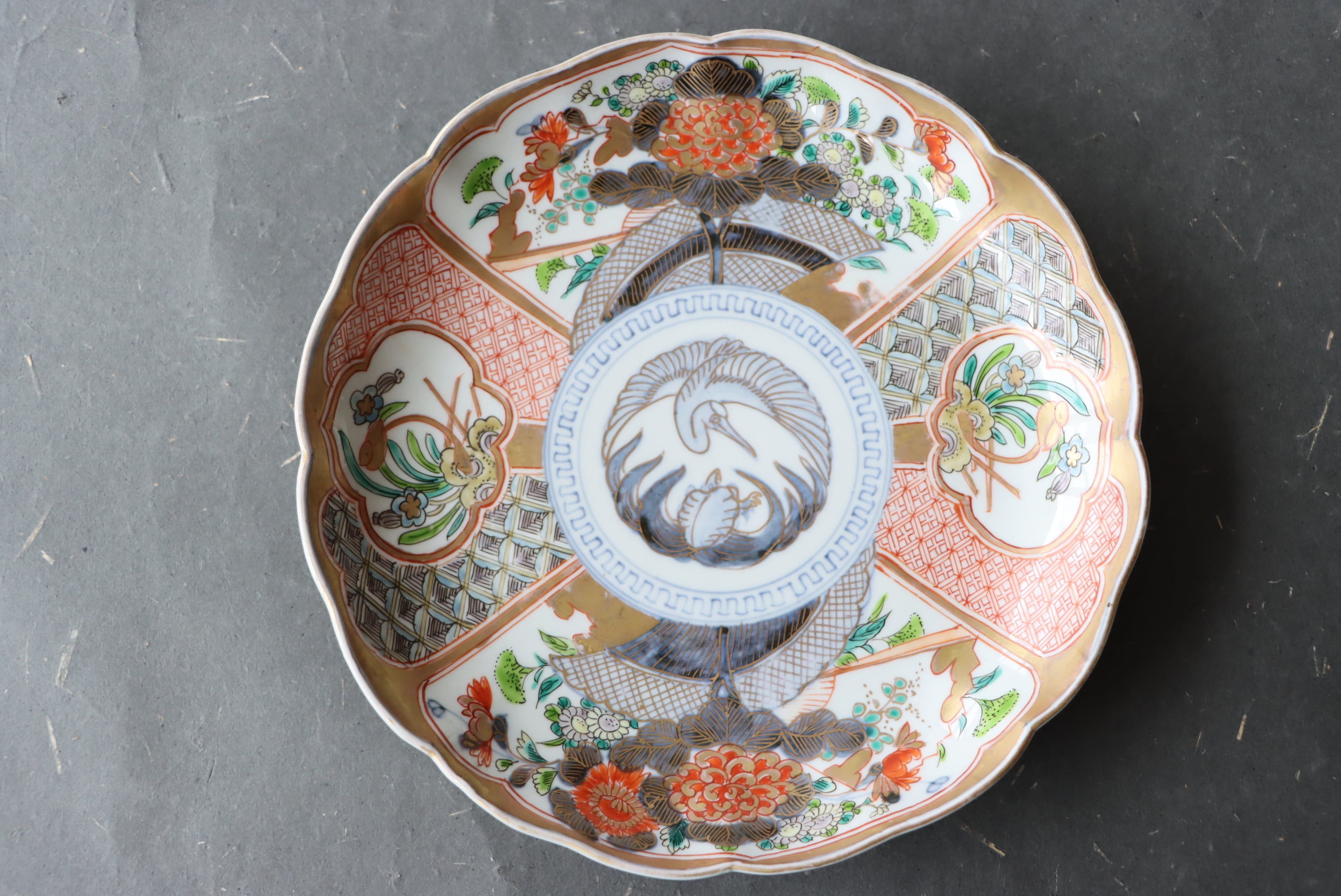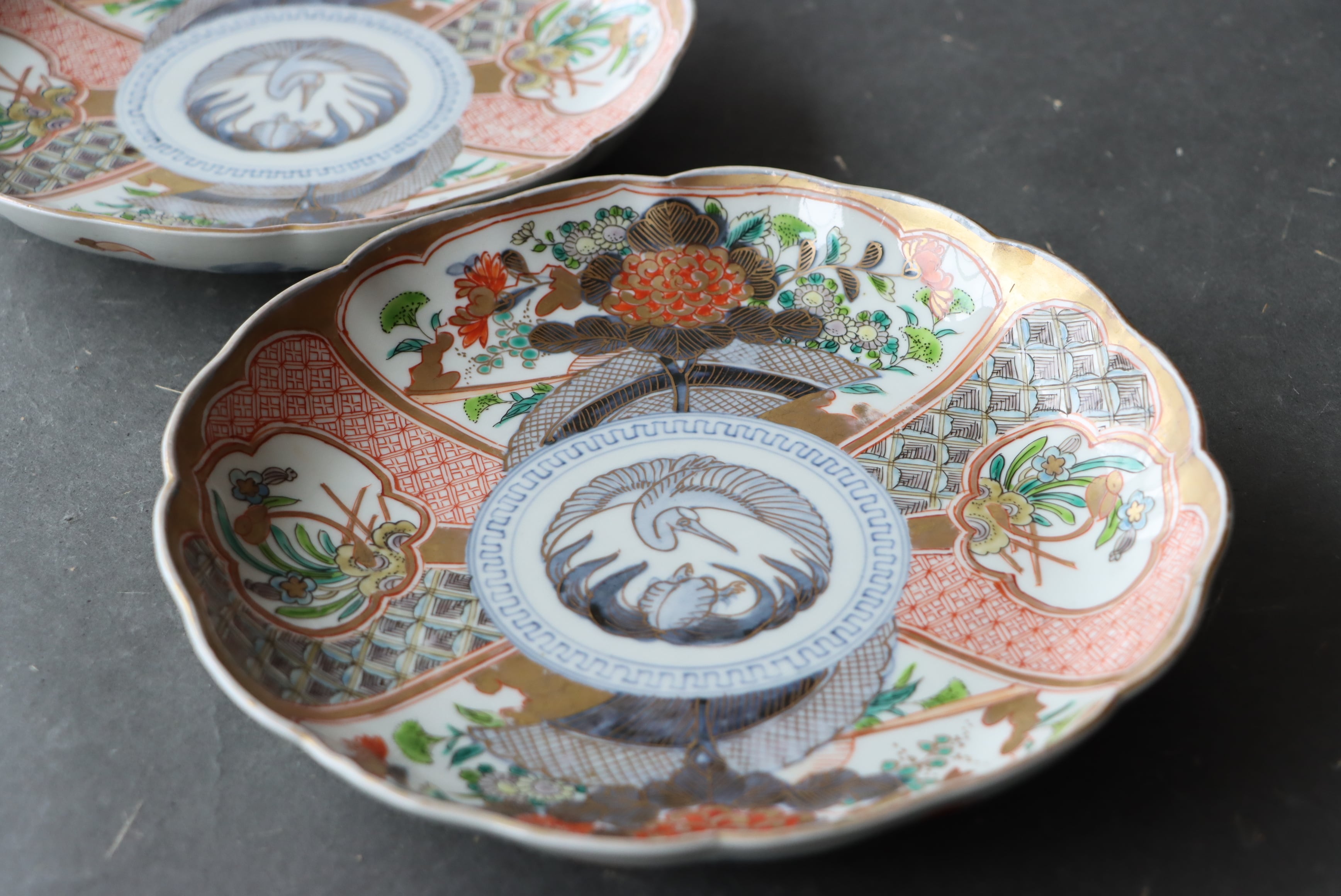 【Imari medium size plate with crane, turtle and flower design in overglaze enamels.】