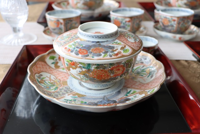中皿、膾皿2種、小皿、蓋茶碗2種、湯呑、猪口ー