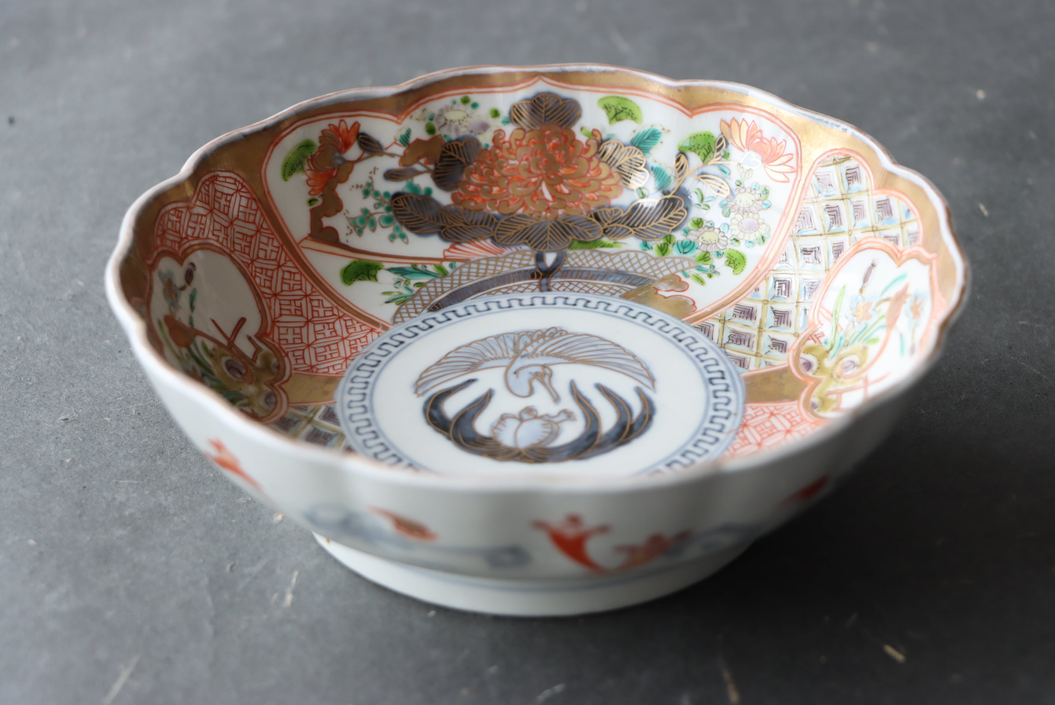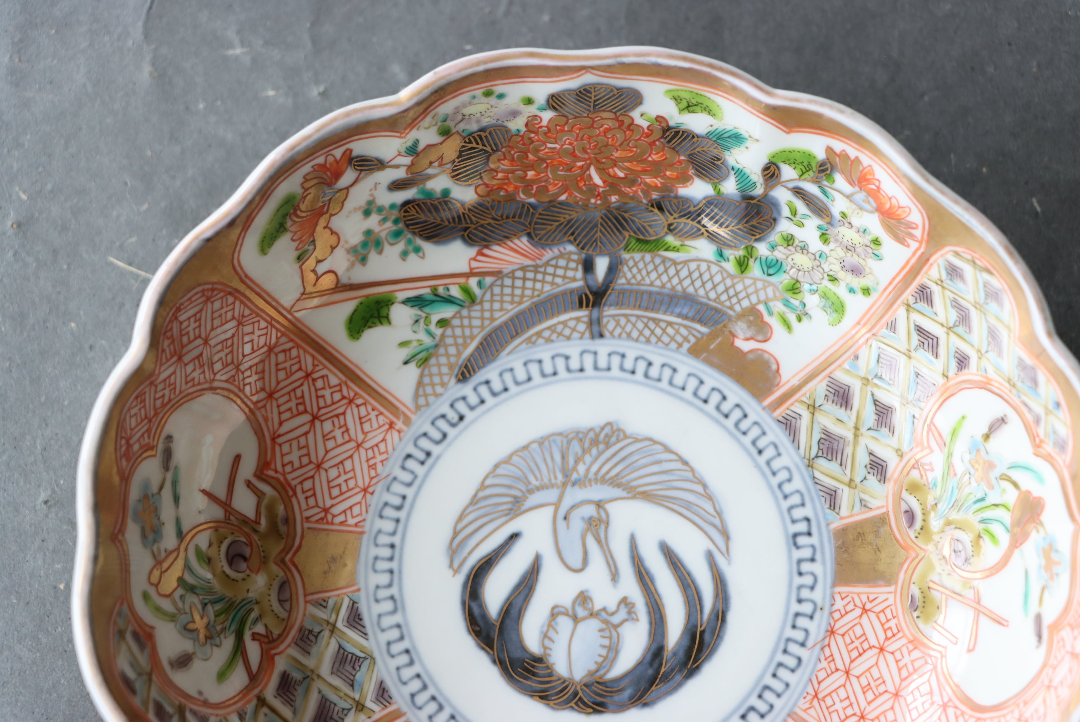 【Imari large size "Namasu" bowl with crane, turtle and flower design in overglaze enamels.】
