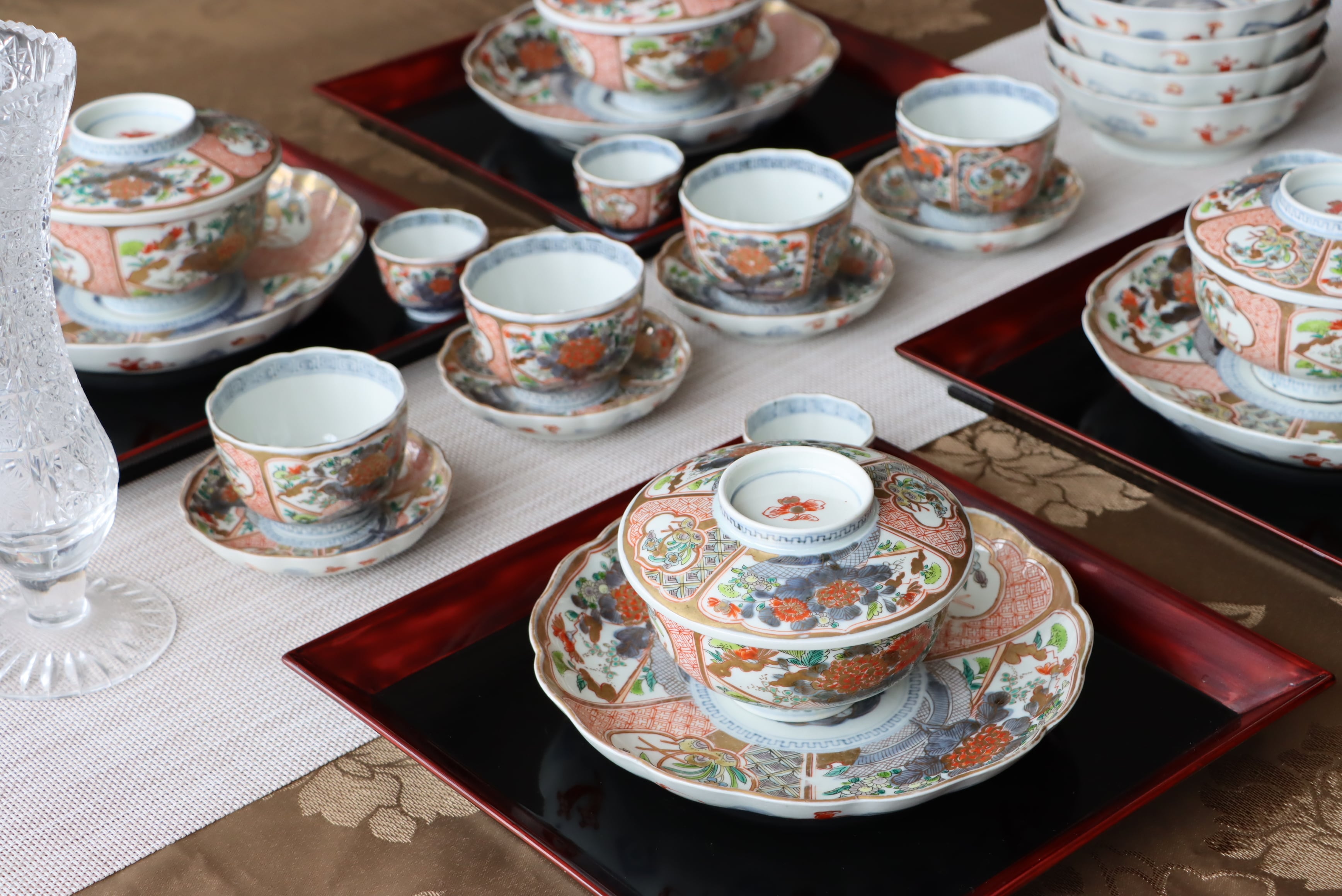 中皿、膾皿2種、小皿、蓋茶碗2種、湯呑、猪口ー