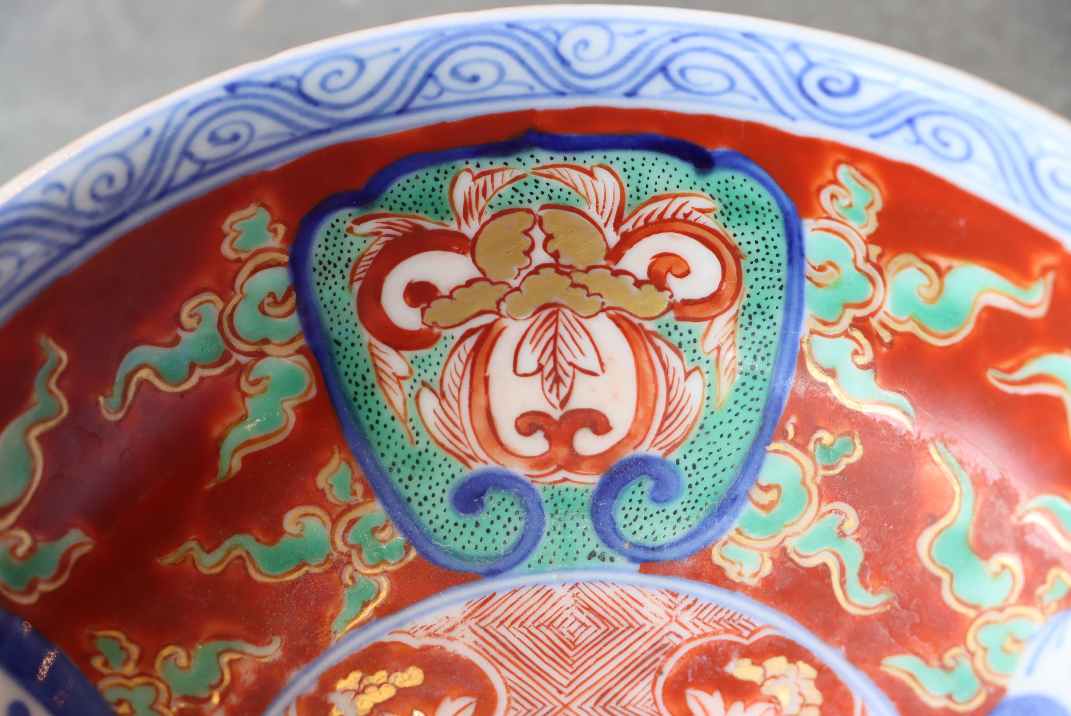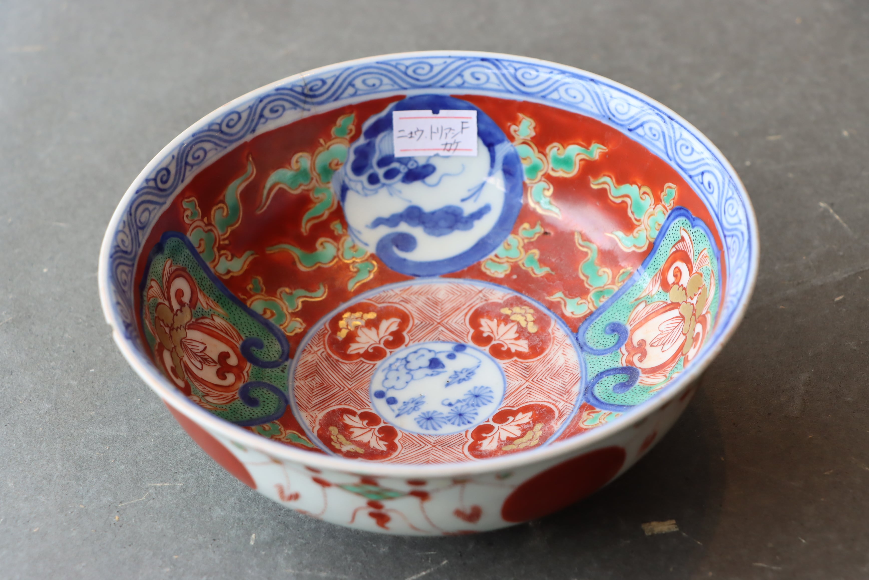 状態:カケ(約1センチ)、ニュウ複数(最大約4センチ)、とりあし (最大約5センチ)あり。見込みから胴かけての広範囲に白っぽくなっている部分があります。口縁に施された金彩が一部剥離、及び、薄くなっている箇所があります。お写真にて状態をご確認ください。