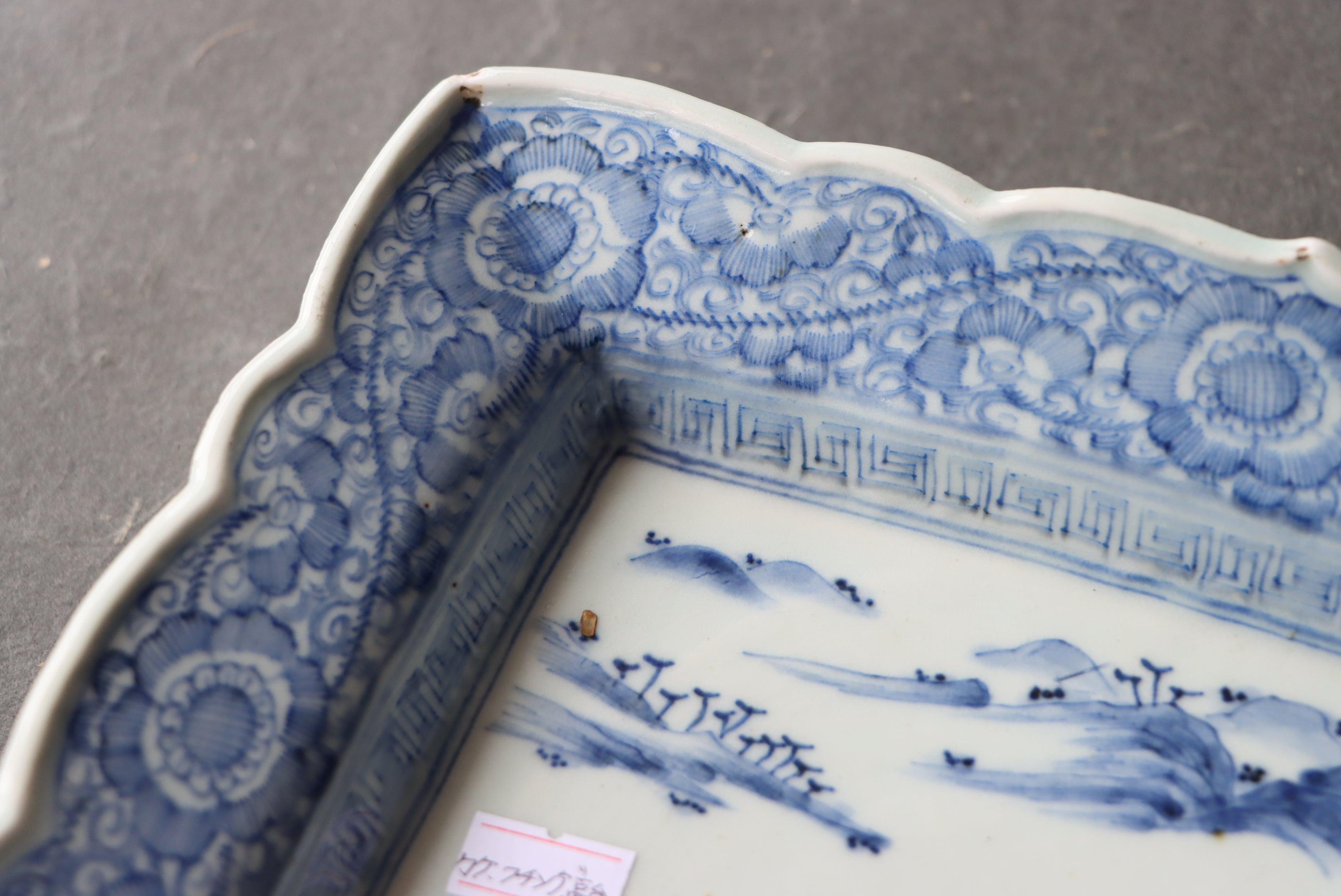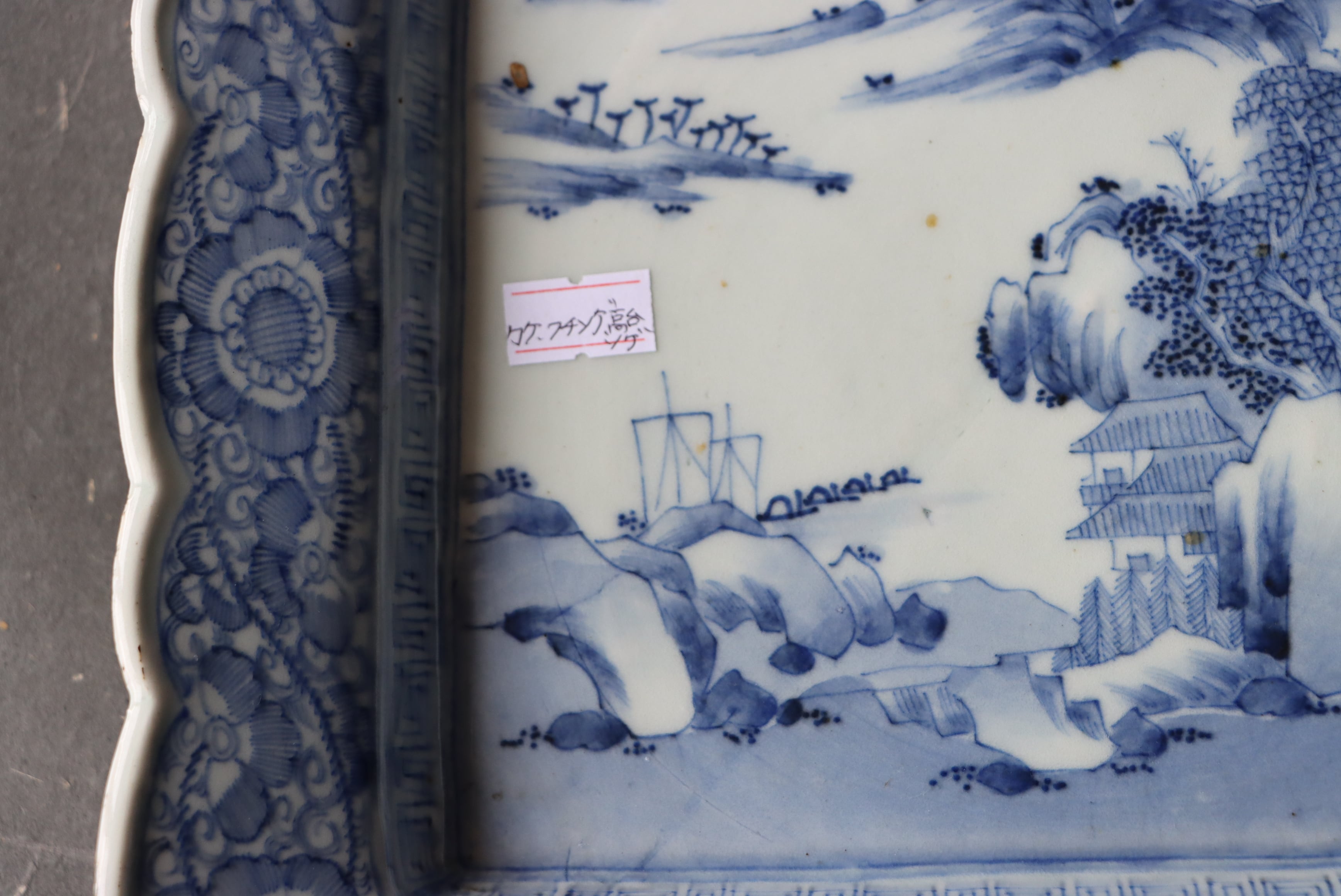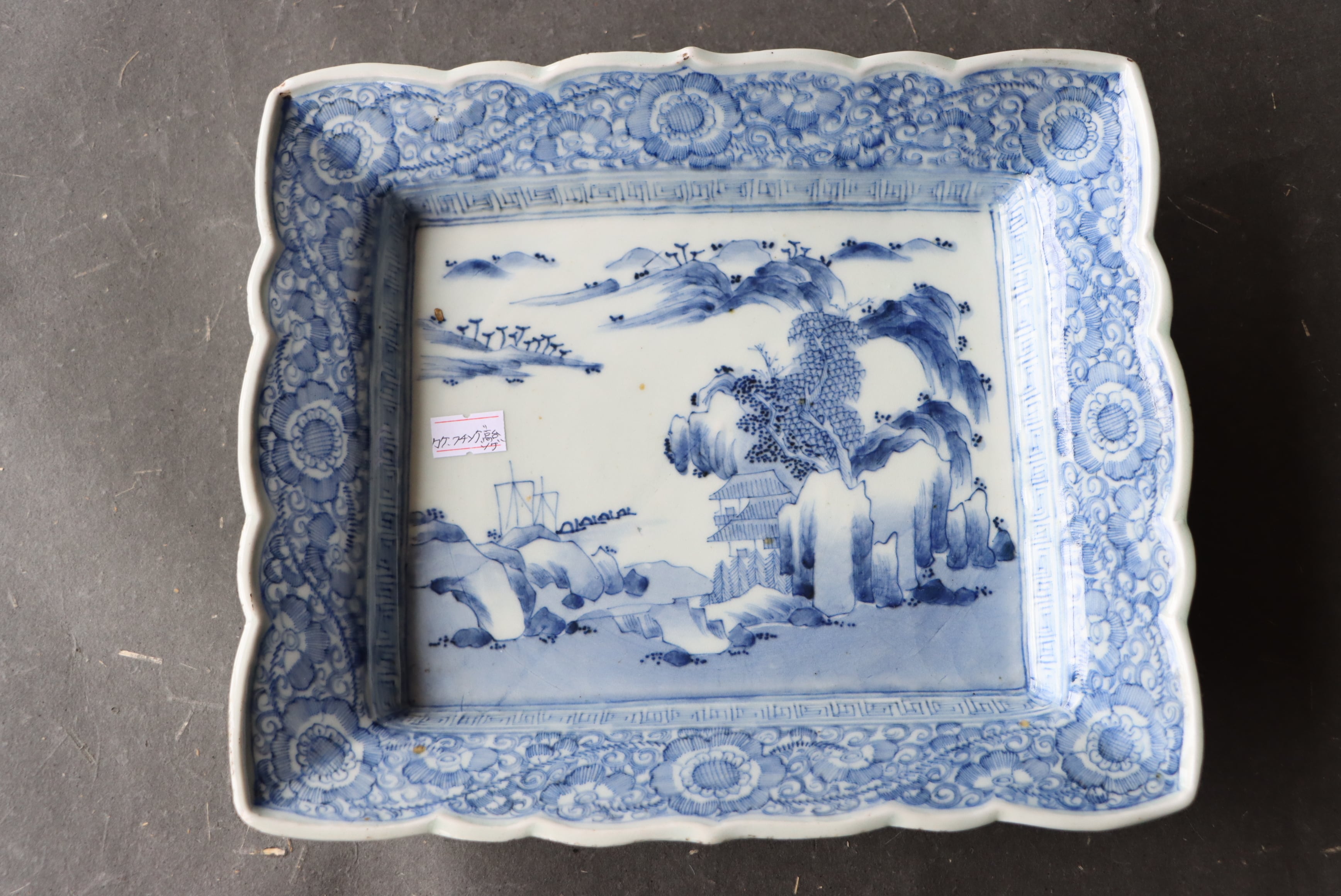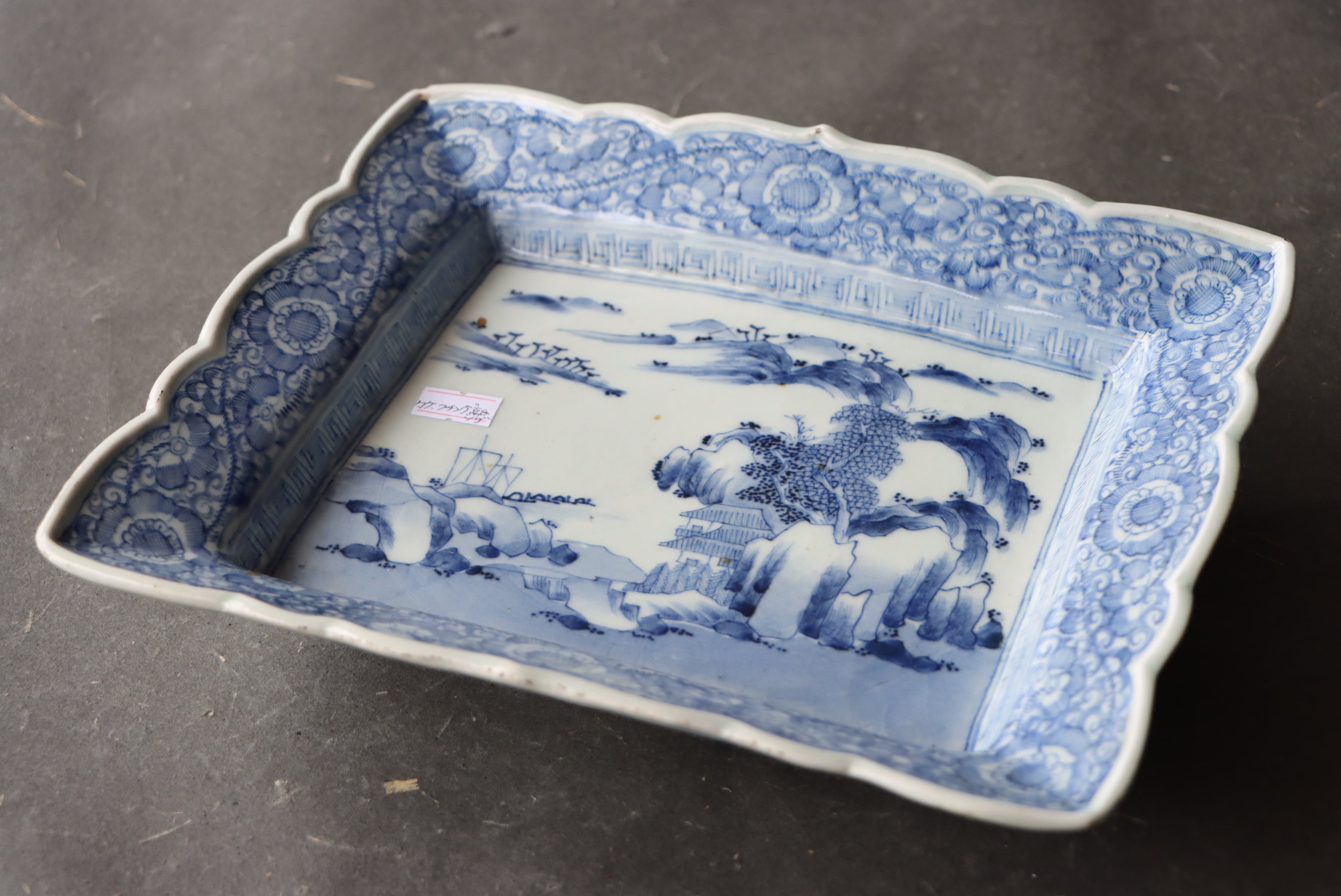 カケ フチソゲ 高台ソゲ 伊万里焼 染付 線描楼閣山水文 長方形 中皿 アウトレット