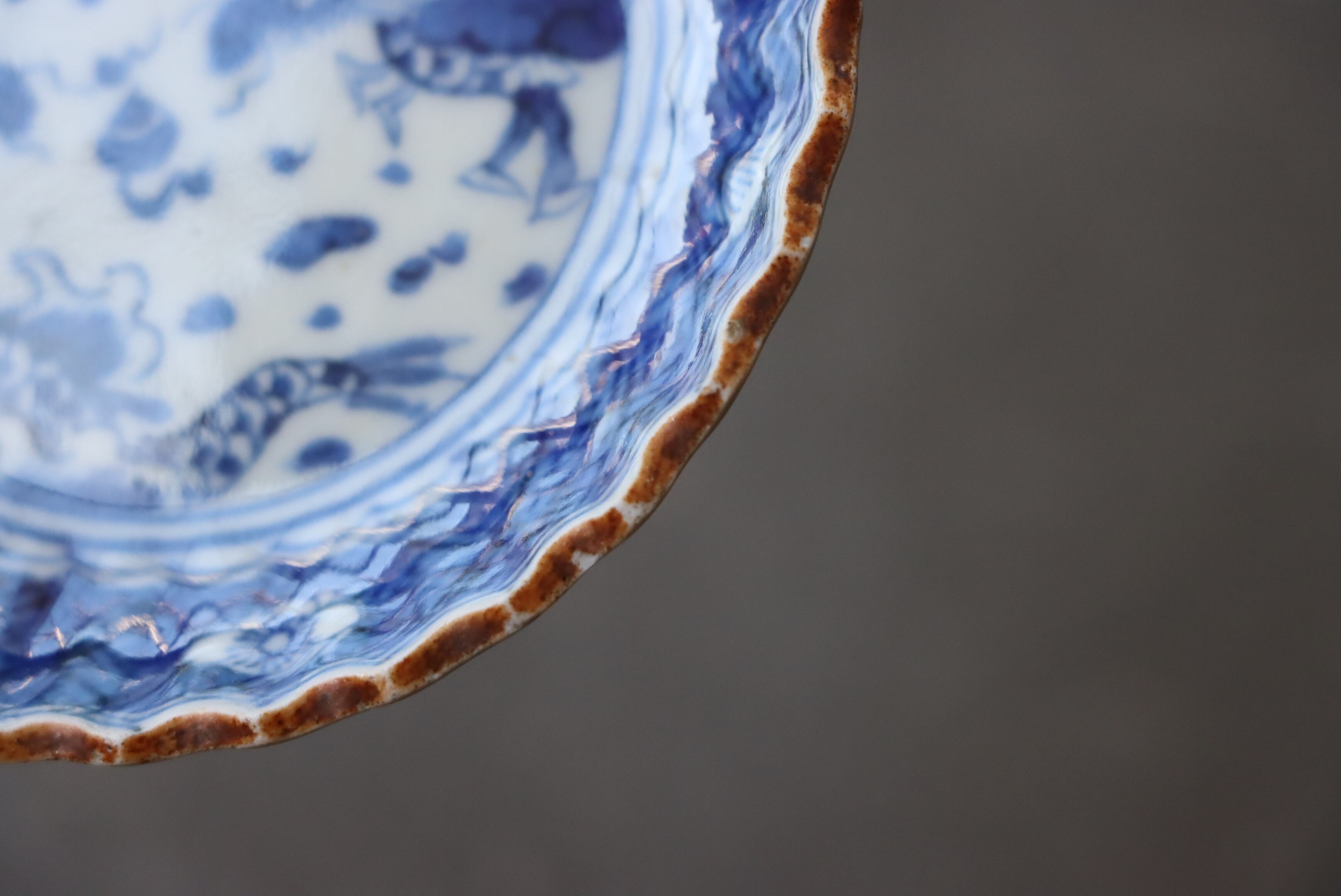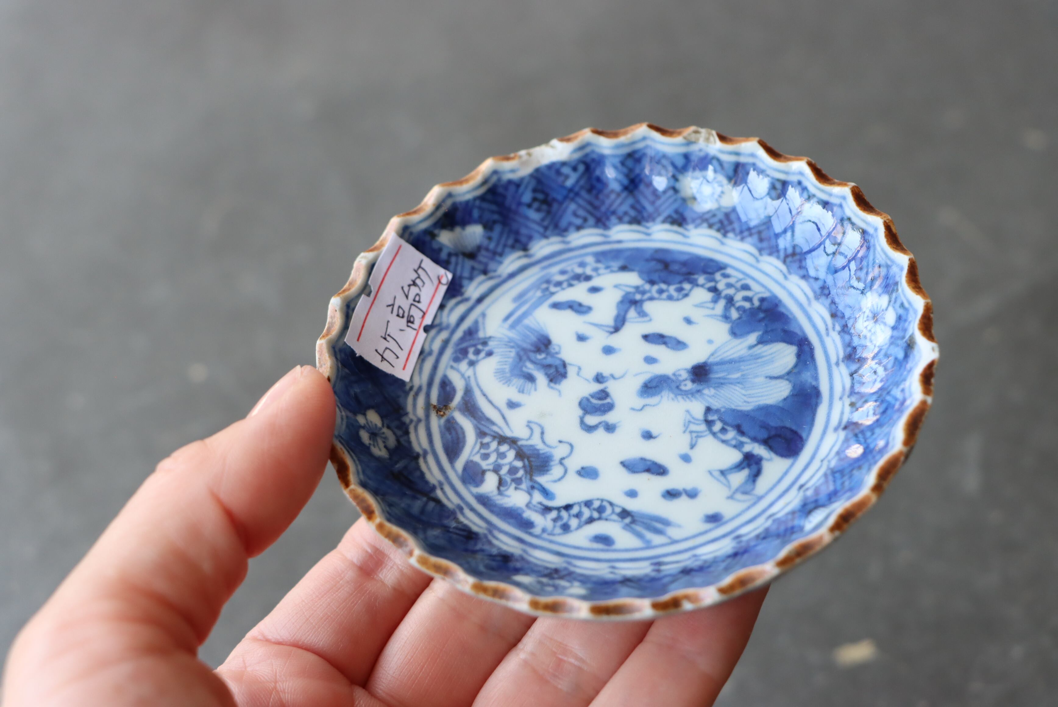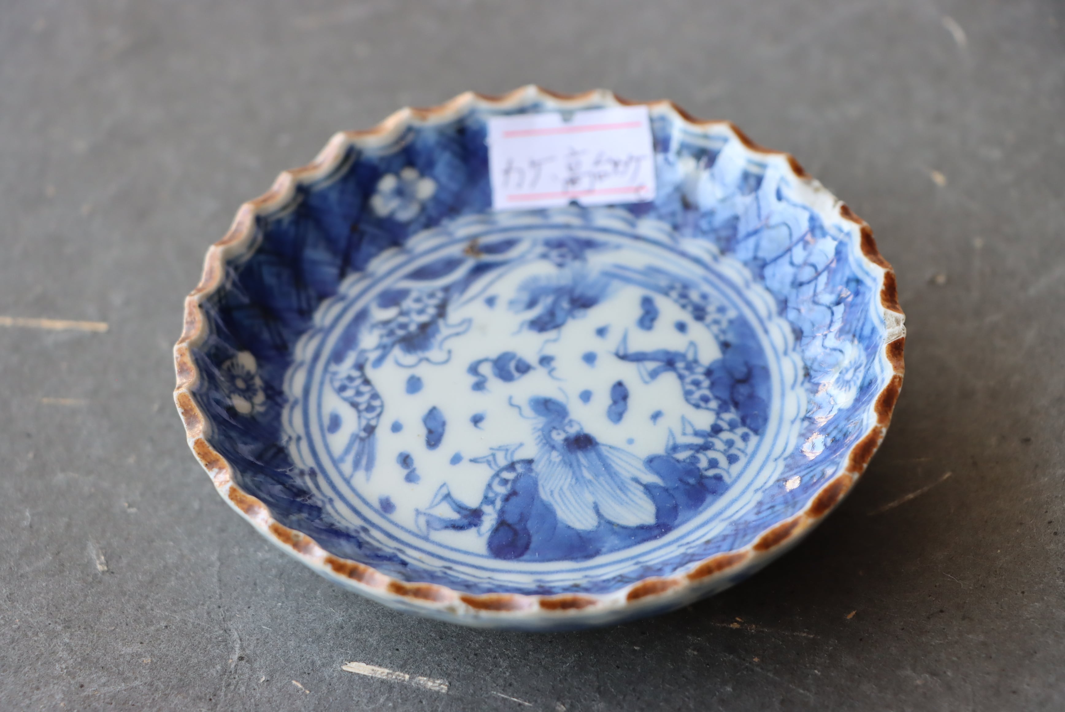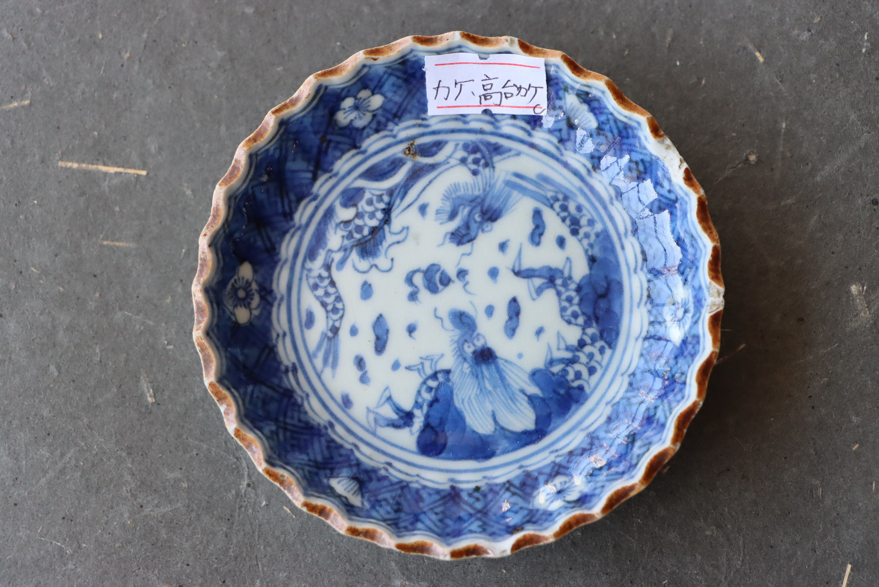 カケ フチソゲ 高台カケ 伊万里焼 染付 龍宝珠文 綾花 豆皿 C アウトレット