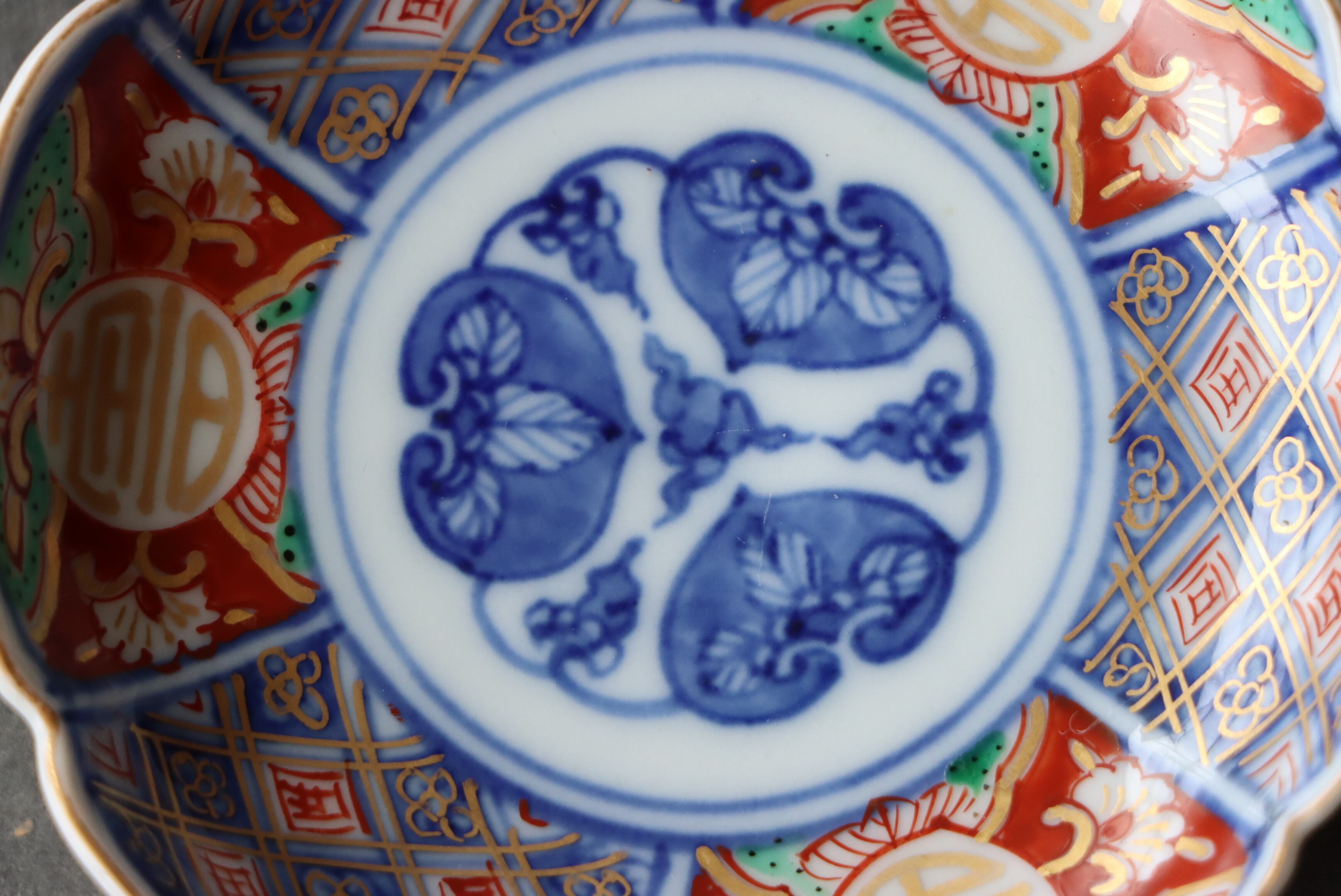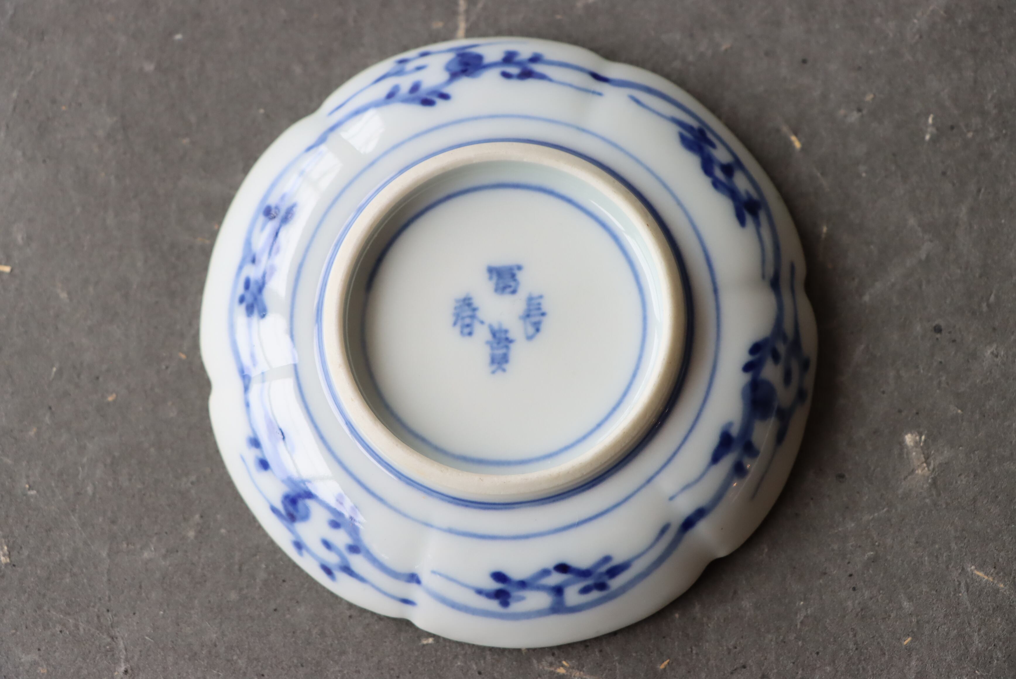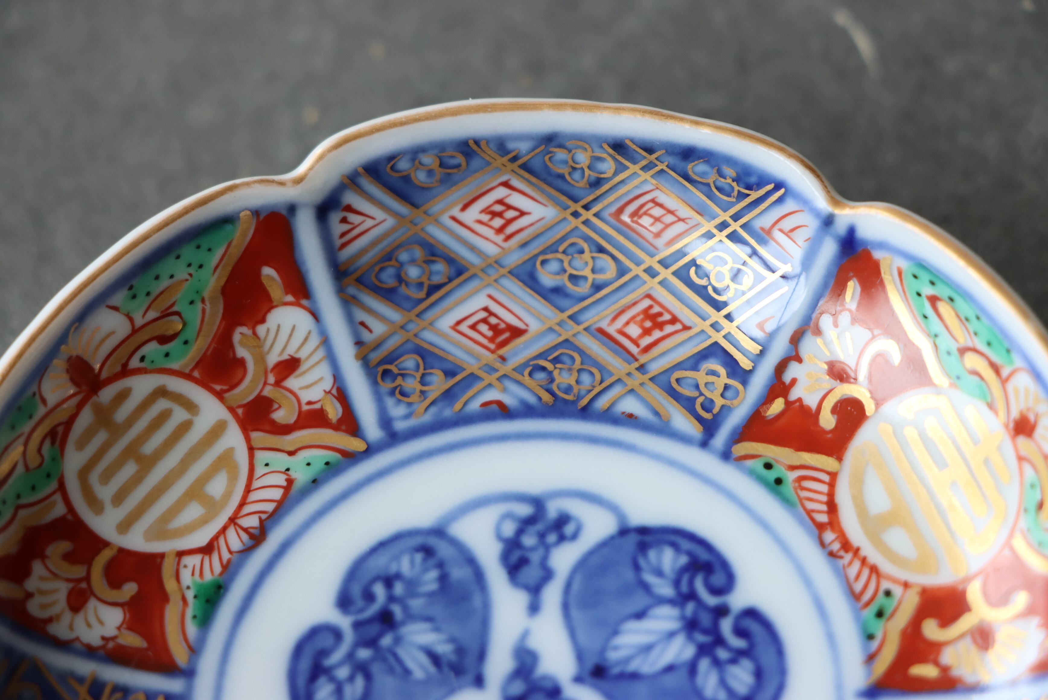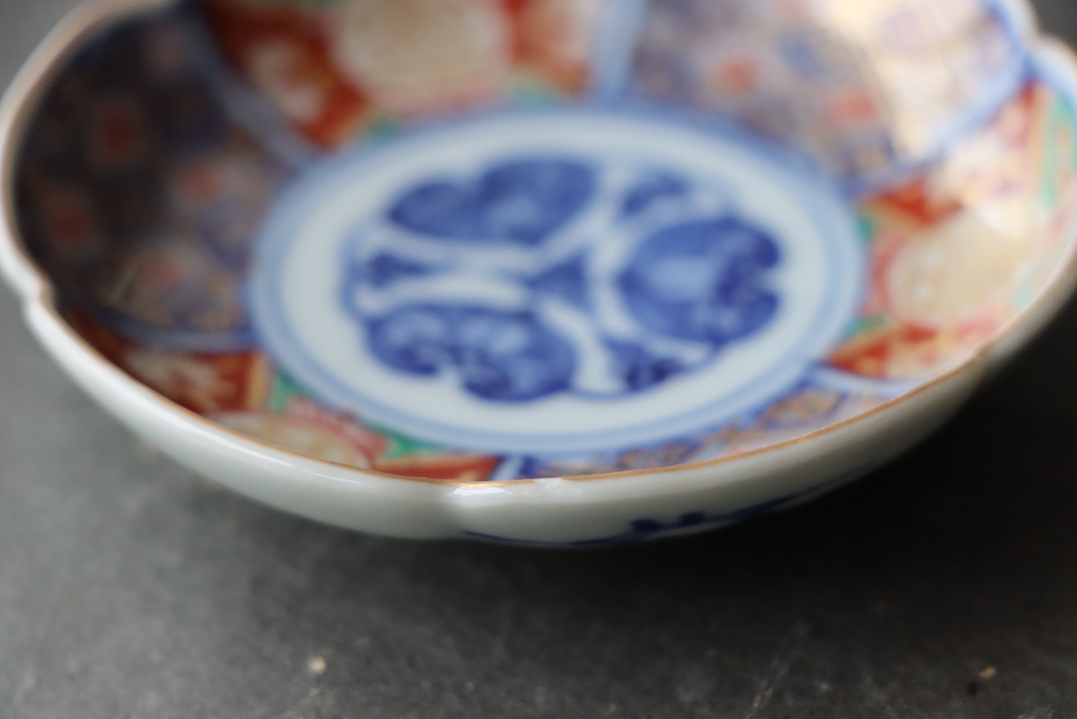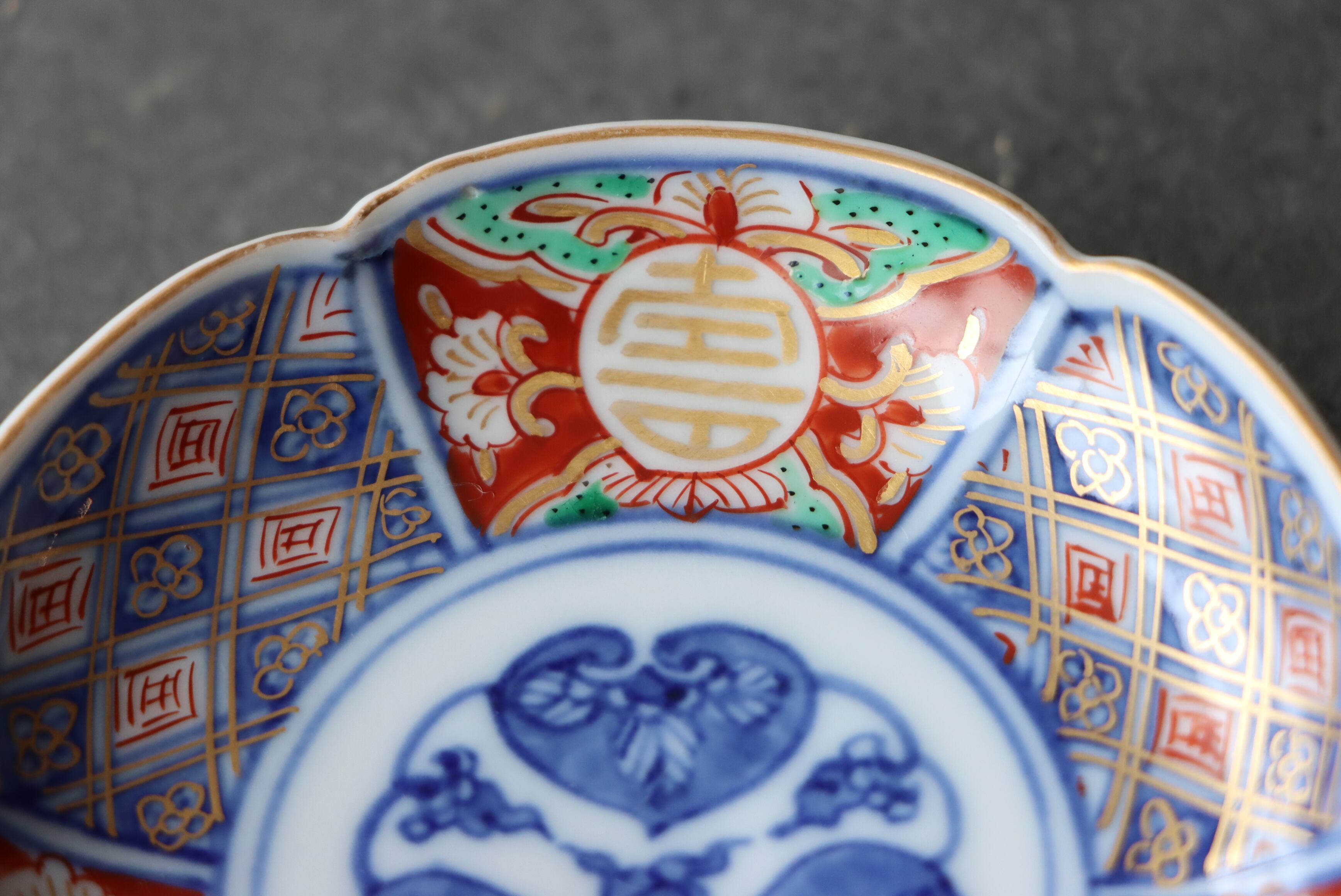 フチソゲ 大聖寺伊万里 色絵 三ツ葉葵壽花唐草文 輪花 豆皿 A アウトレット