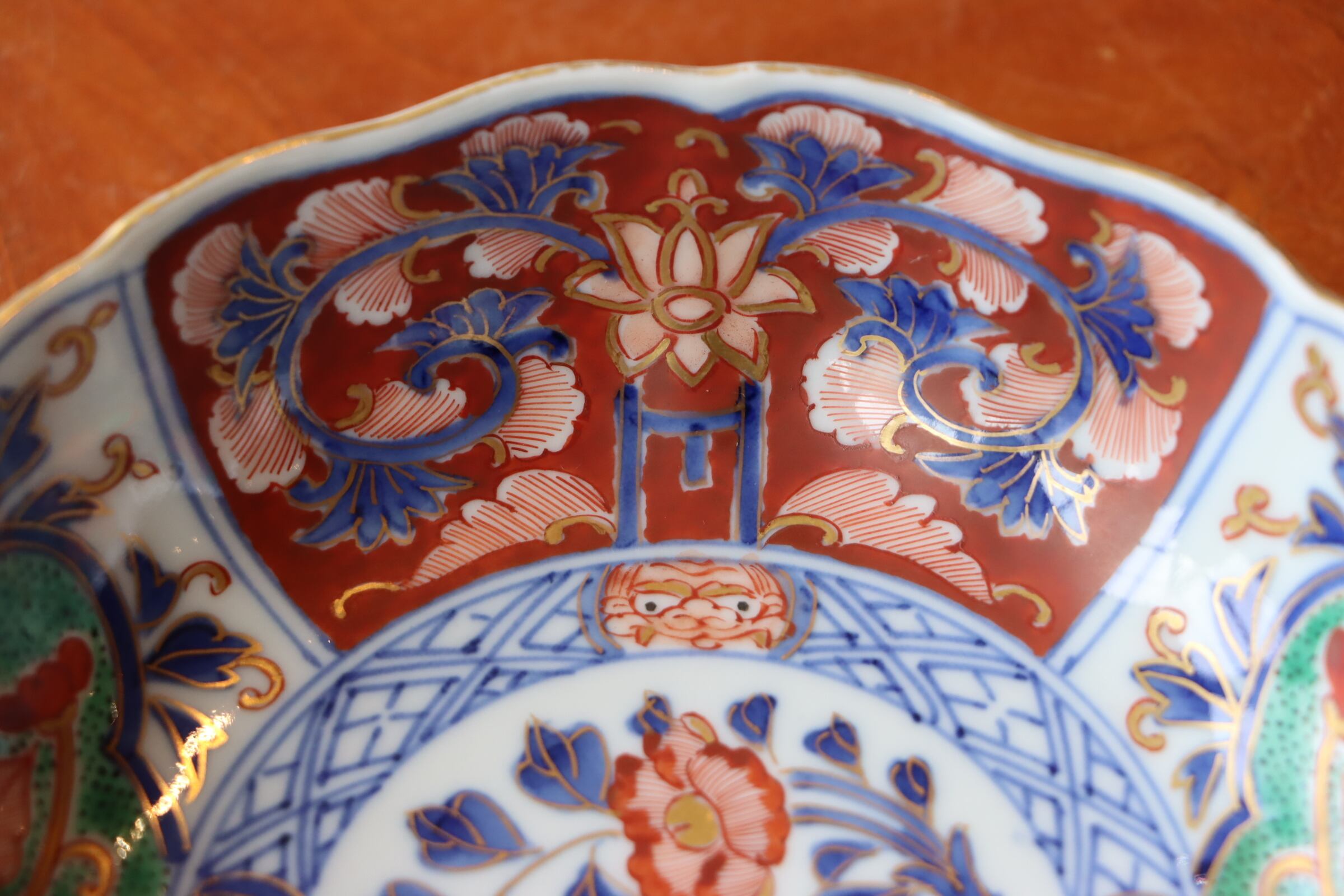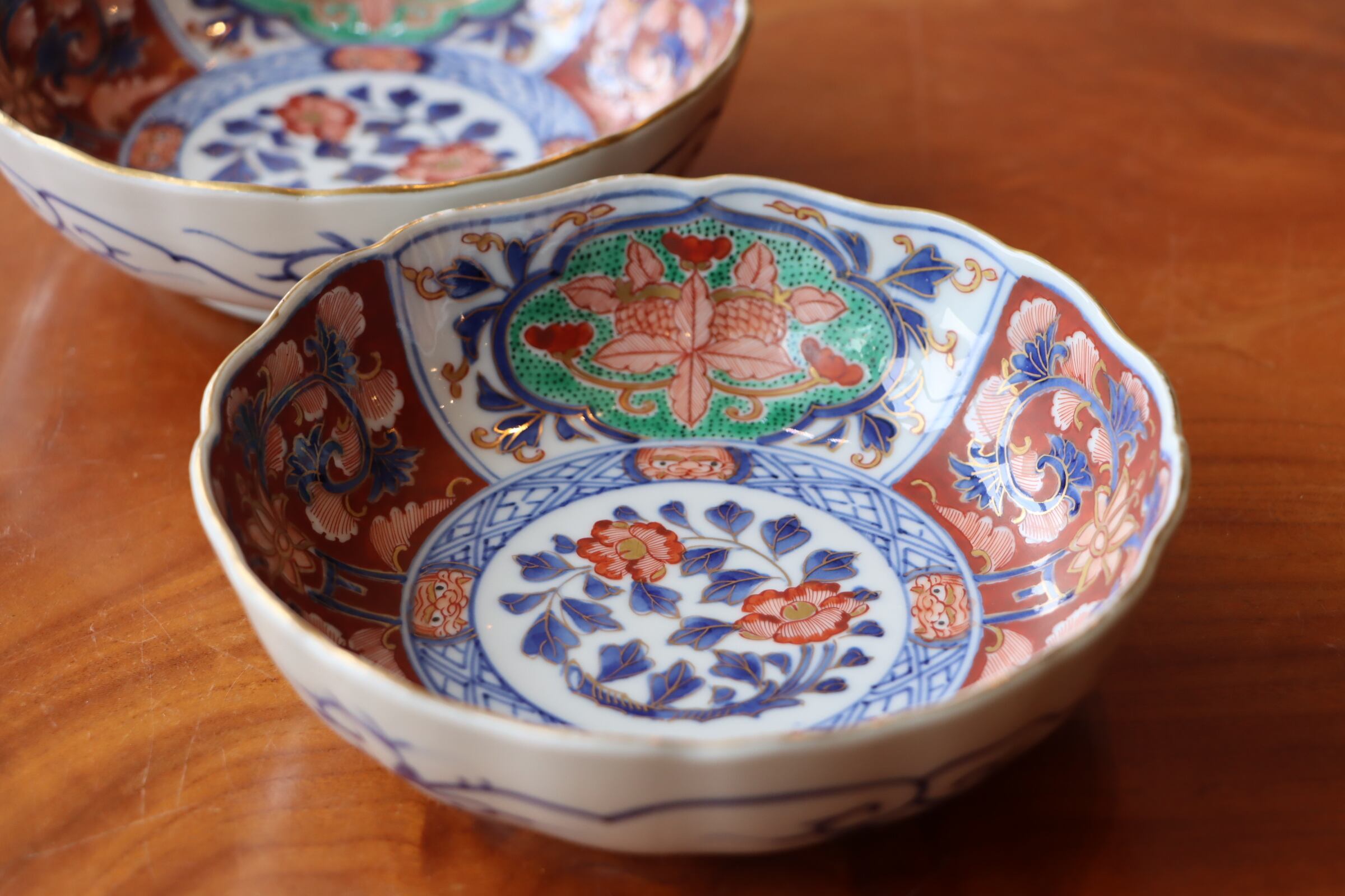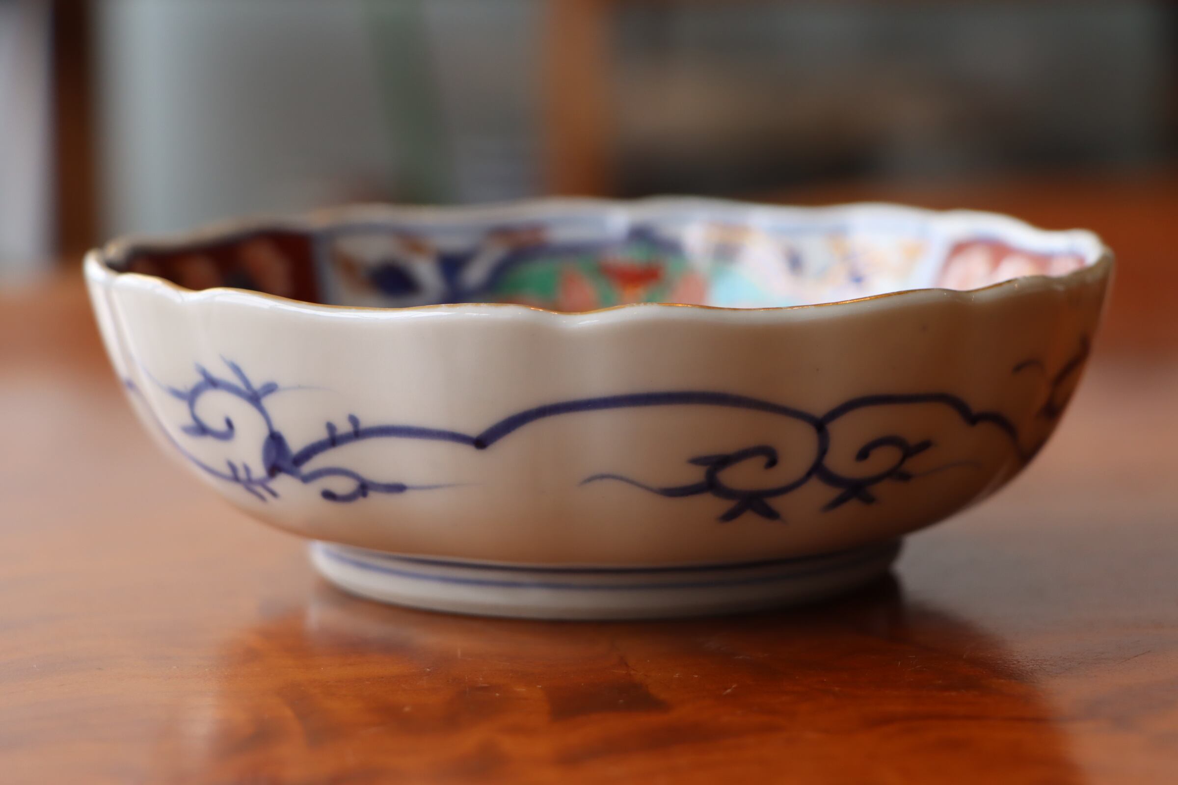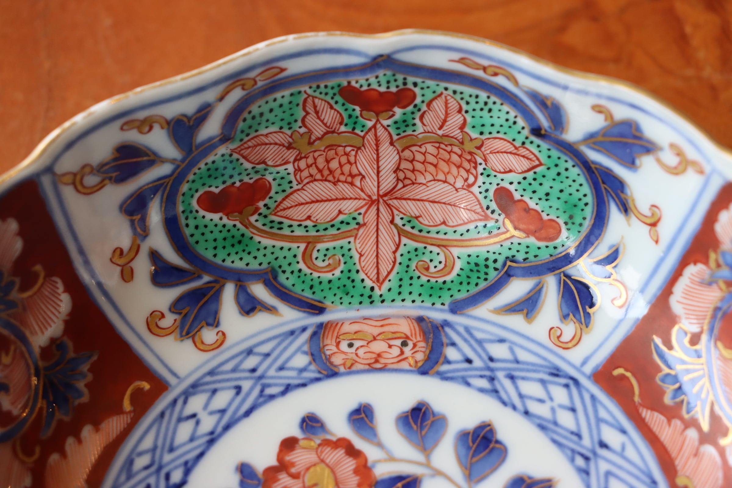 見込みに花文の膾皿は、周囲を白と赤を地色に異なるテイストの花唐草文が描かれ、見込み中央の花文の周りにひょこっと獅子が顔を覗かせています☺