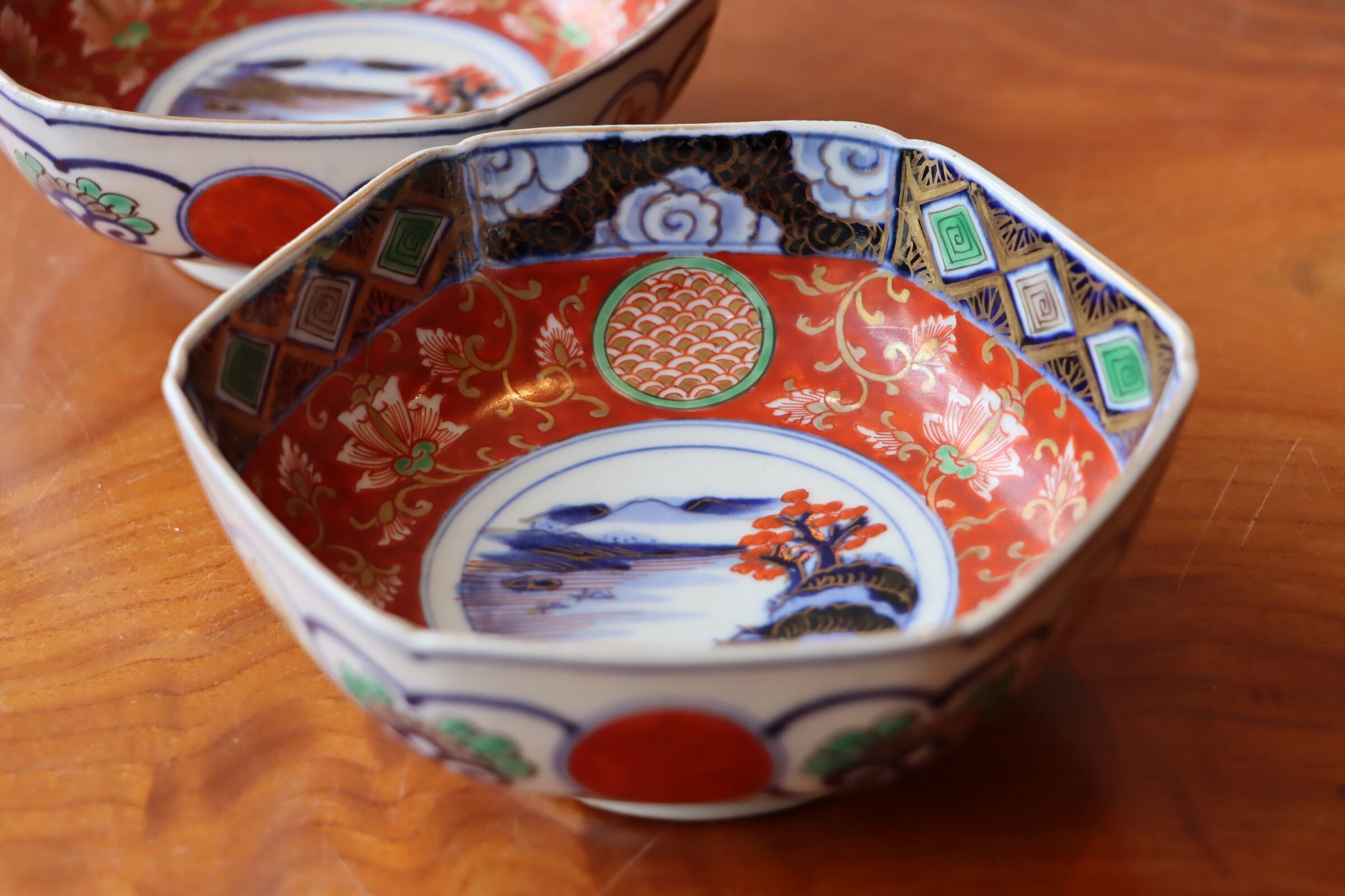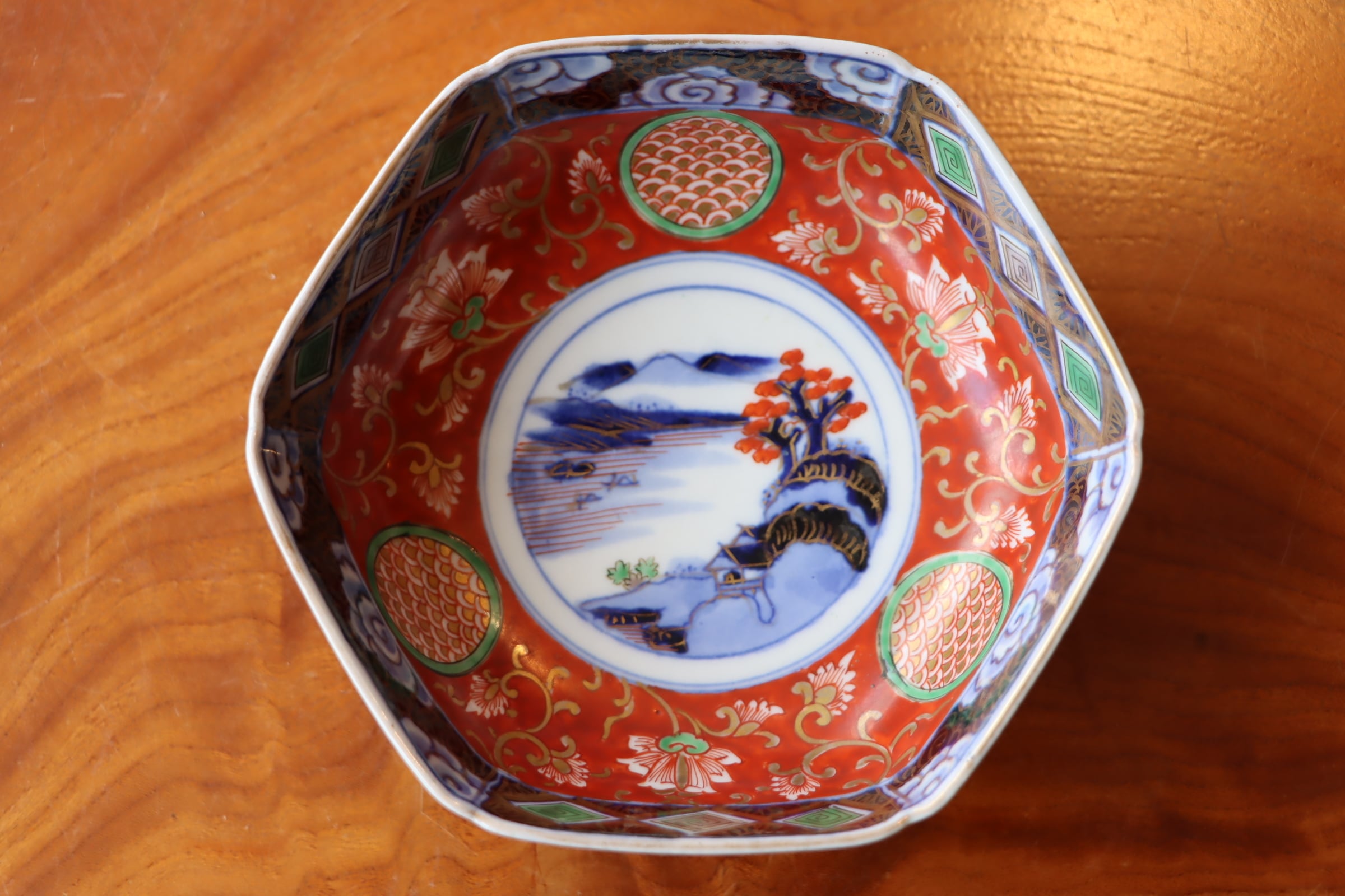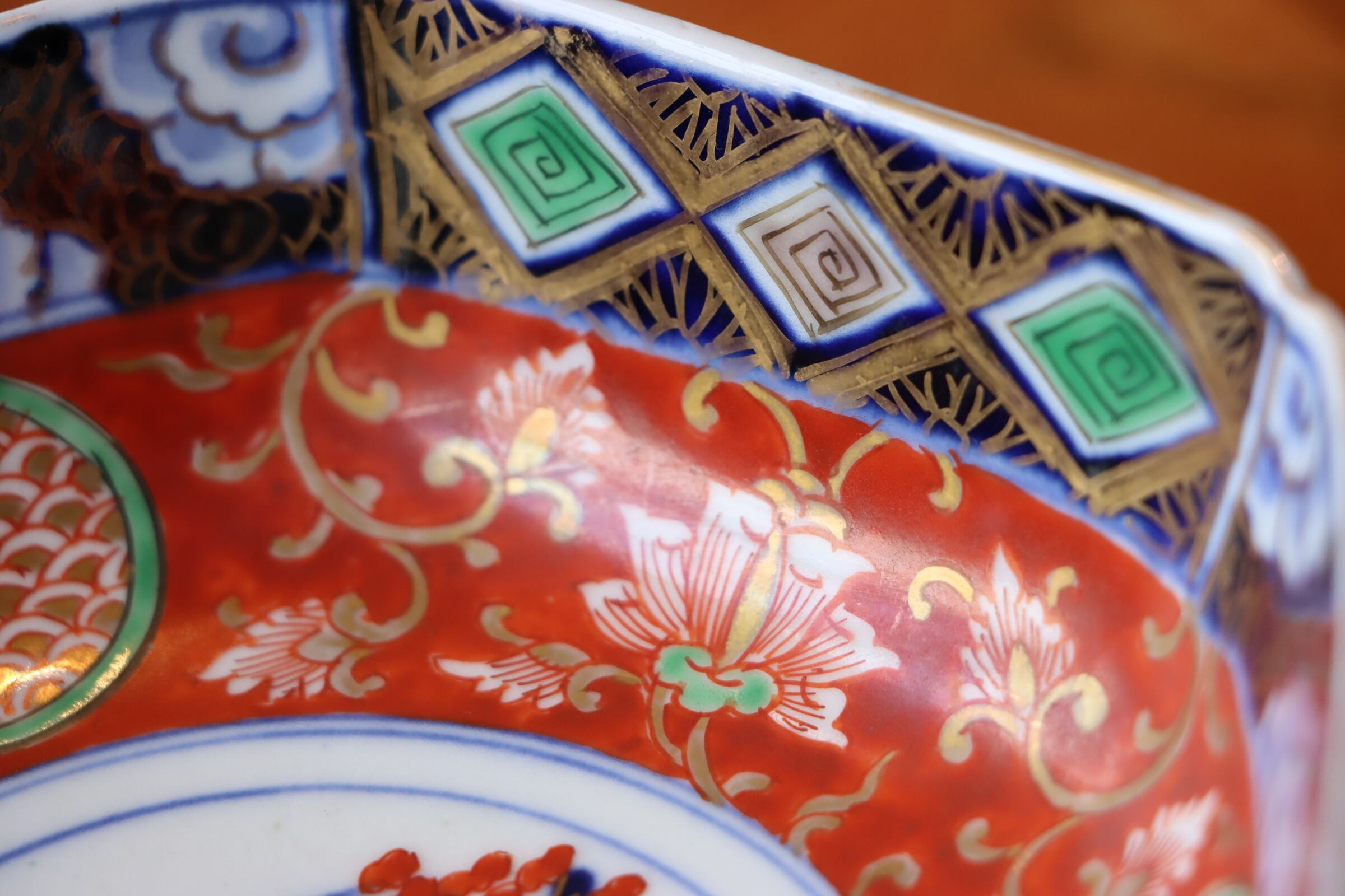 口縁周囲には、菱形文、花文があしらわれ、地色は朱色から一転、藍色となり、華やかさの中にも引き締まった印象を受けます✨