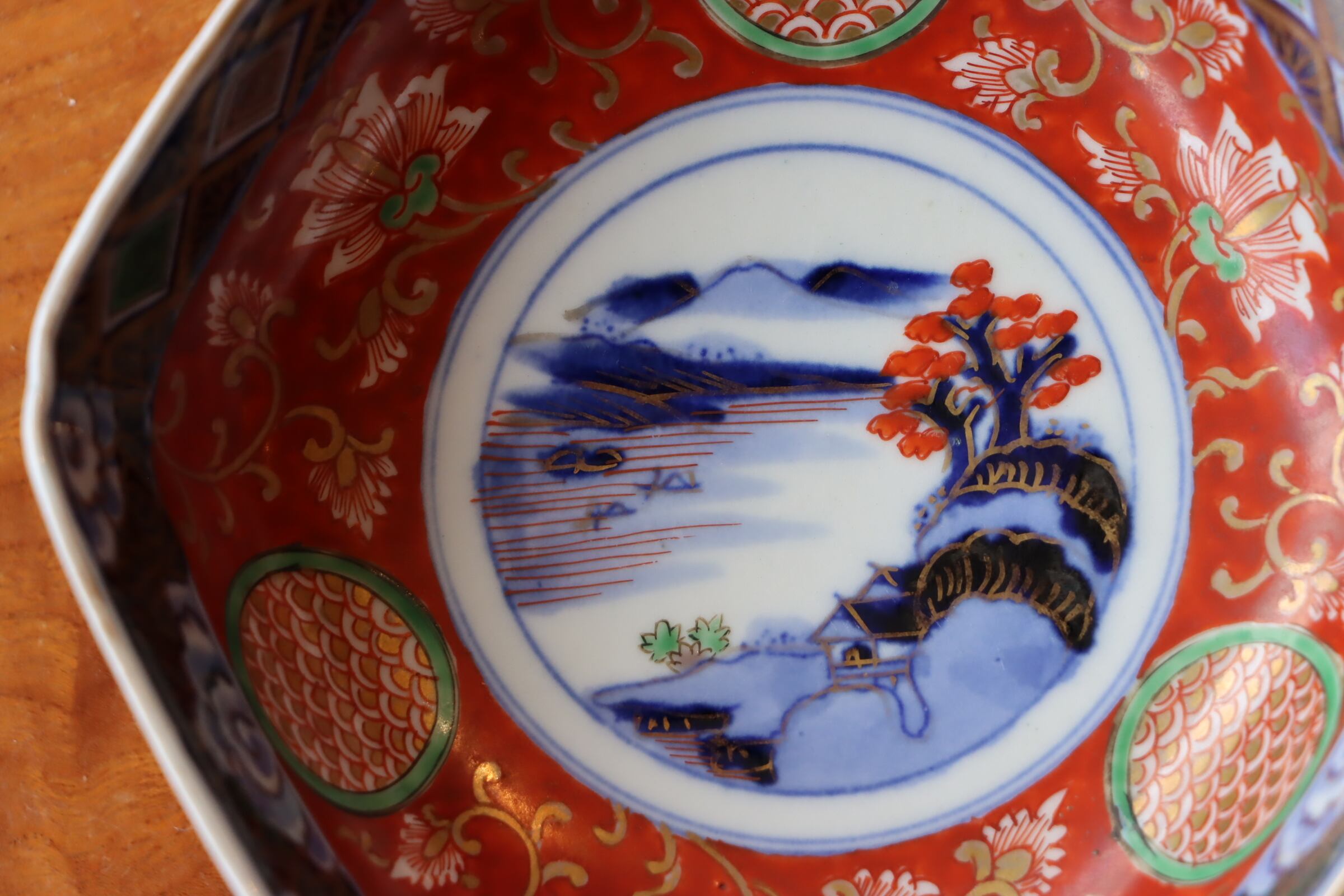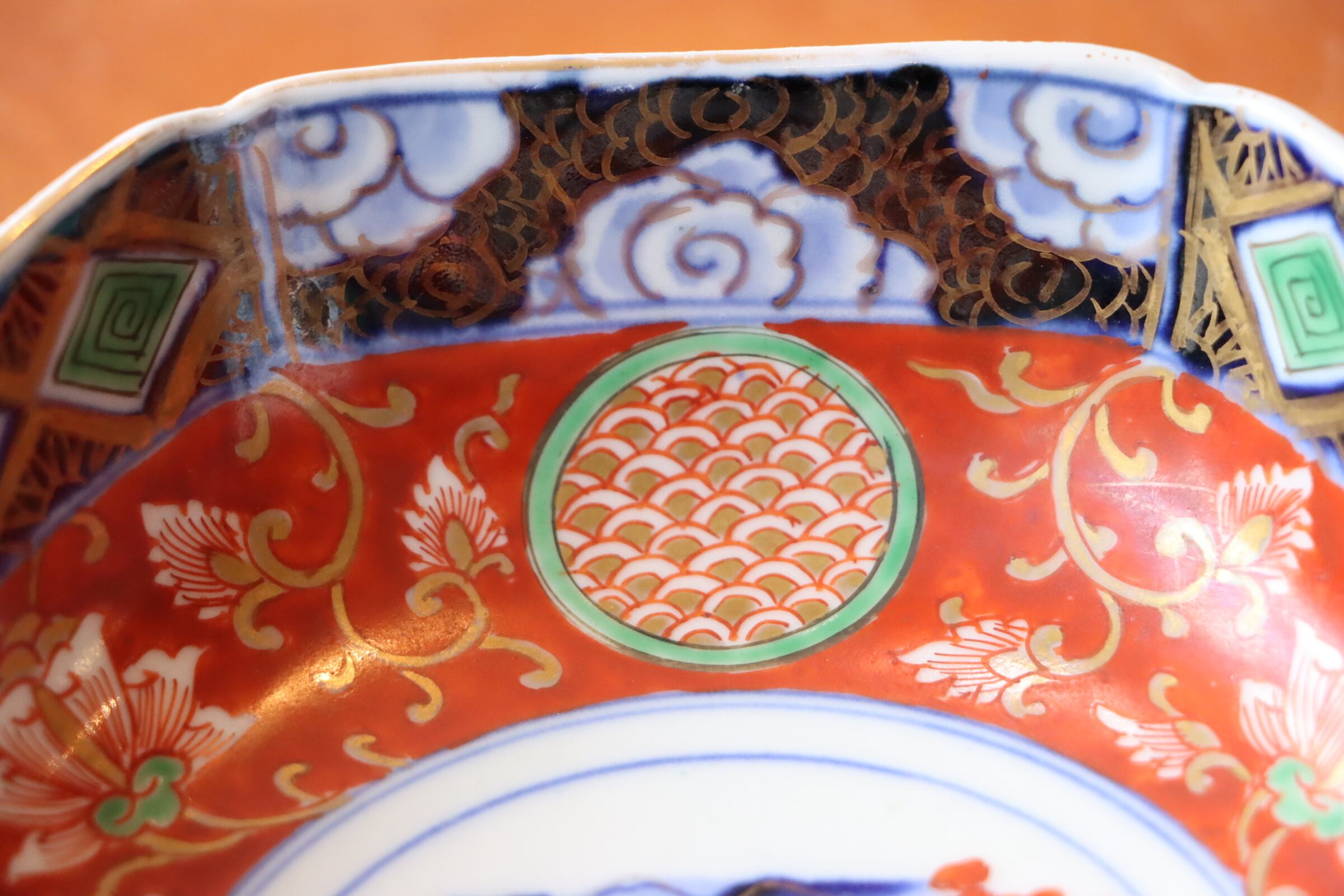 見込み周囲は朱色、そこに唐草文と青海波が描き込まれた丸文が配されています。