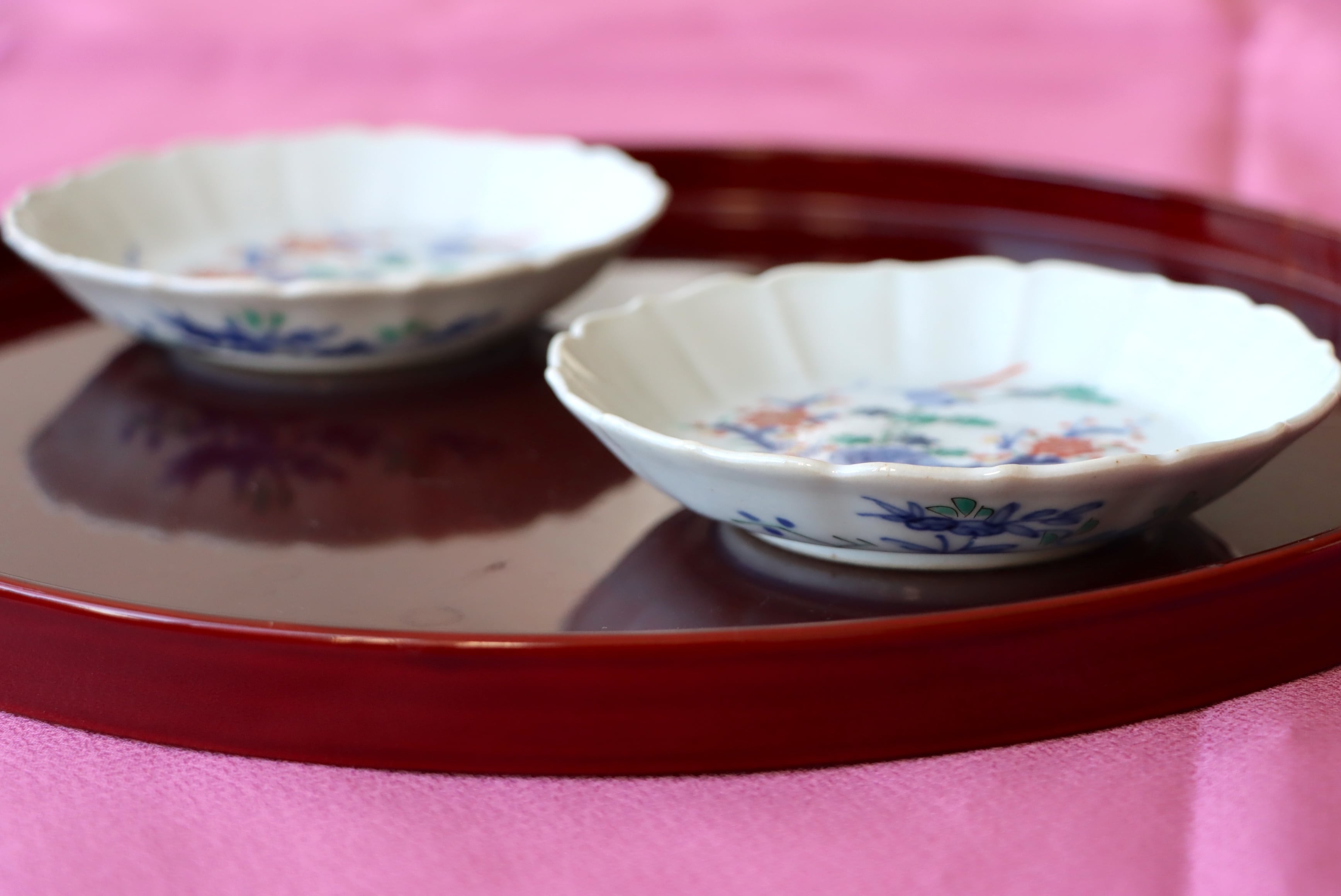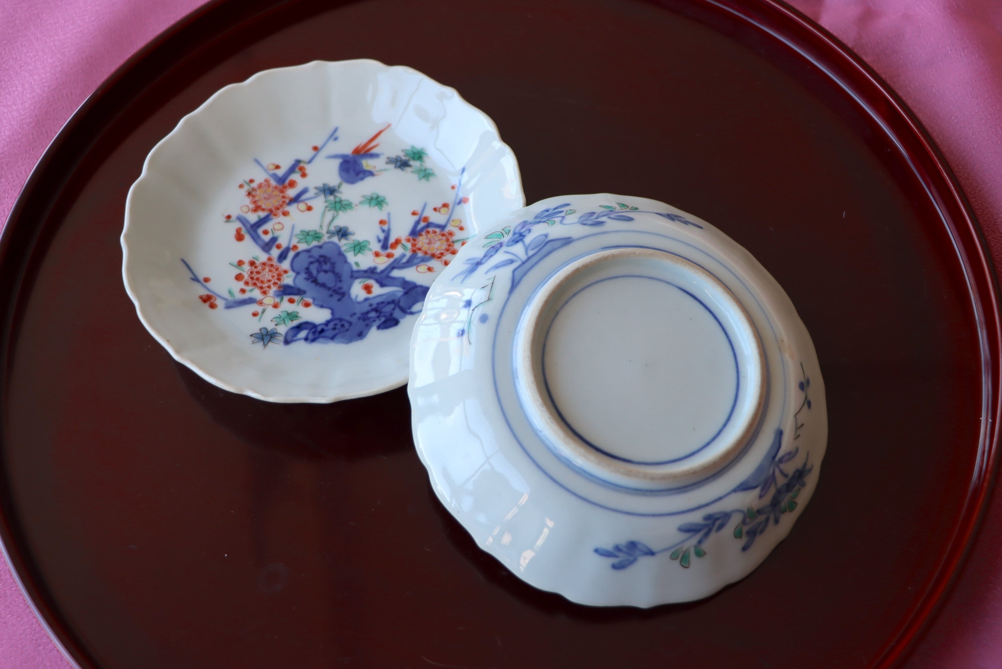 柿右衛門手らしい澄んだ白地に、紅梅と岩、そして愛らしい鳥の図。