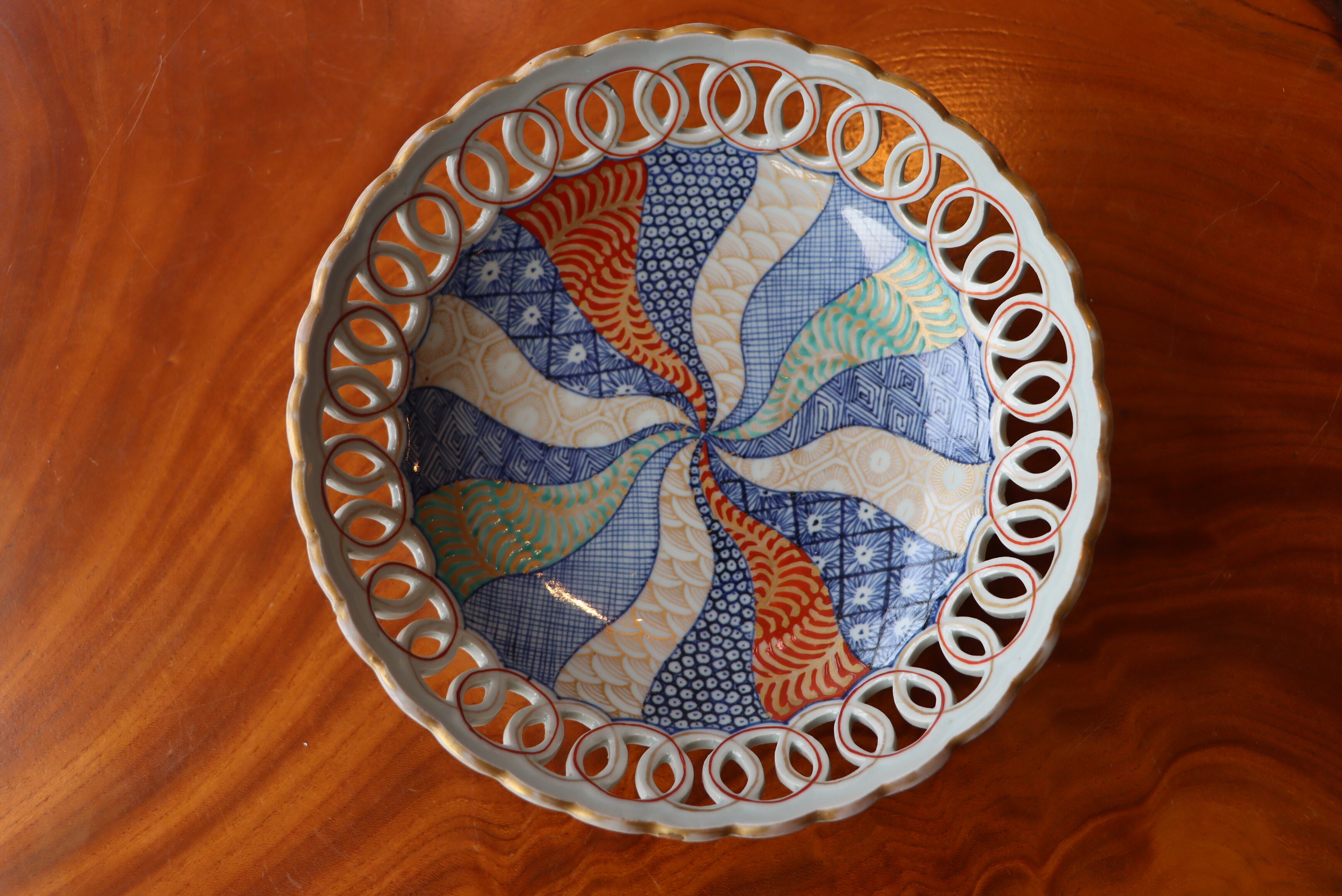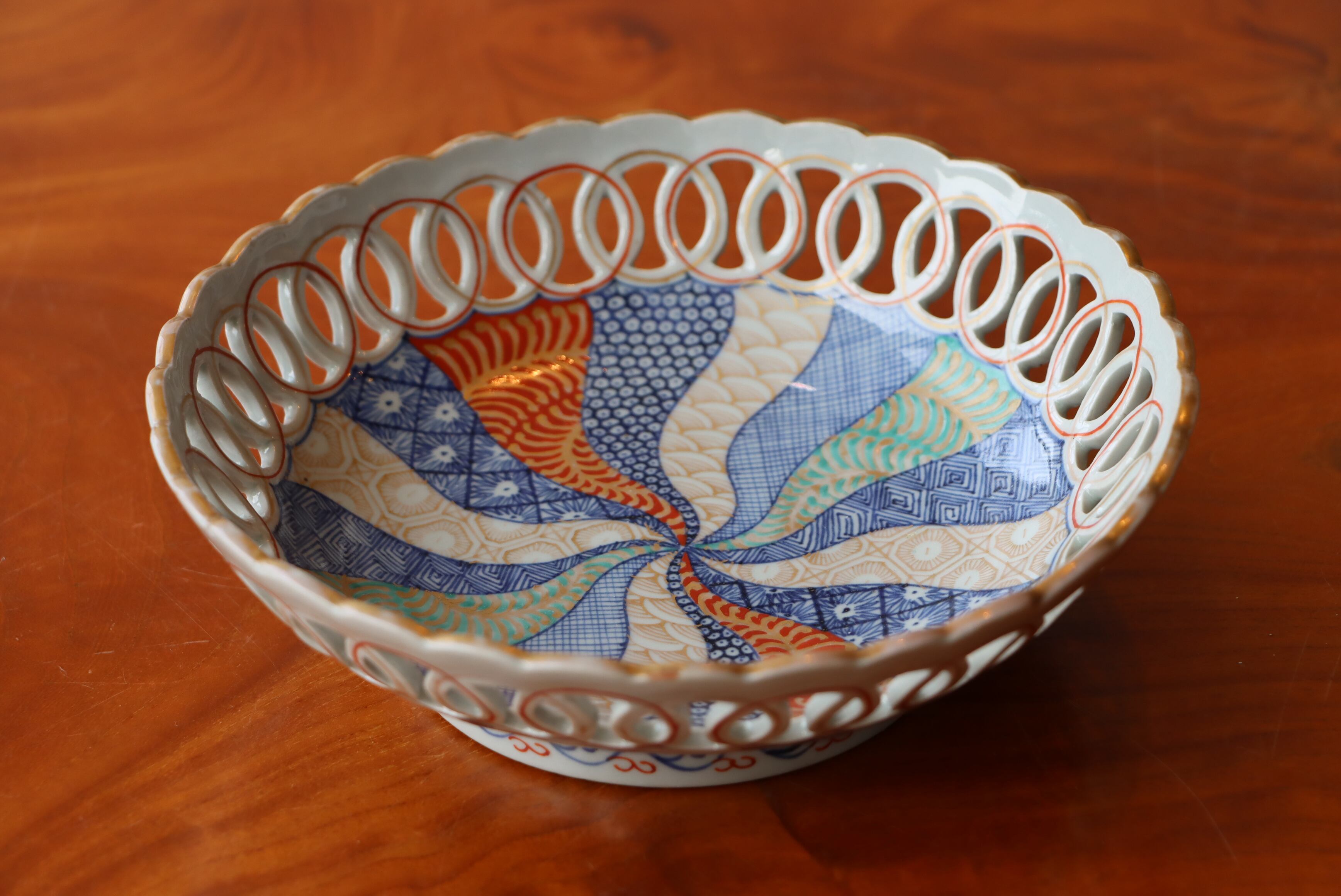 古伊万里 色絵 捻文 輪繋ぎ透かし 鉢